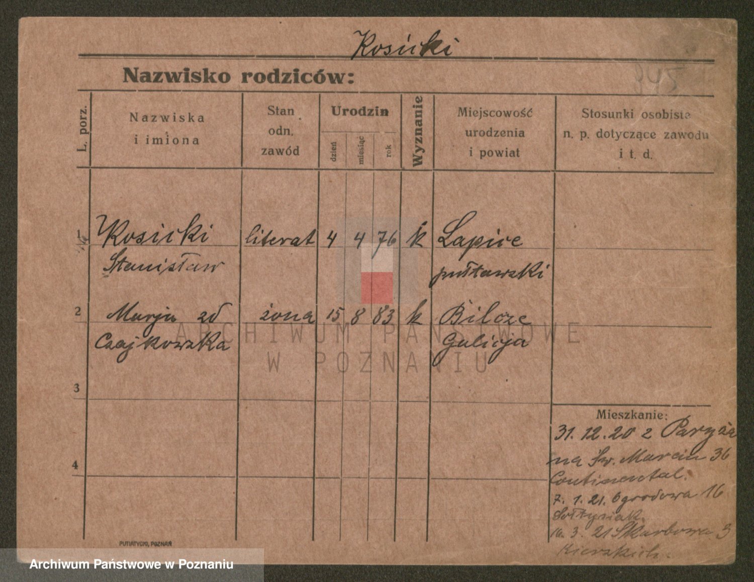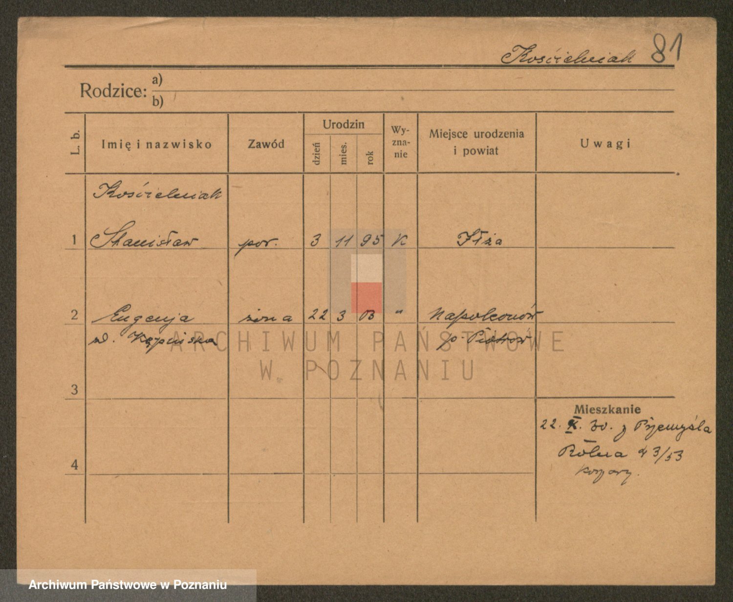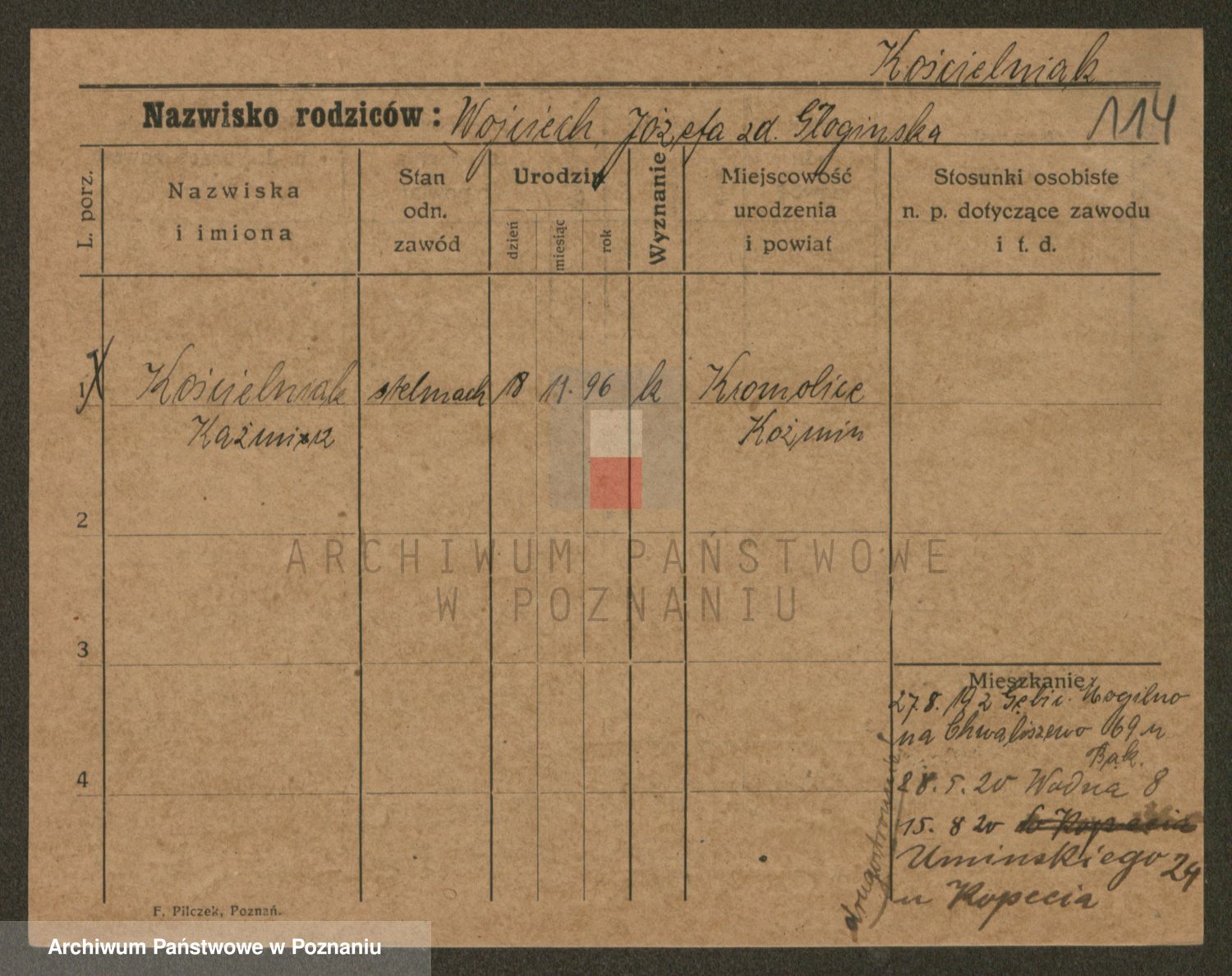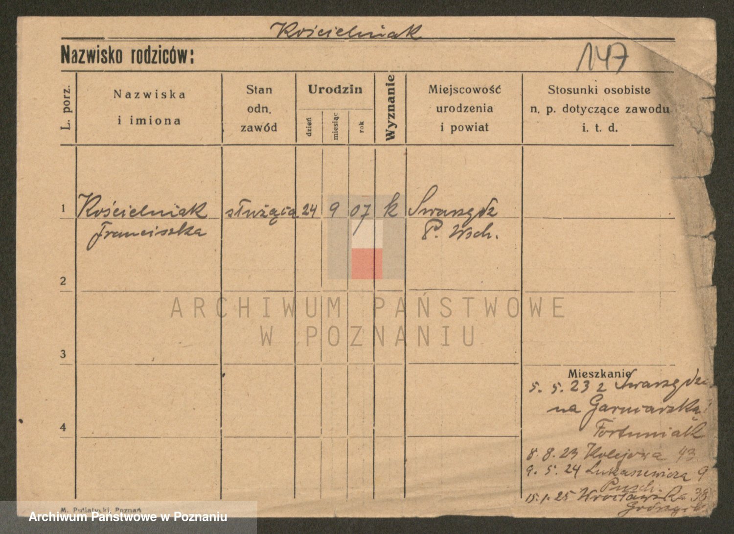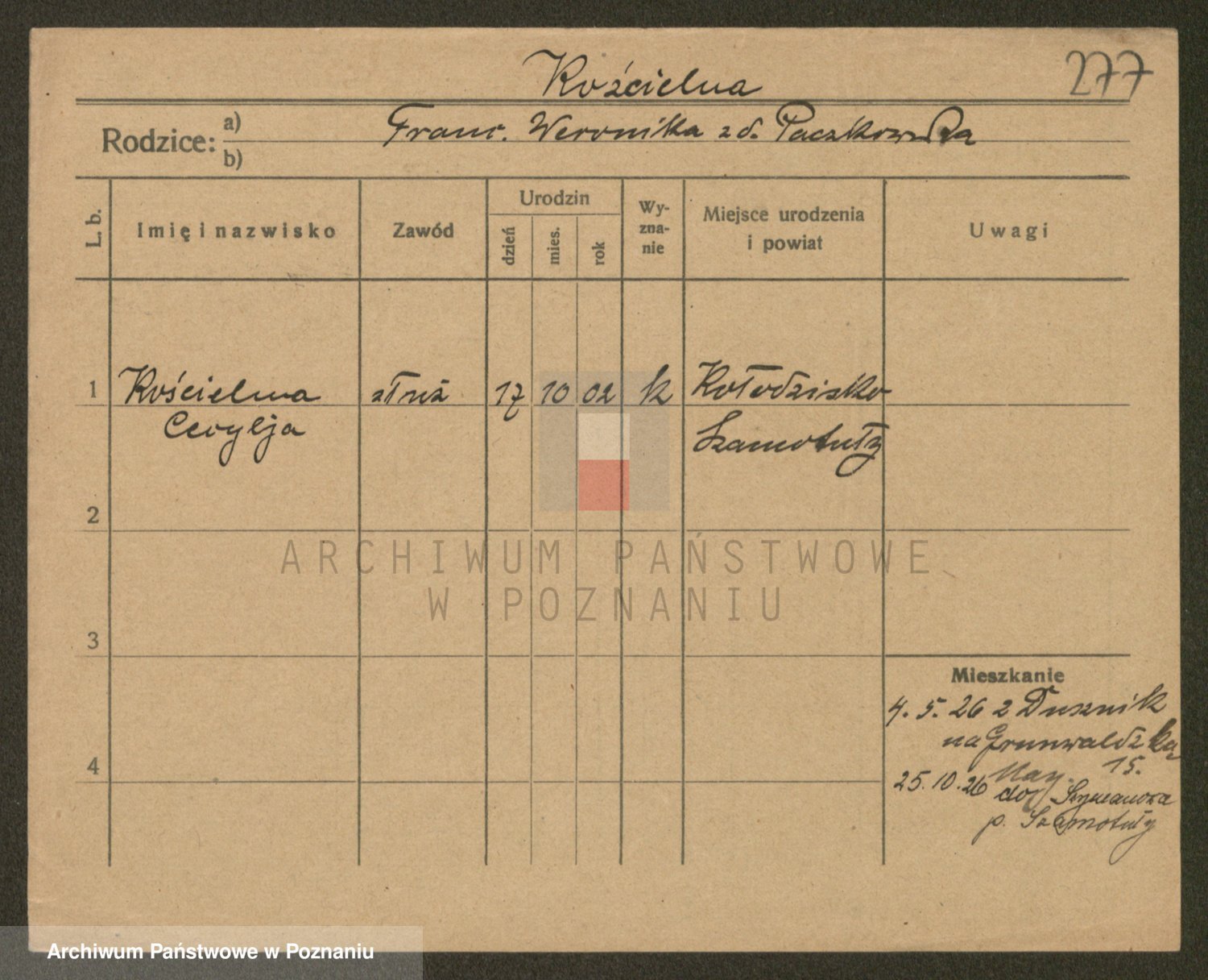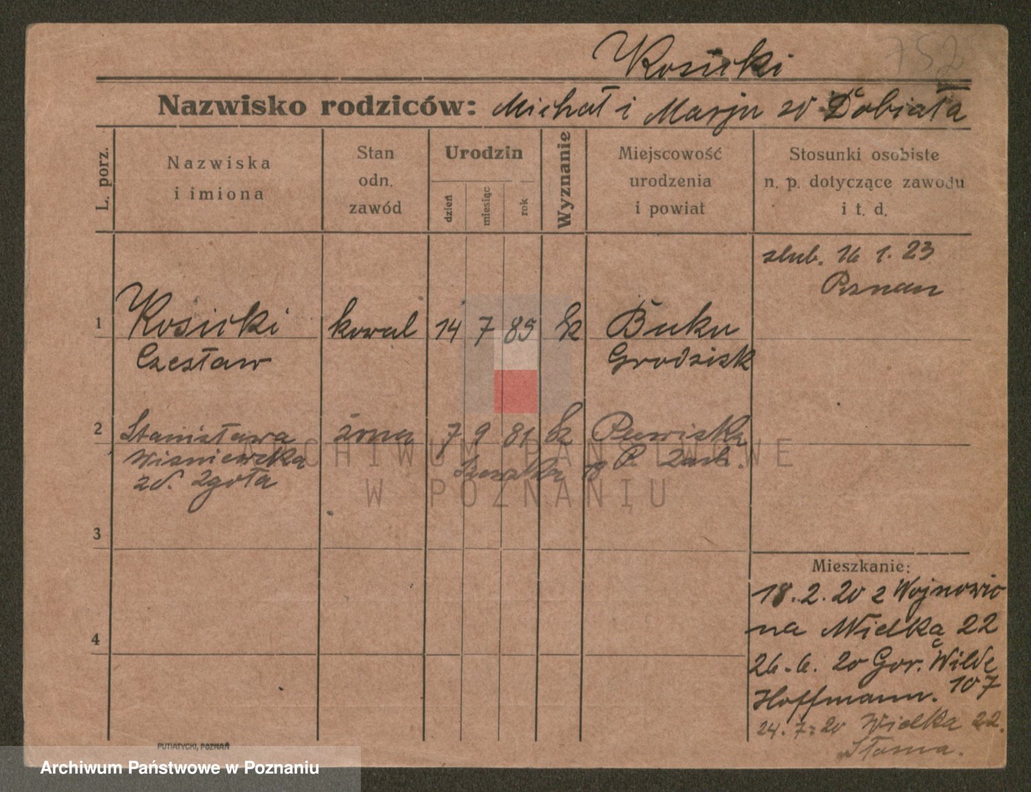 Podgląd karty osobowej dostępny jest po kliknięciu na nazwisko lub ikonkę karty. Można dokonywać powiększenia (ikony na górze) lub przechodzić między kolejnymi skanami (strzałki po bokach).