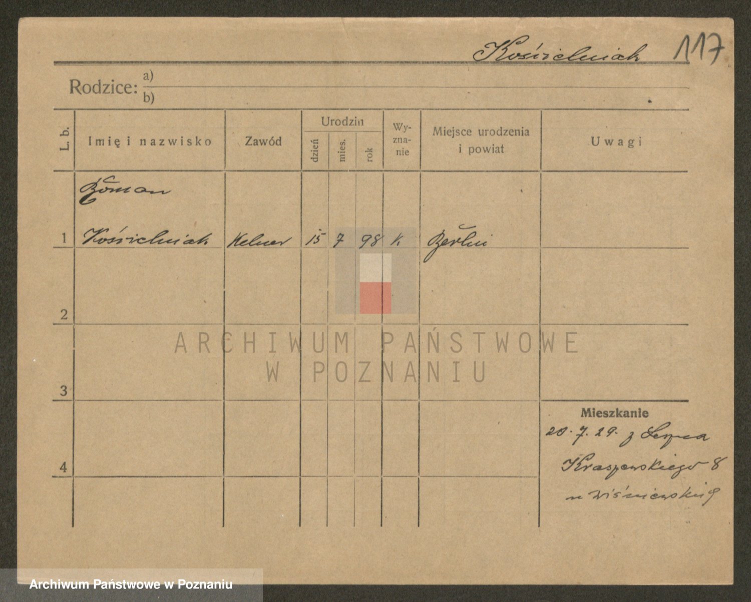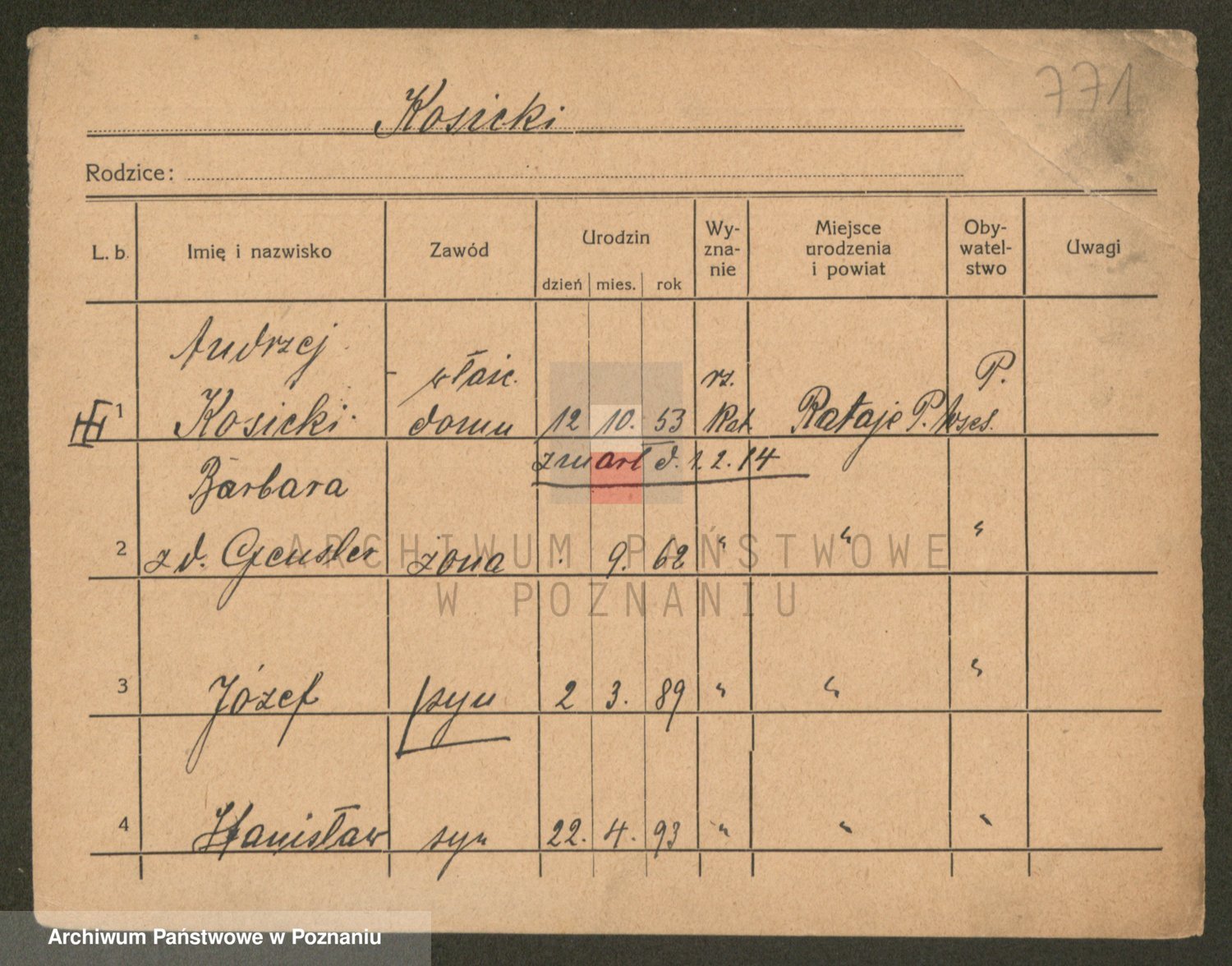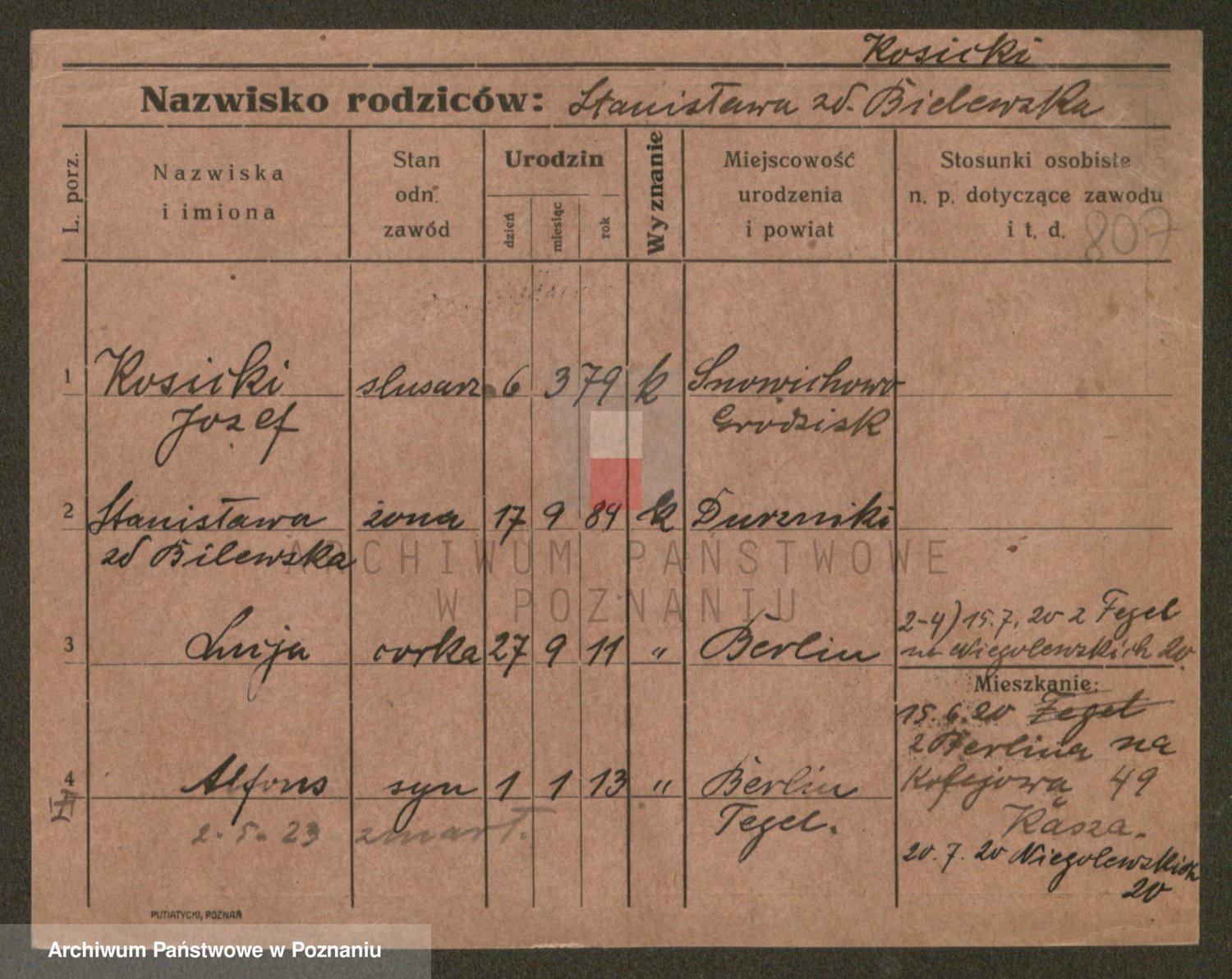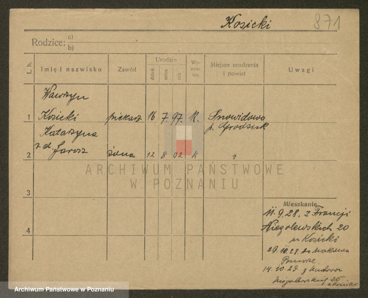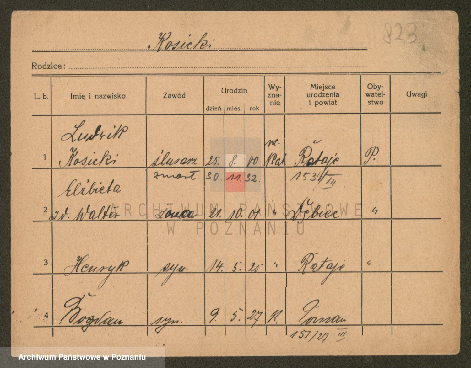 Podgląd karty osobowej dostępny jest po kliknięciu na nazwisko lub ikonkę karty. Można dokonywać powiększenia (ikony na górze) lub przechodzić między kolejnymi skanami (strzałki po bokach).