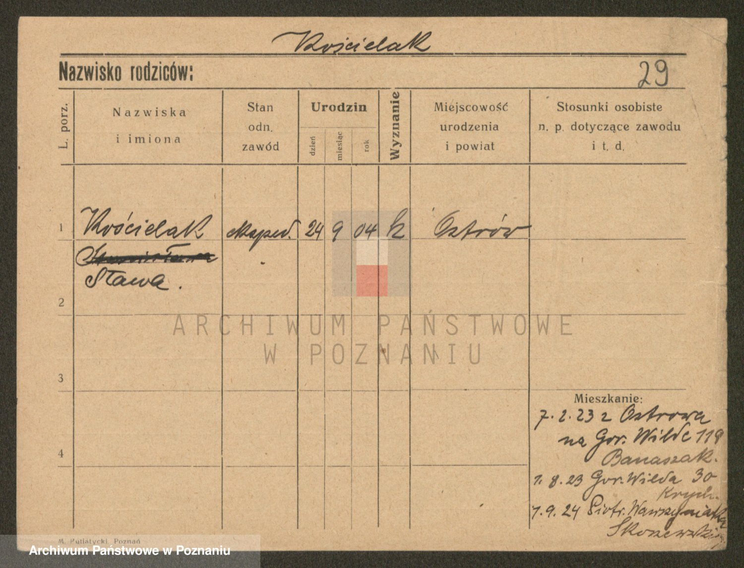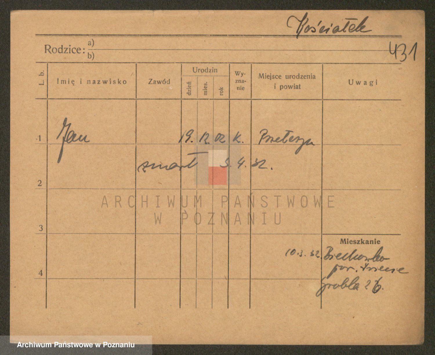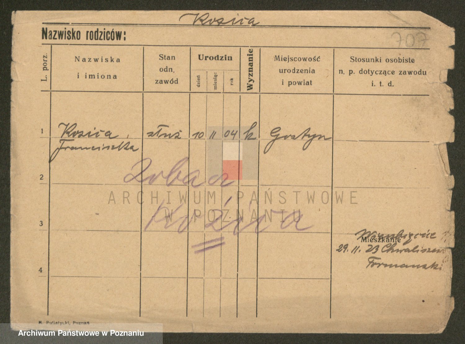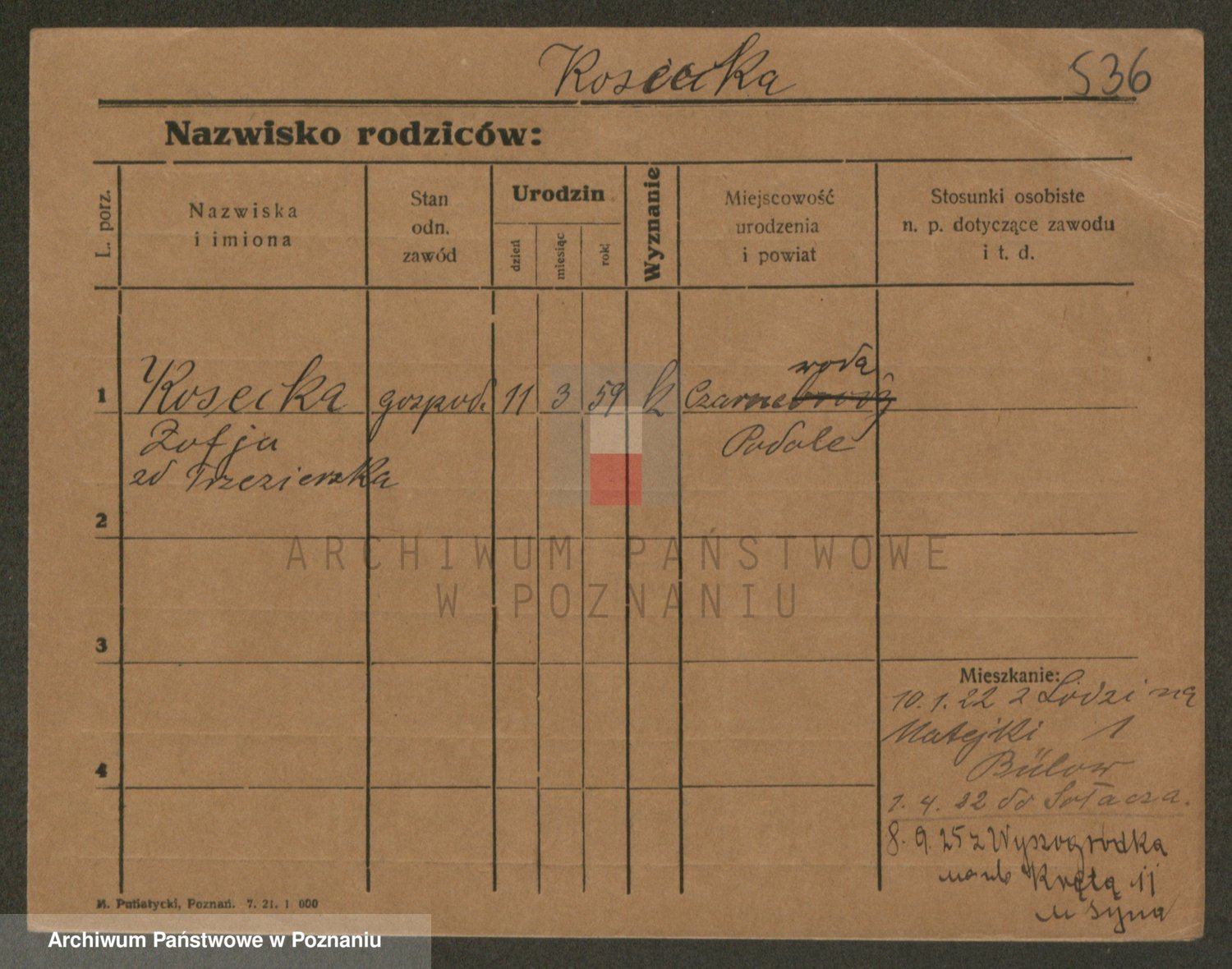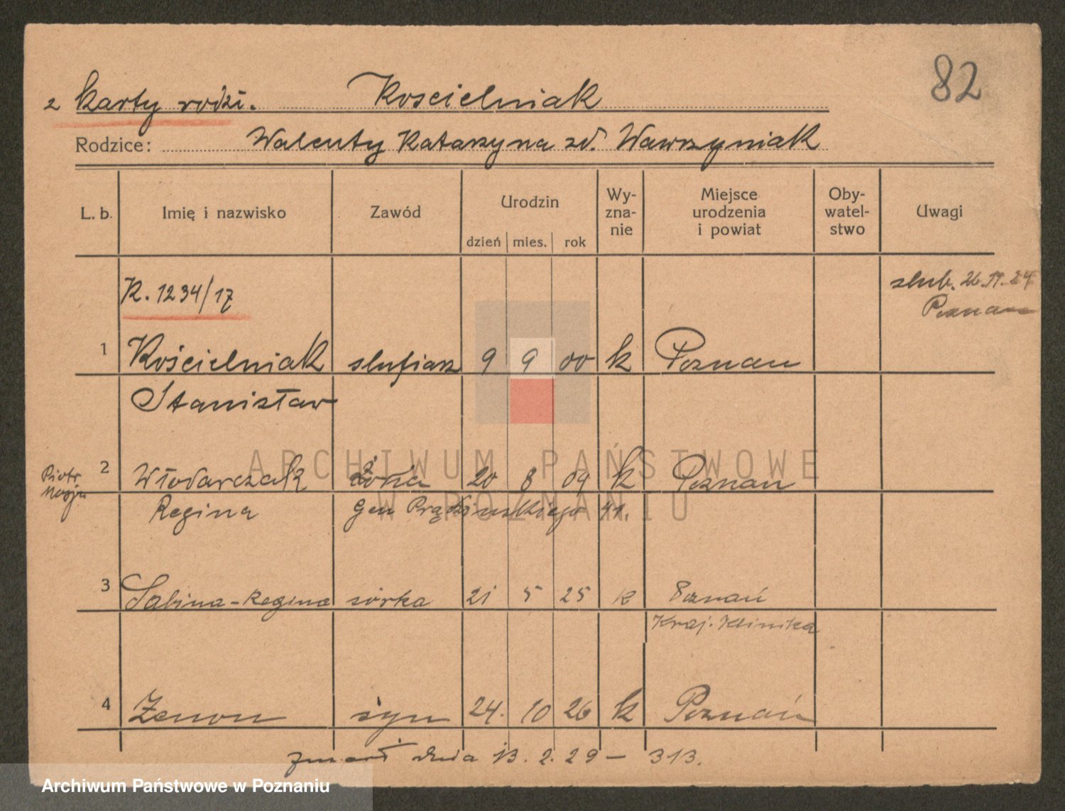 Podgląd karty osobowej dostępny jest po kliknięciu na nazwisko lub ikonkę karty. Można dokonywać powiększenia (ikony na górze) lub przechodzić między kolejnymi skanami (strzałki po bokach).