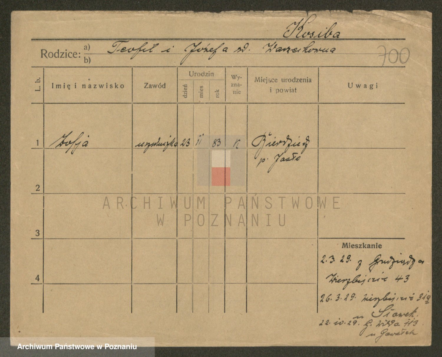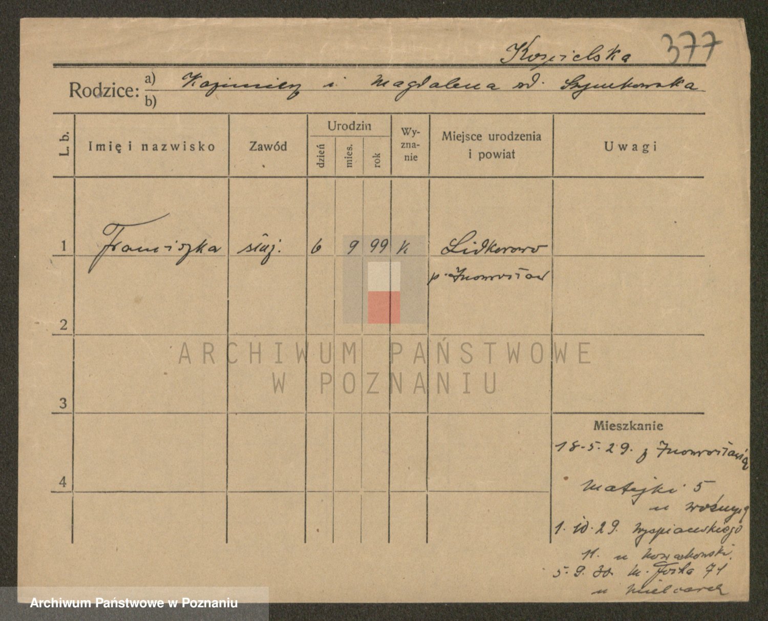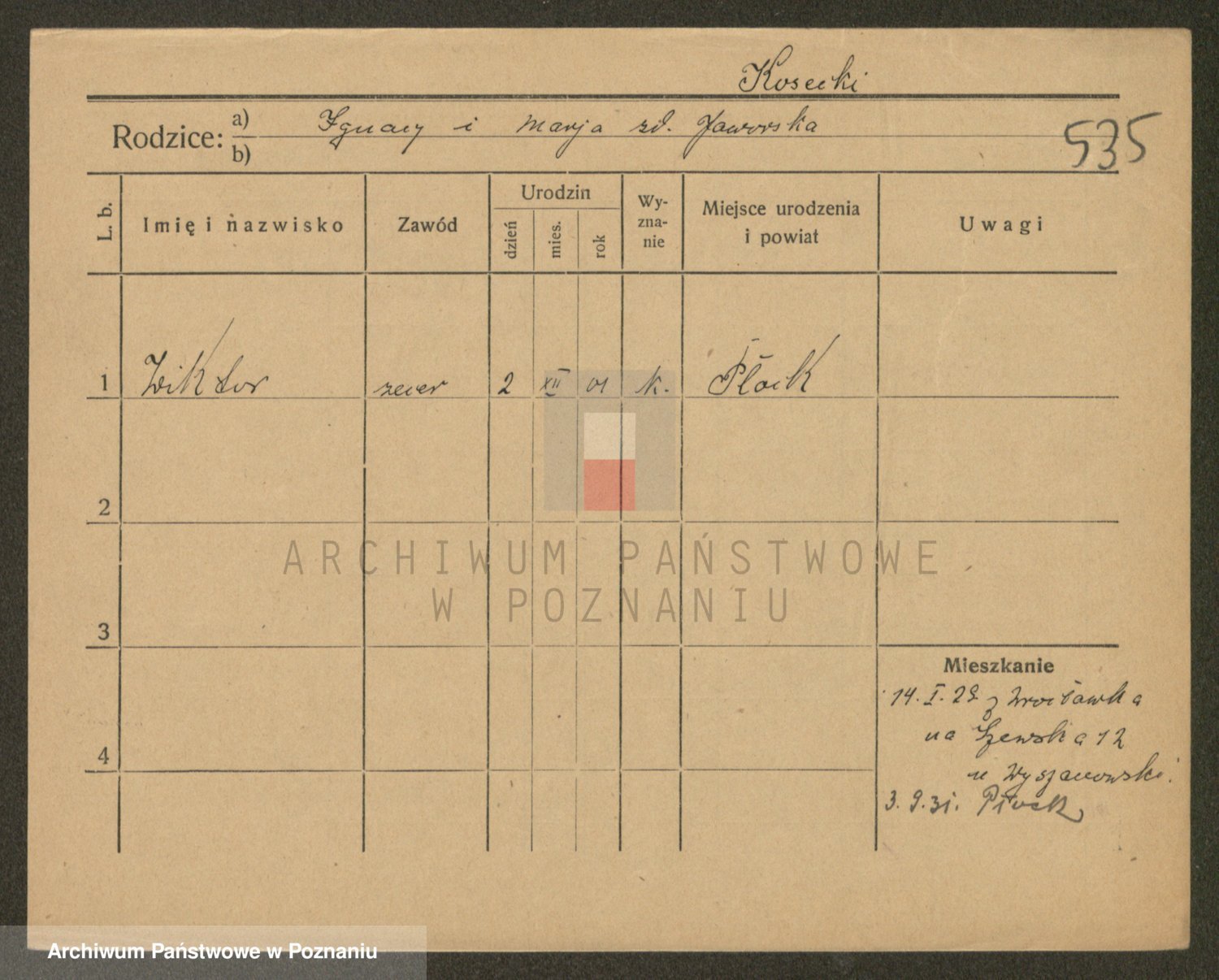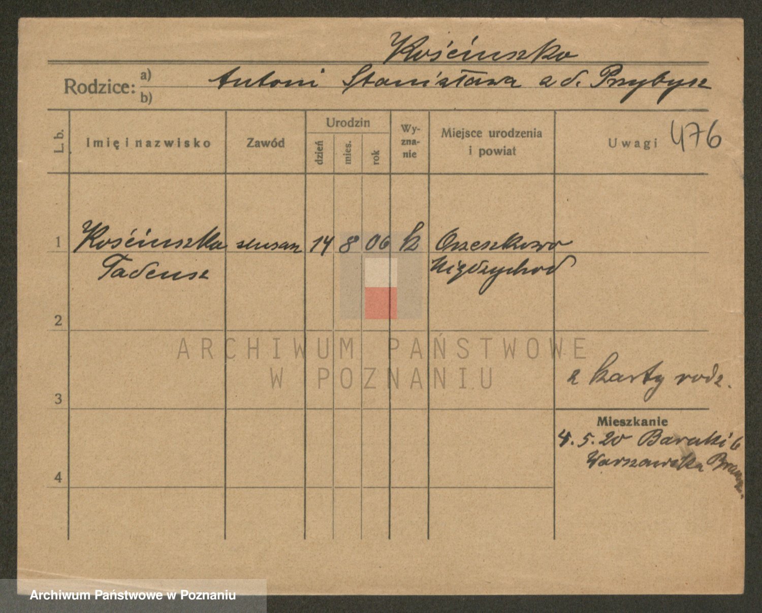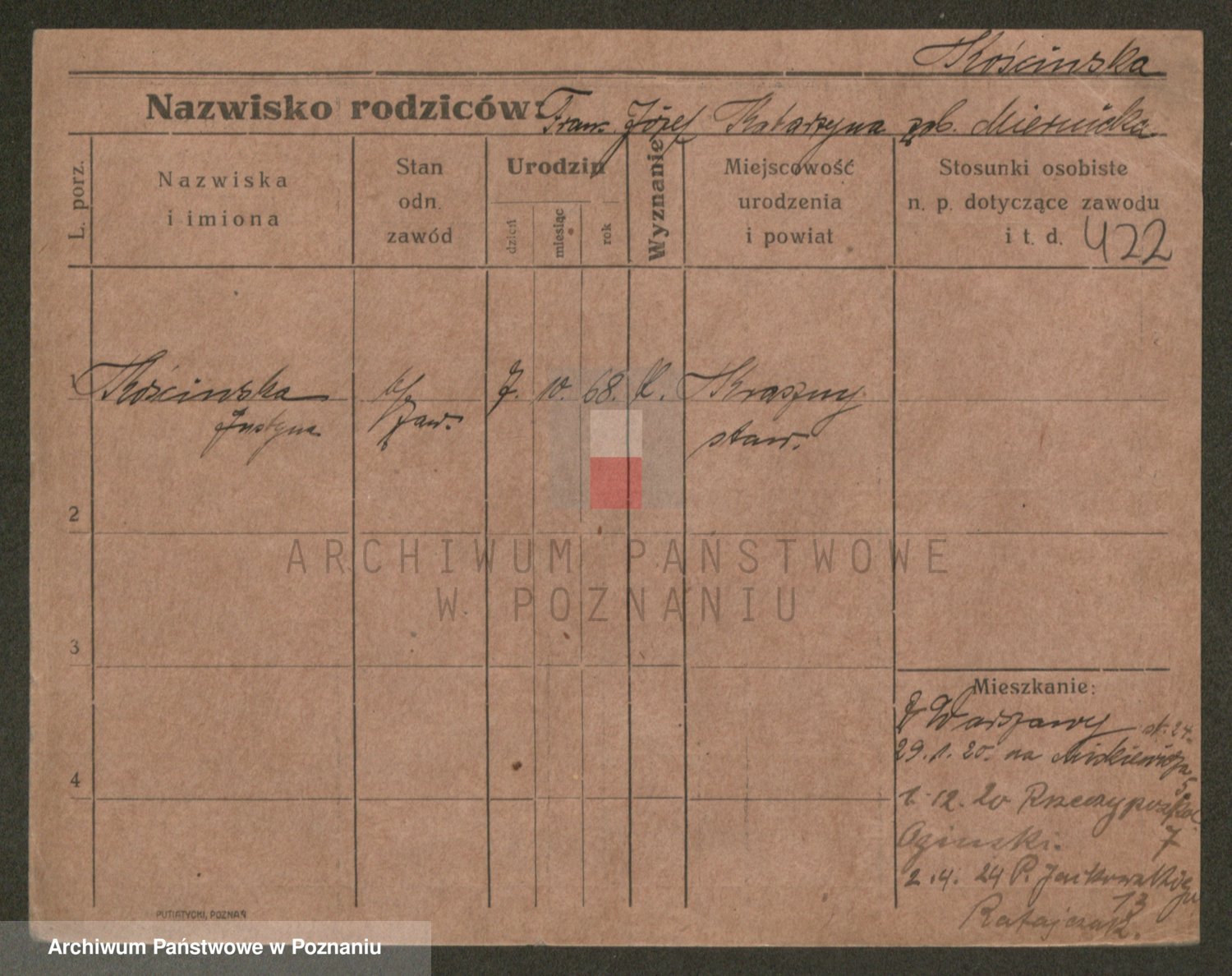 Podgląd karty osobowej dostępny jest po kliknięciu na nazwisko lub ikonkę karty. Można dokonywać powiększenia (ikony na górze) lub przechodzić między kolejnymi skanami (strzałki po bokach).