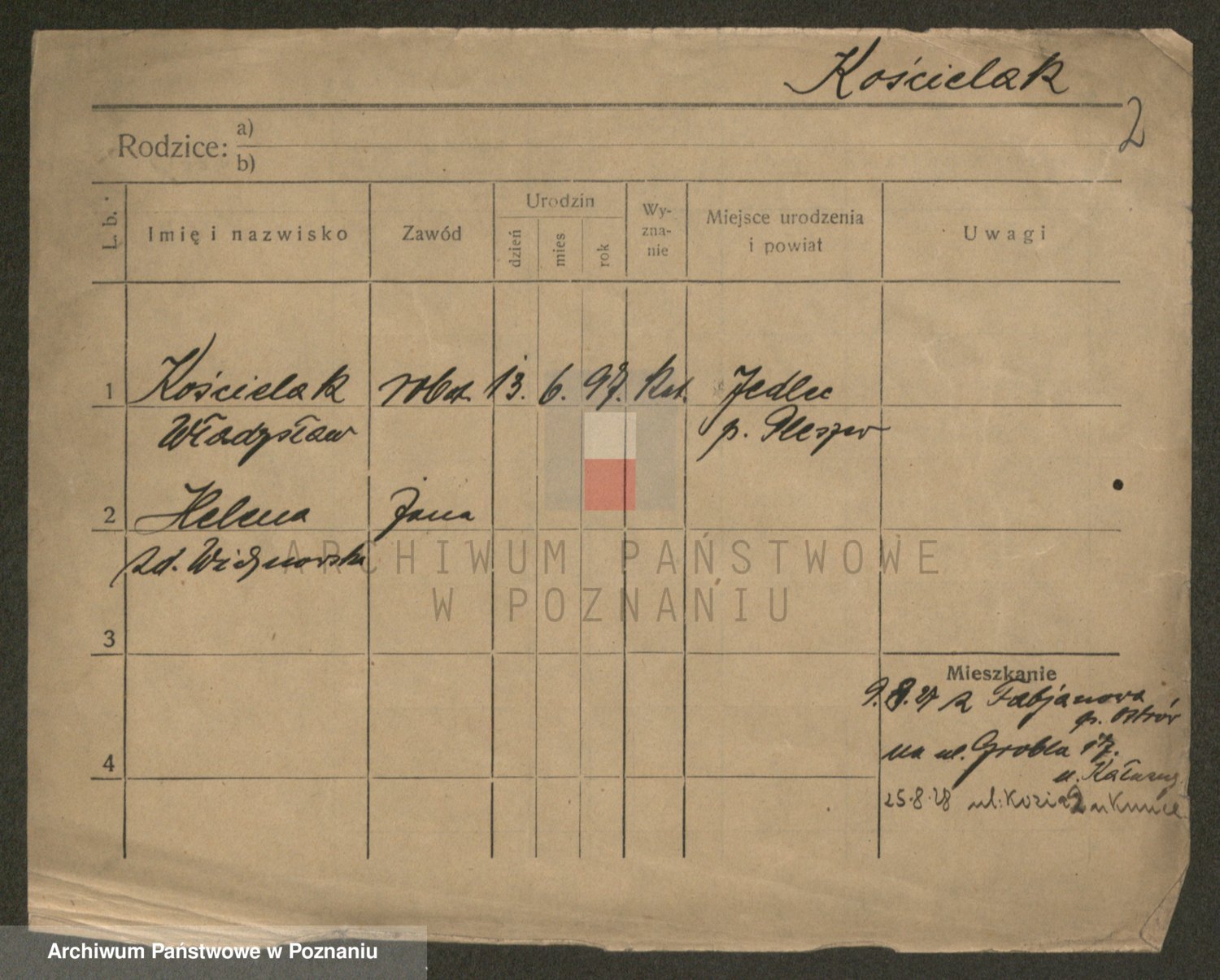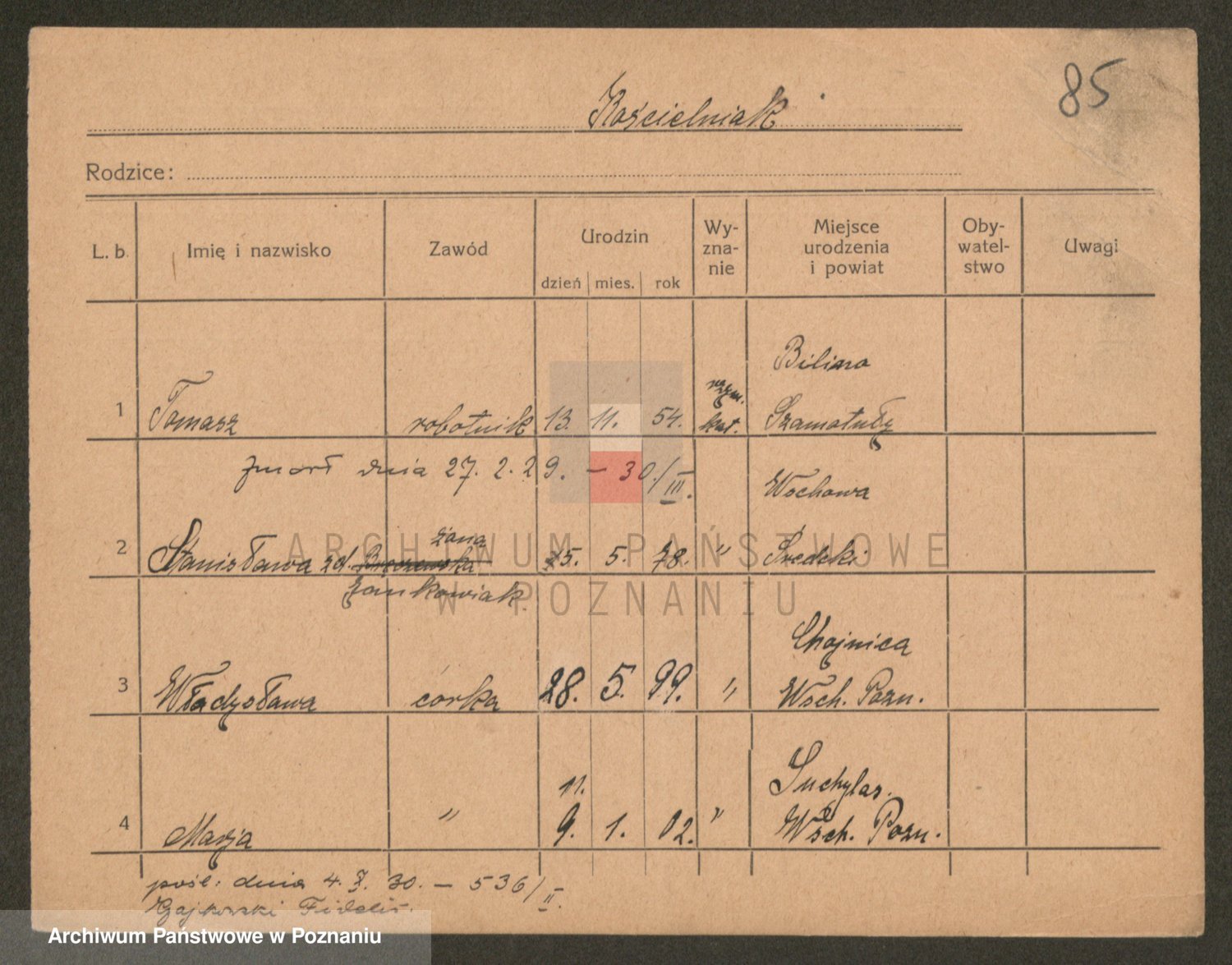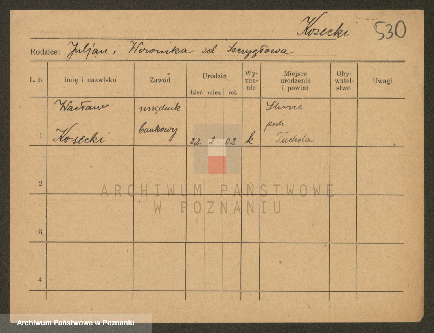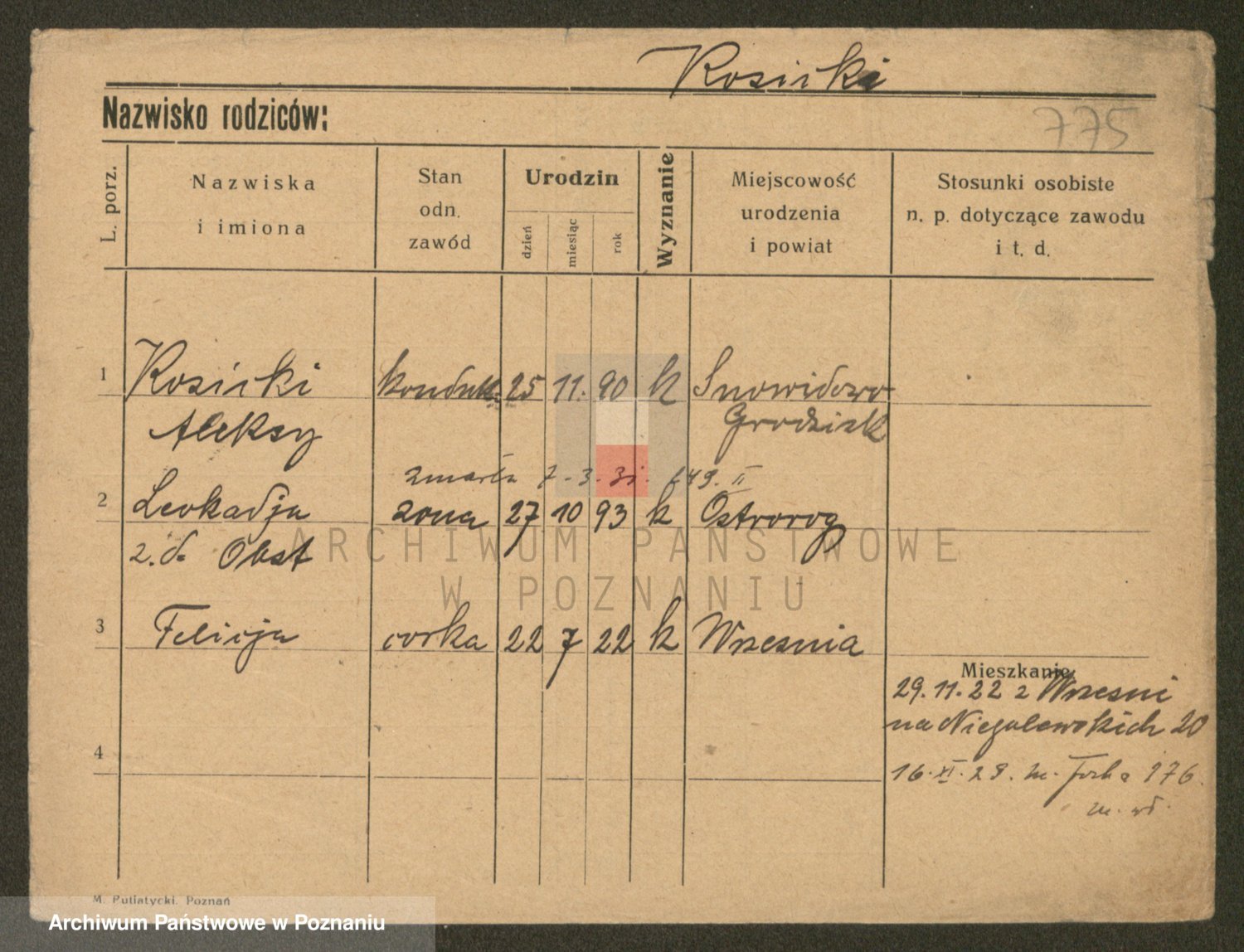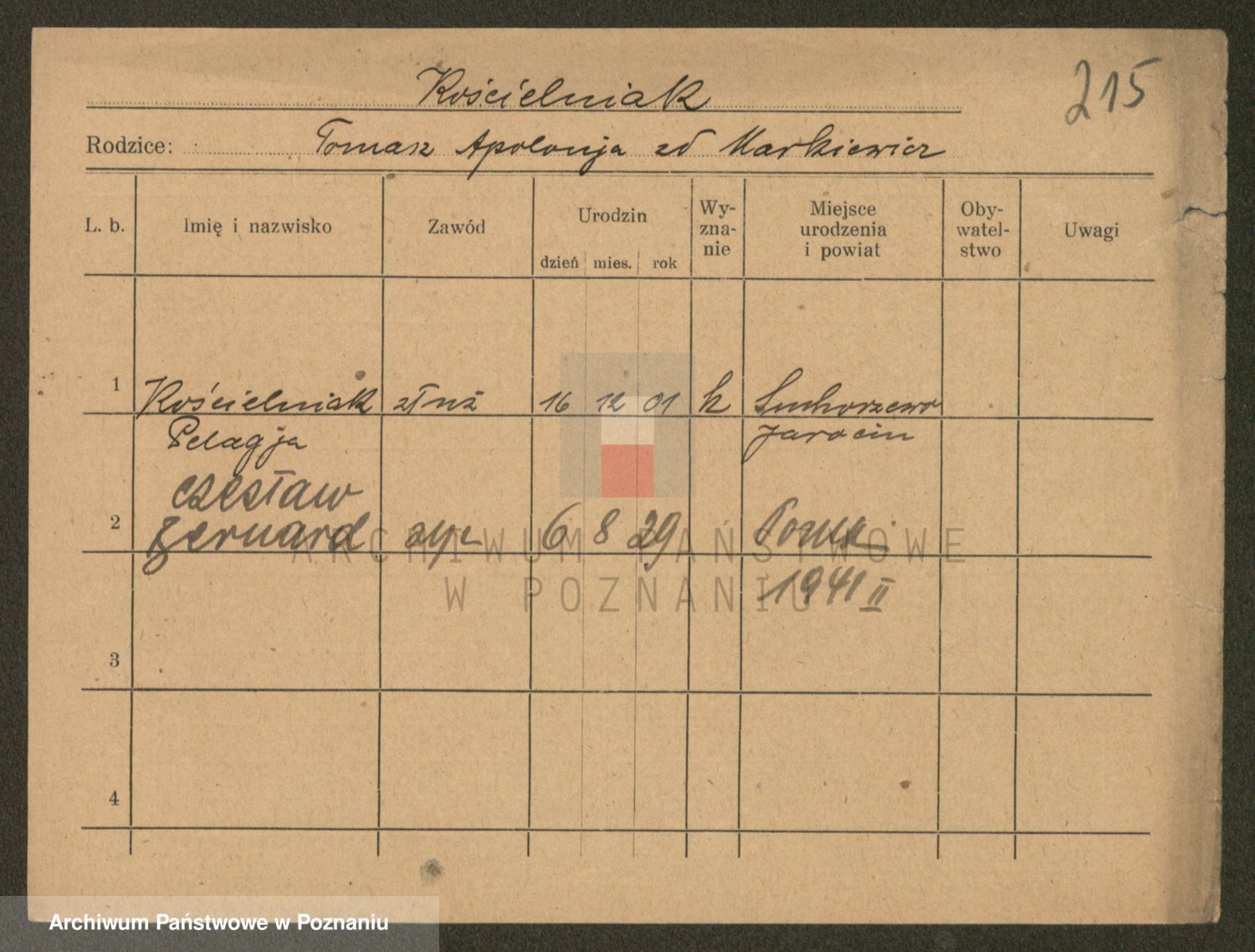 Podgląd karty osobowej dostępny jest po kliknięciu na nazwisko lub ikonkę karty. Można dokonywać powiększenia (ikony na górze) lub przechodzić między kolejnymi skanami (strzałki po bokach).