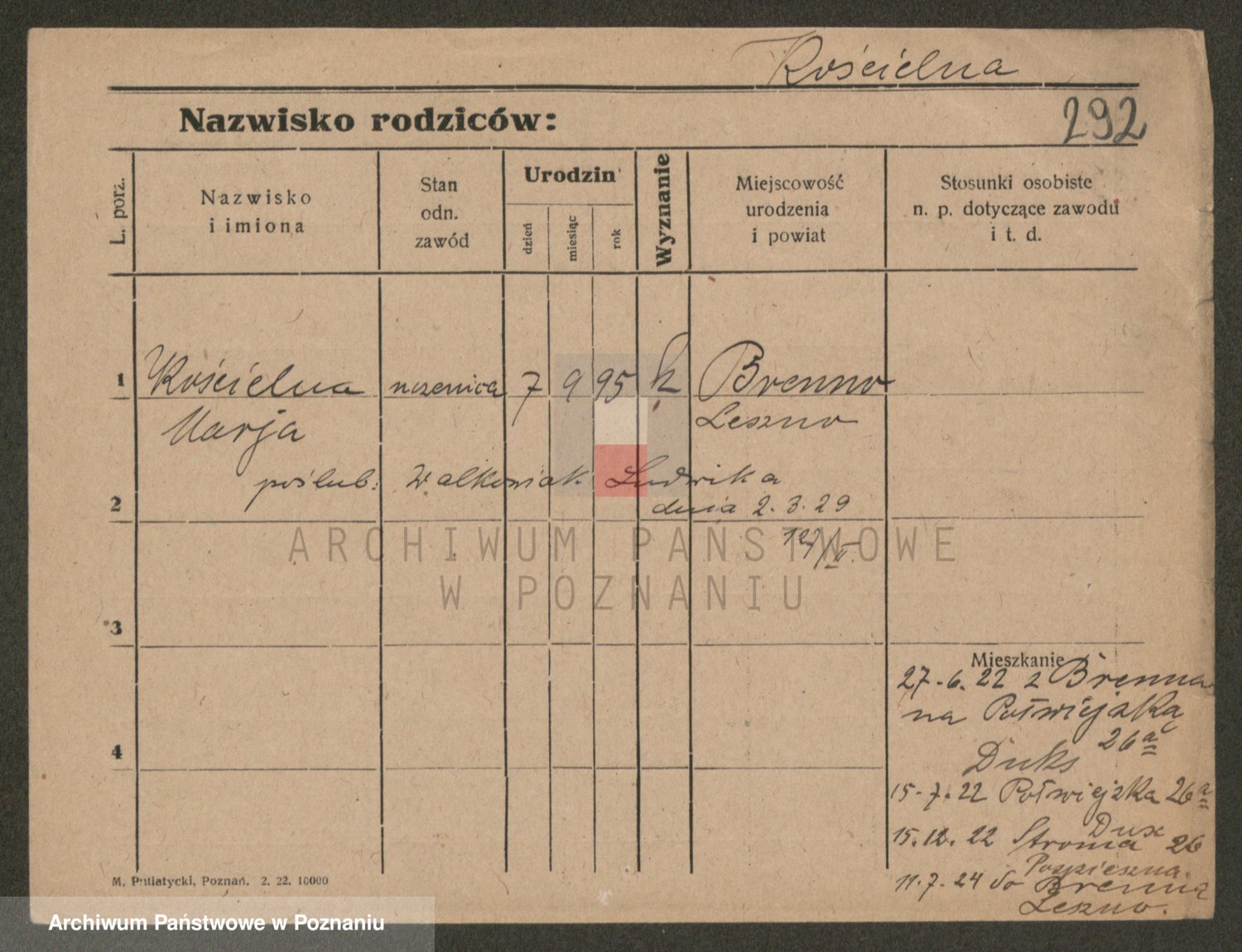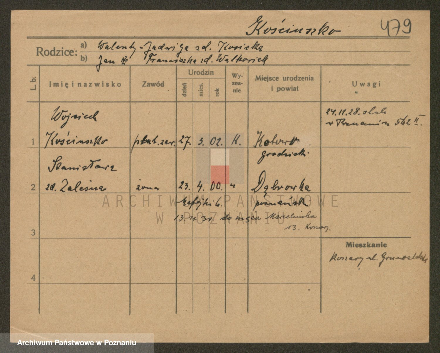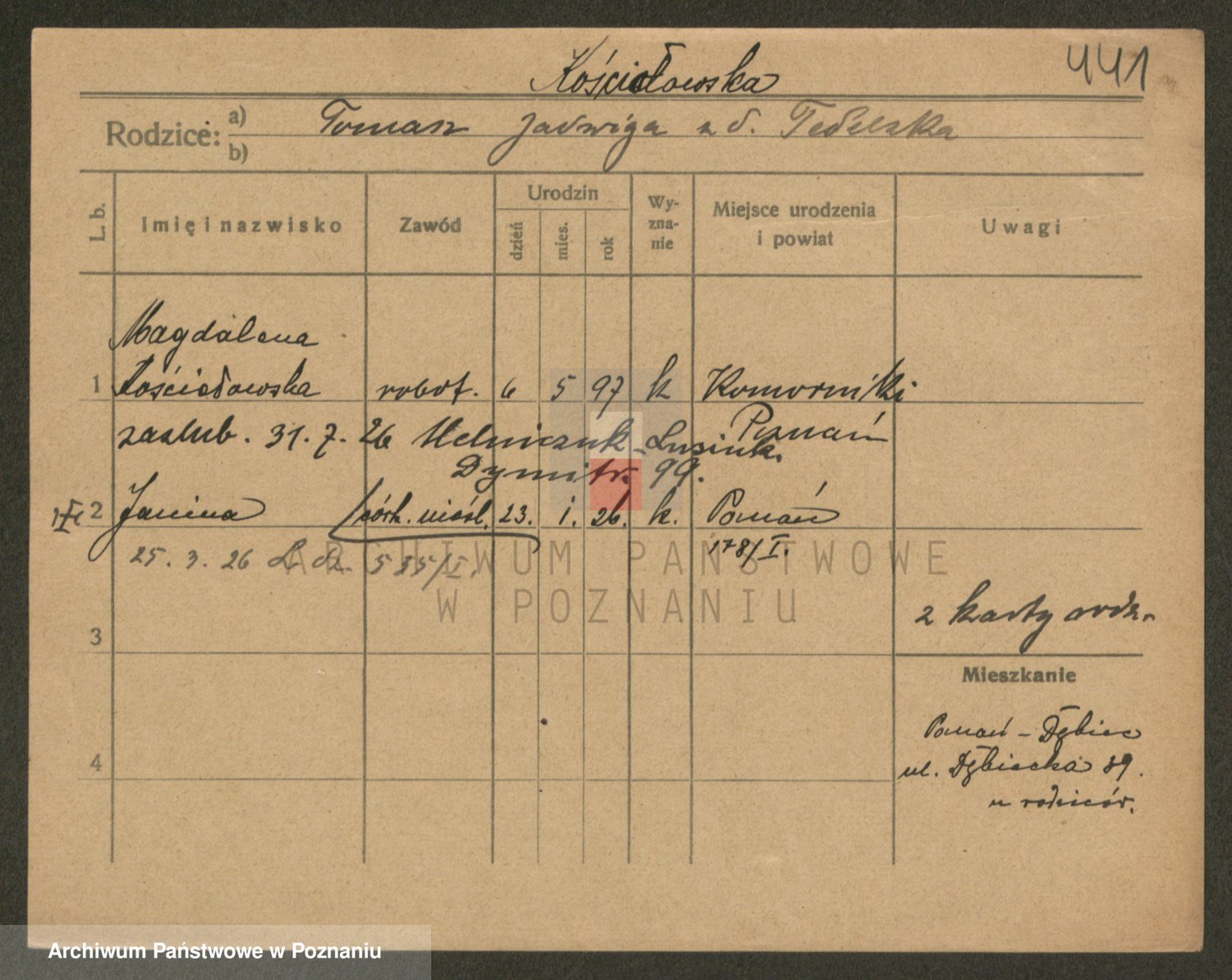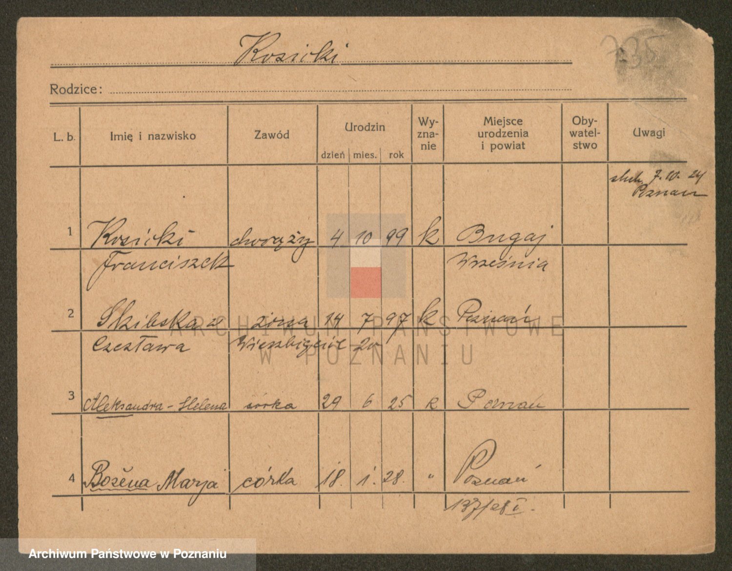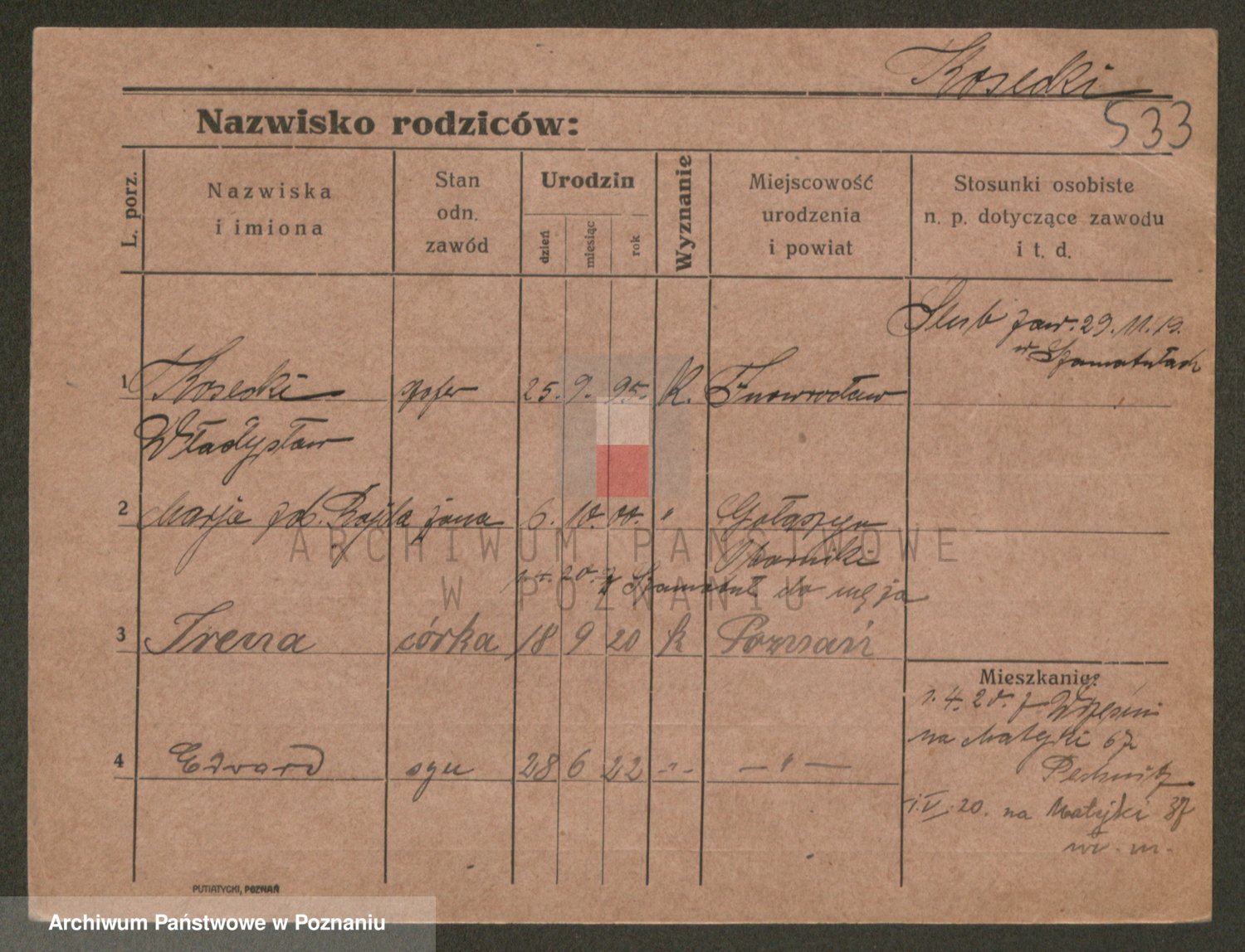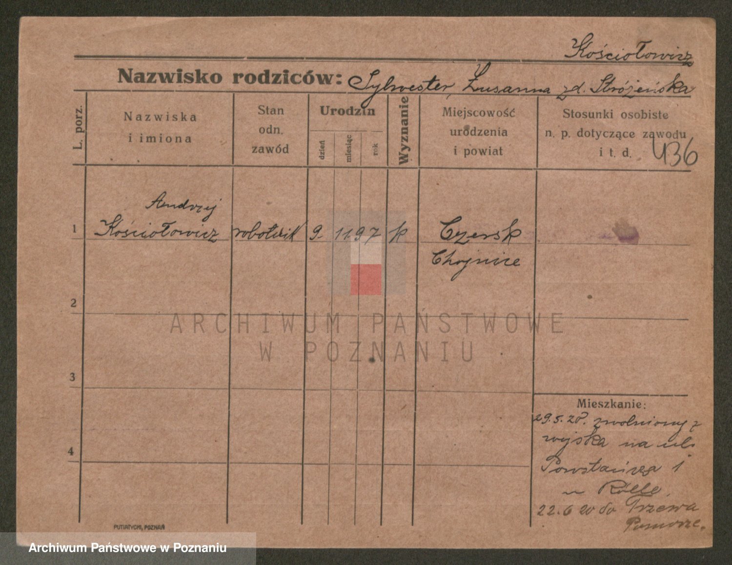 Podgląd karty osobowej dostępny jest po kliknięciu na nazwisko lub ikonkę karty. Można dokonywać powiększenia (ikony na górze) lub przechodzić między kolejnymi skanami (strzałki po bokach).