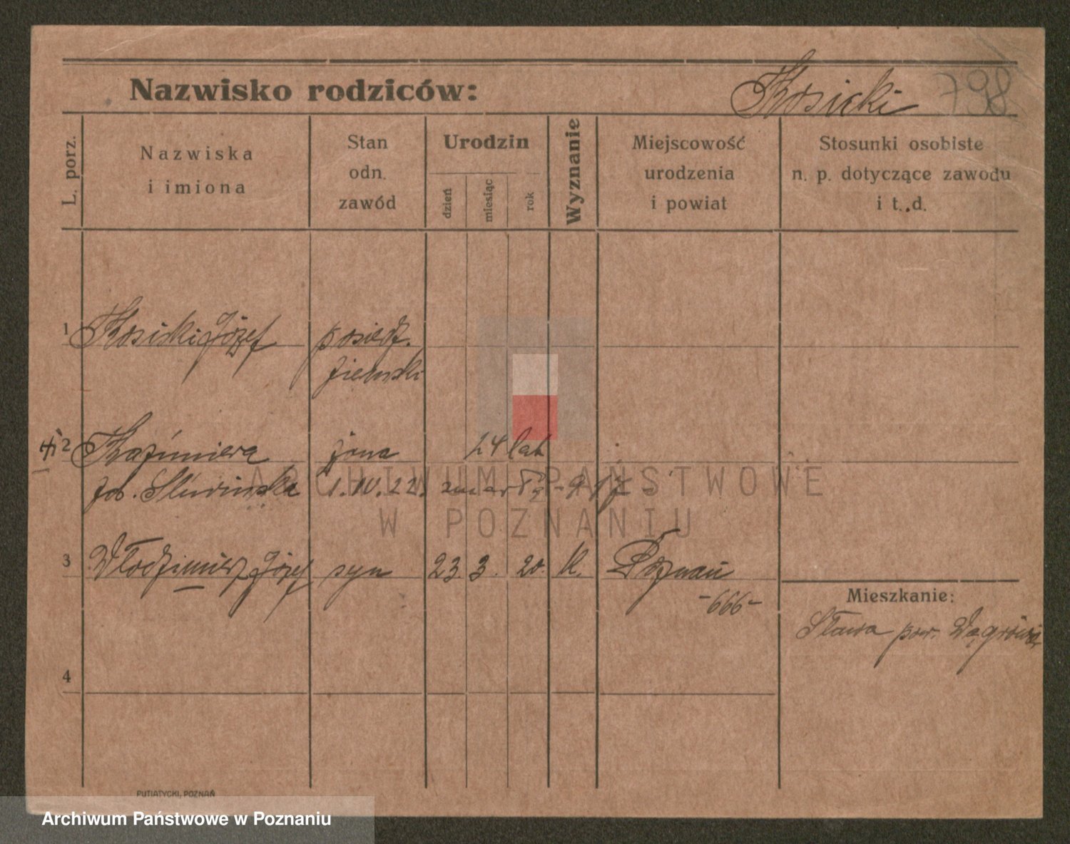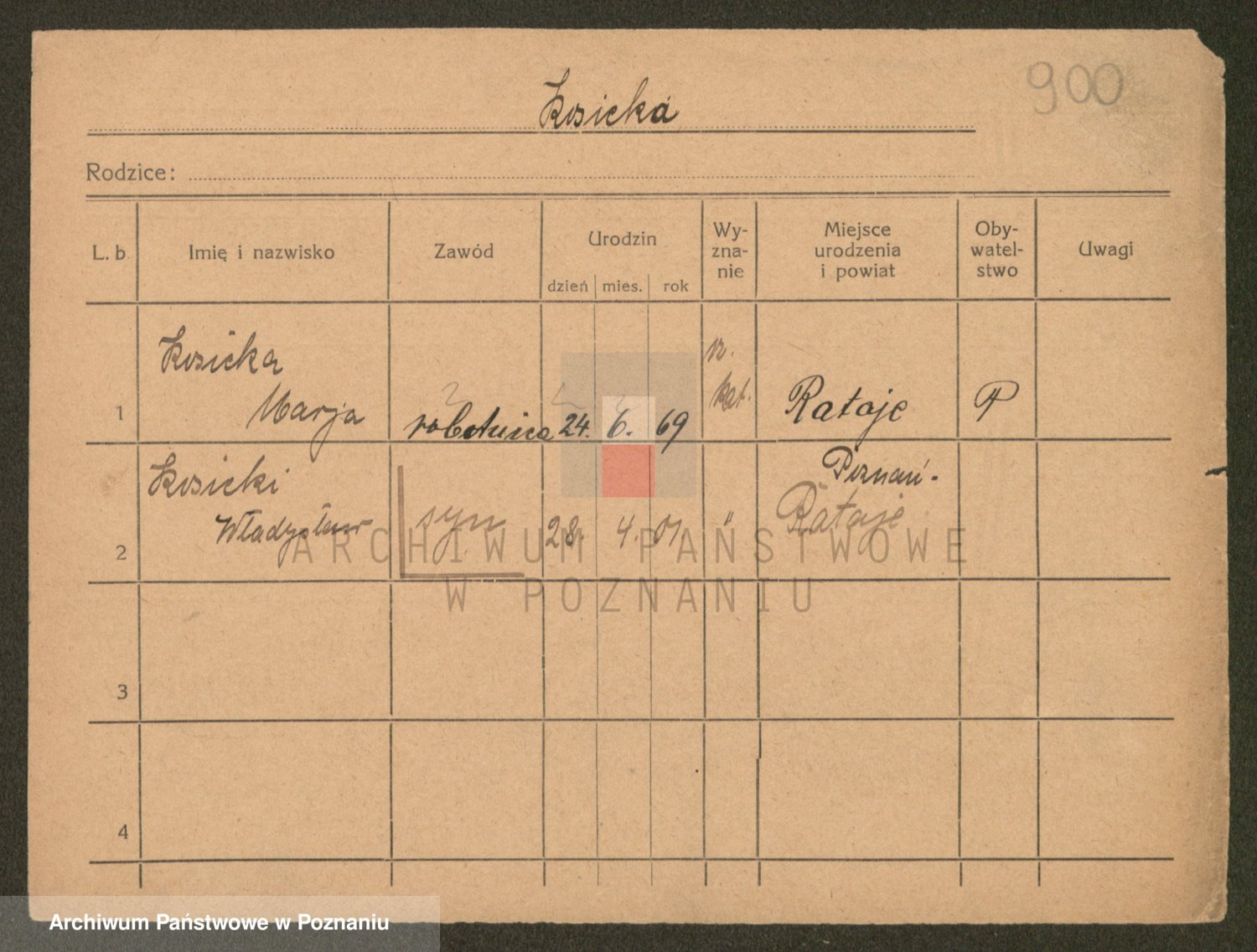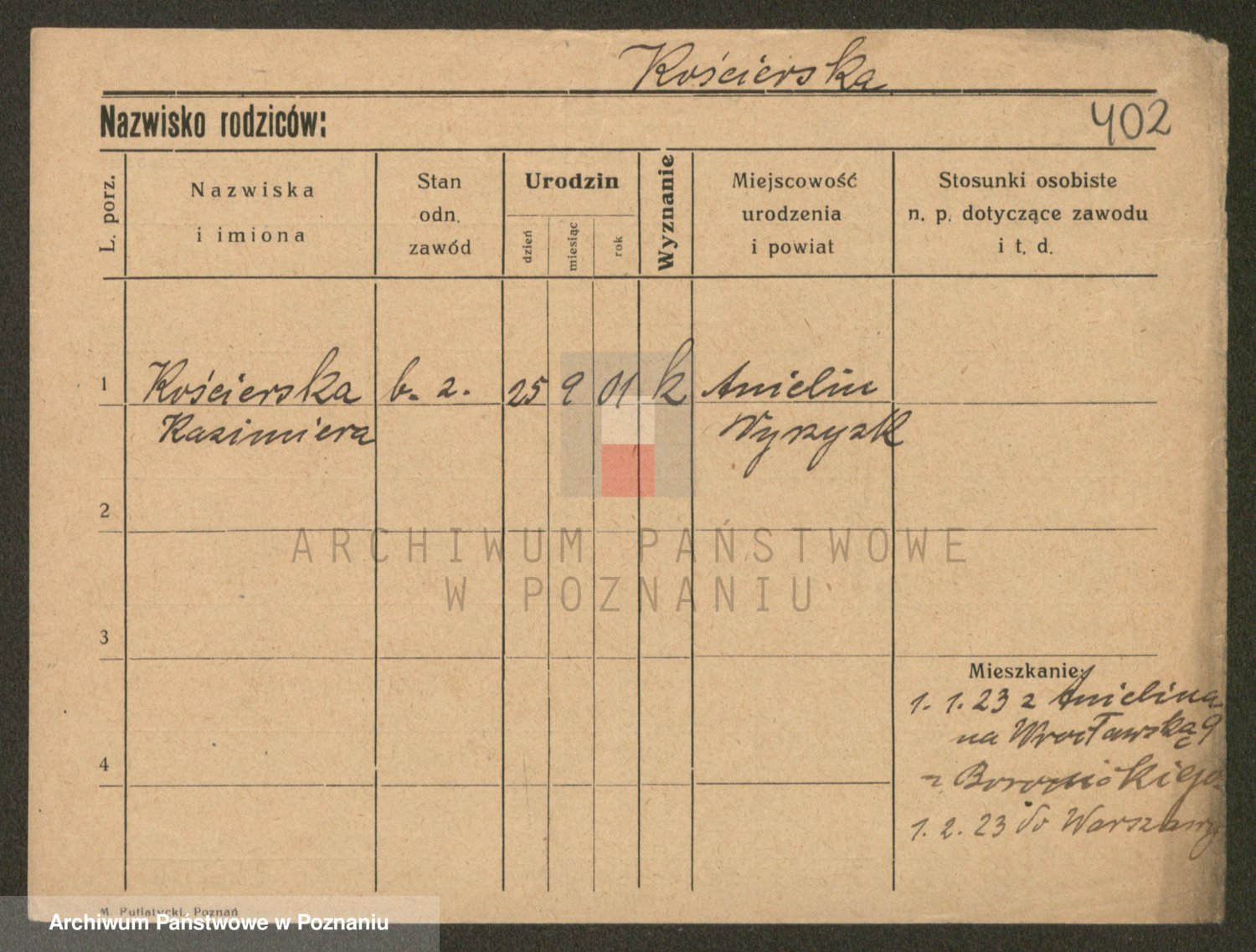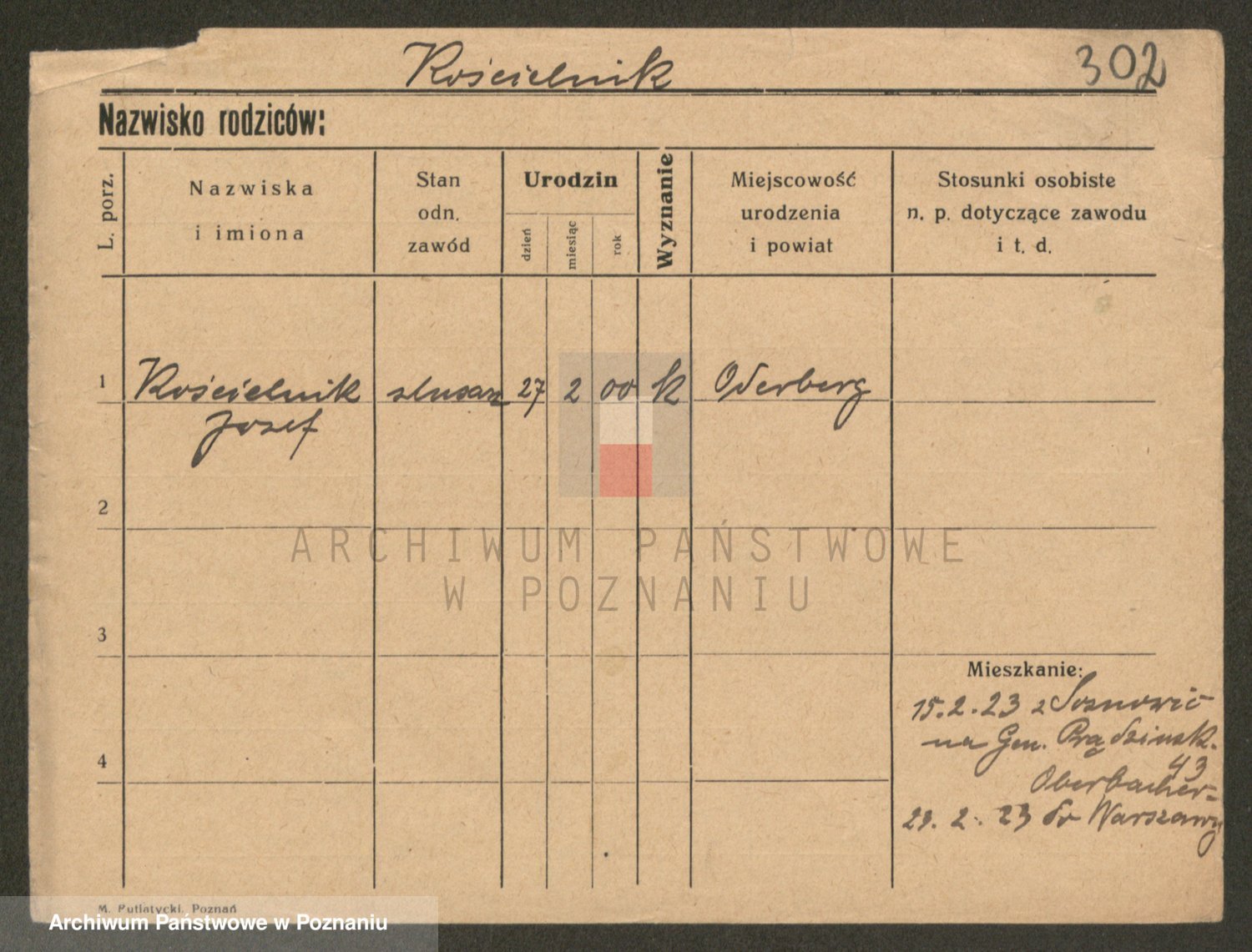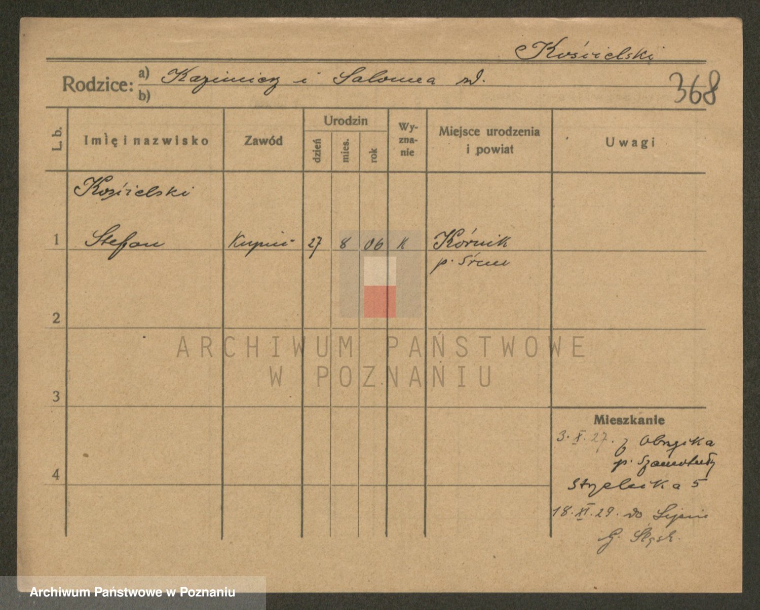 Podgląd karty osobowej dostępny jest po kliknięciu na nazwisko lub ikonkę karty. Można dokonywać powiększenia (ikony na górze) lub przechodzić między kolejnymi skanami (strzałki po bokach).