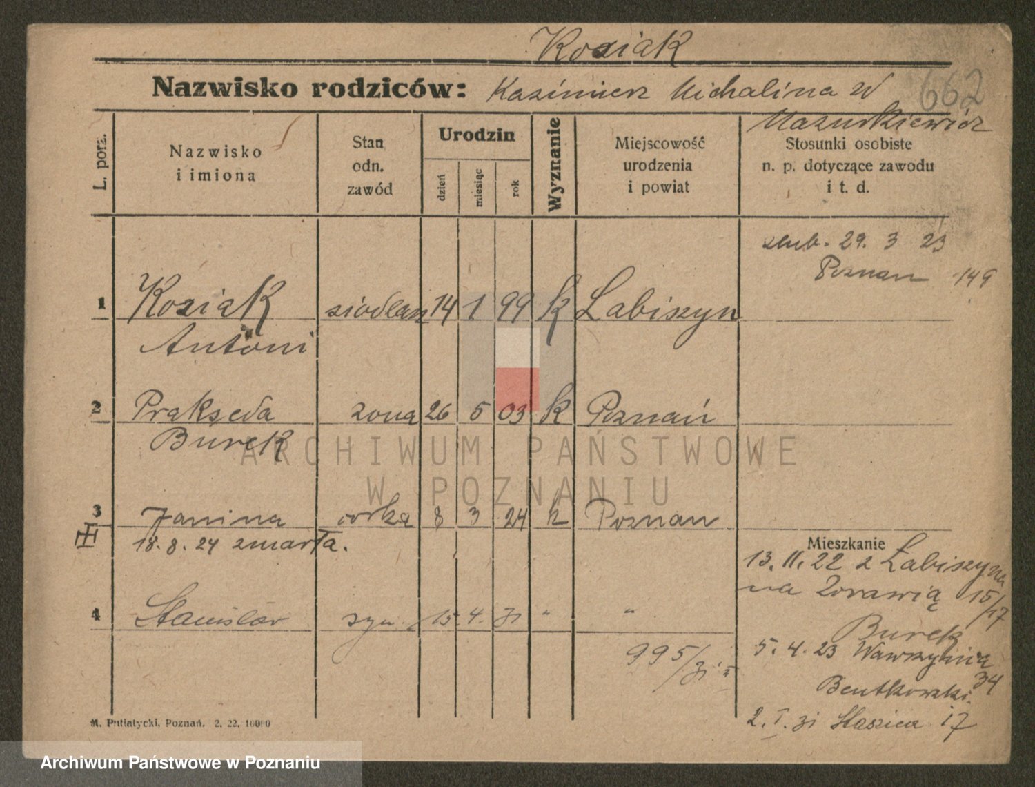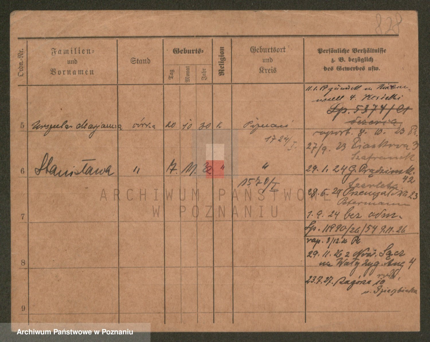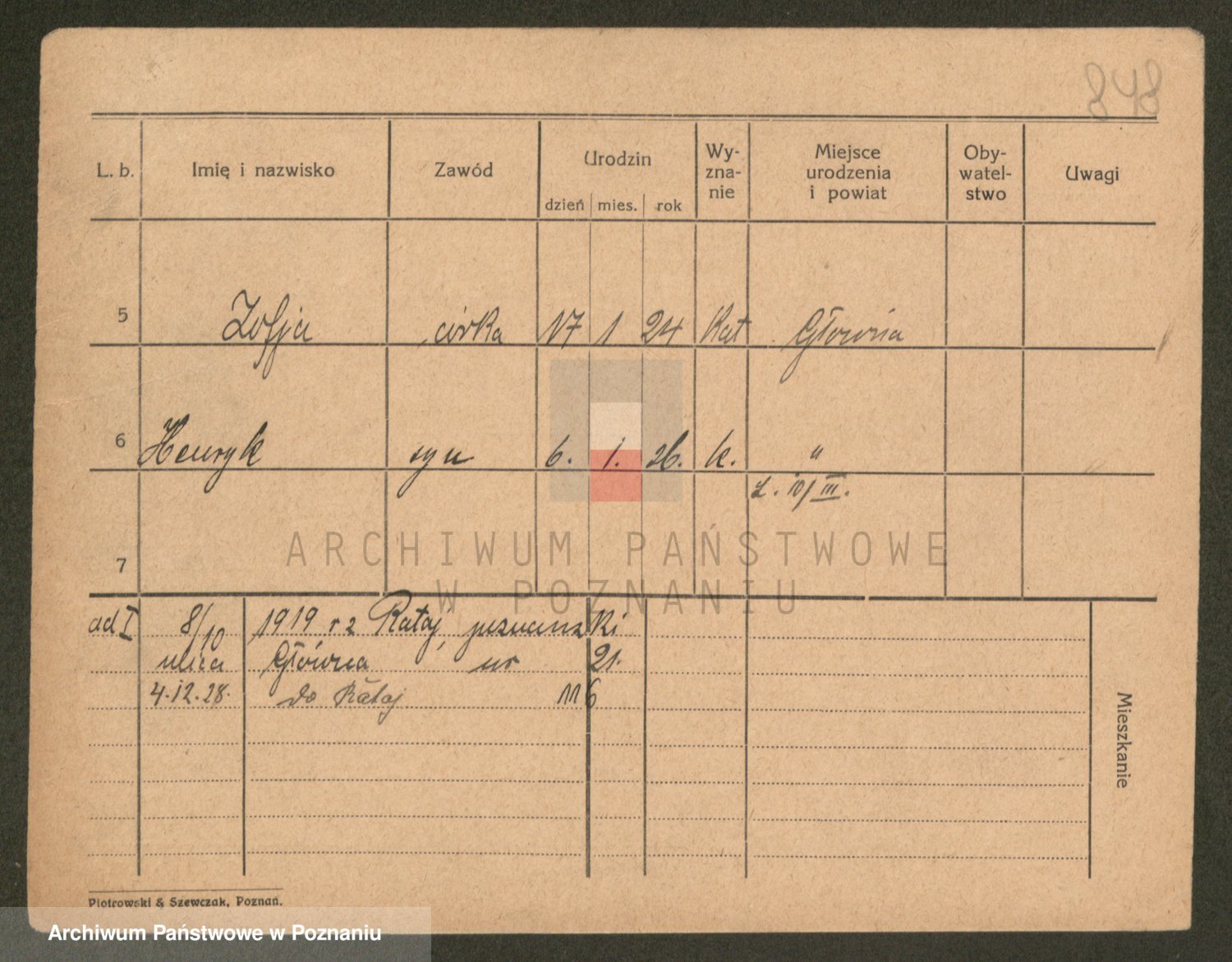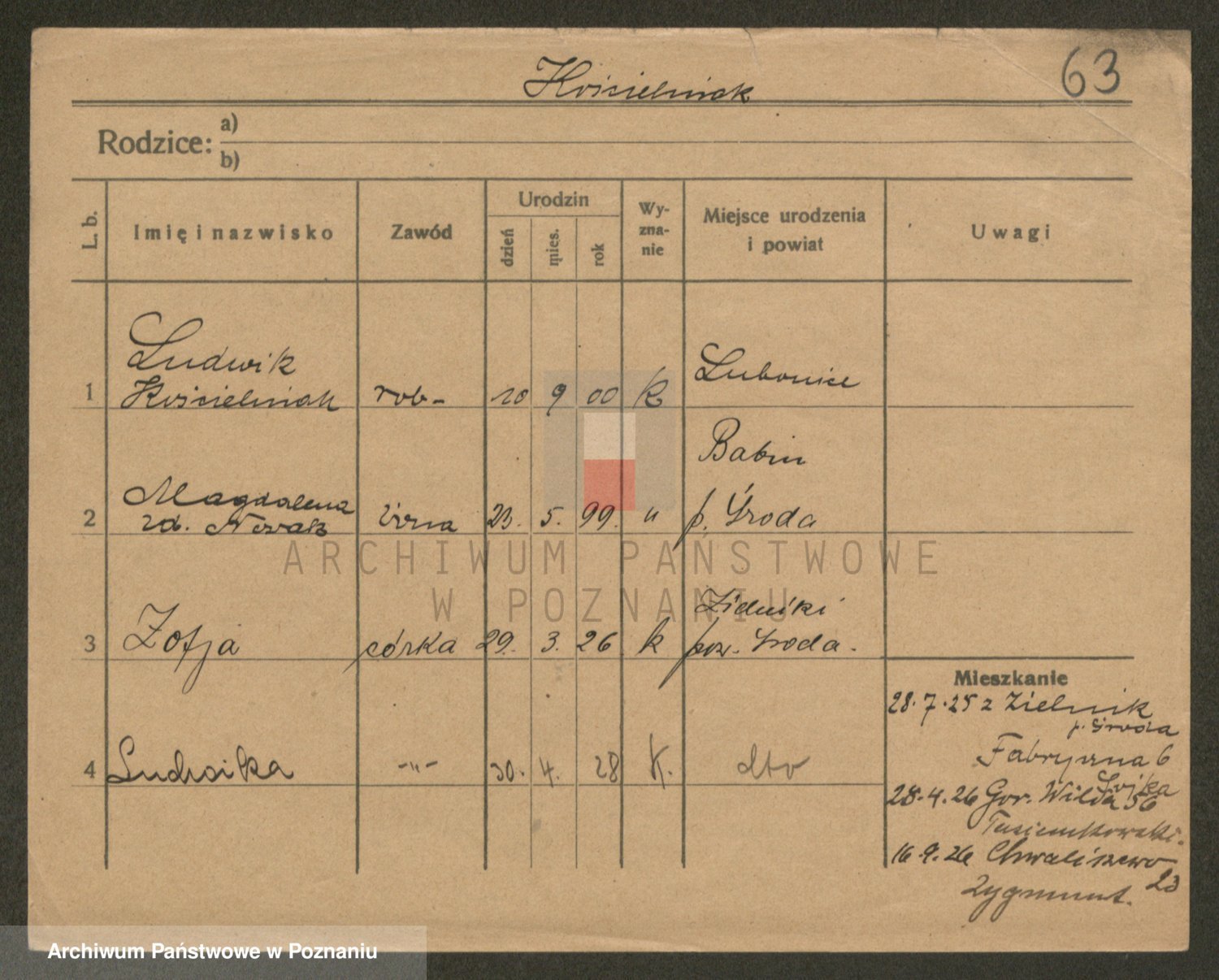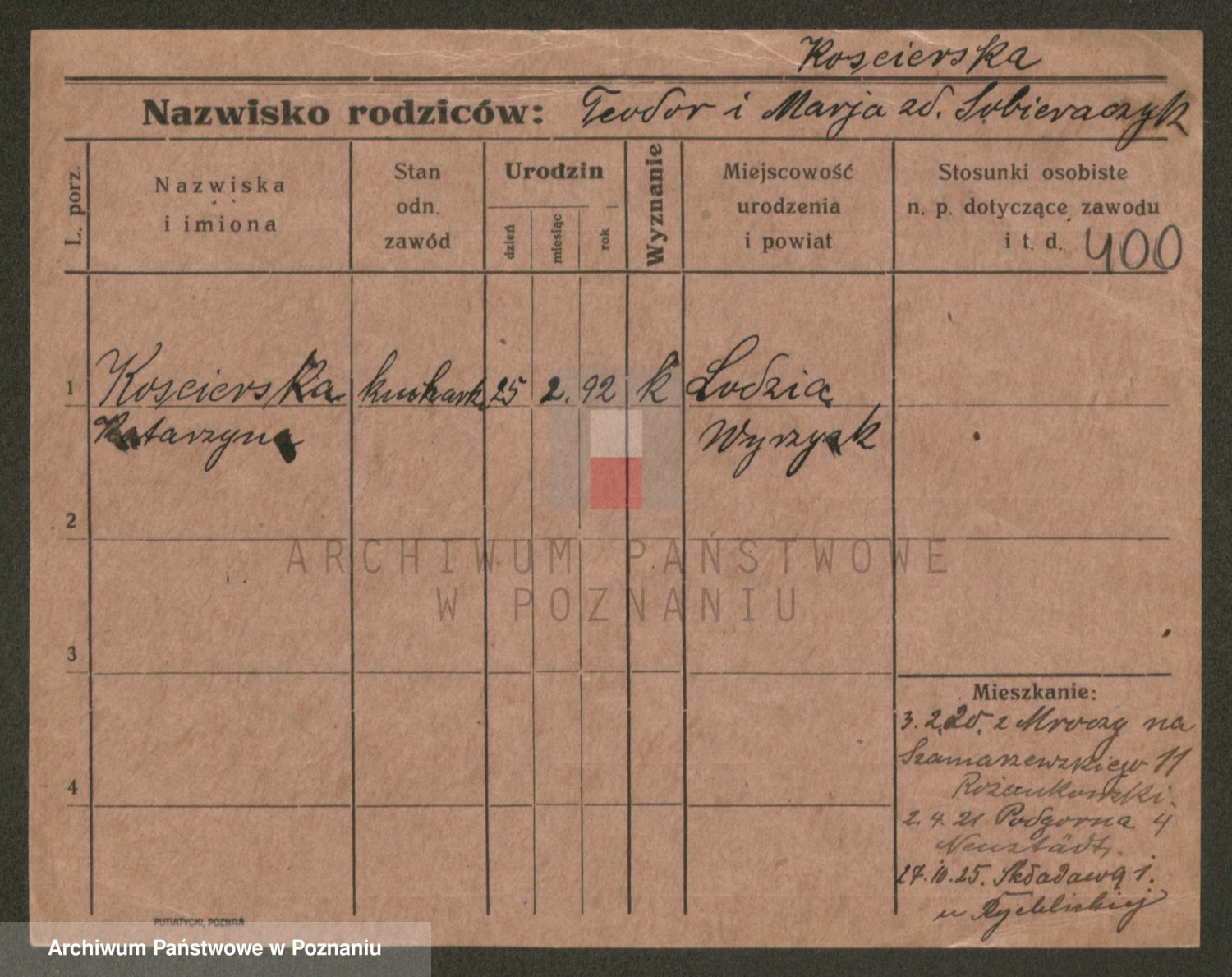 Podgląd karty osobowej dostępny jest po kliknięciu na nazwisko lub ikonkę karty. Można dokonywać powiększenia (ikony na górze) lub przechodzić między kolejnymi skanami (strzałki po bokach).