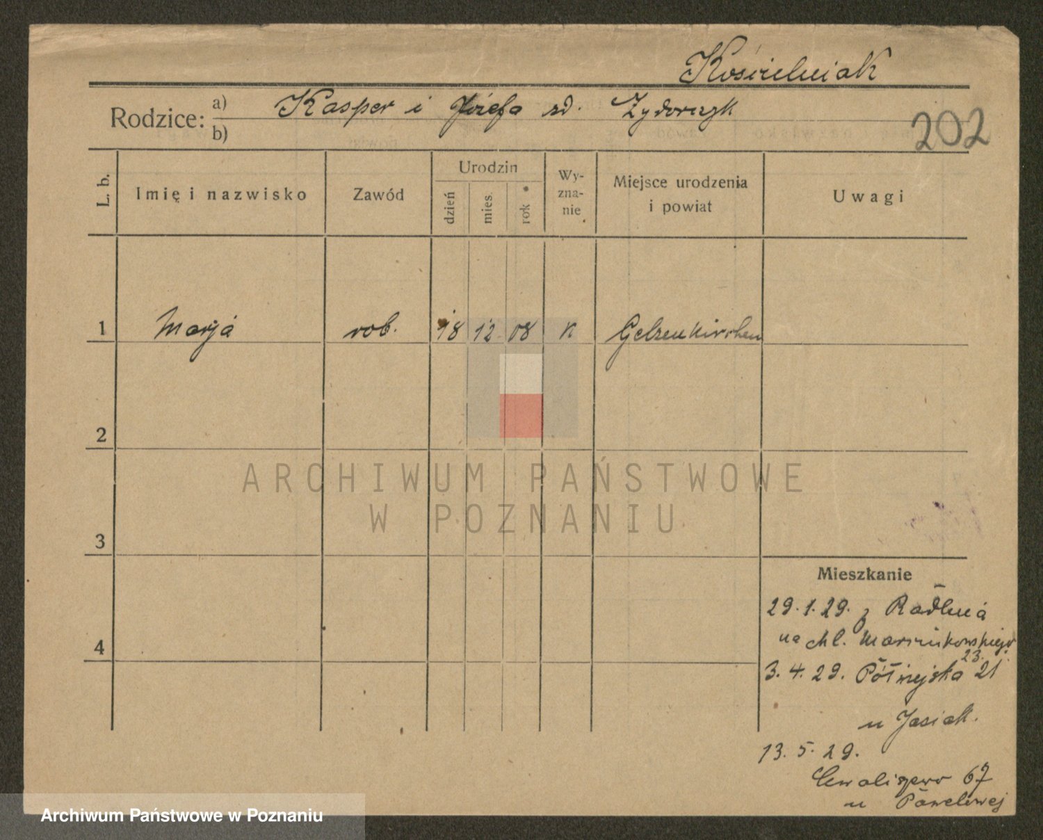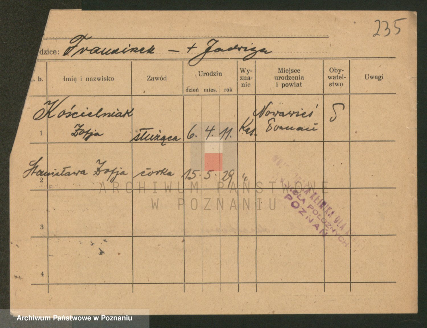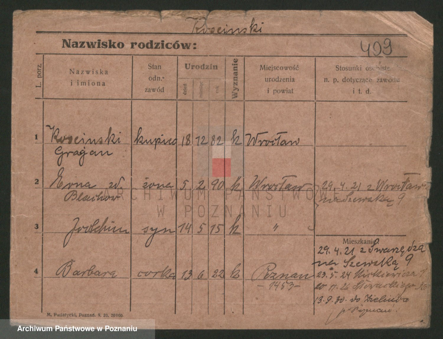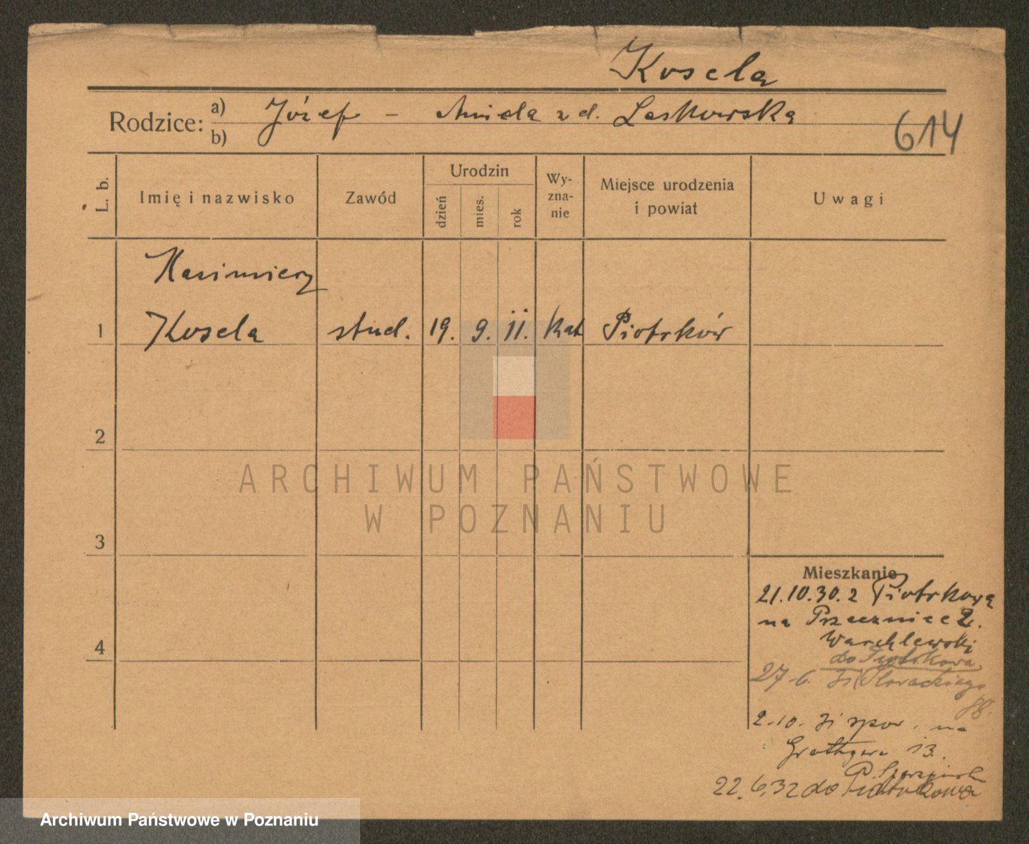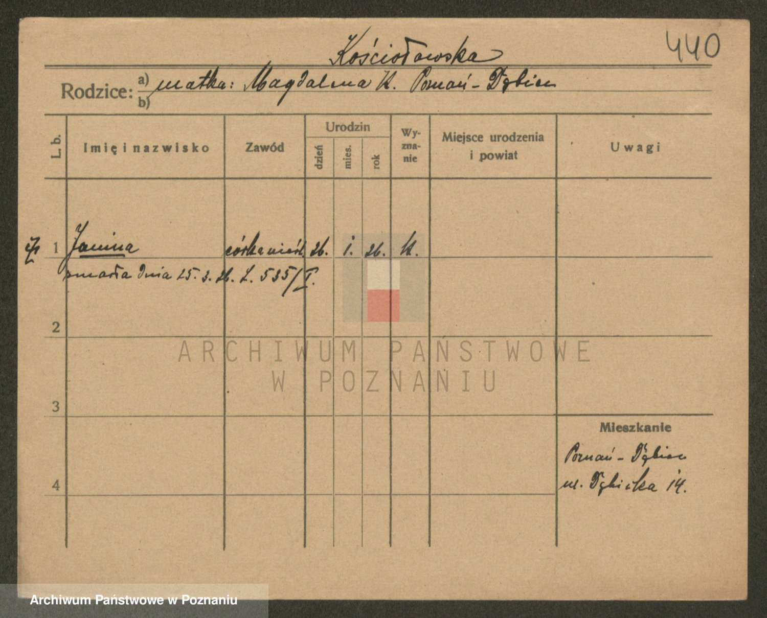 Podgląd karty osobowej dostępny jest po kliknięciu na nazwisko lub ikonkę karty. Można dokonywać powiększenia (ikony na górze) lub przechodzić między kolejnymi skanami (strzałki po bokach).