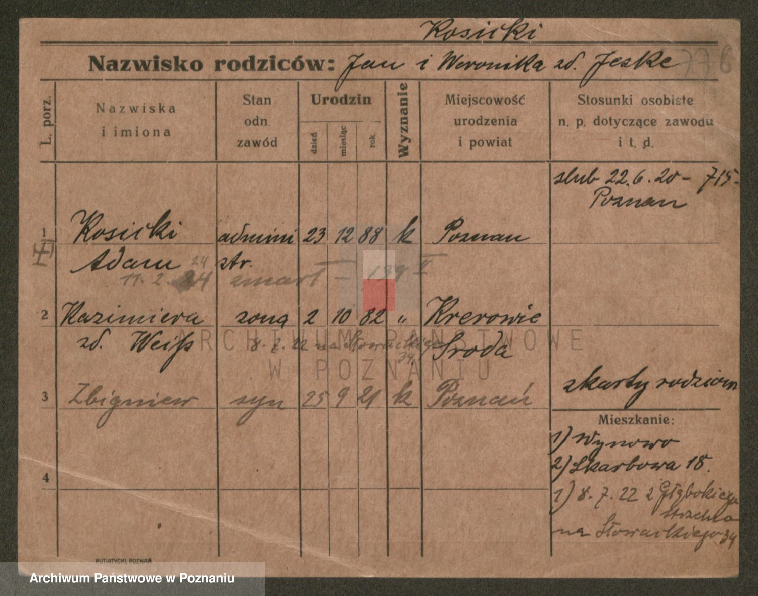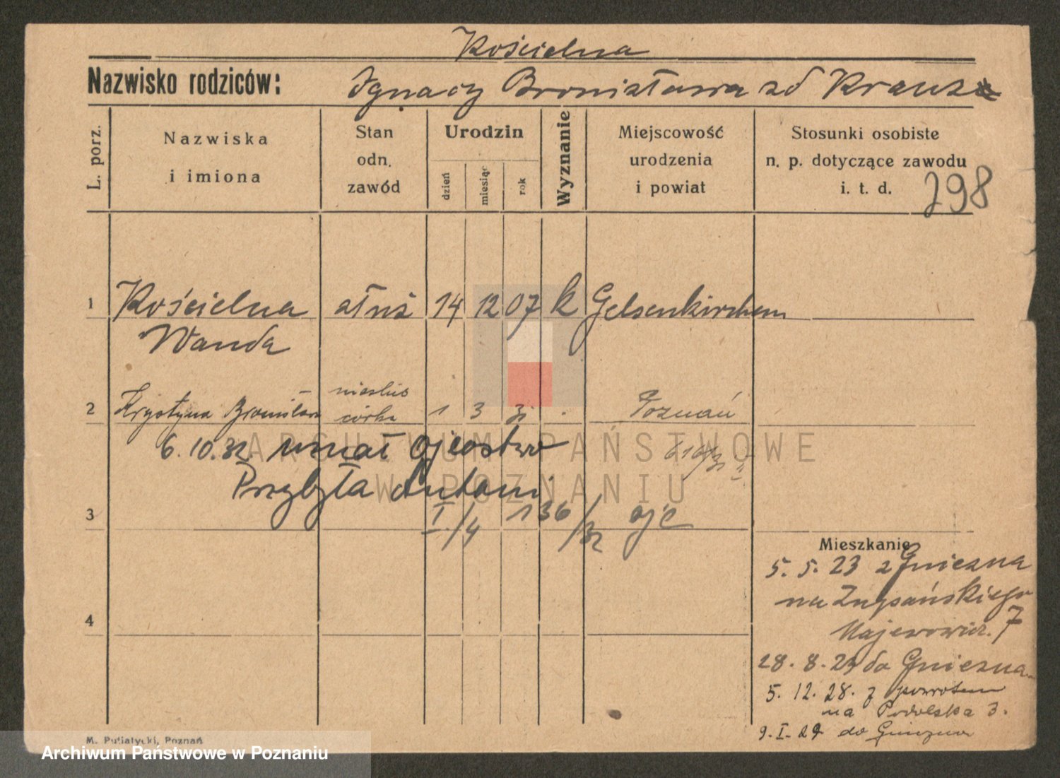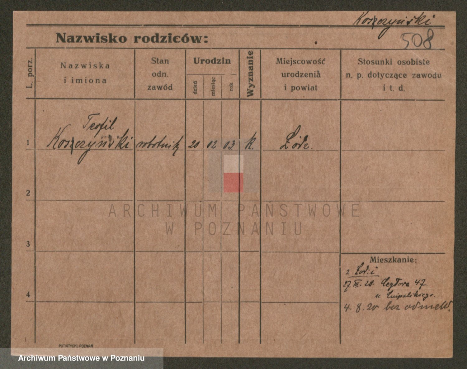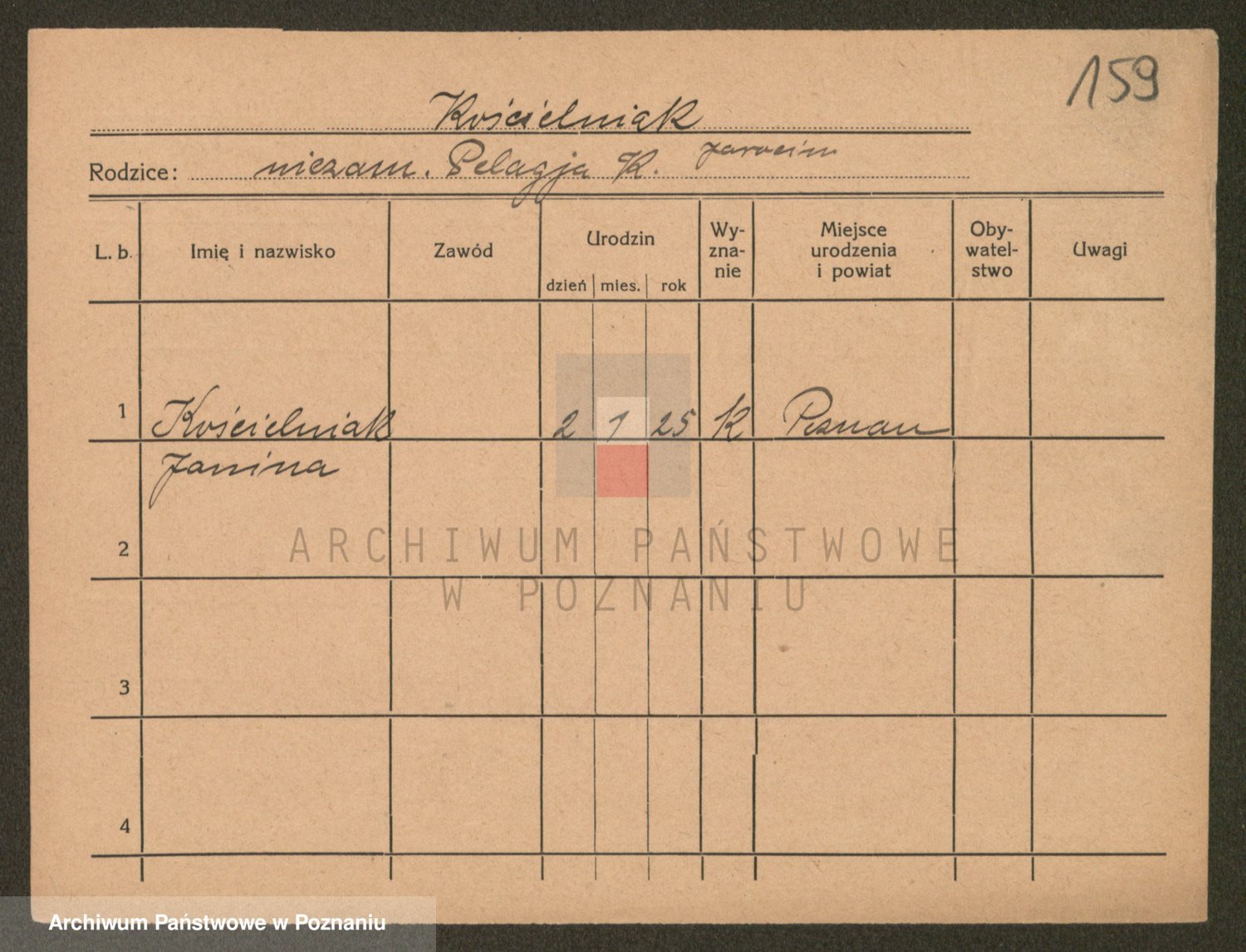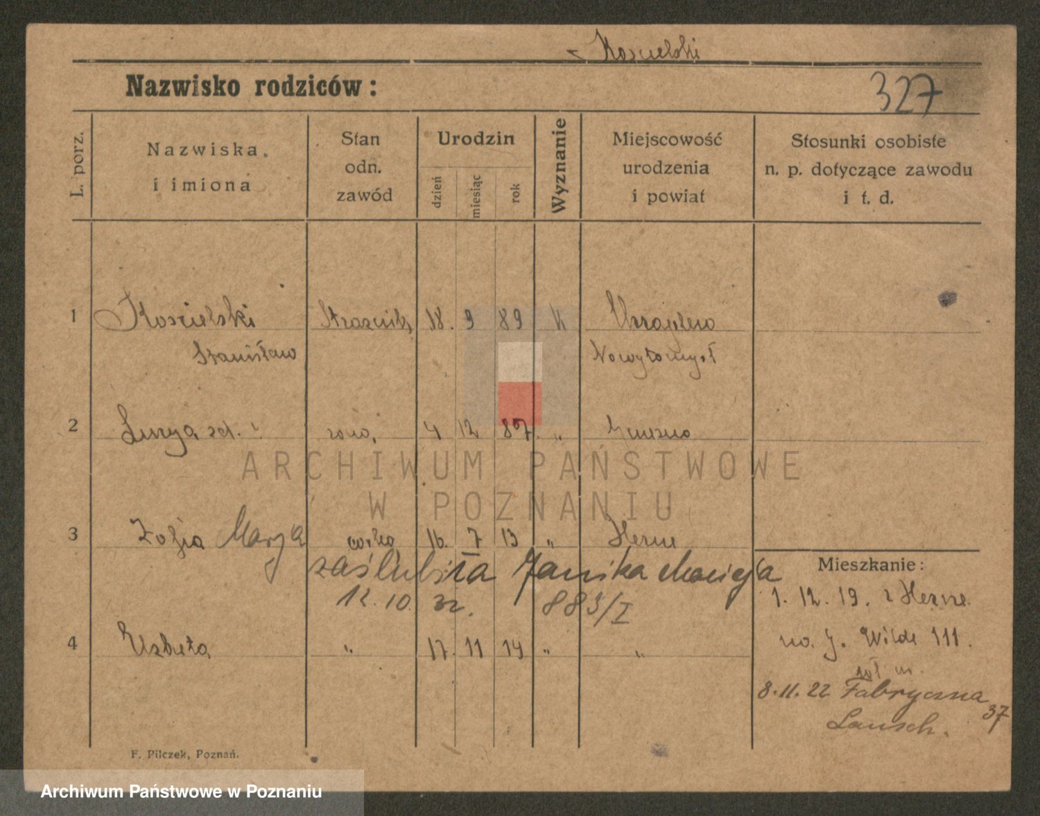 Podgląd karty osobowej dostępny jest po kliknięciu na nazwisko lub ikonkę karty. Można dokonywać powiększenia (ikony na górze) lub przechodzić między kolejnymi skanami (strzałki po bokach).