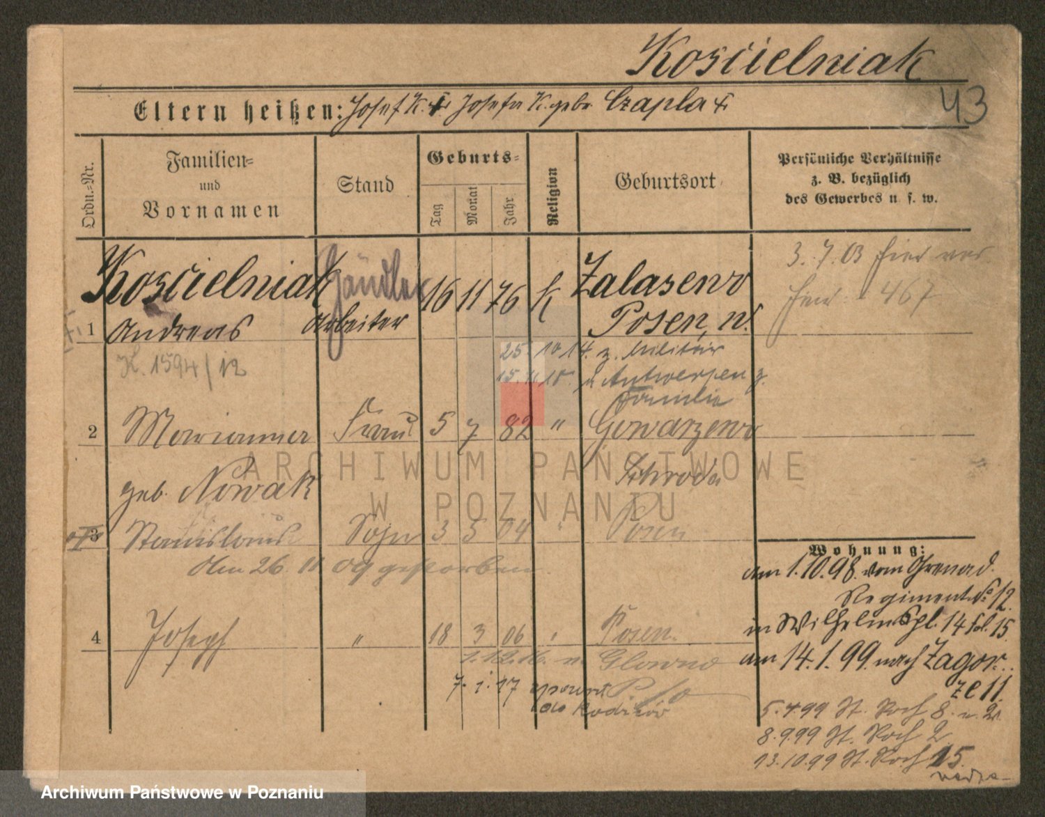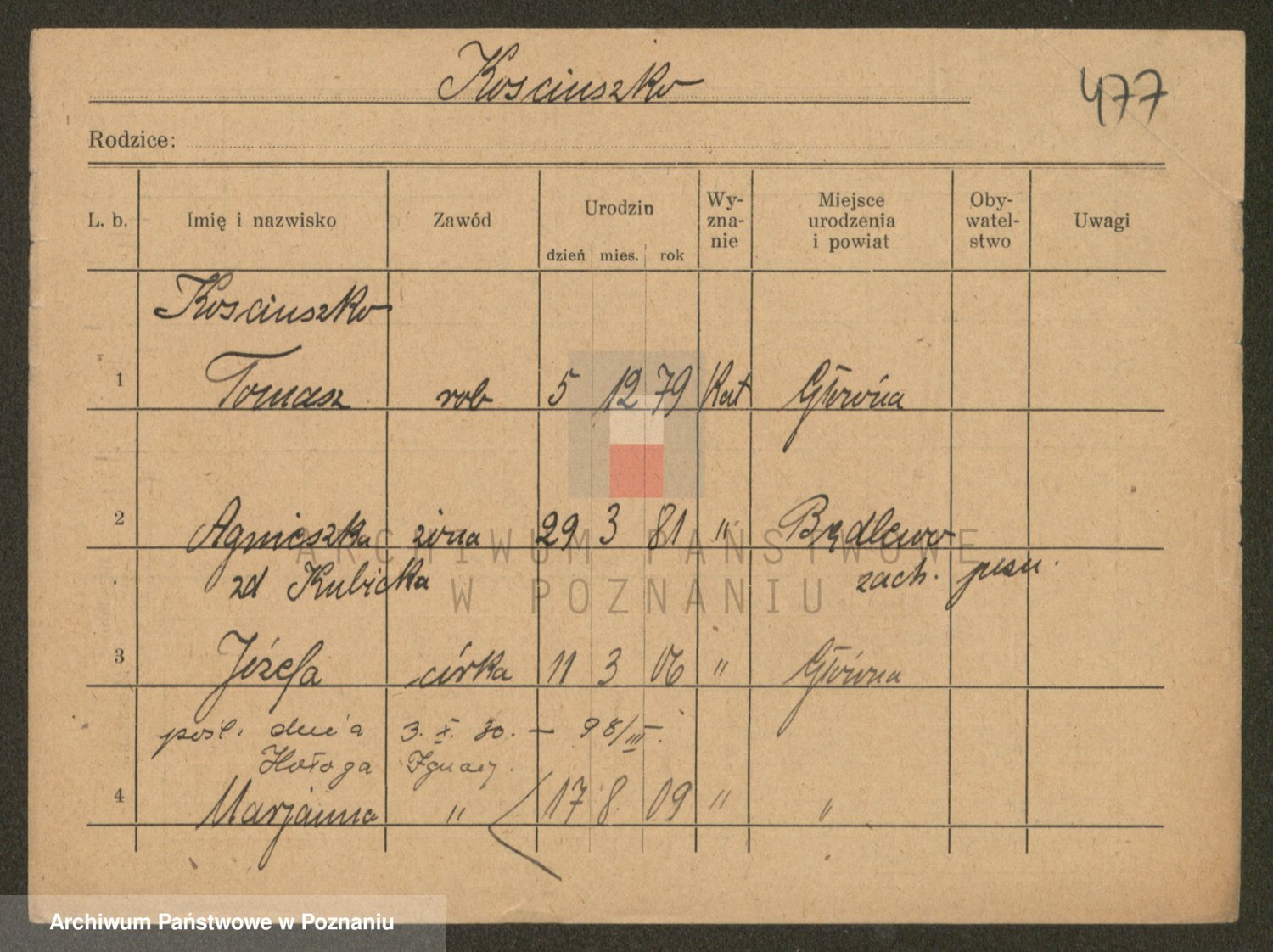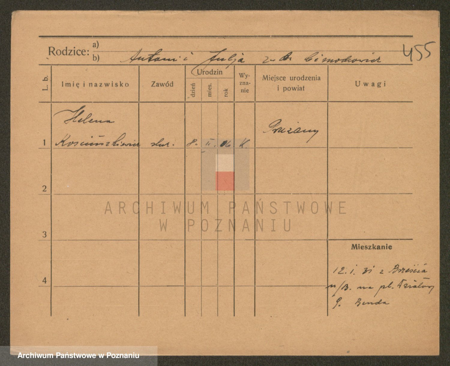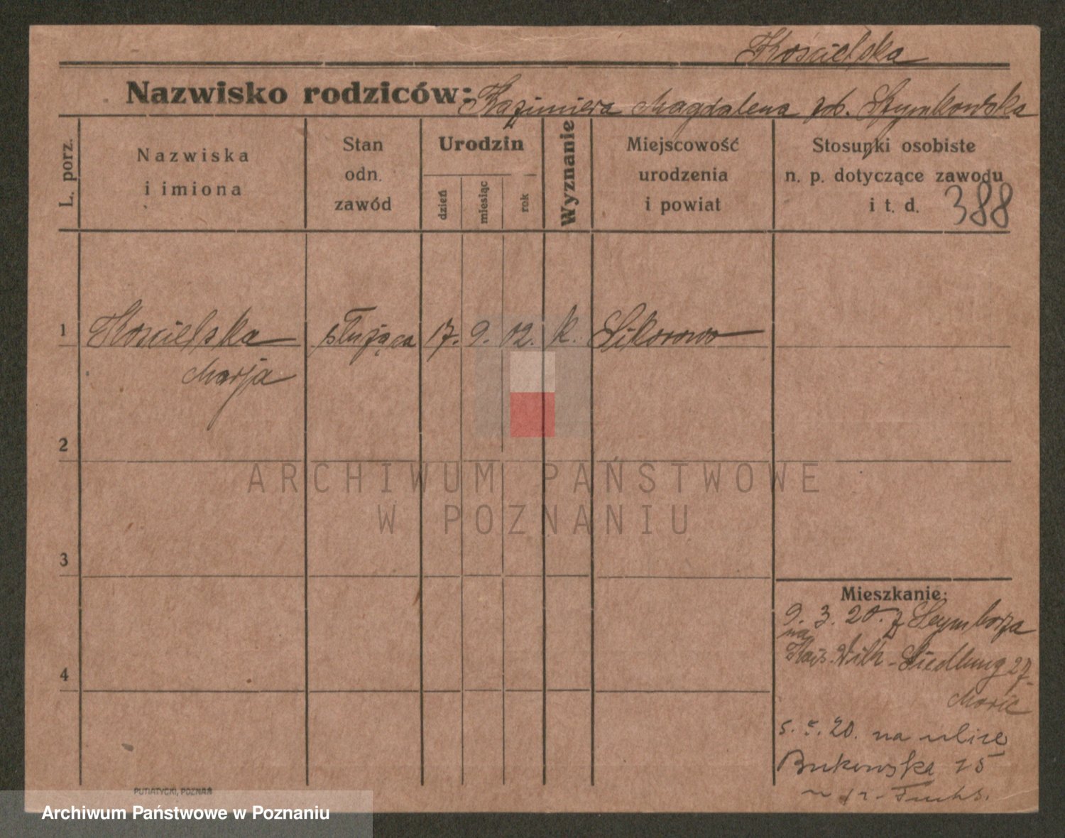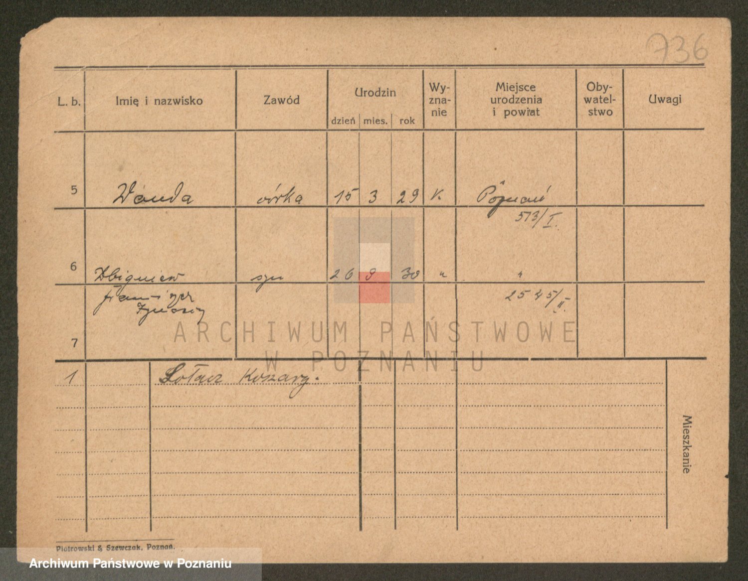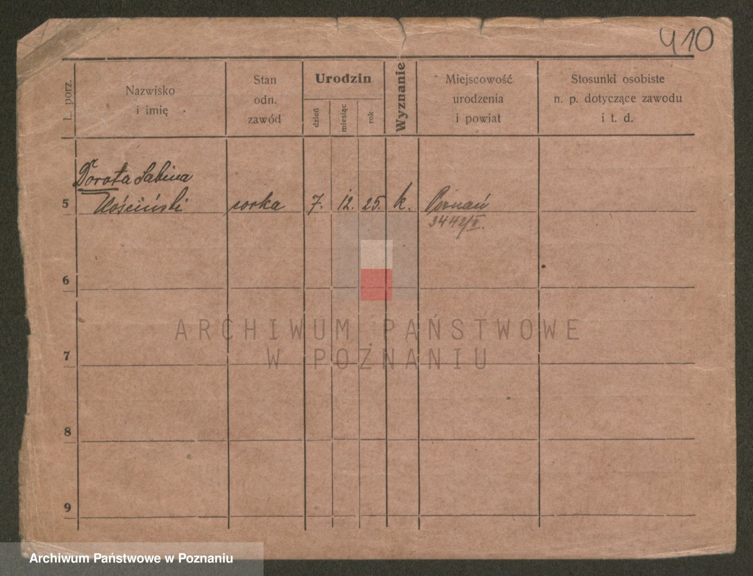 Podgląd karty osobowej dostępny jest po kliknięciu na nazwisko lub ikonkę karty. Można dokonywać powiększenia (ikony na górze) lub przechodzić między kolejnymi skanami (strzałki po bokach).