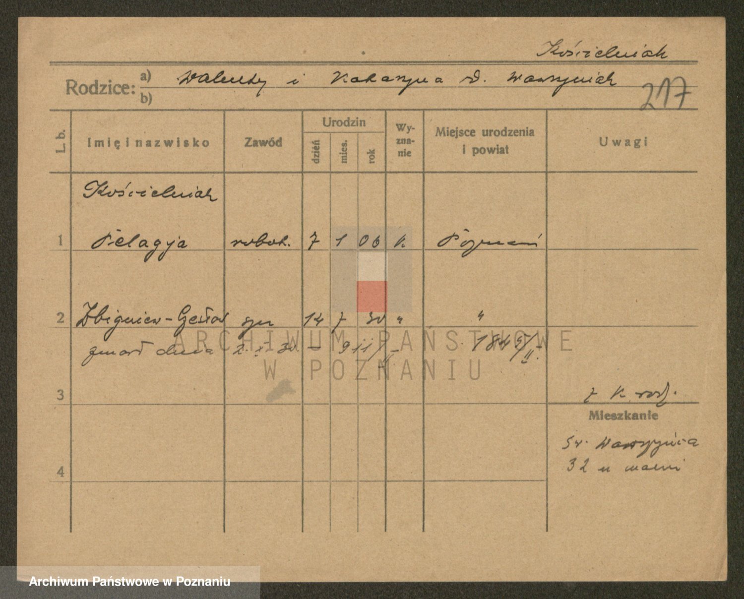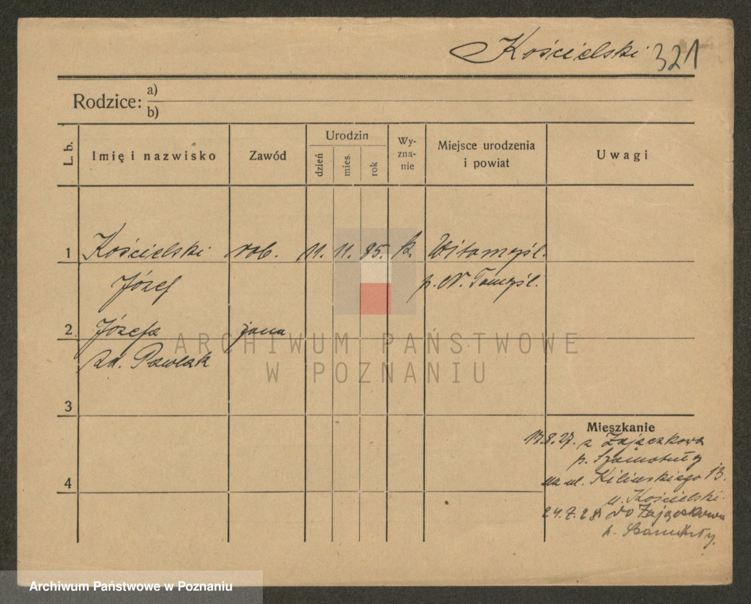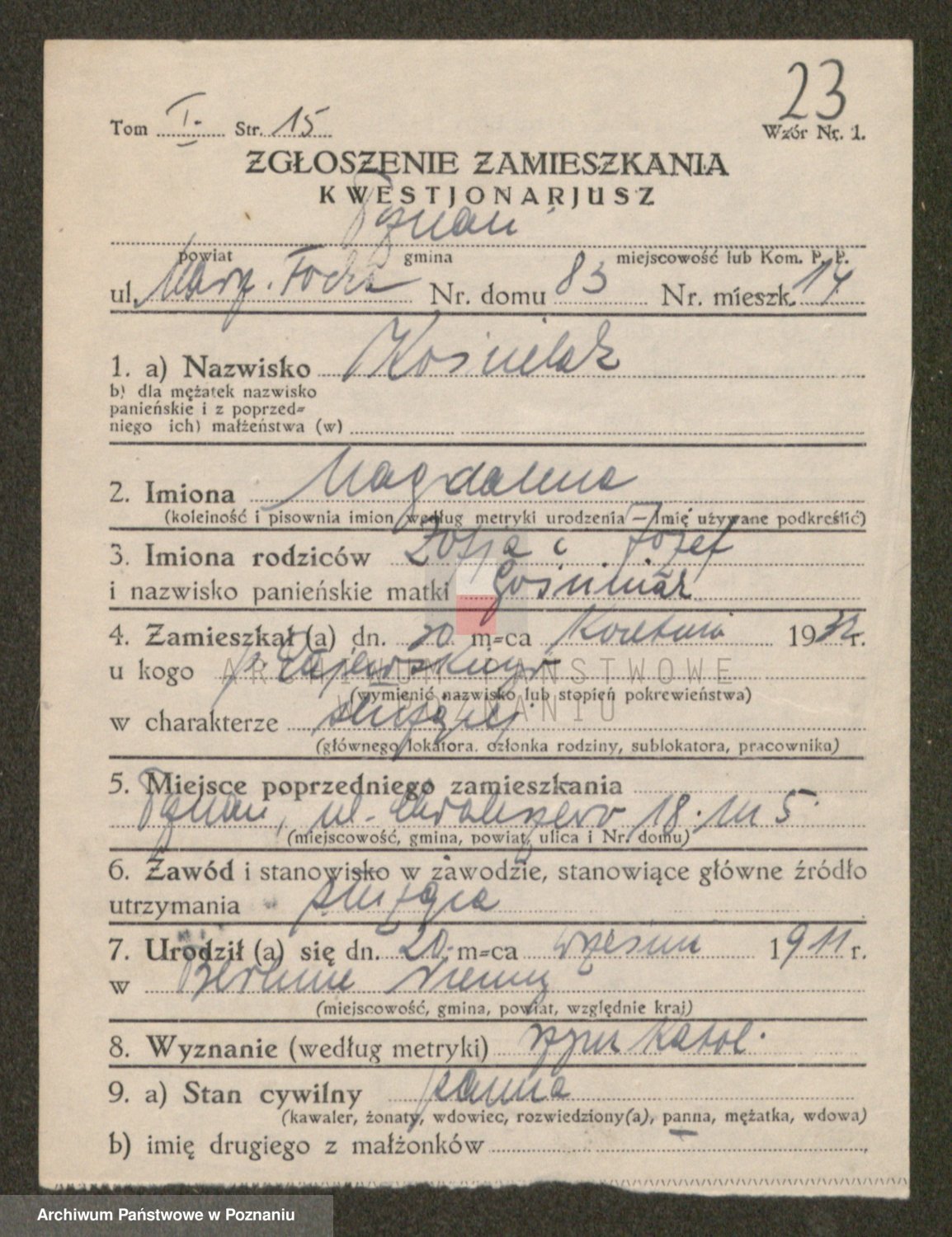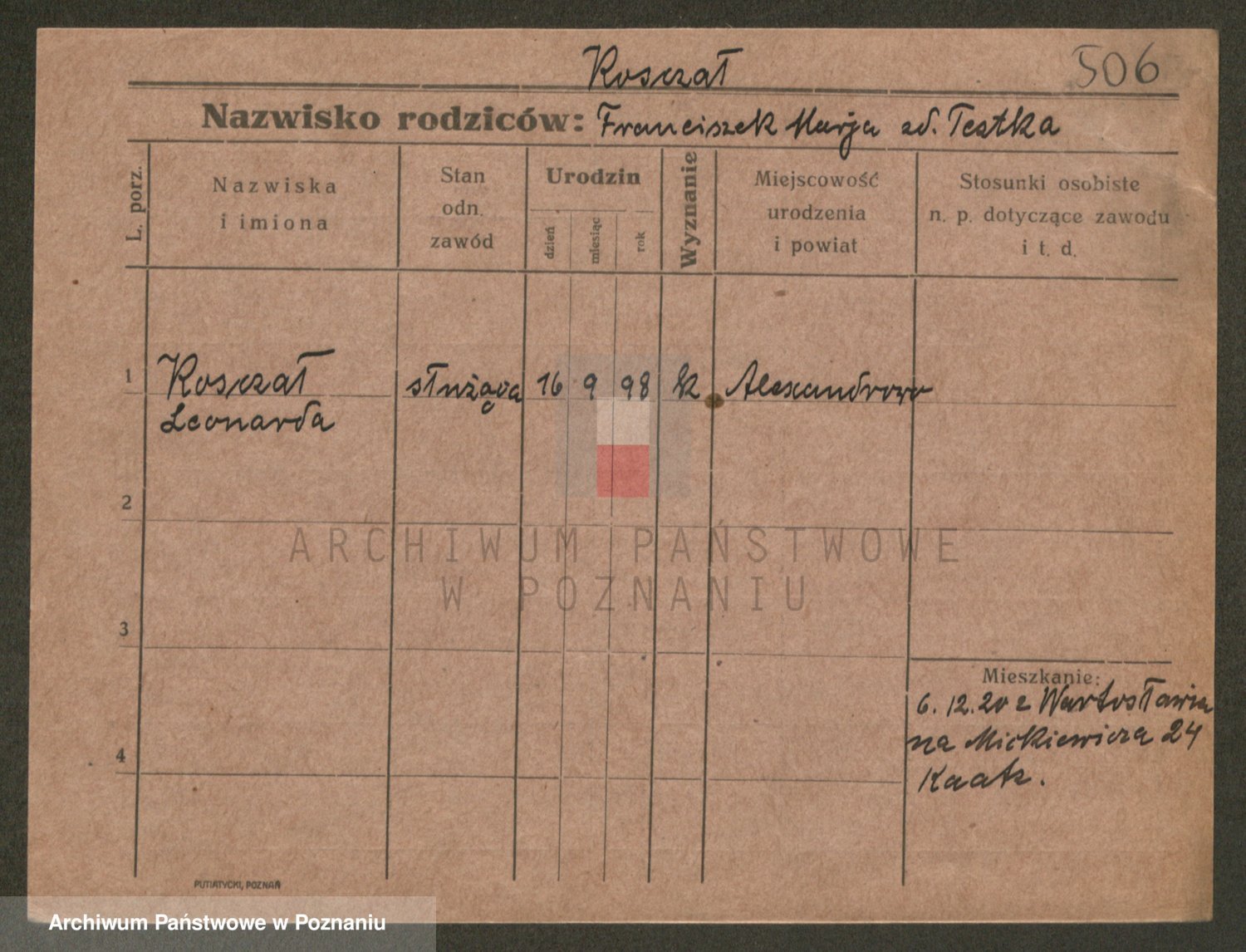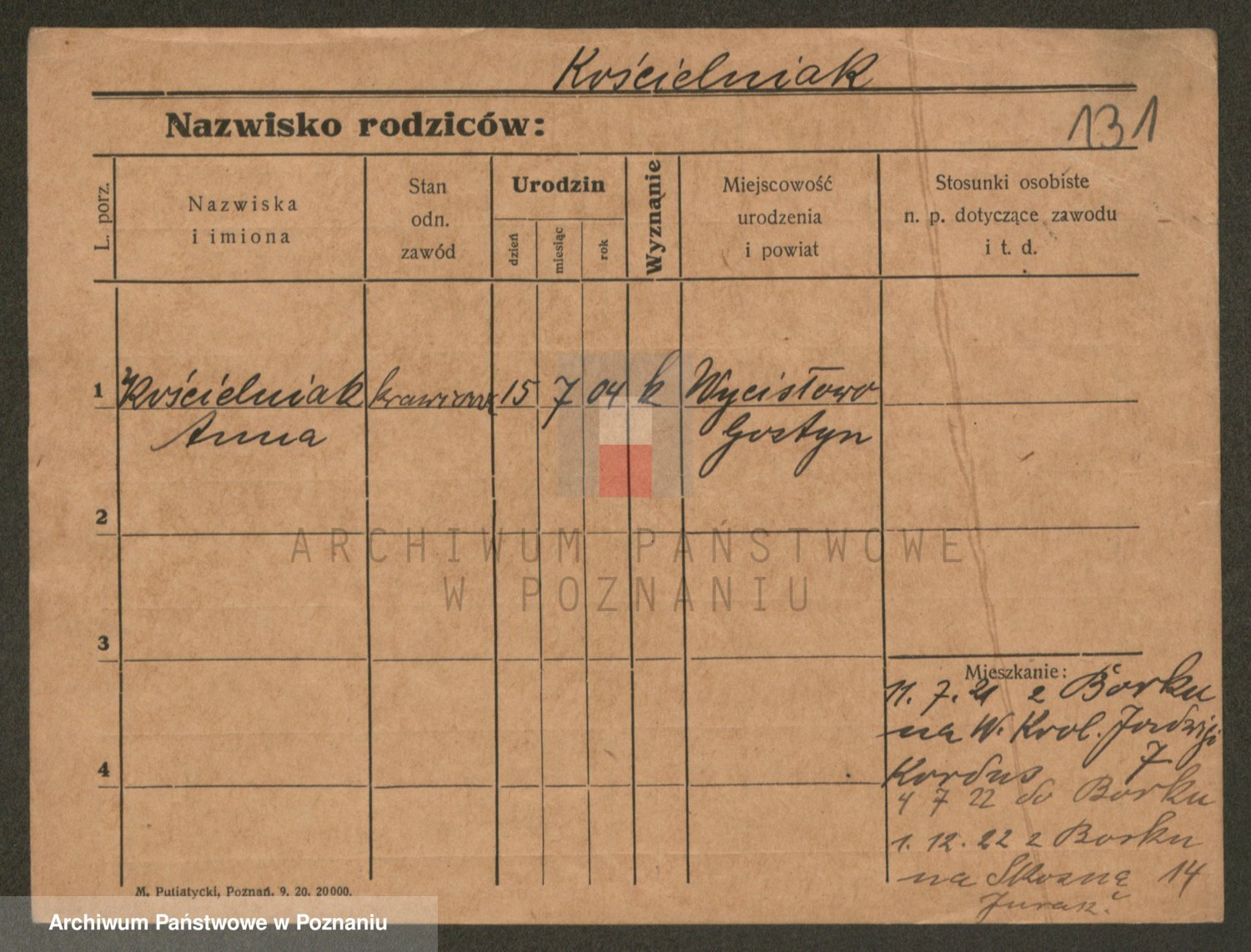 Podgląd karty osobowej dostępny jest po kliknięciu na nazwisko lub ikonkę karty. Można dokonywać powiększenia (ikony na górze) lub przechodzić między kolejnymi skanami (strzałki po bokach).