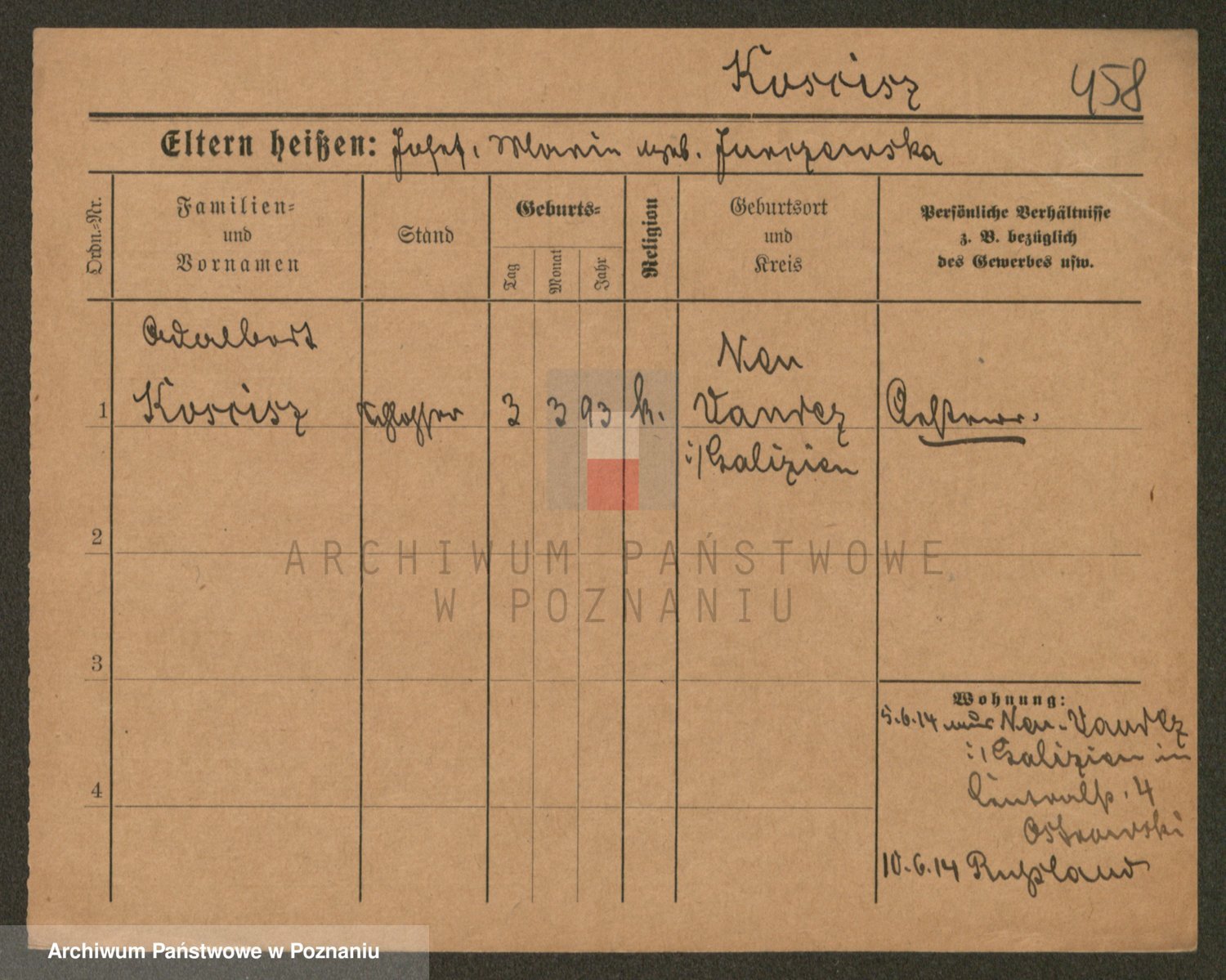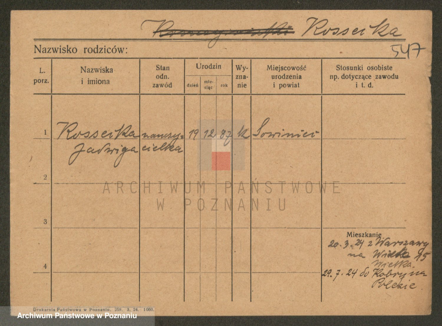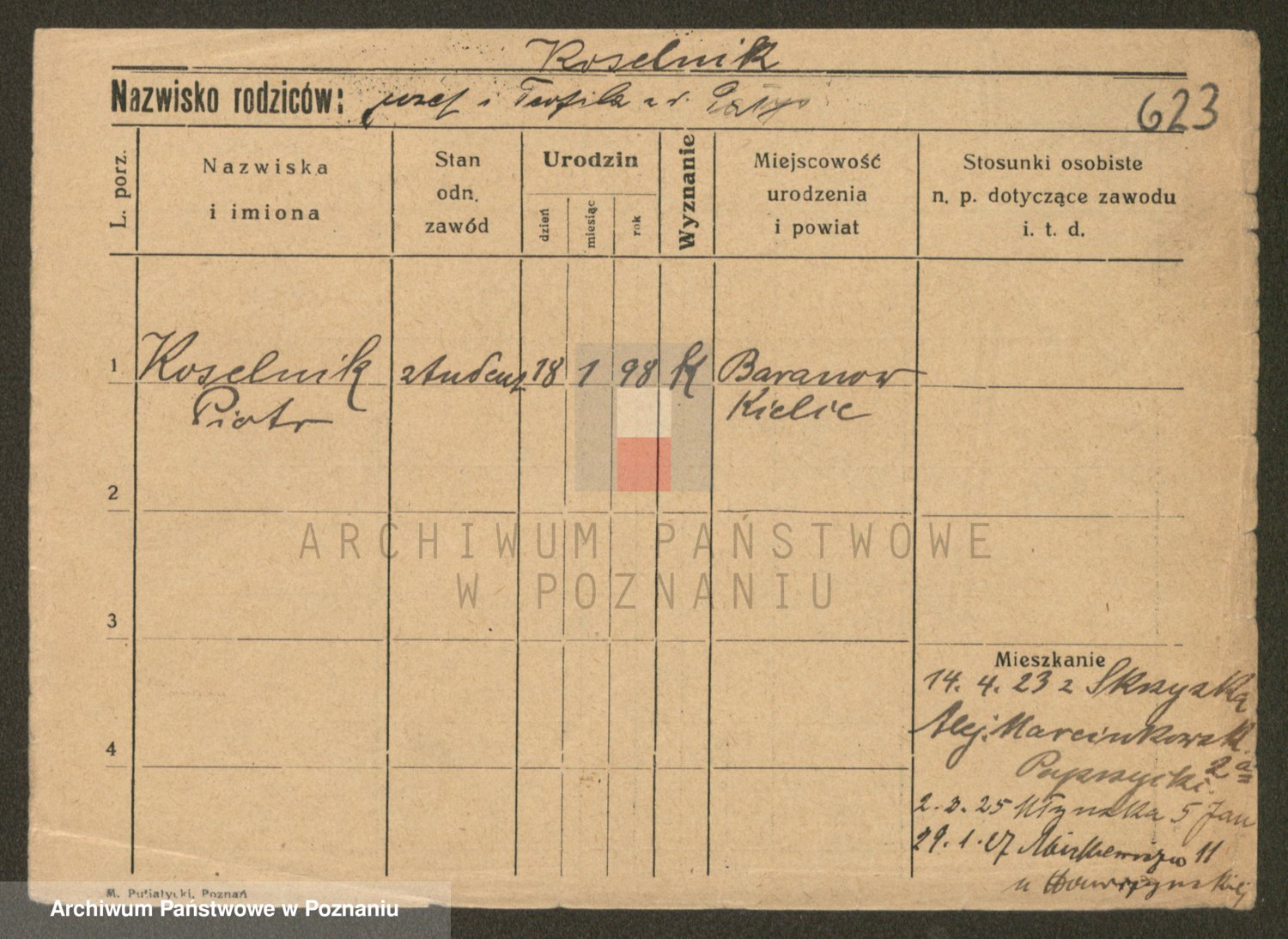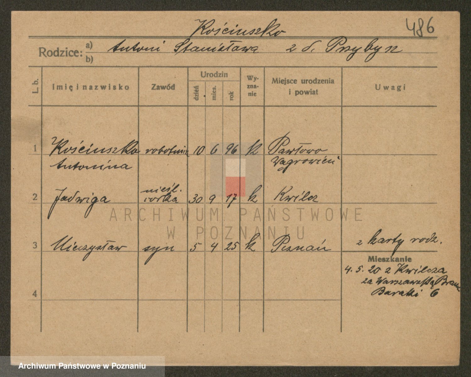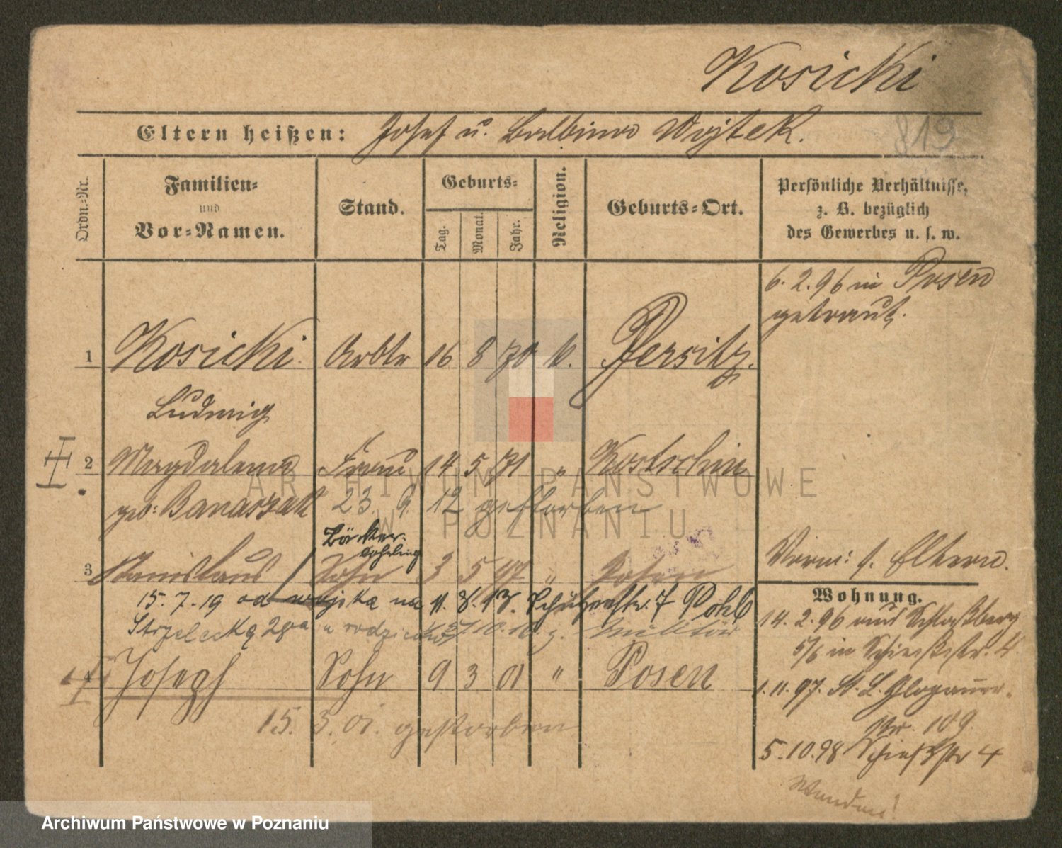 Podgląd karty osobowej dostępny jest po kliknięciu na nazwisko lub ikonkę karty. Można dokonywać powiększenia (ikony na górze) lub przechodzić między kolejnymi skanami (strzałki po bokach).