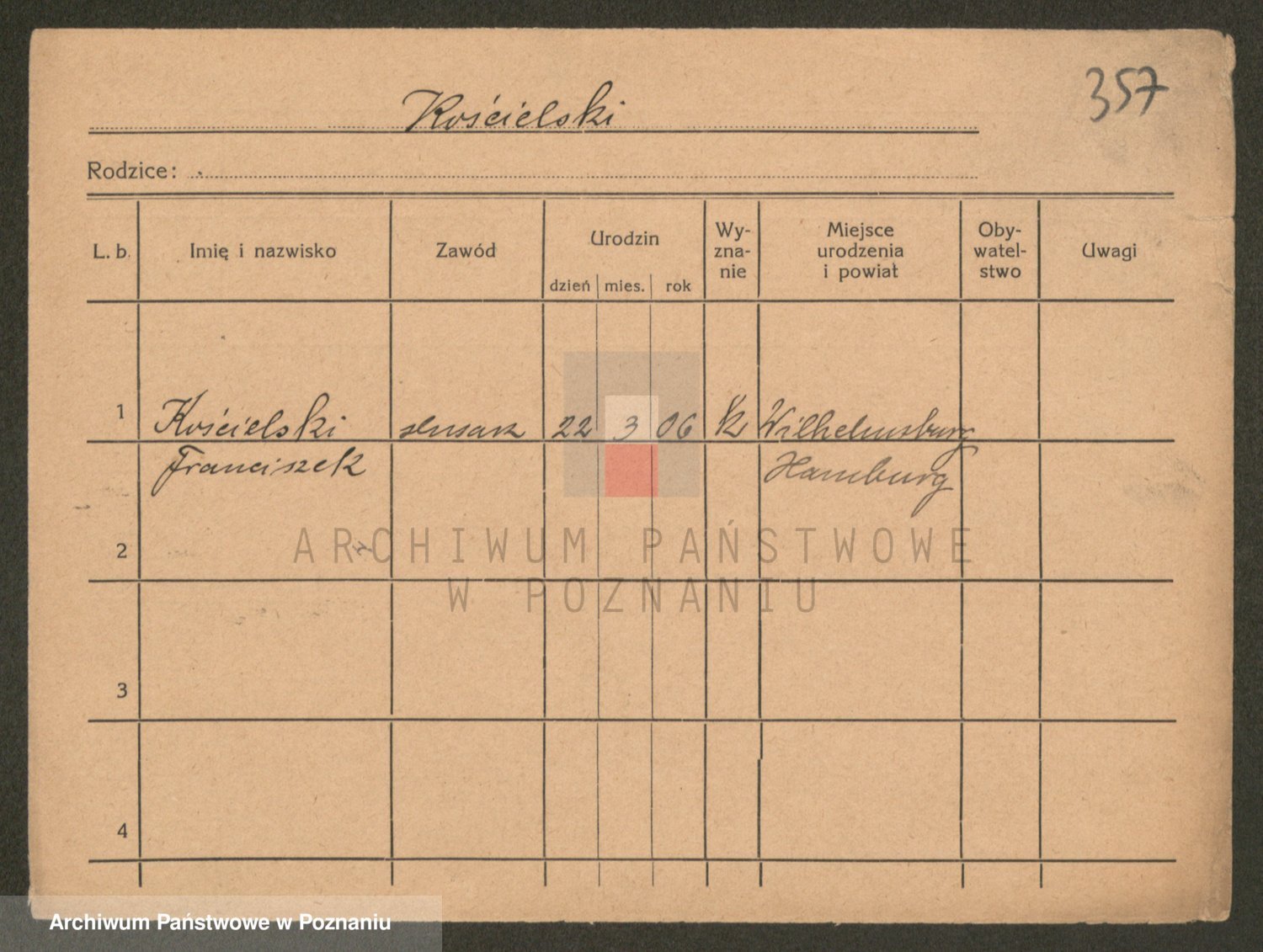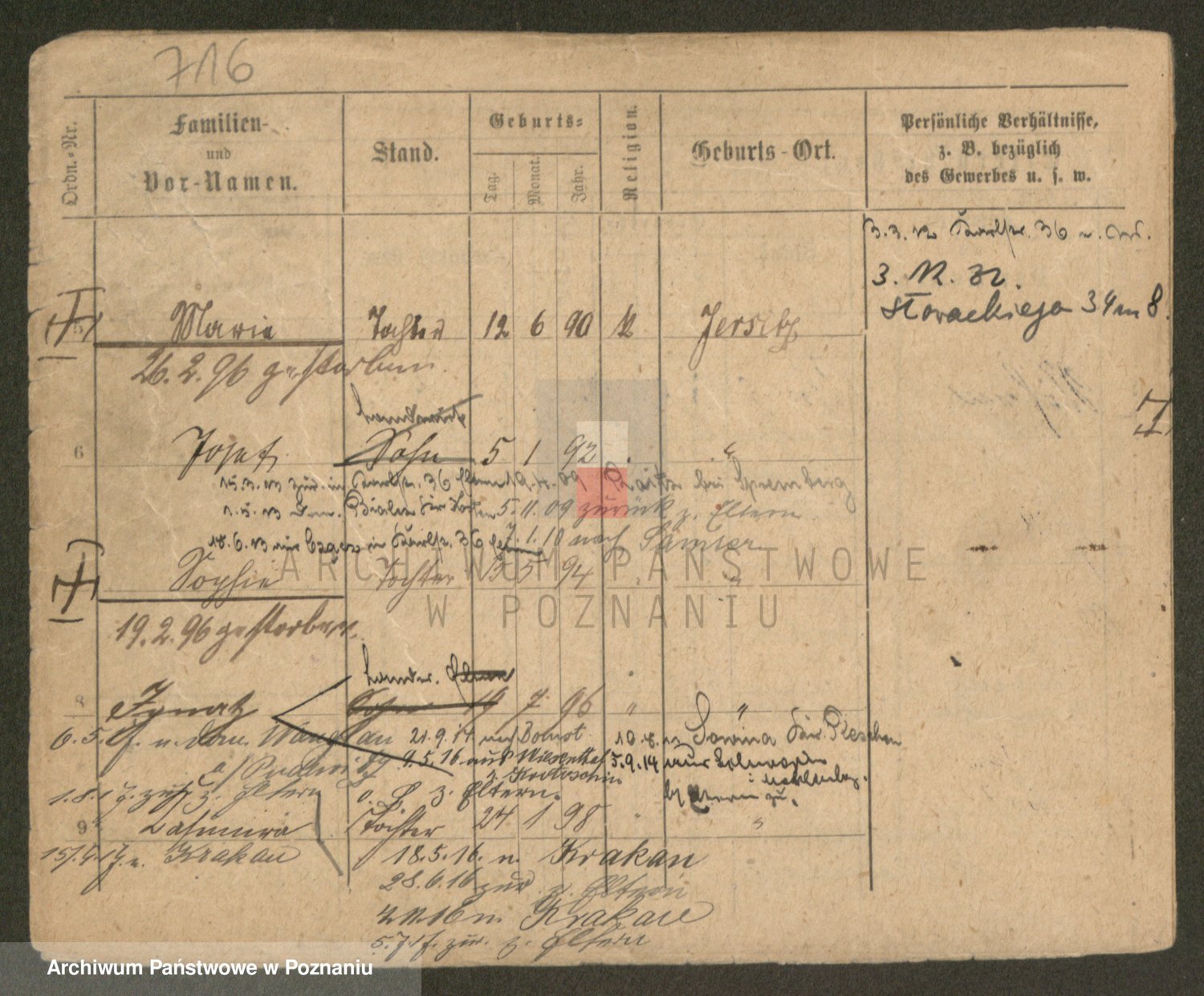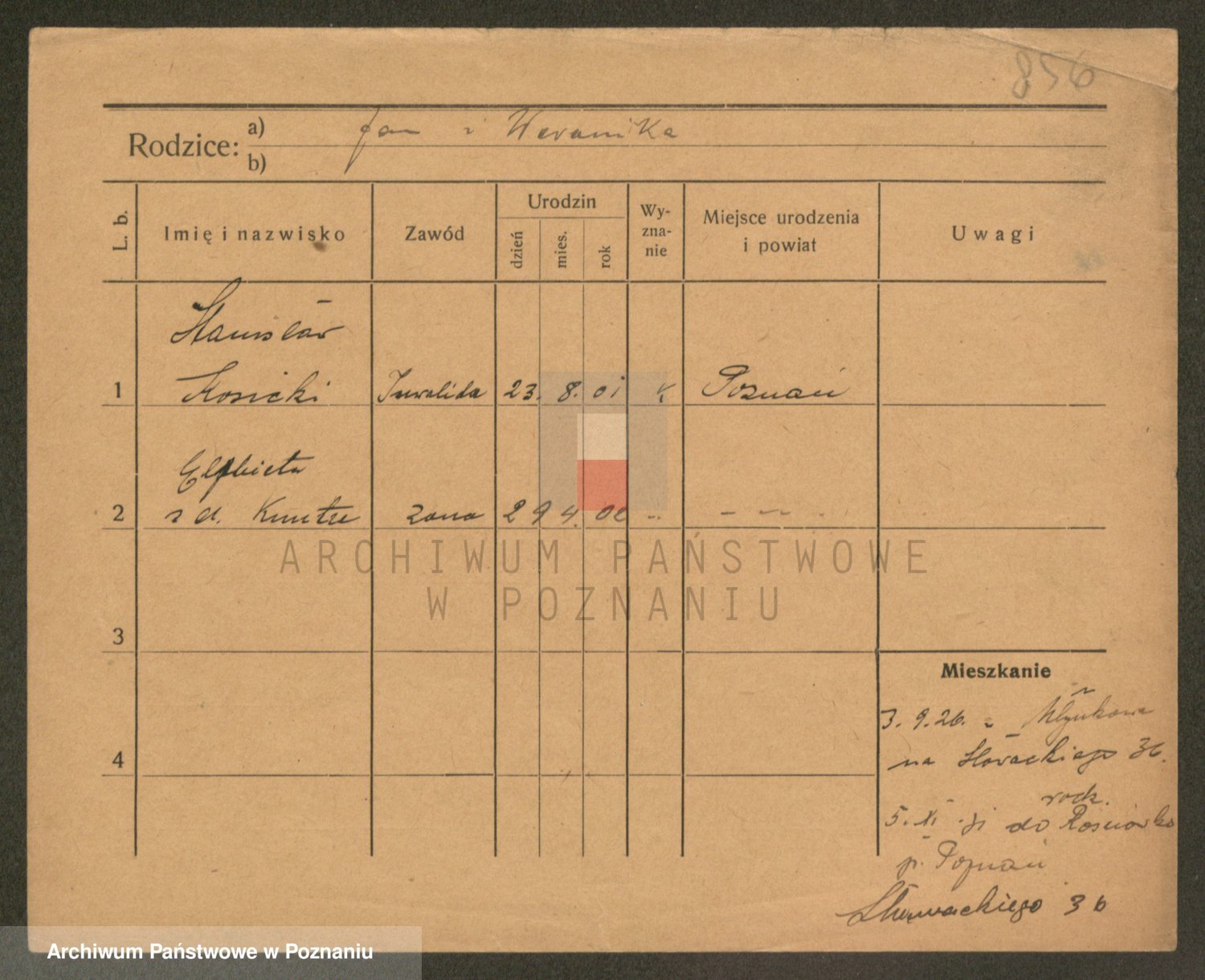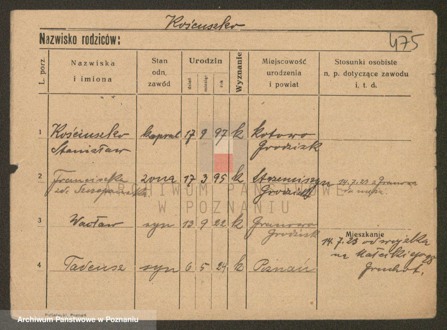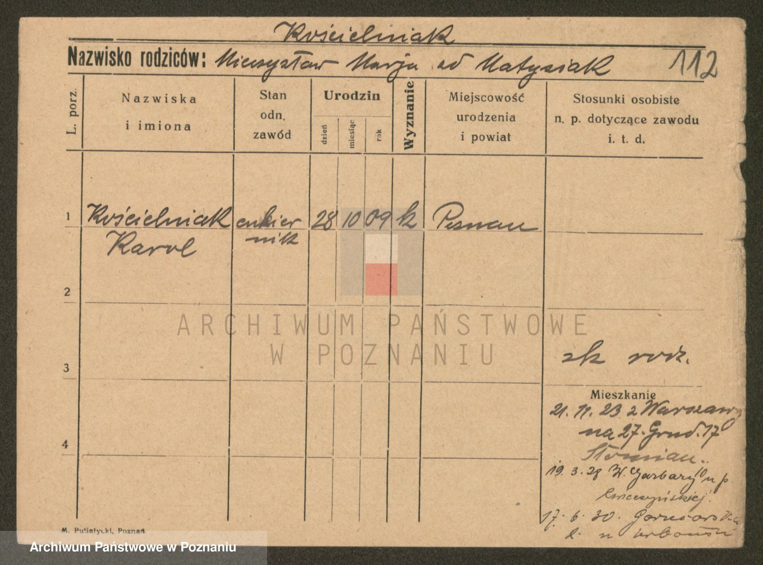 Podgląd karty osobowej dostępny jest po kliknięciu na nazwisko lub ikonkę karty. Można dokonywać powiększenia (ikony na górze) lub przechodzić między kolejnymi skanami (strzałki po bokach).