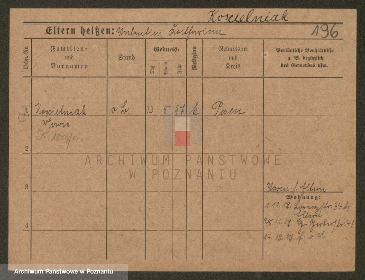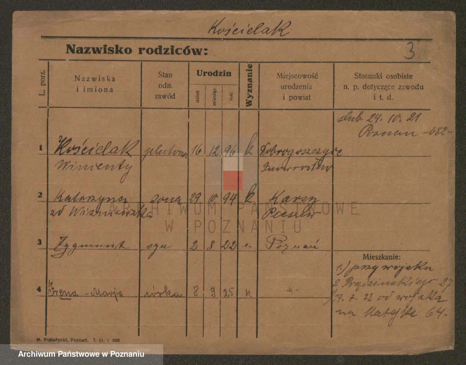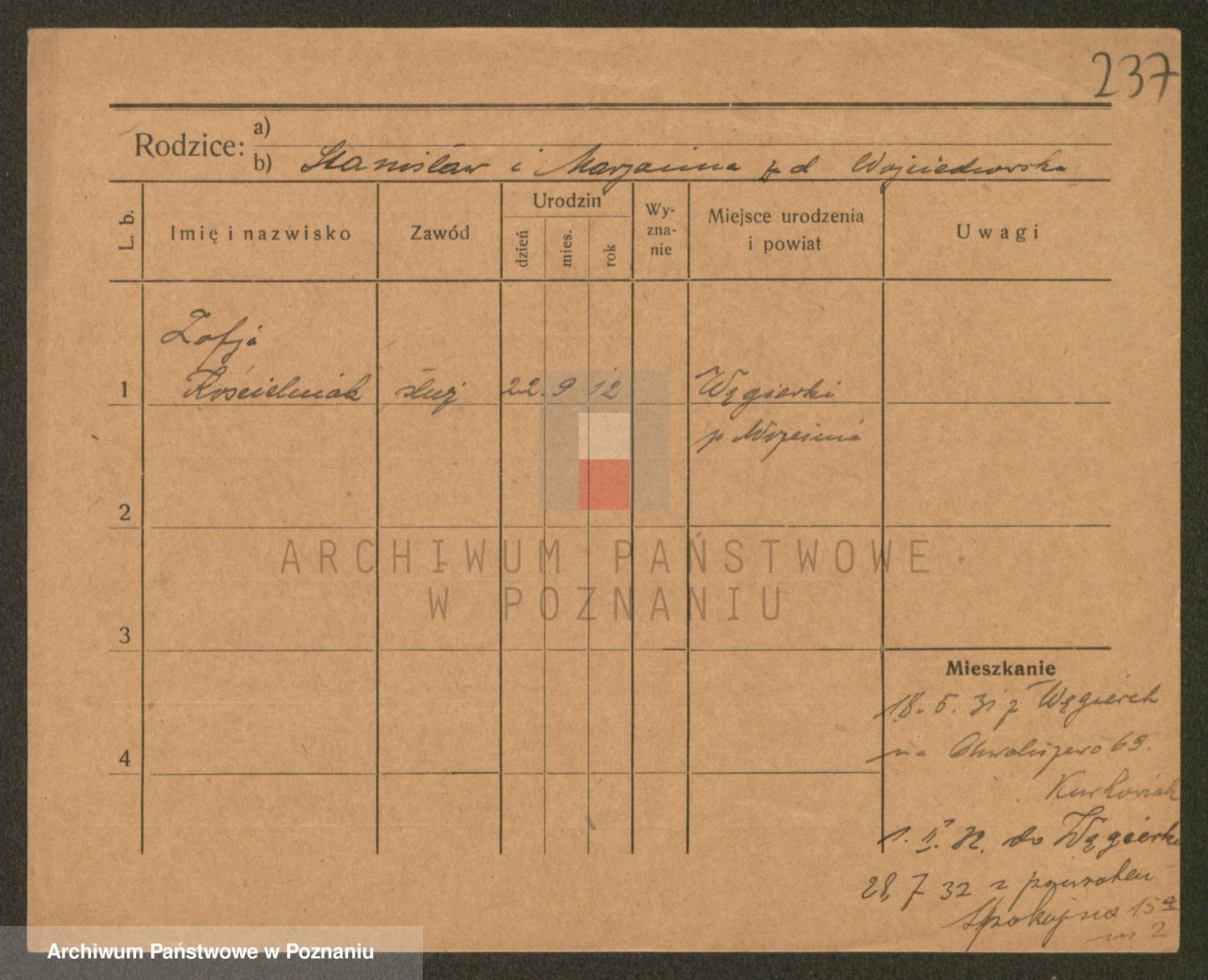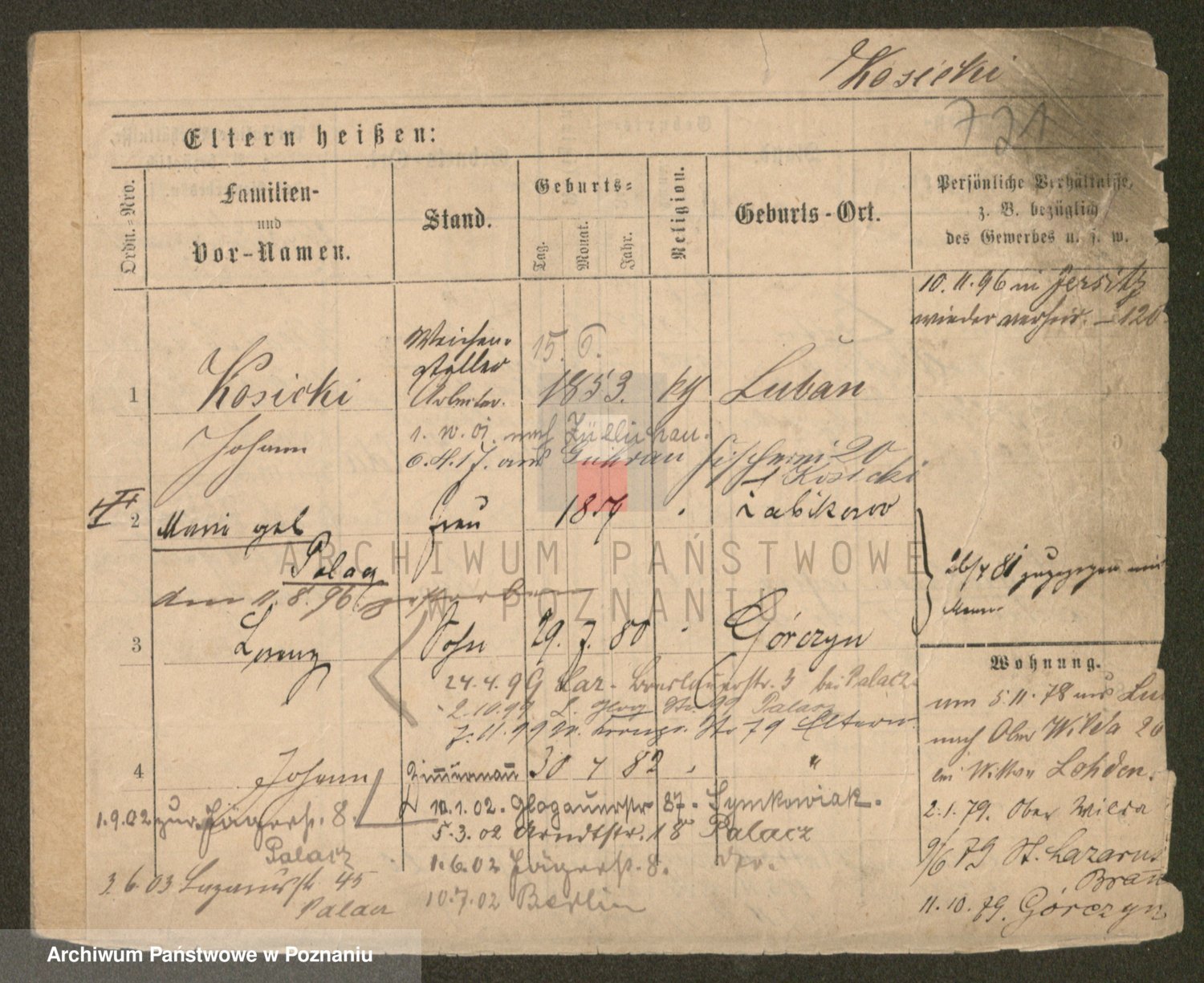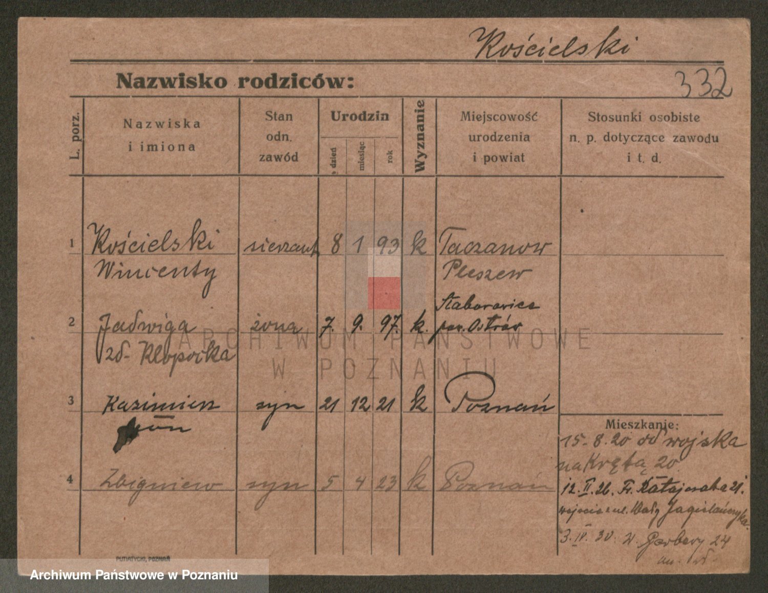 Podgląd karty osobowej dostępny jest po kliknięciu na nazwisko lub ikonkę karty. Można dokonywać powiększenia (ikony na górze) lub przechodzić między kolejnymi skanami (strzałki po bokach).