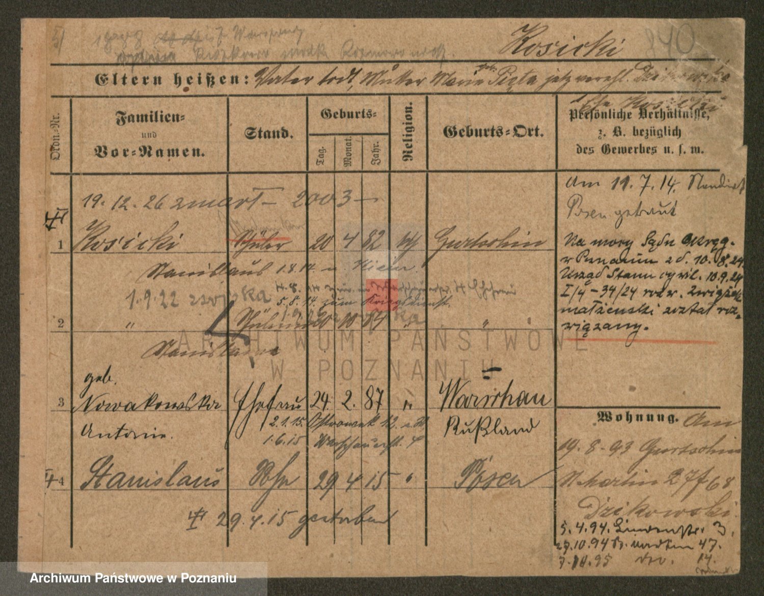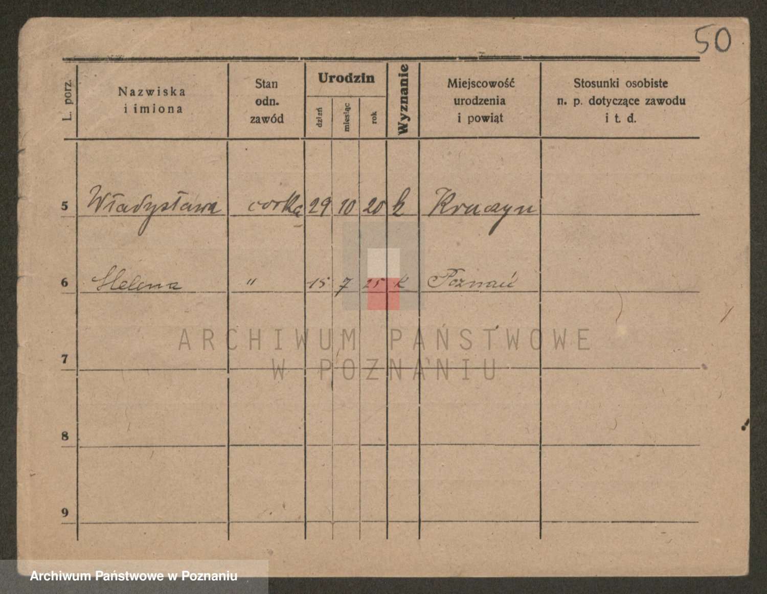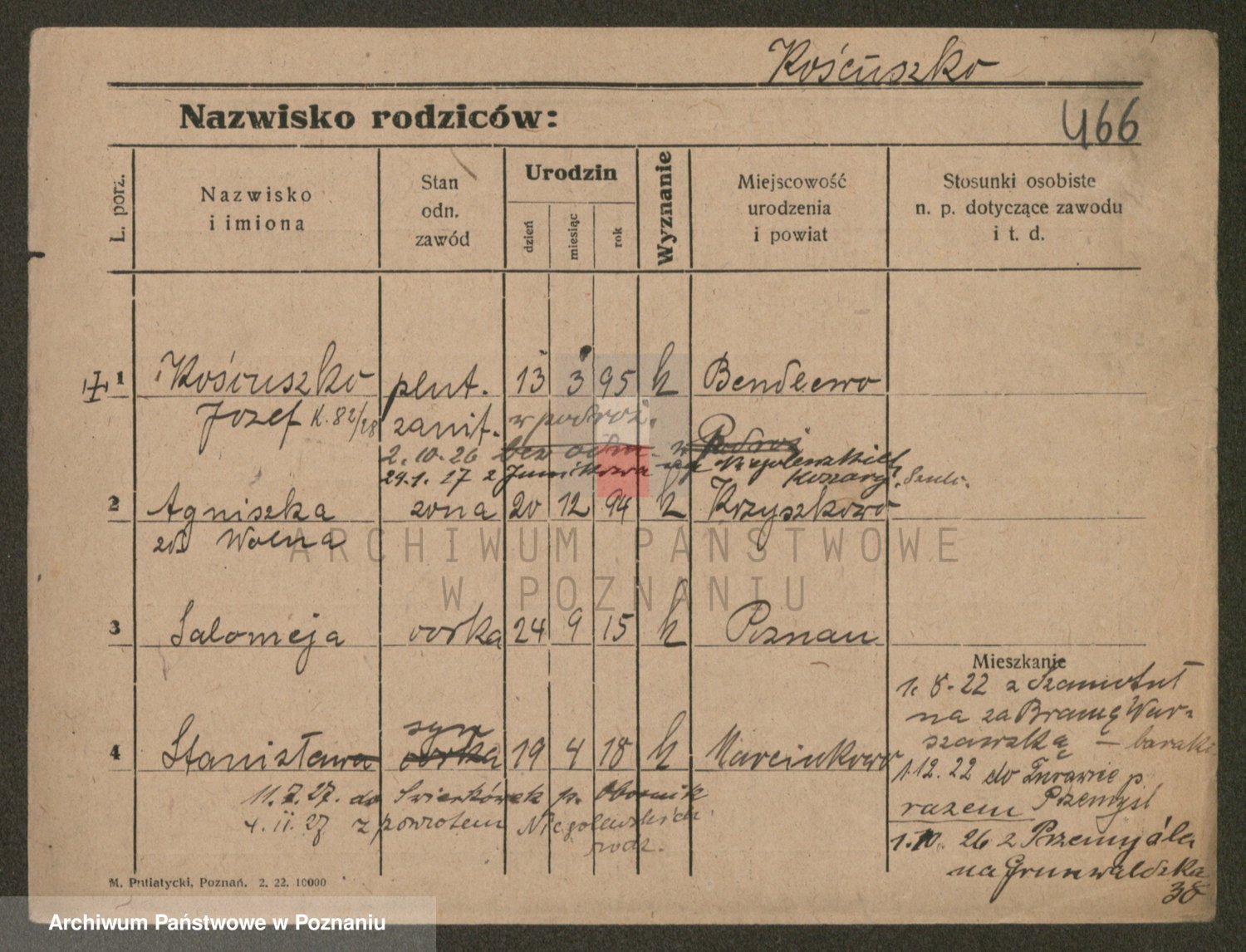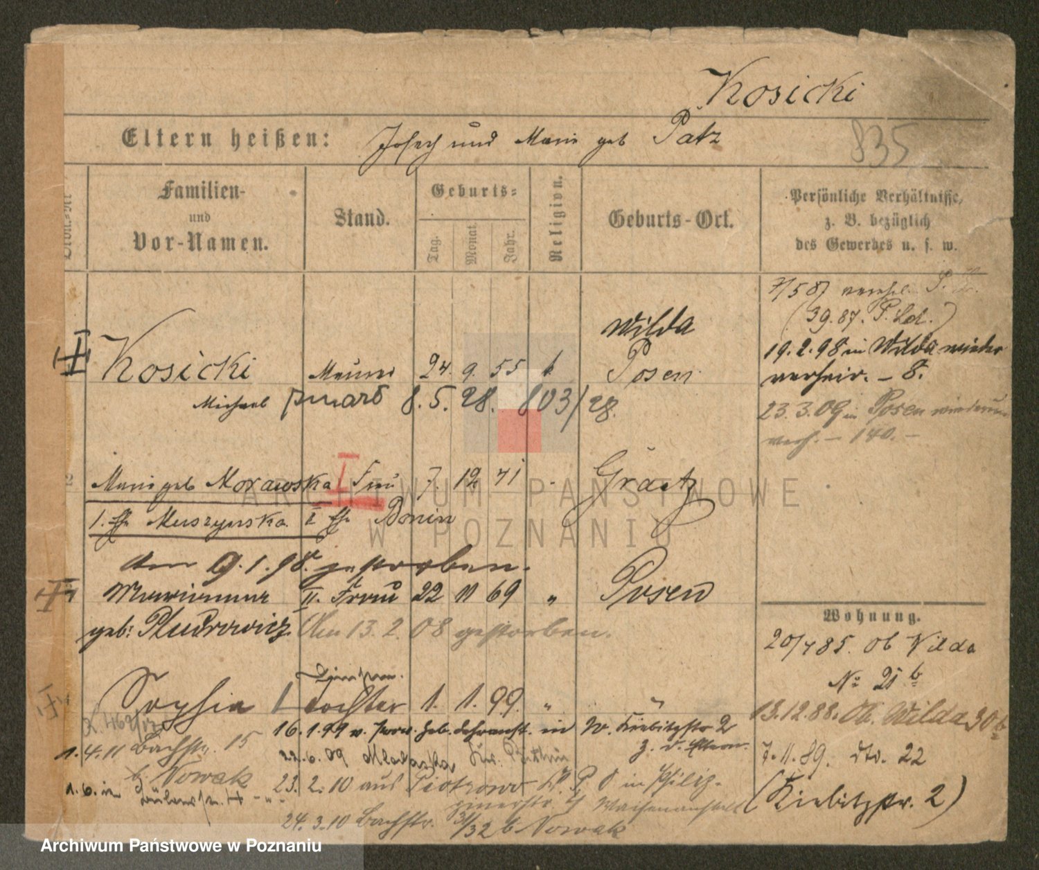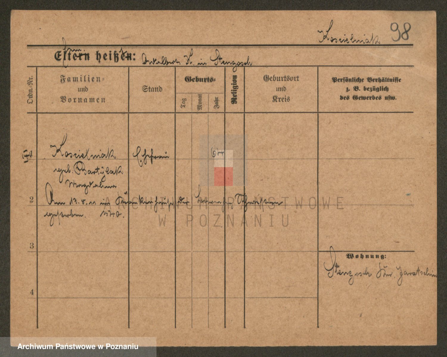 Podgląd karty osobowej dostępny jest po kliknięciu na nazwisko lub ikonkę karty. Można dokonywać powiększenia (ikony na górze) lub przechodzić między kolejnymi skanami (strzałki po bokach).