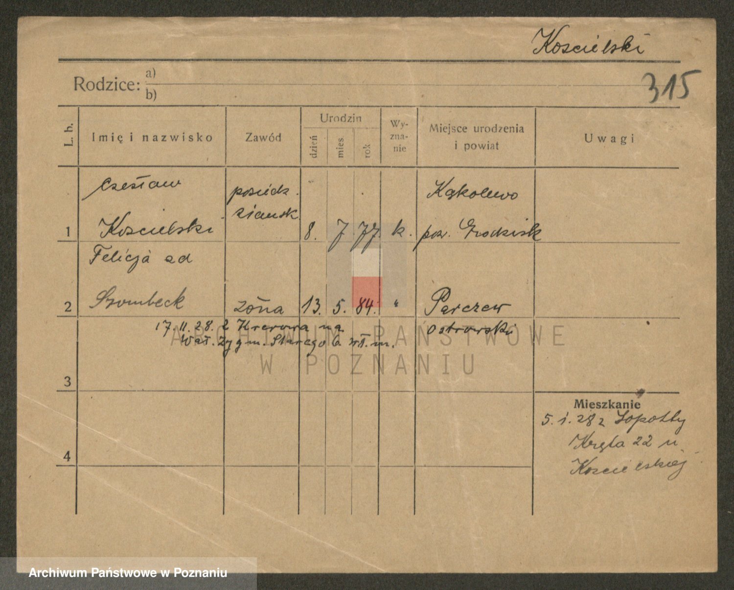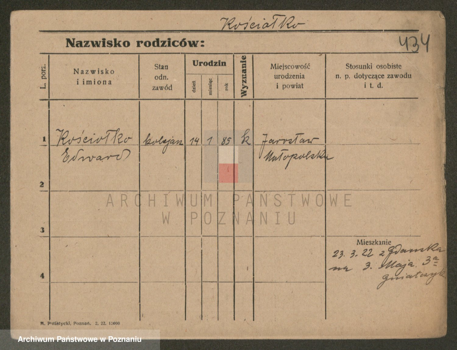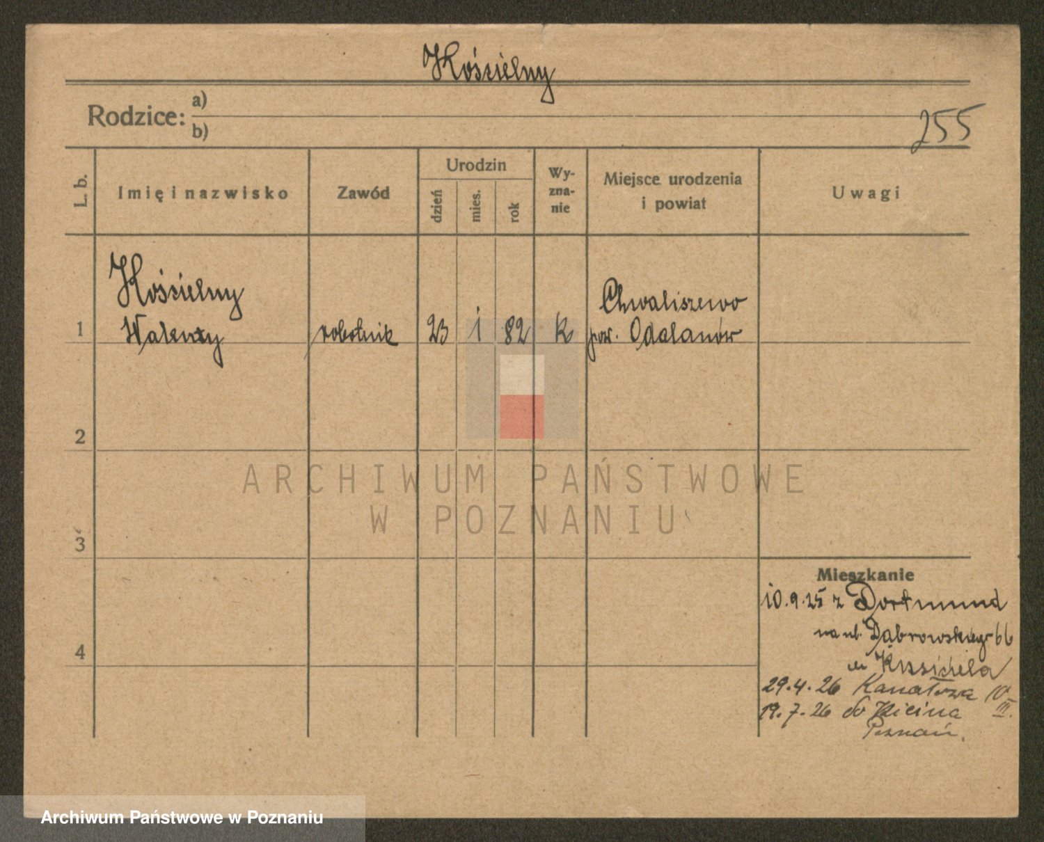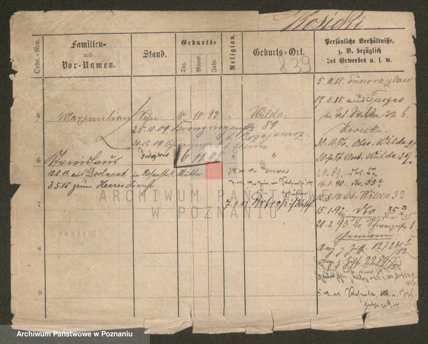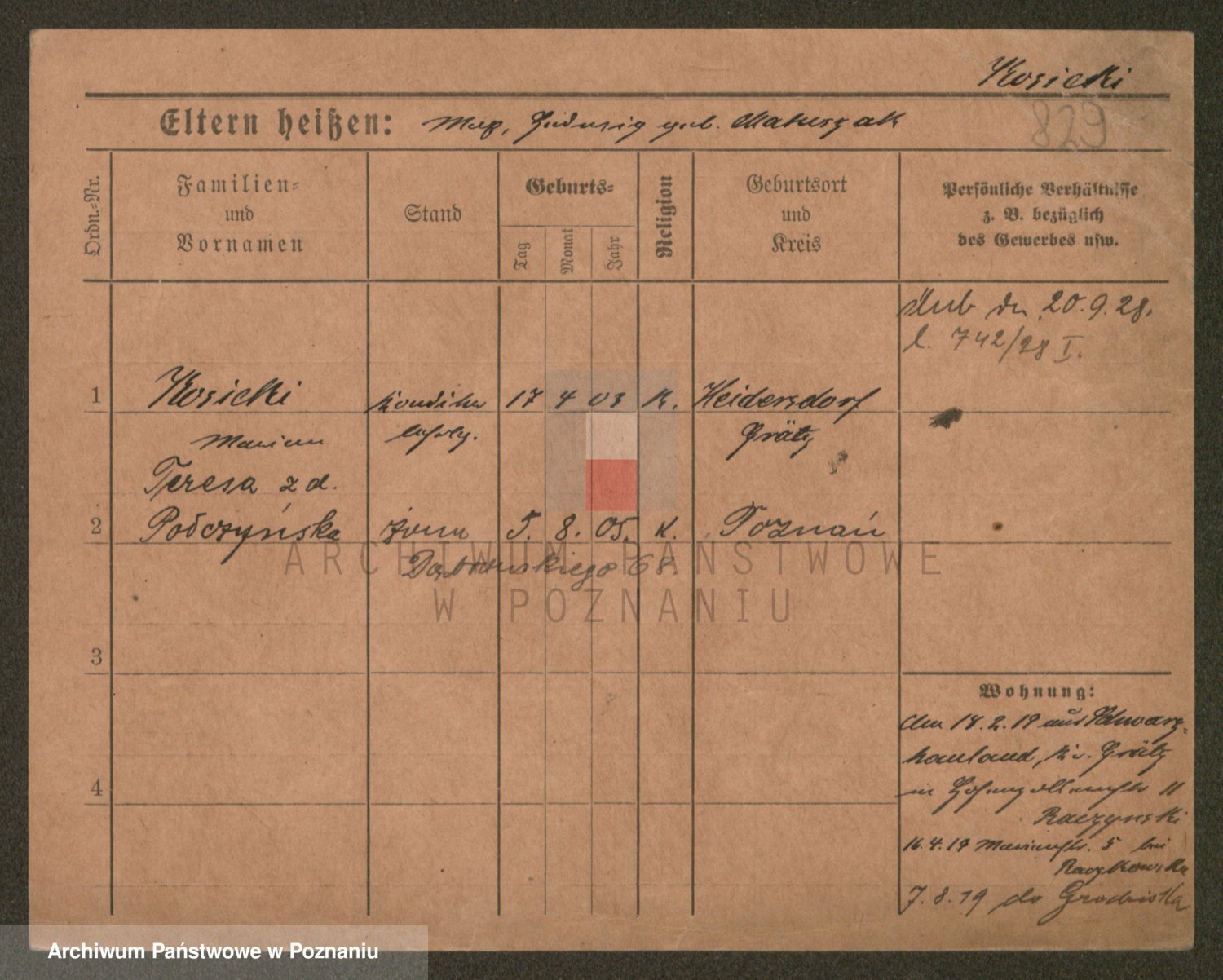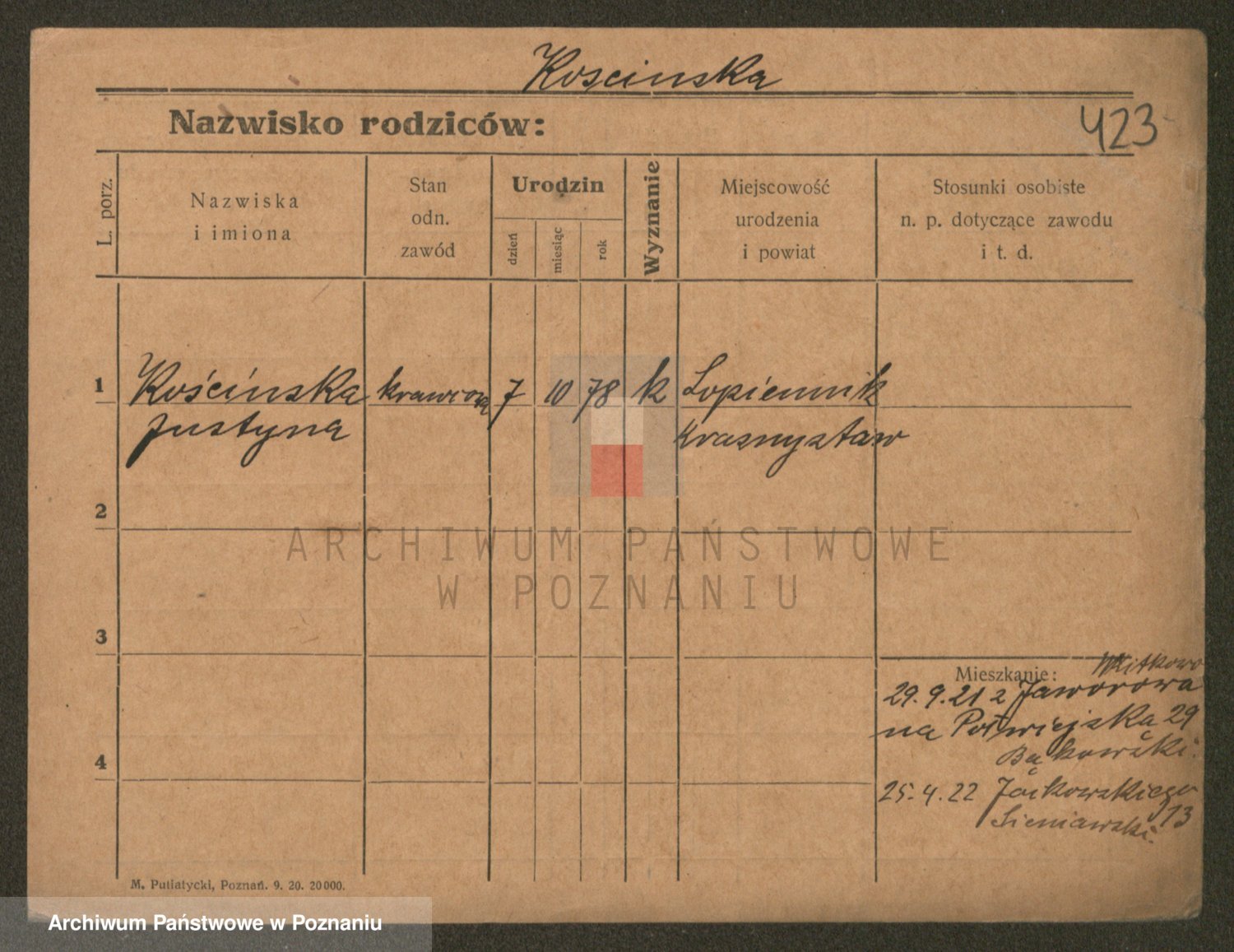 Podgląd karty osobowej dostępny jest po kliknięciu na nazwisko lub ikonkę karty. Można dokonywać powiększenia (ikony na górze) lub przechodzić między kolejnymi skanami (strzałki po bokach).