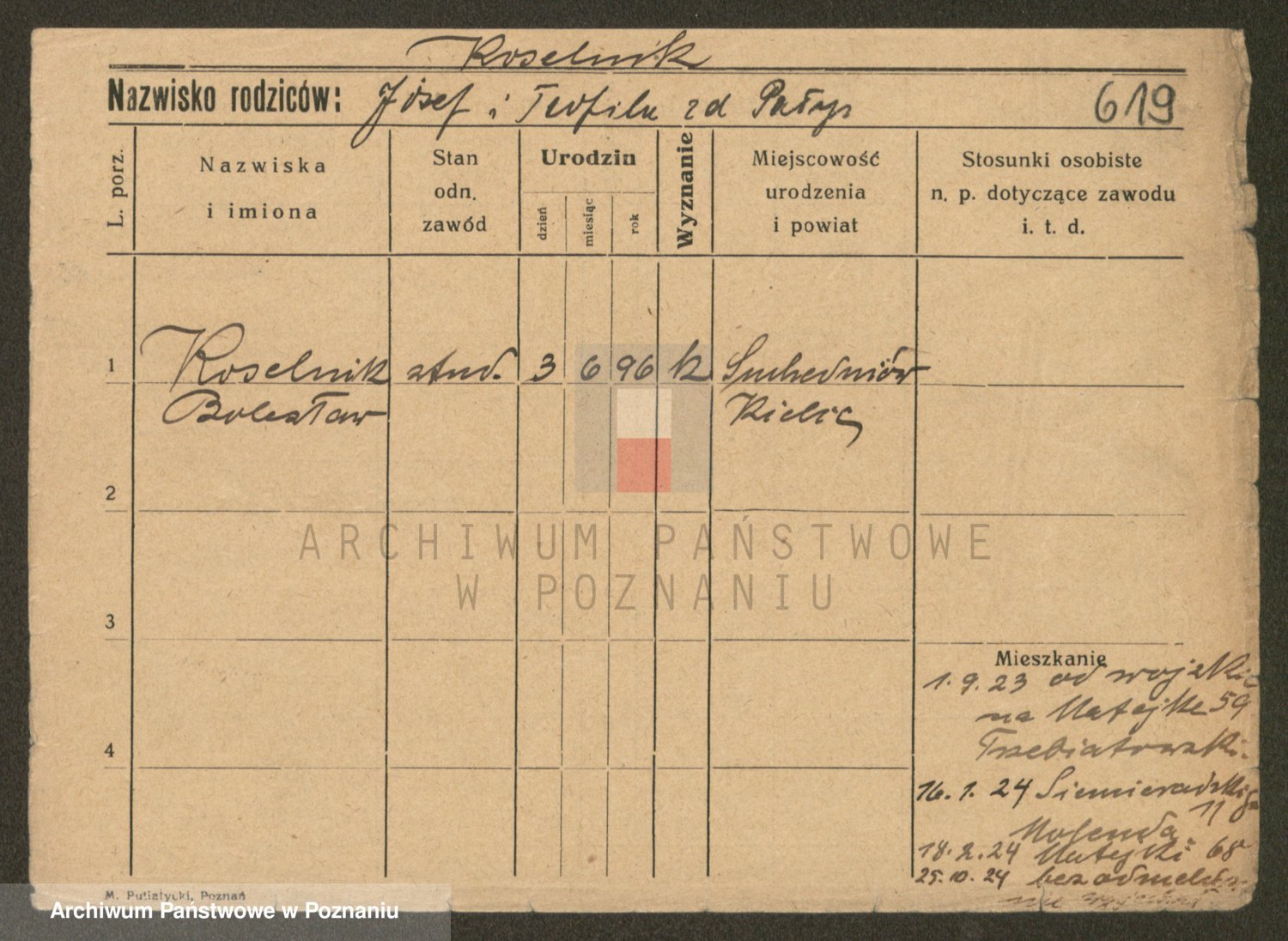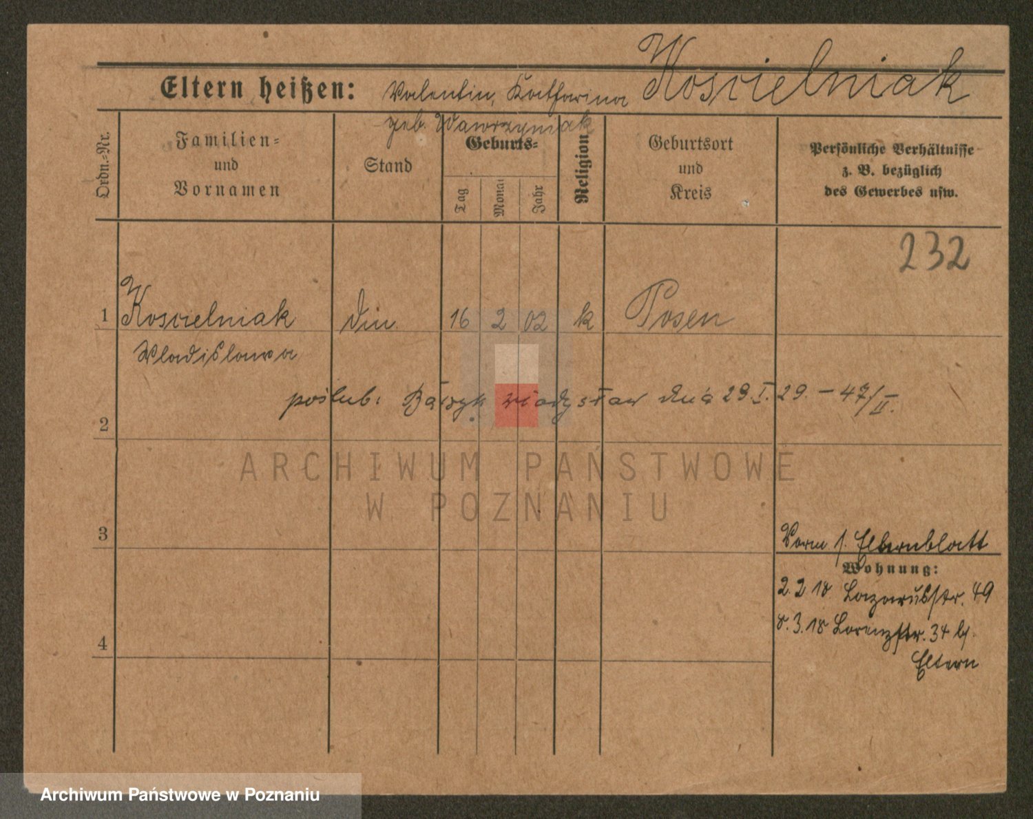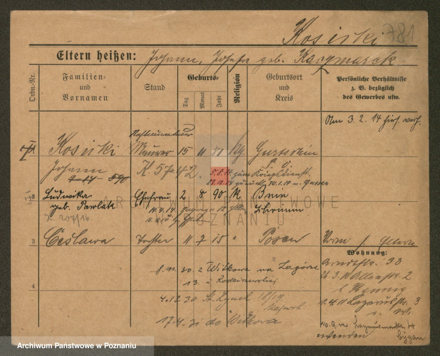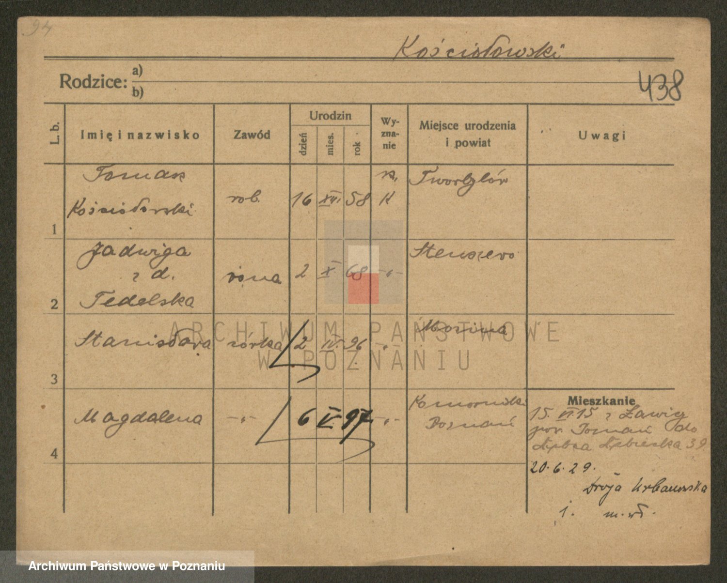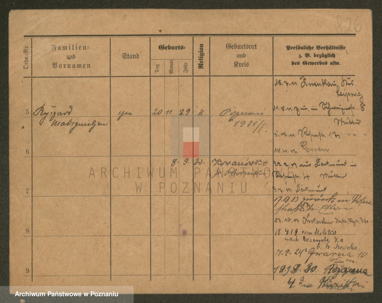 Podgląd karty osobowej dostępny jest po kliknięciu na nazwisko lub ikonkę karty. Można dokonywać powiększenia (ikony na górze) lub przechodzić między kolejnymi skanami (strzałki po bokach).
