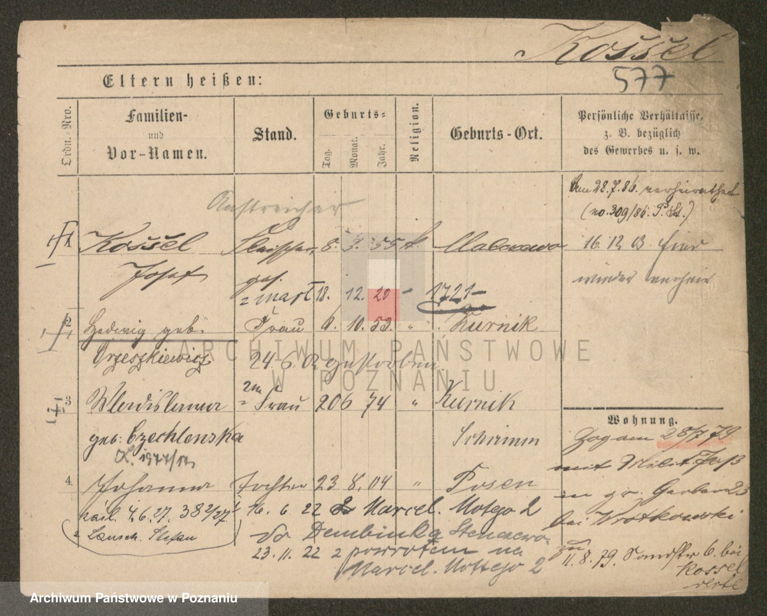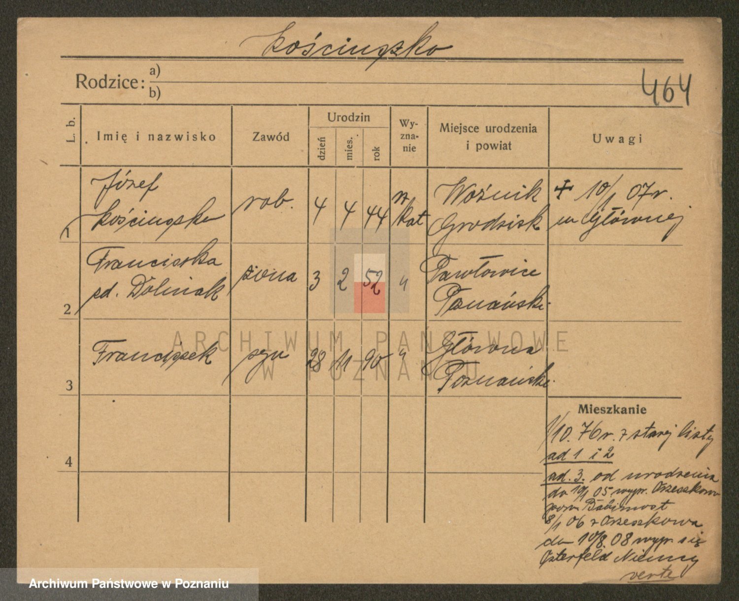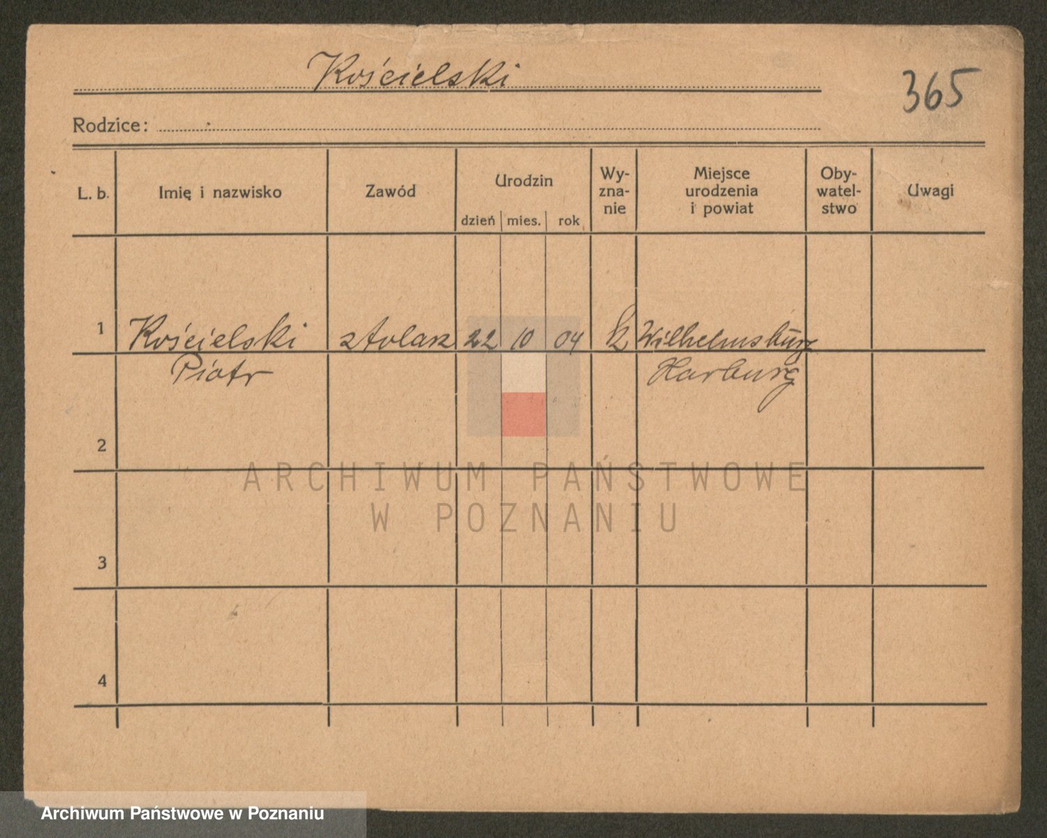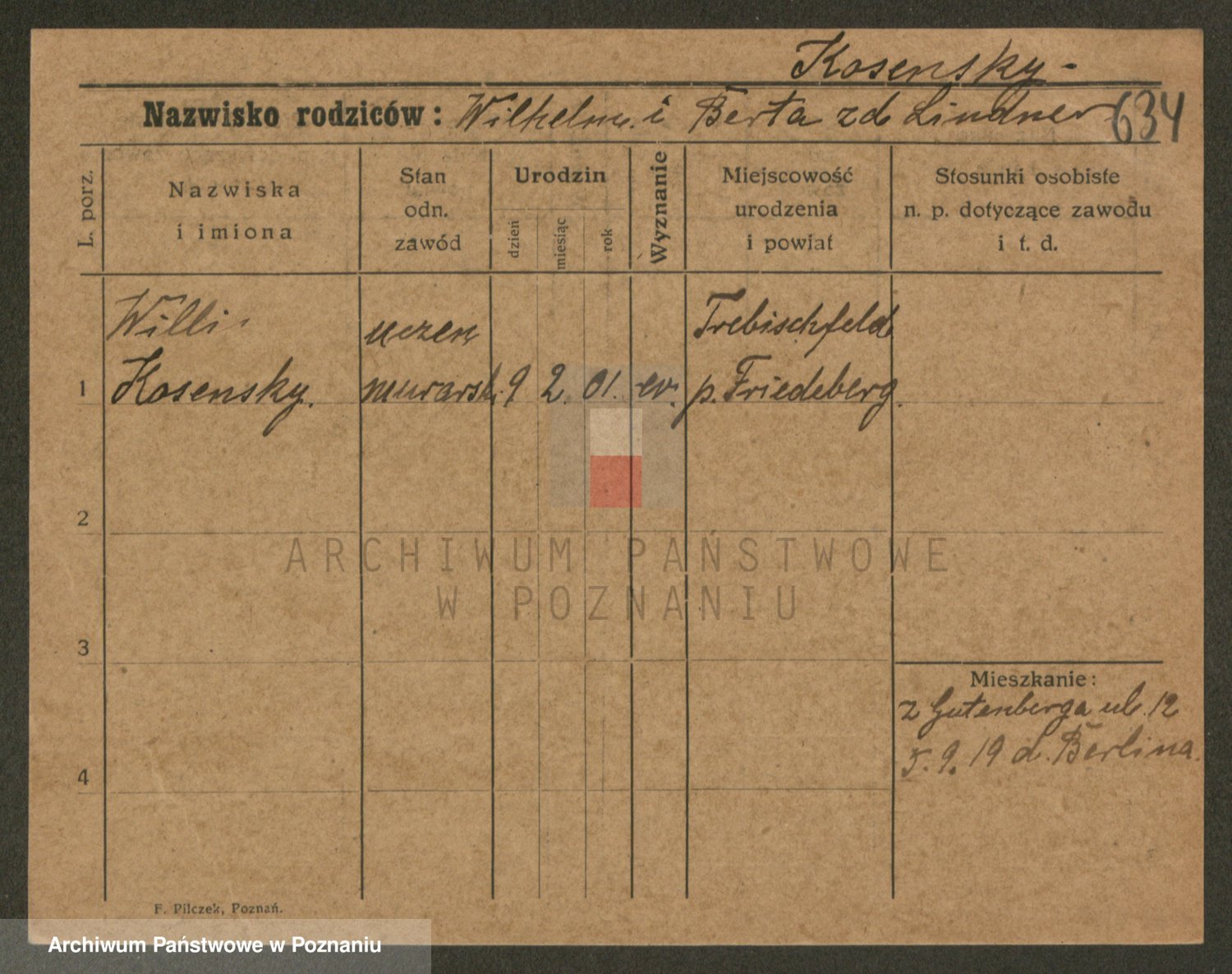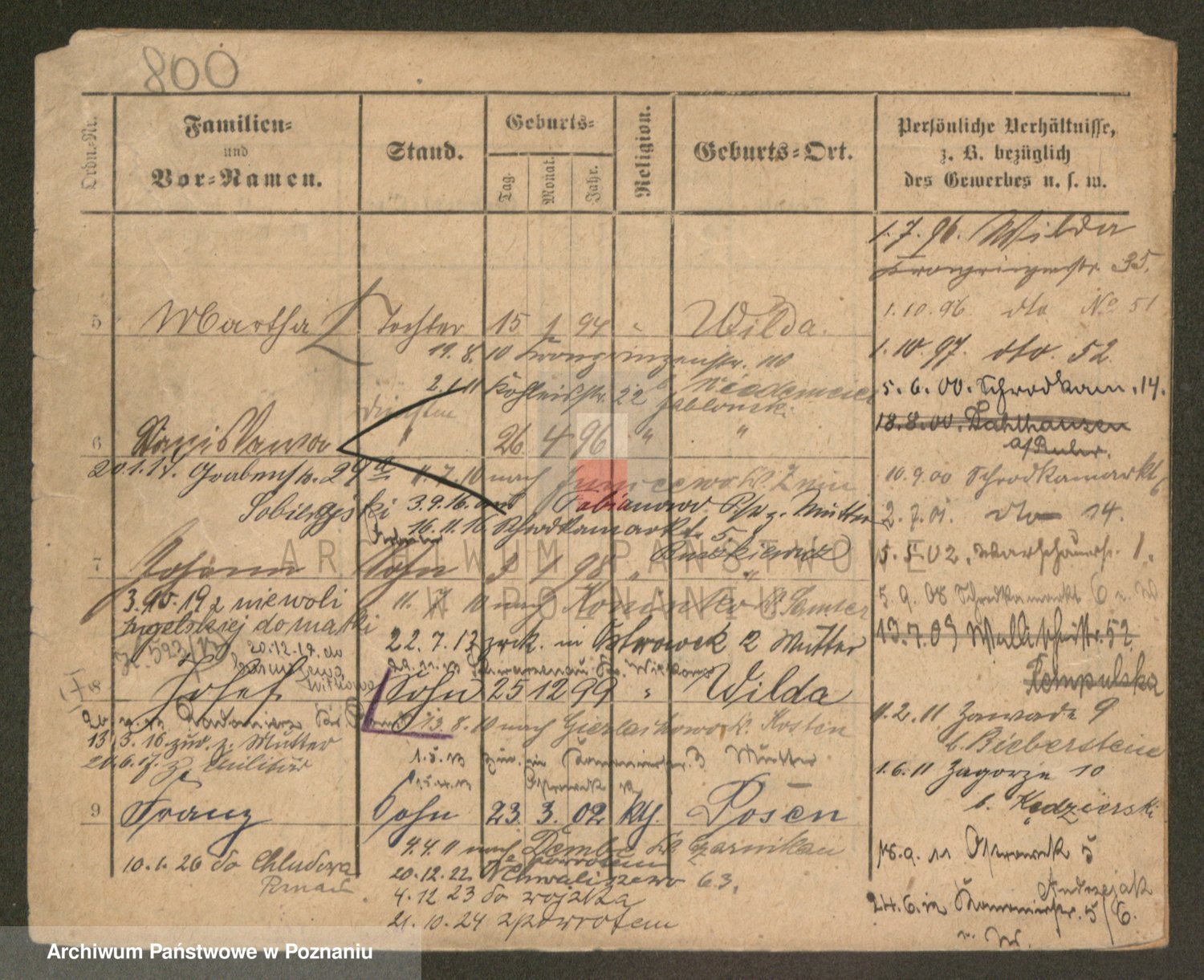 Podgląd karty osobowej dostępny jest po kliknięciu na nazwisko lub ikonkę karty. Można dokonywać powiększenia (ikony na górze) lub przechodzić między kolejnymi skanami (strzałki po bokach).