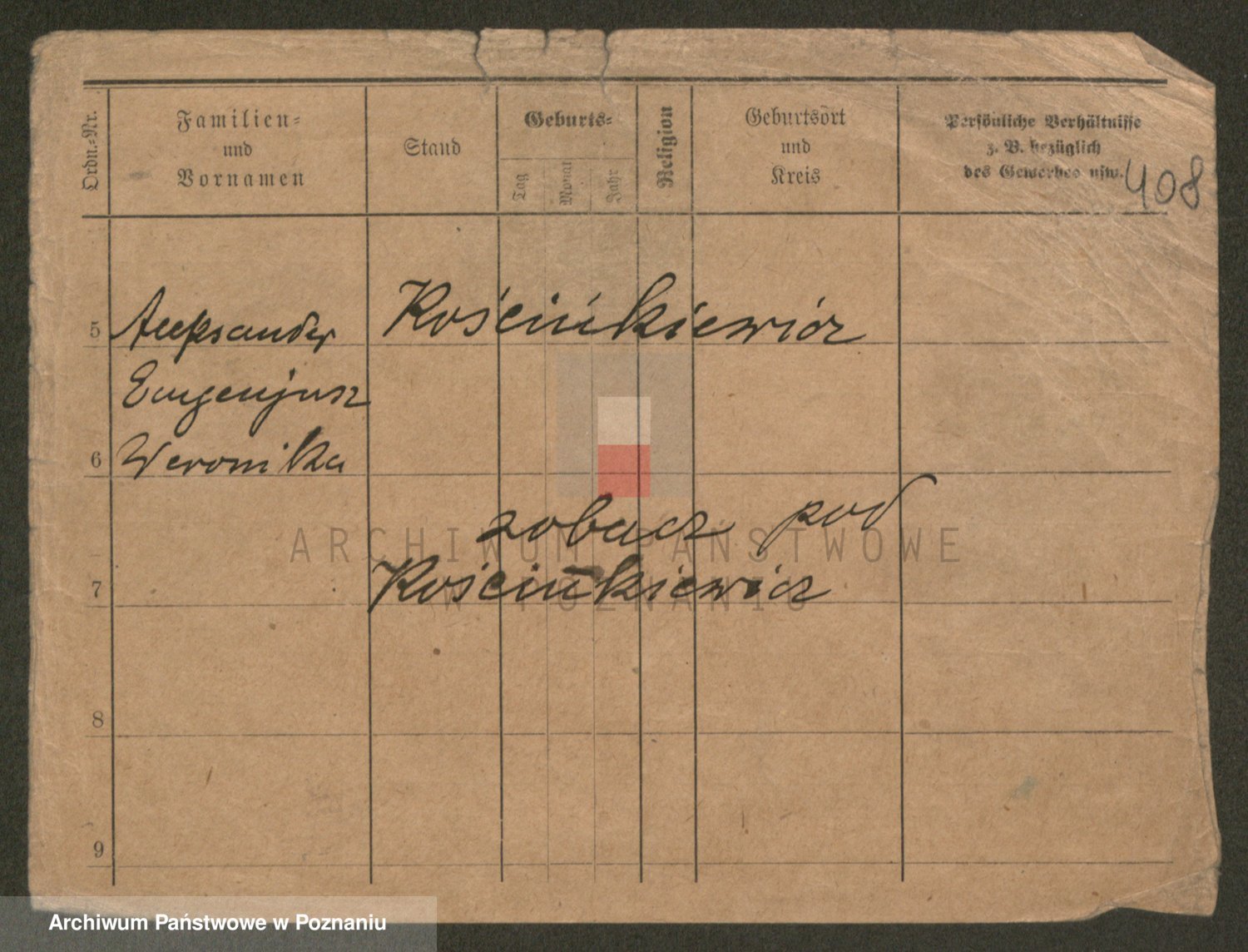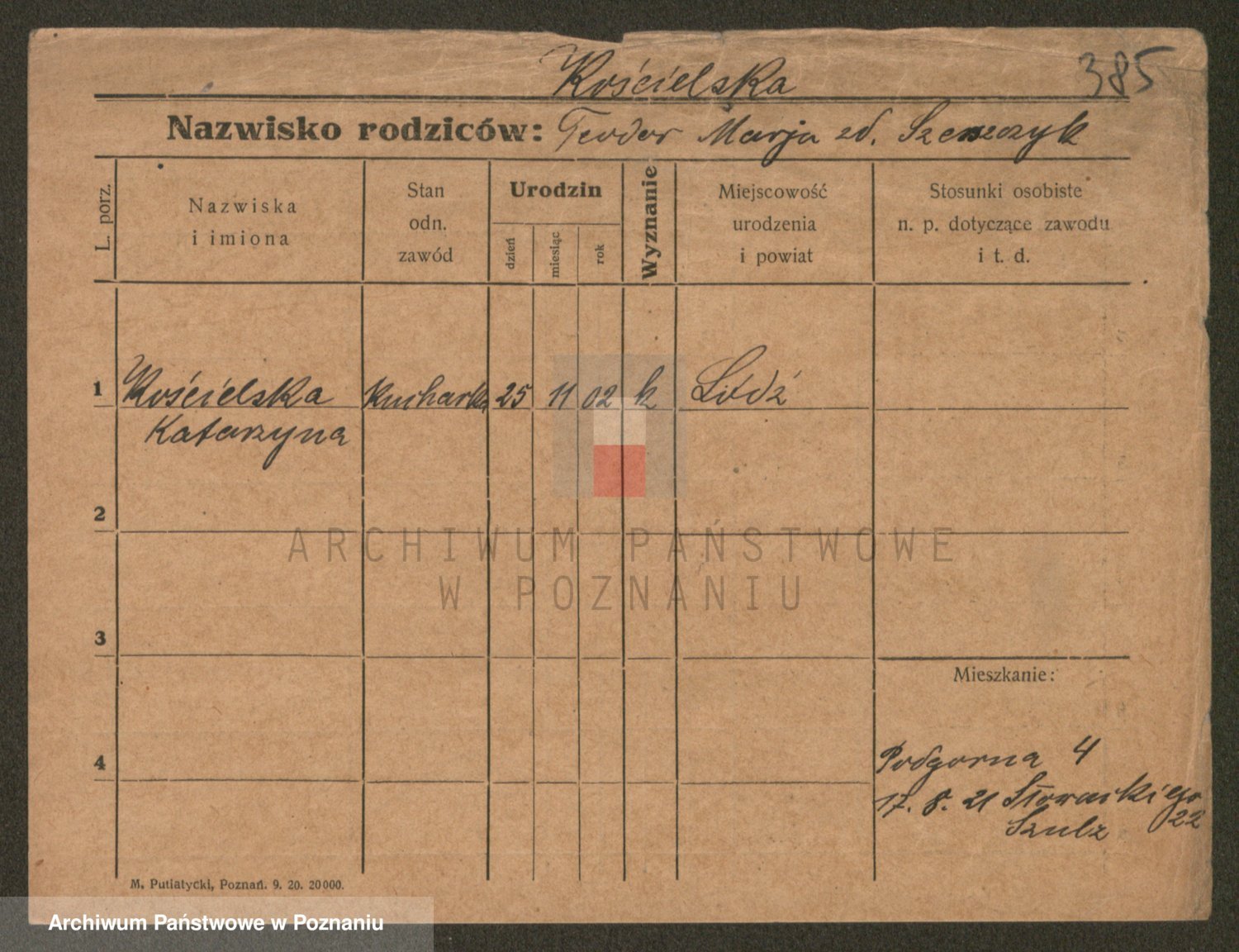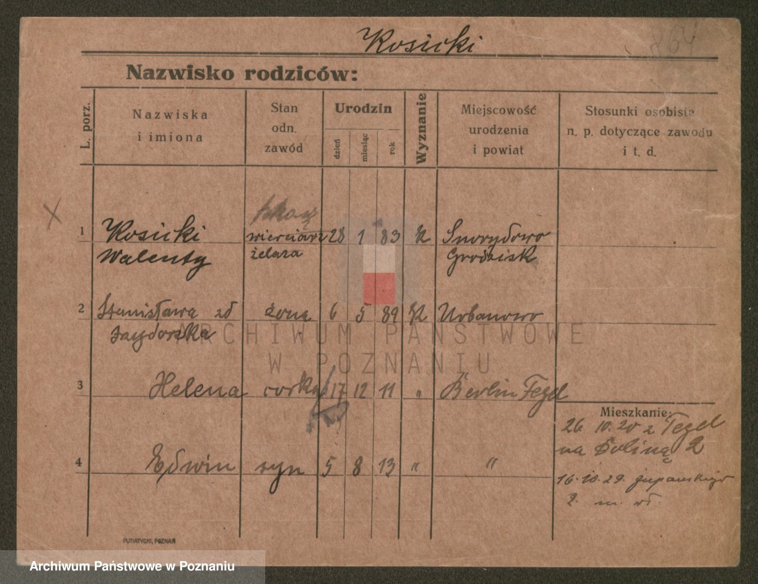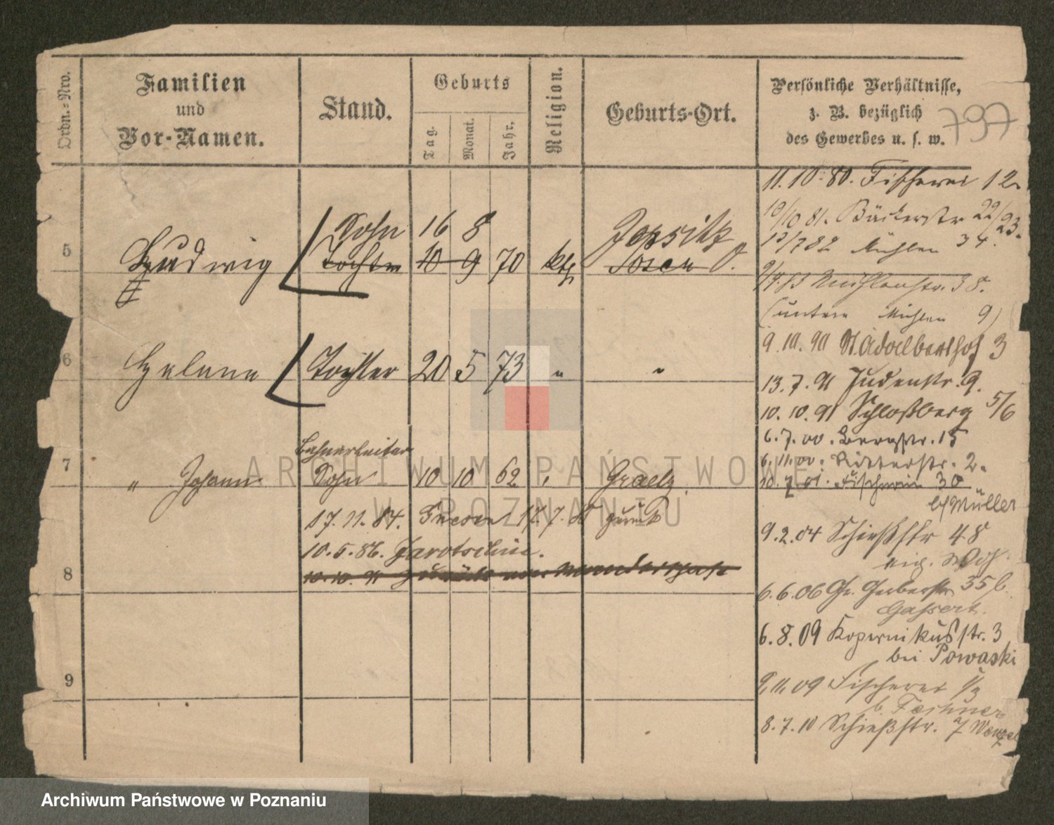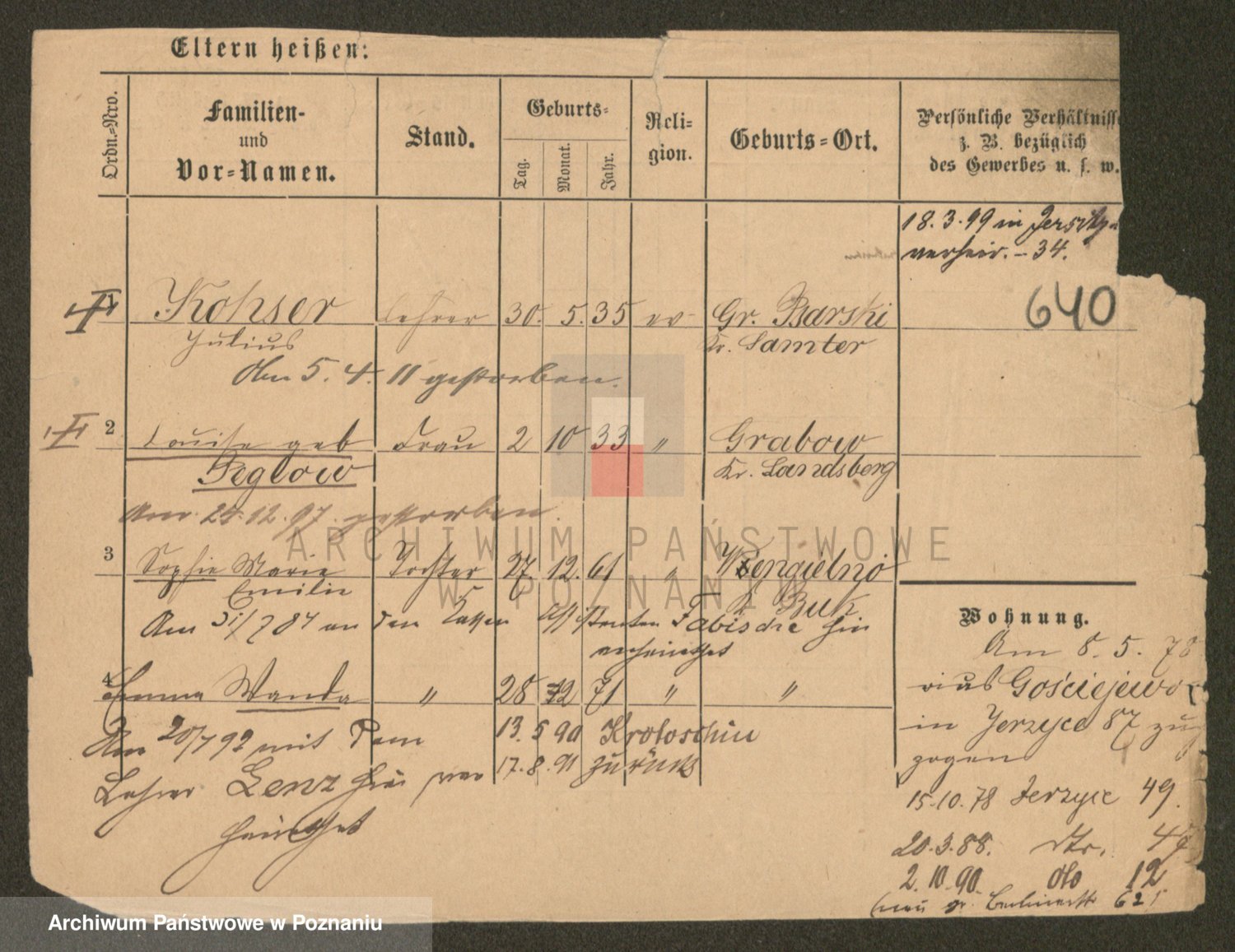 Podgląd karty osobowej dostępny jest po kliknięciu na nazwisko lub ikonkę karty. Można dokonywać powiększenia (ikony na górze) lub przechodzić między kolejnymi skanami (strzałki po bokach).