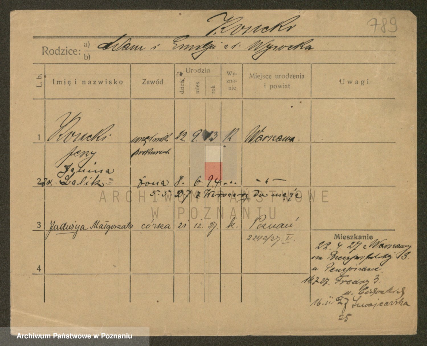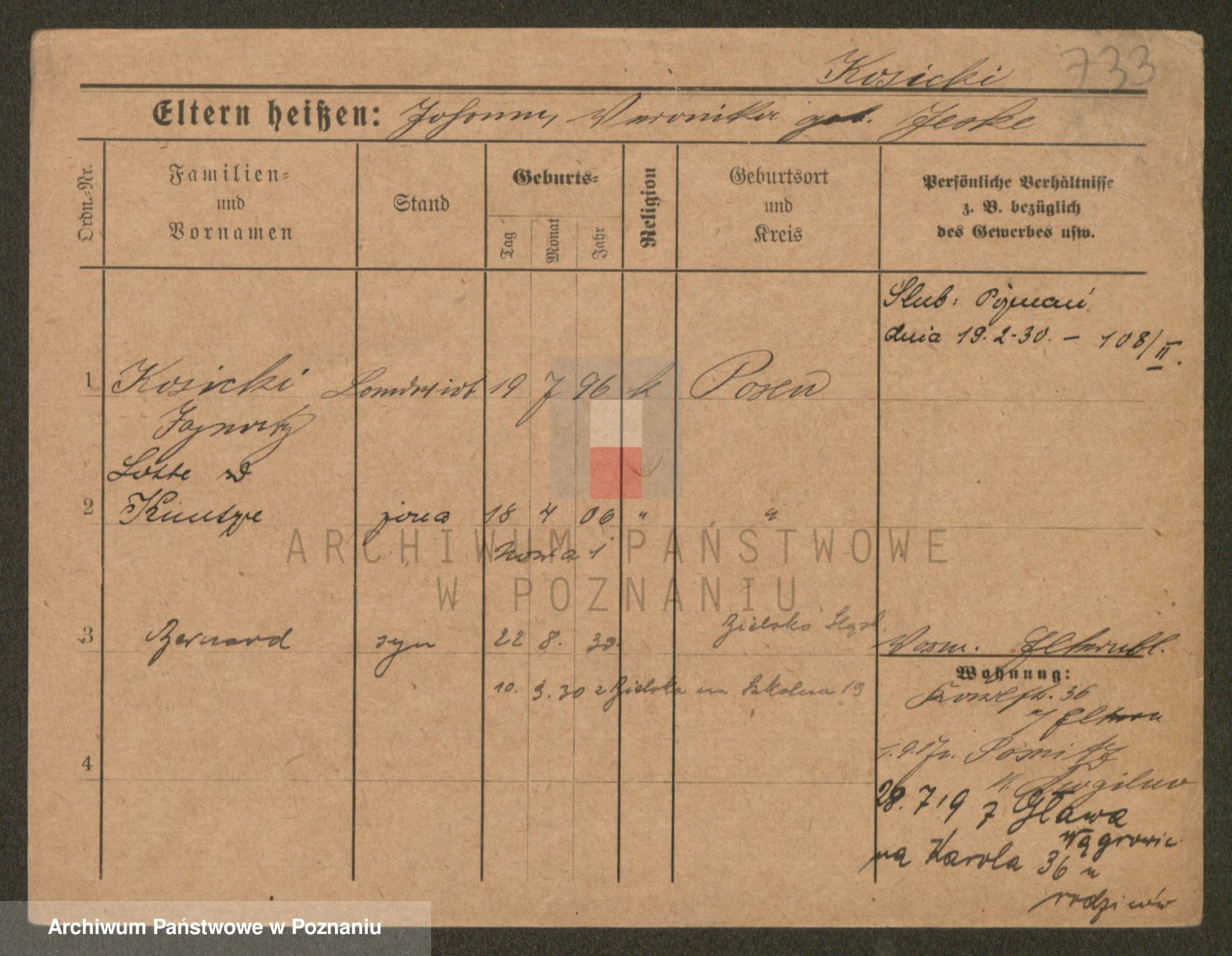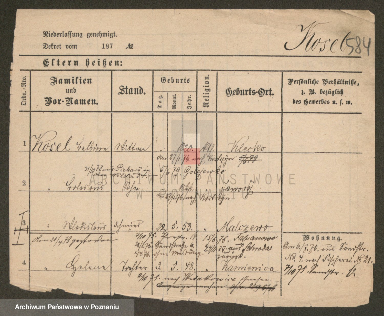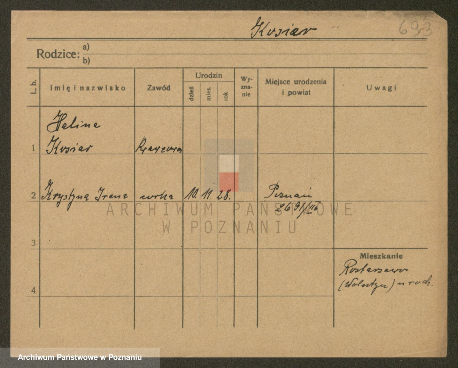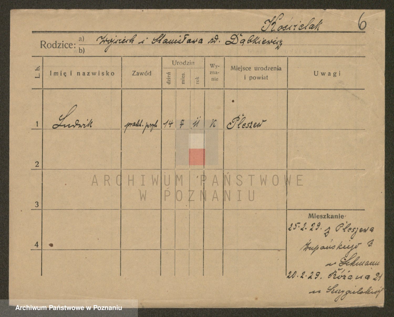 Podgląd karty osobowej dostępny jest po kliknięciu na nazwisko lub ikonkę karty. Można dokonywać powiększenia (ikony na górze) lub przechodzić między kolejnymi skanami (strzałki po bokach).