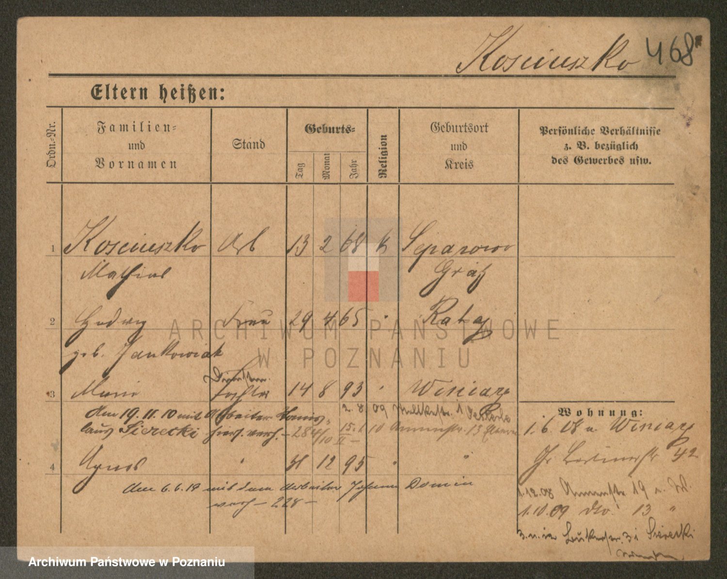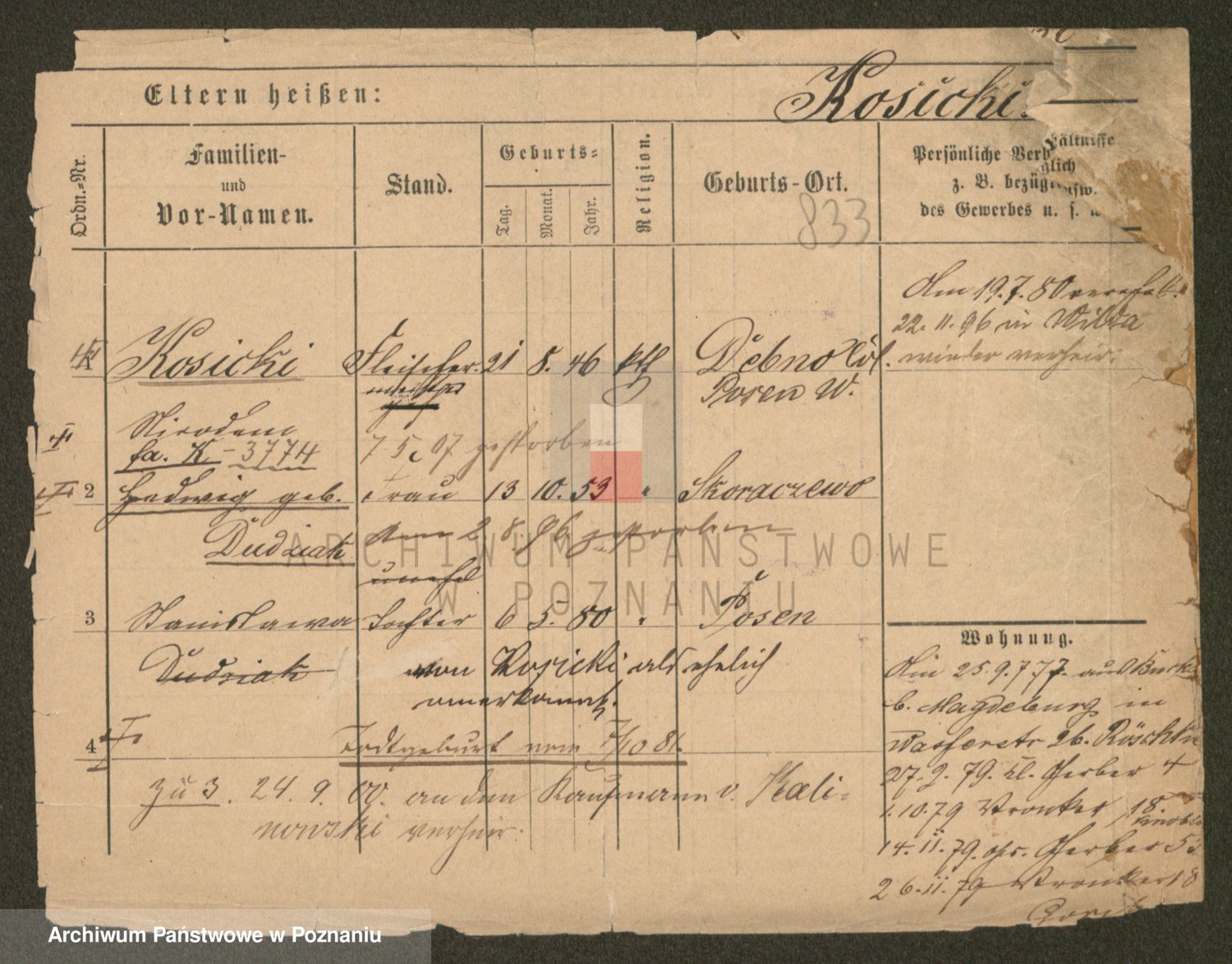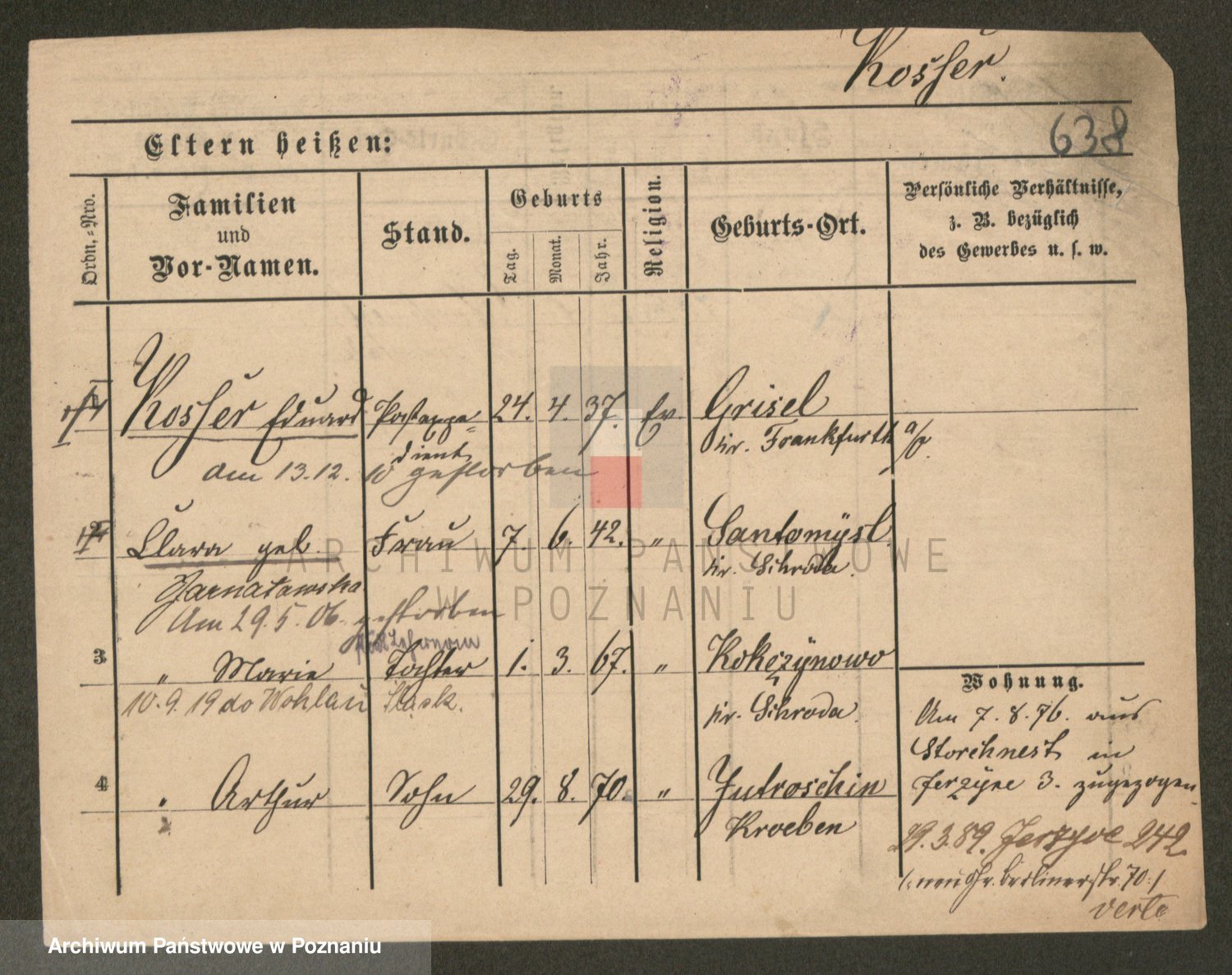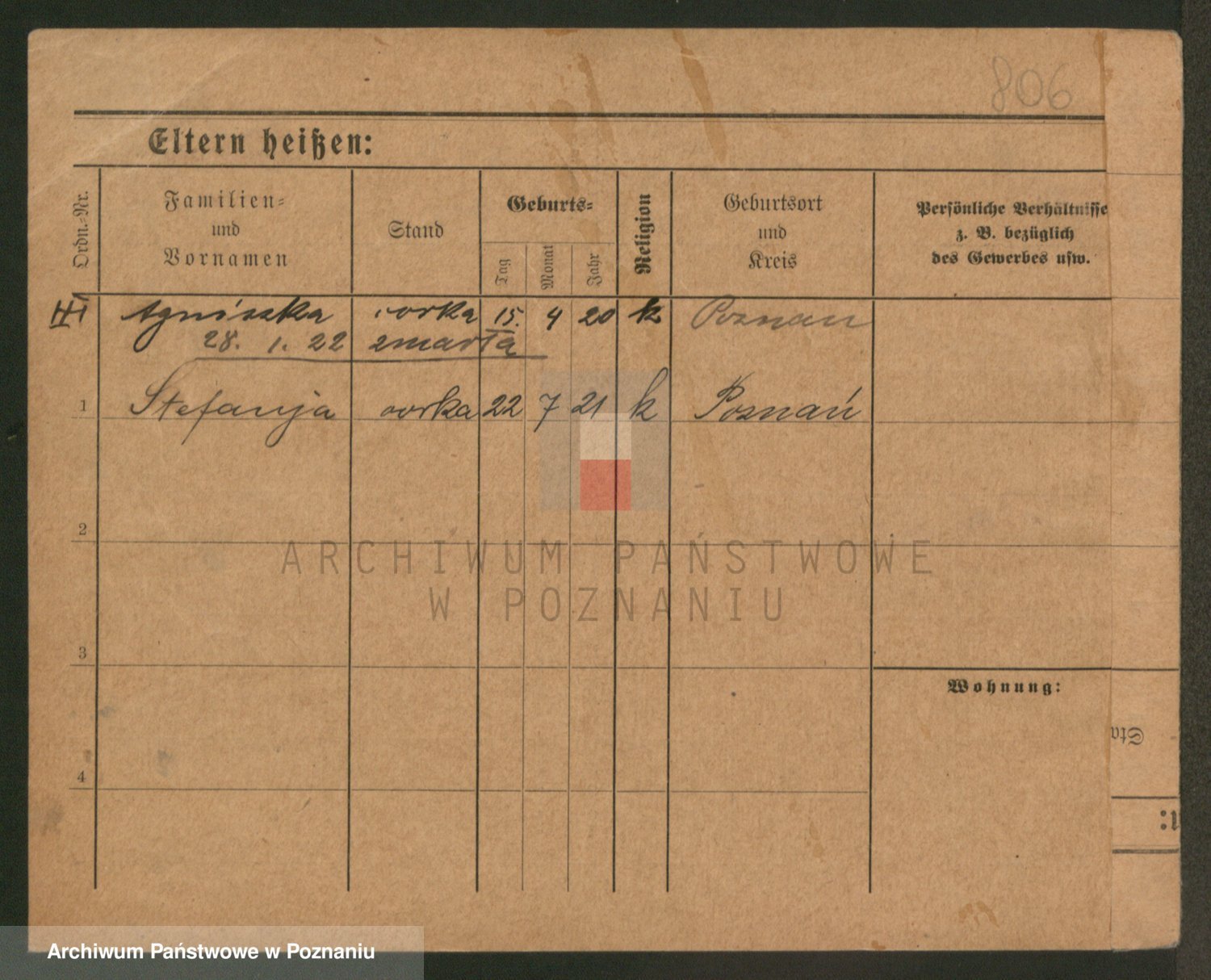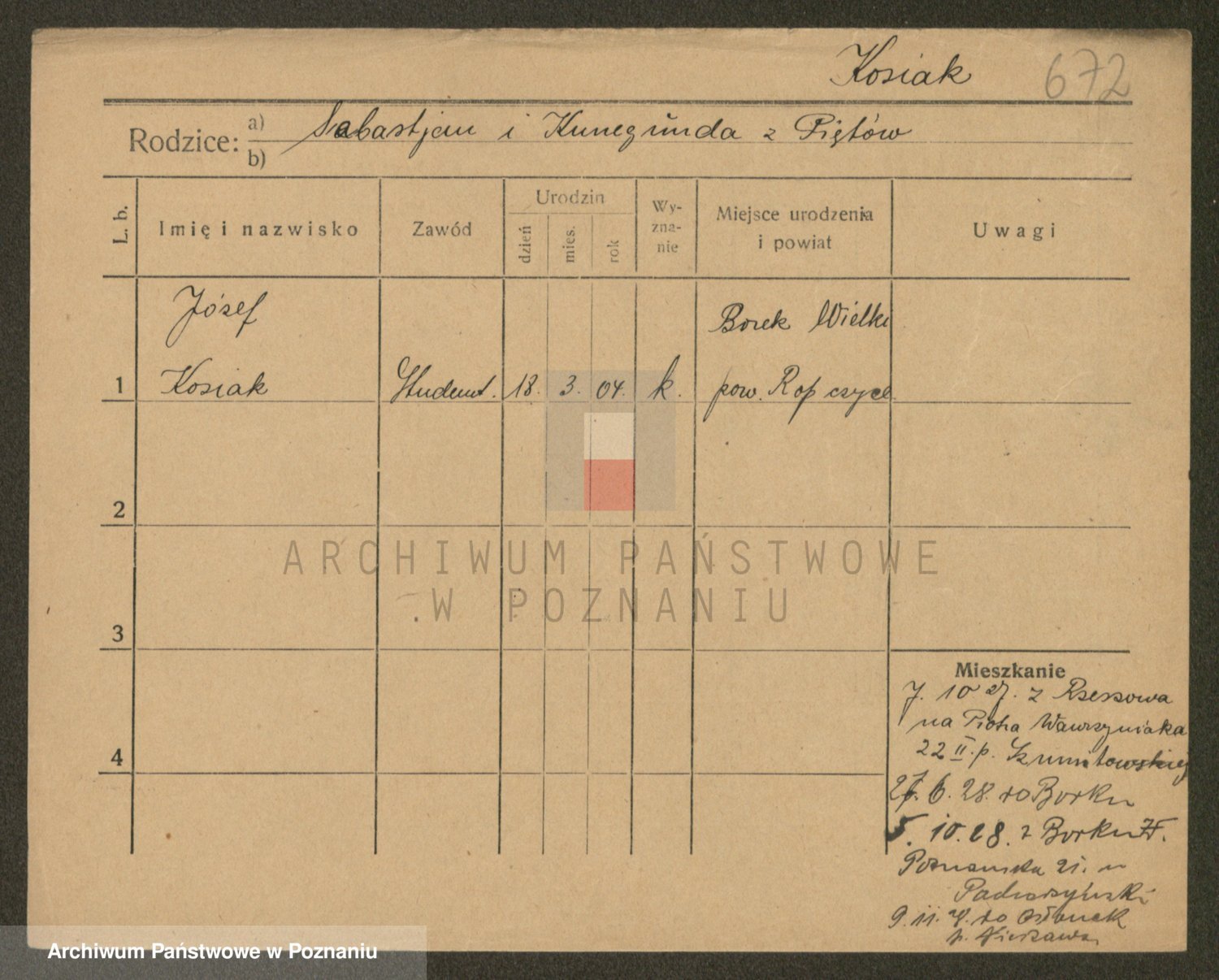 Podgląd karty osobowej dostępny jest po kliknięciu na nazwisko lub ikonkę karty. Można dokonywać powiększenia (ikony na górze) lub przechodzić między kolejnymi skanami (strzałki po bokach).