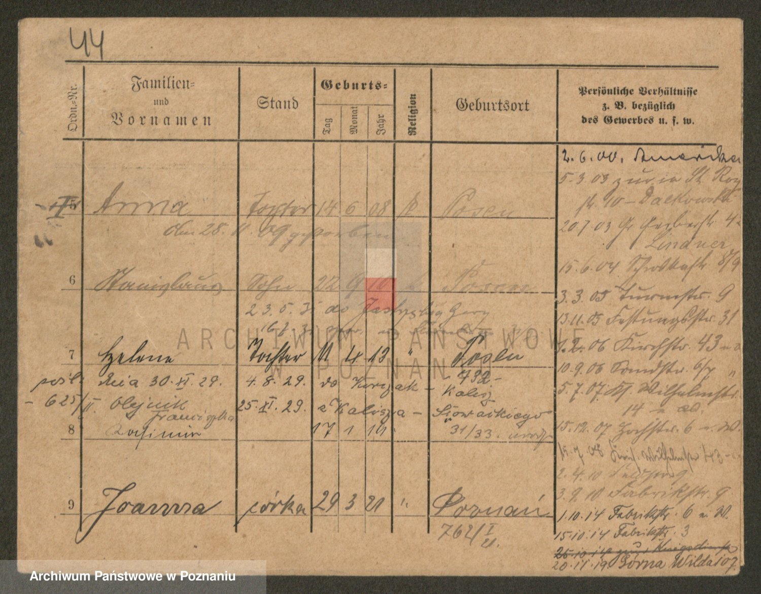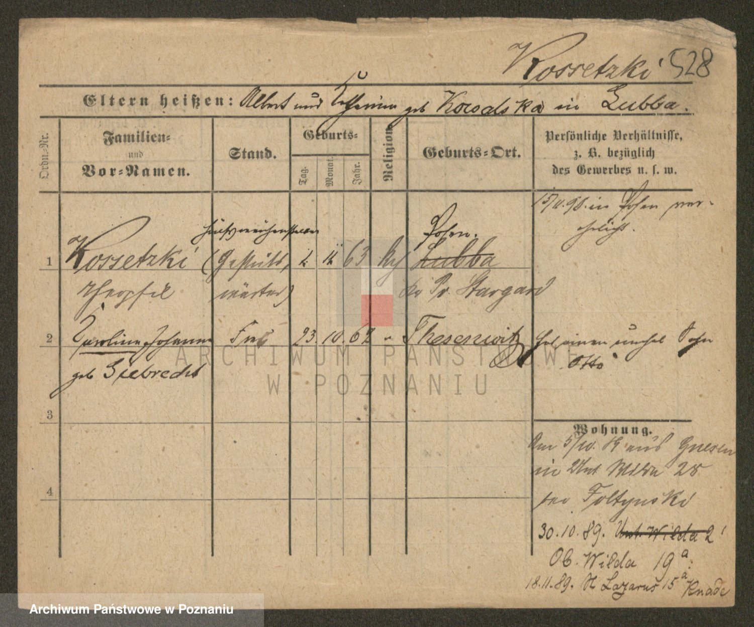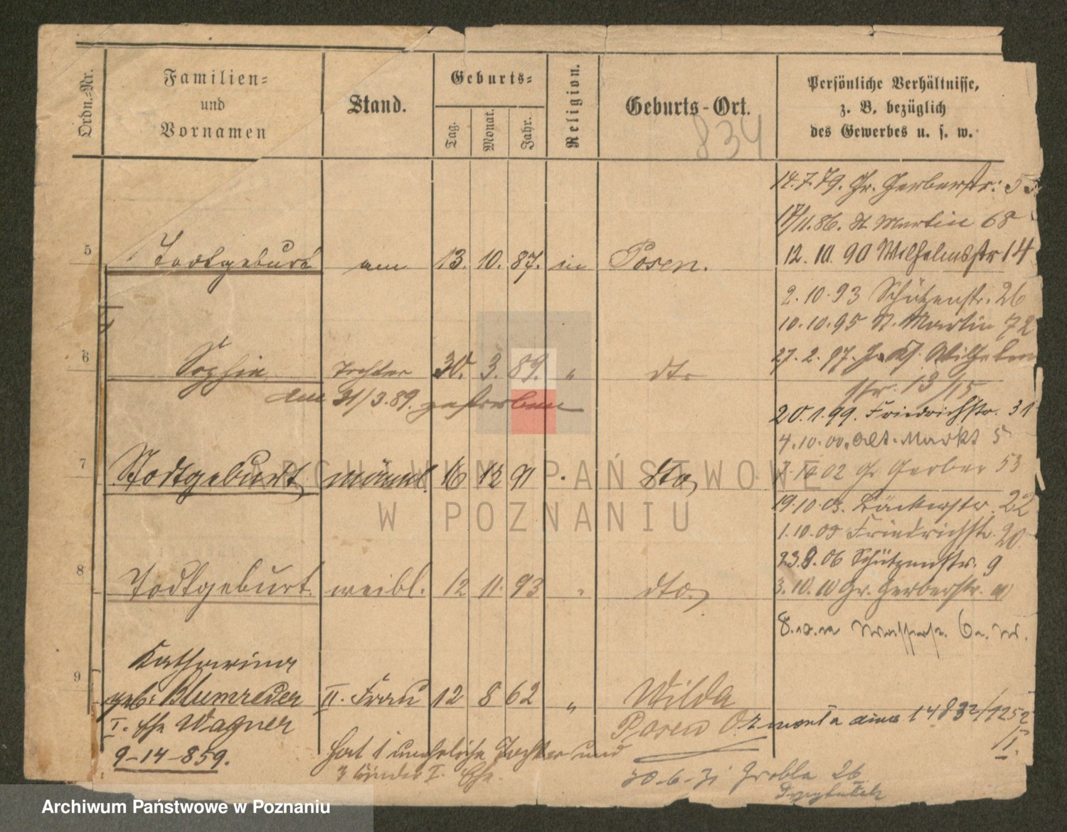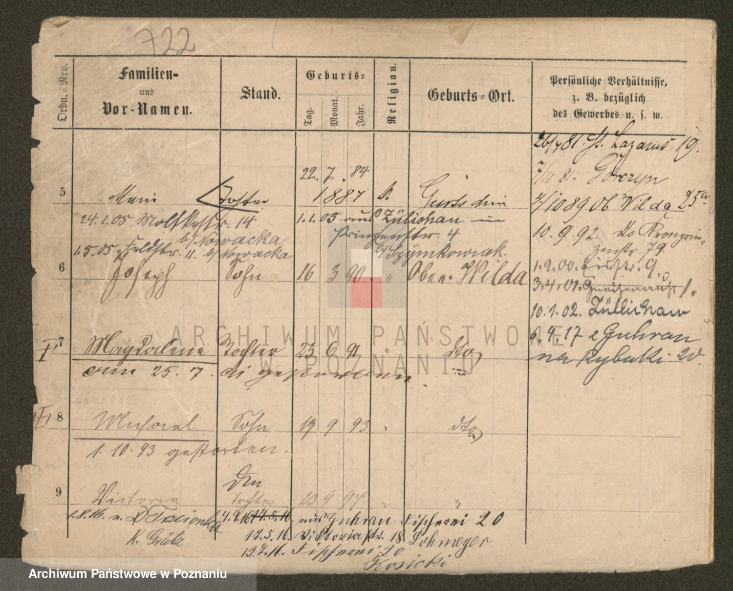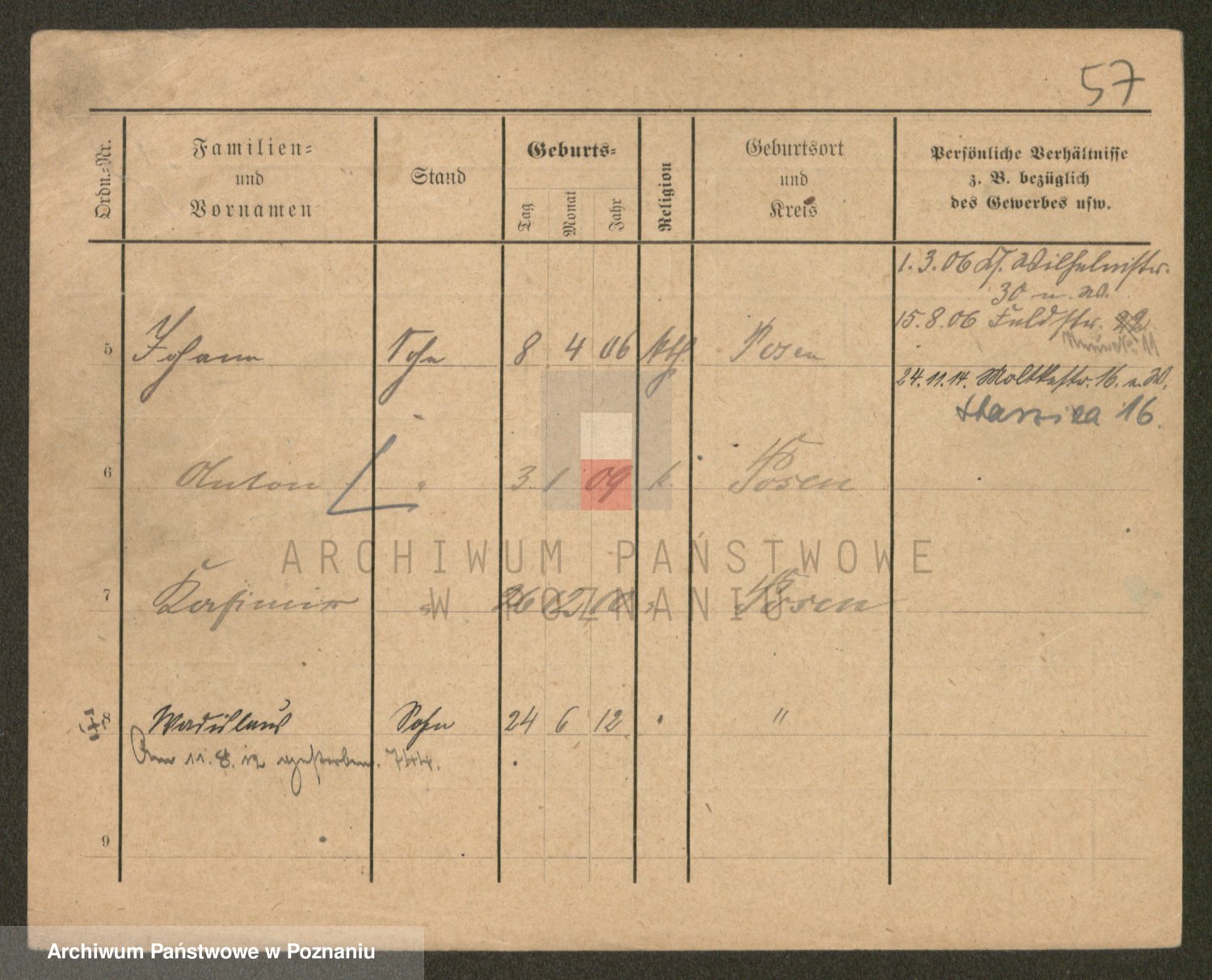 Podgląd karty osobowej dostępny jest po kliknięciu na nazwisko lub ikonkę karty. Można dokonywać powiększenia (ikony na górze) lub przechodzić między kolejnymi skanami (strzałki po bokach).