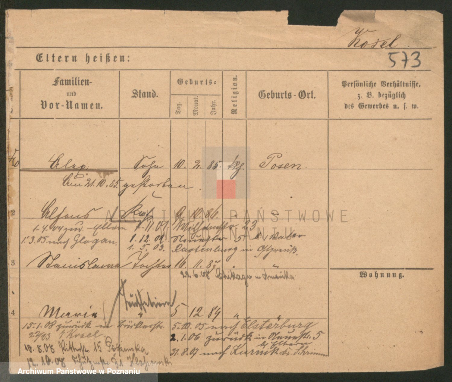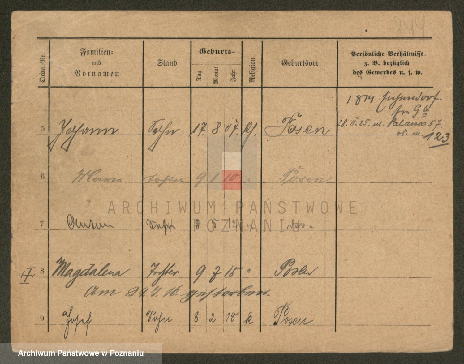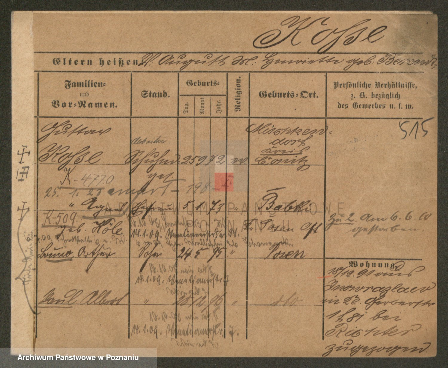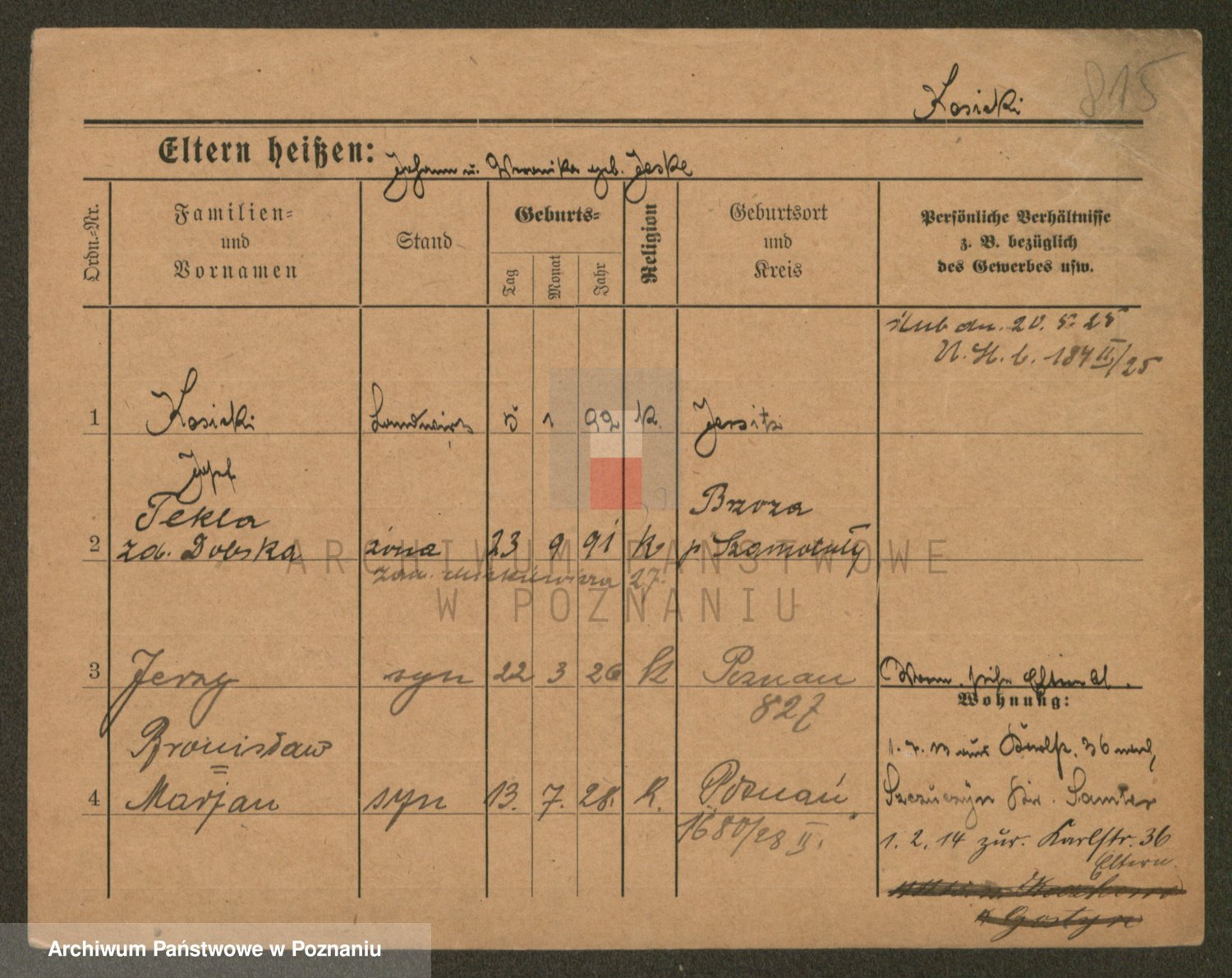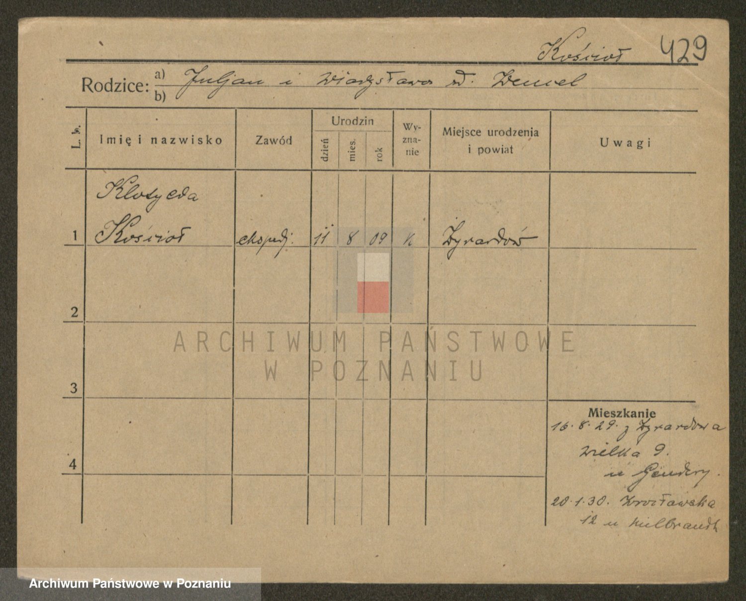 Podgląd karty osobowej dostępny jest po kliknięciu na nazwisko lub ikonkę karty. Można dokonywać powiększenia (ikony na górze) lub przechodzić między kolejnymi skanami (strzałki po bokach).