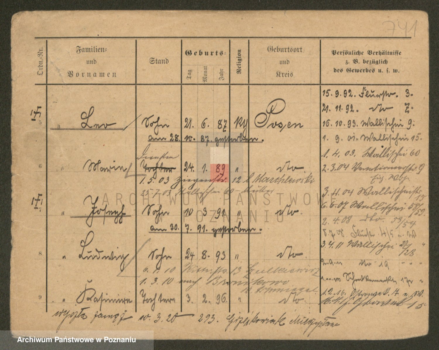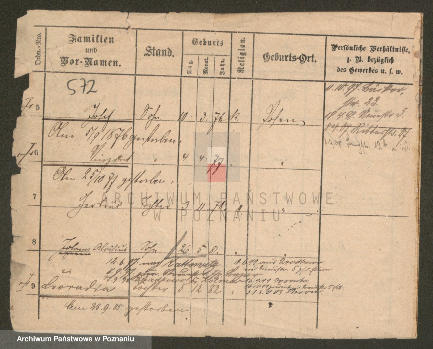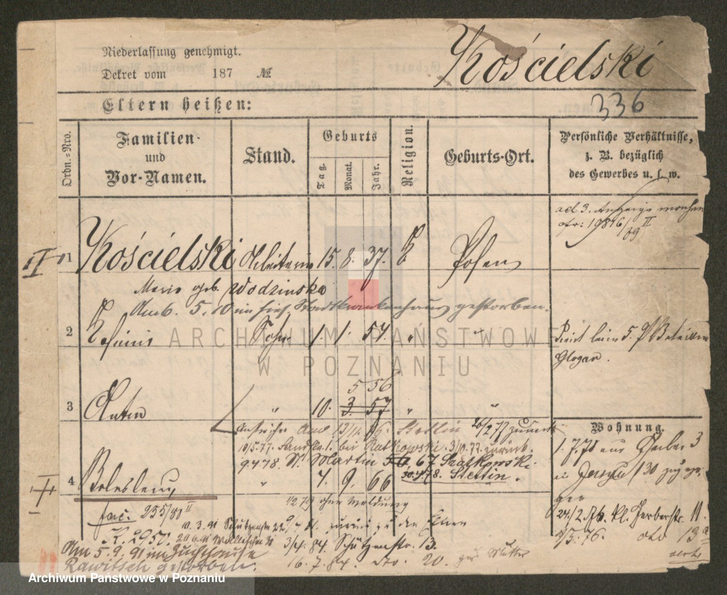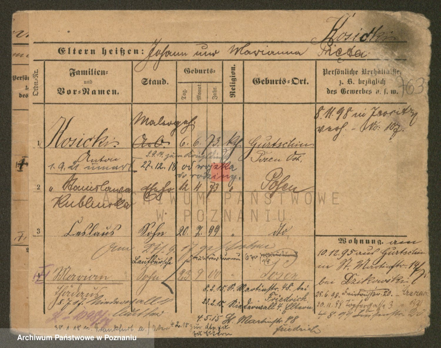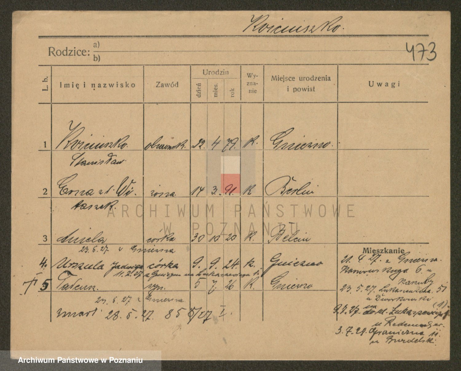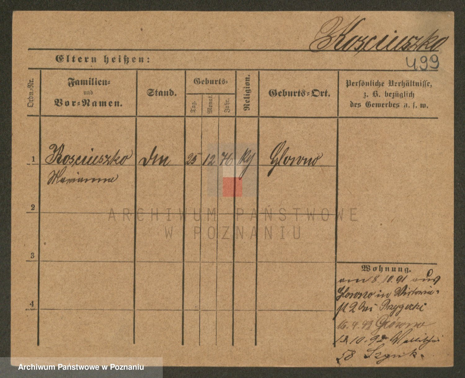 Podgląd karty osobowej dostępny jest po kliknięciu na nazwisko lub ikonkę karty. Można dokonywać powiększenia (ikony na górze) lub przechodzić między kolejnymi skanami (strzałki po bokach).