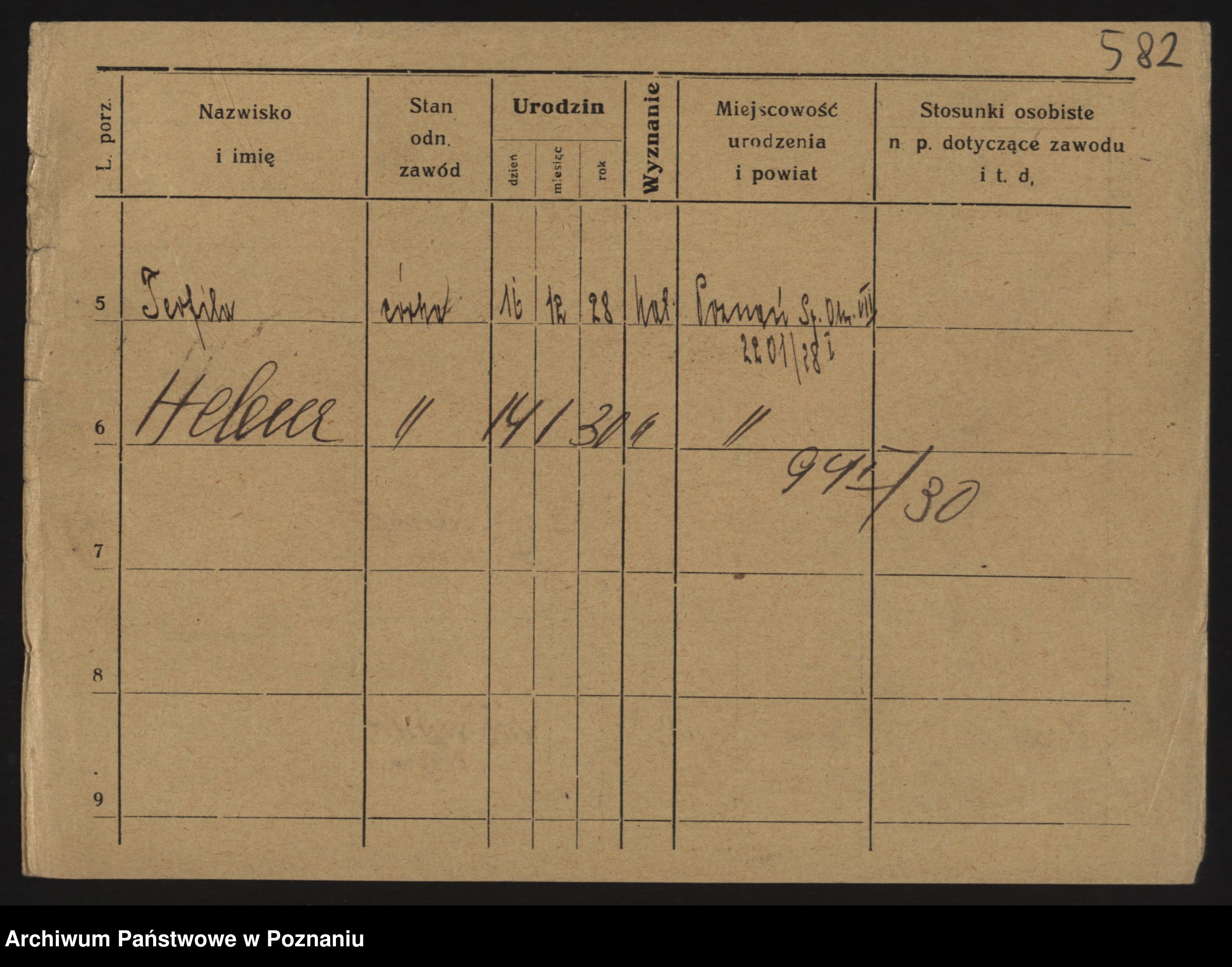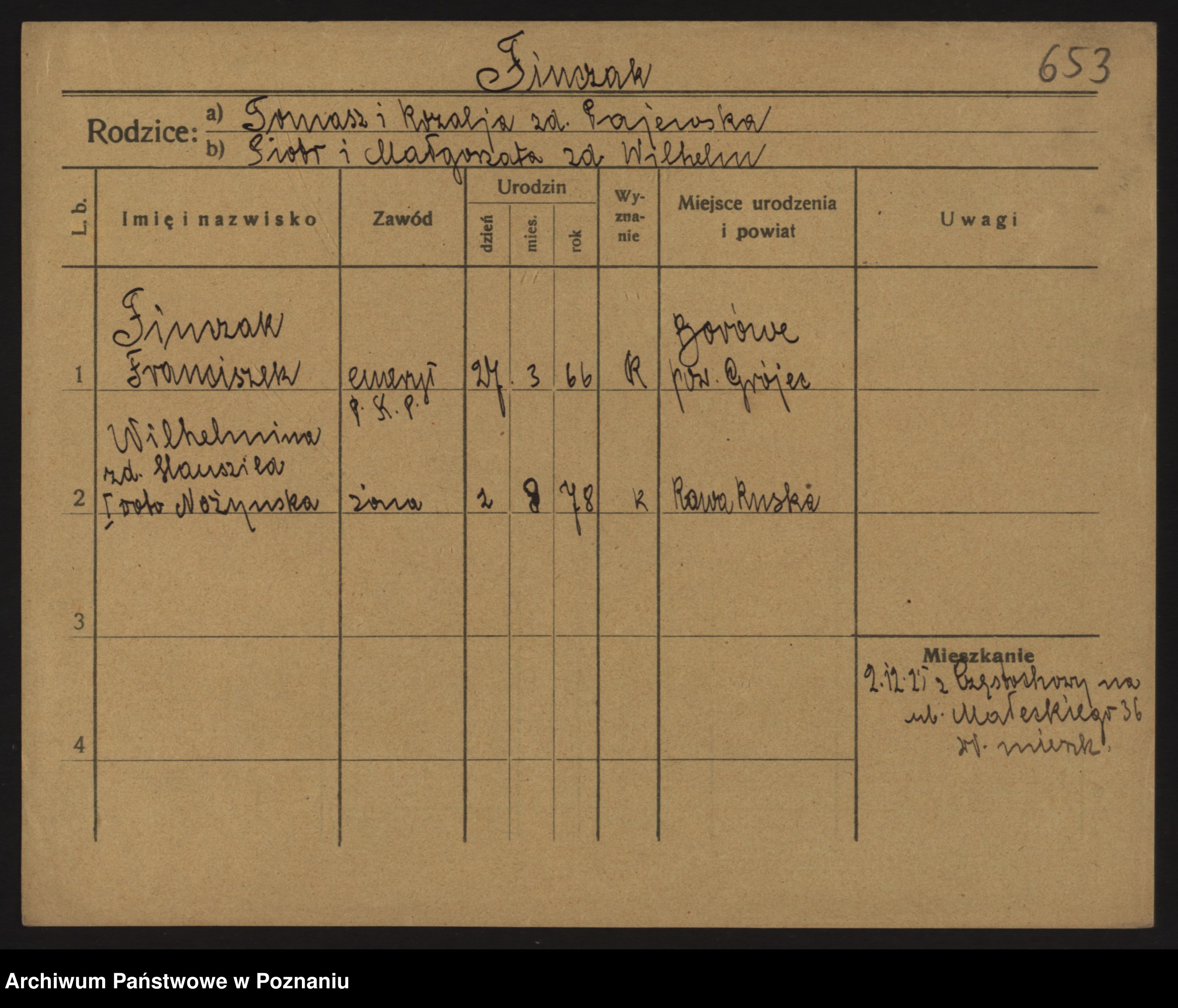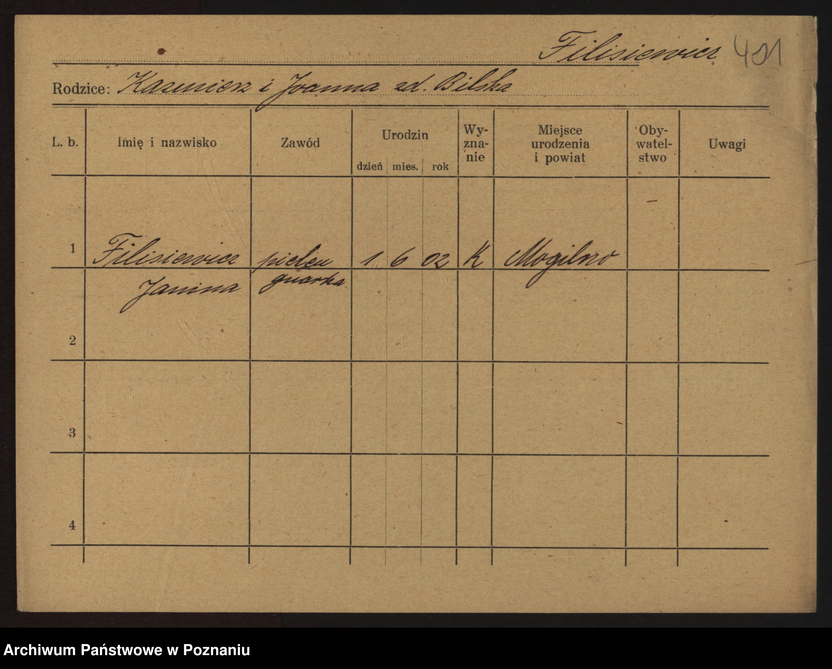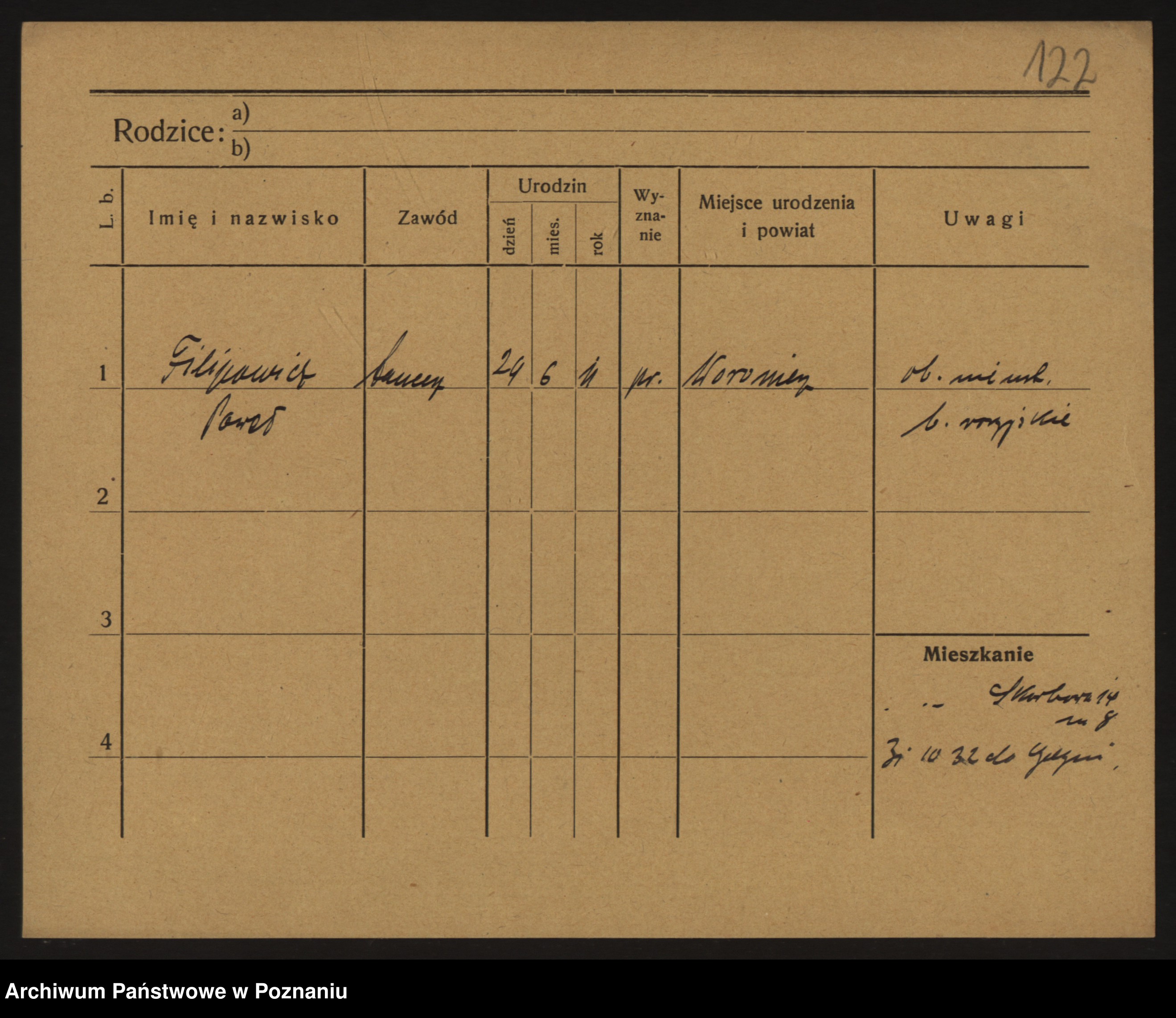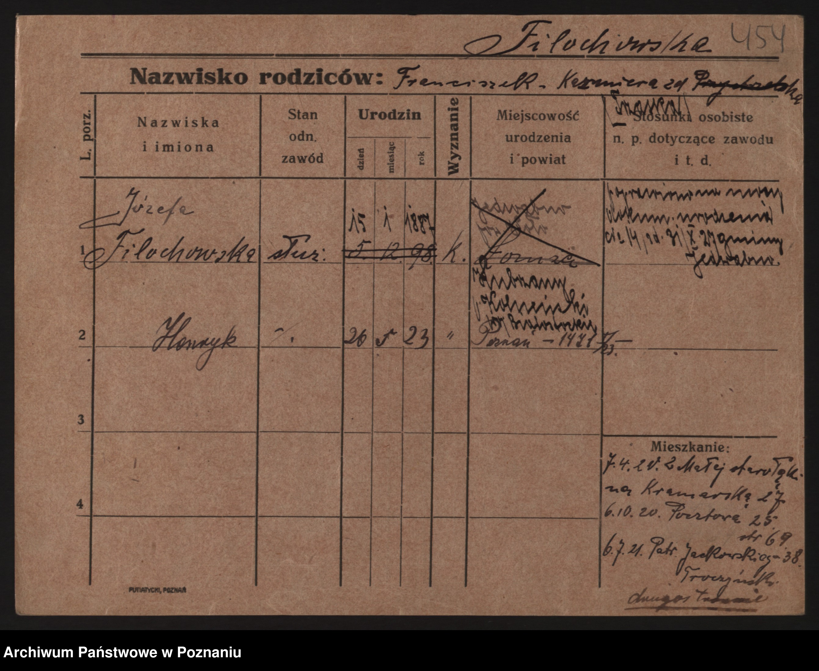 Podgląd karty osobowej dostępny jest po kliknięciu na nazwisko lub ikonkę karty. Można dokonywać powiększenia (ikony na górze) lub przechodzić między kolejnymi skanami (strzałki po bokach).