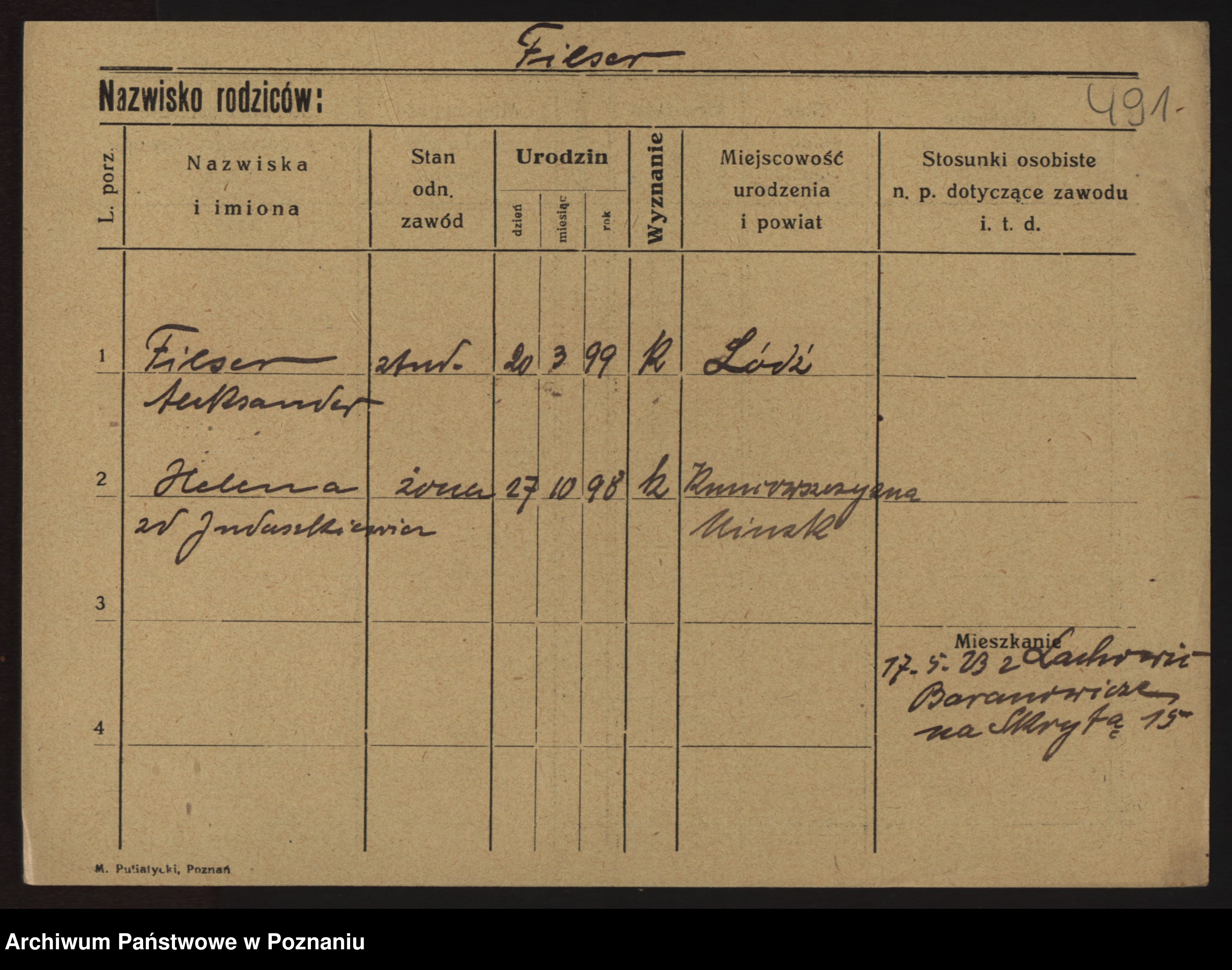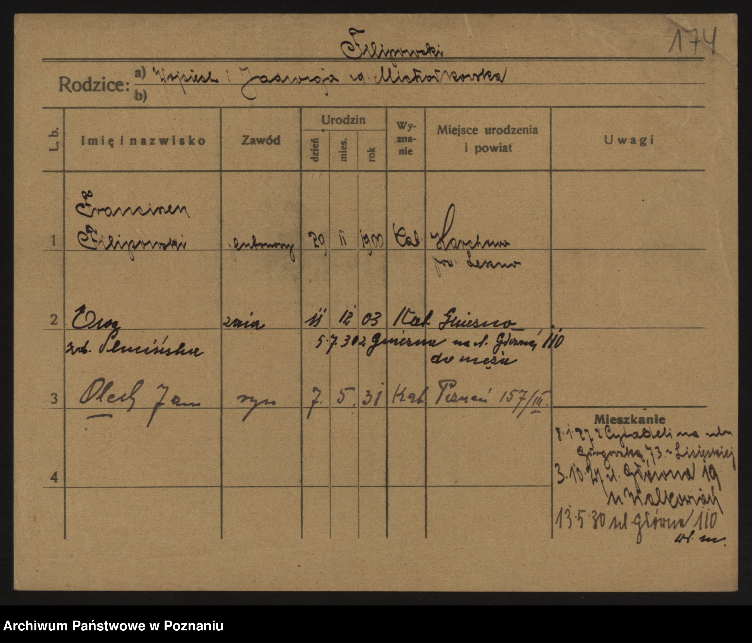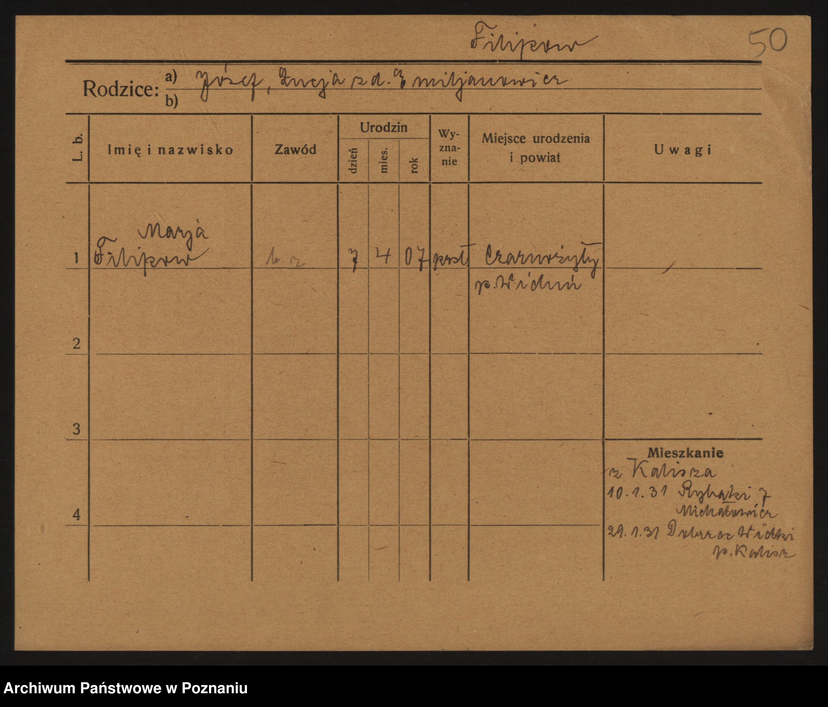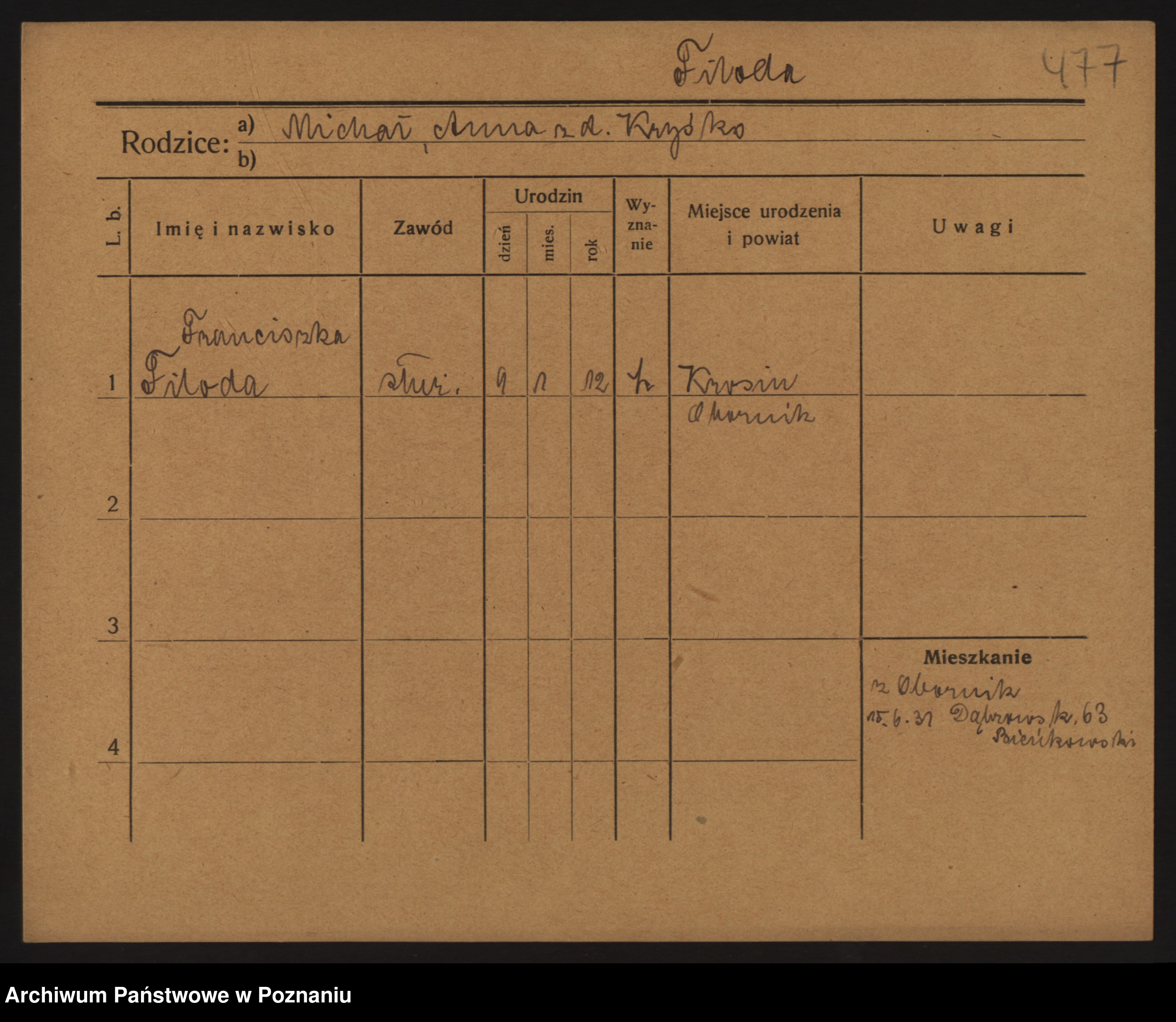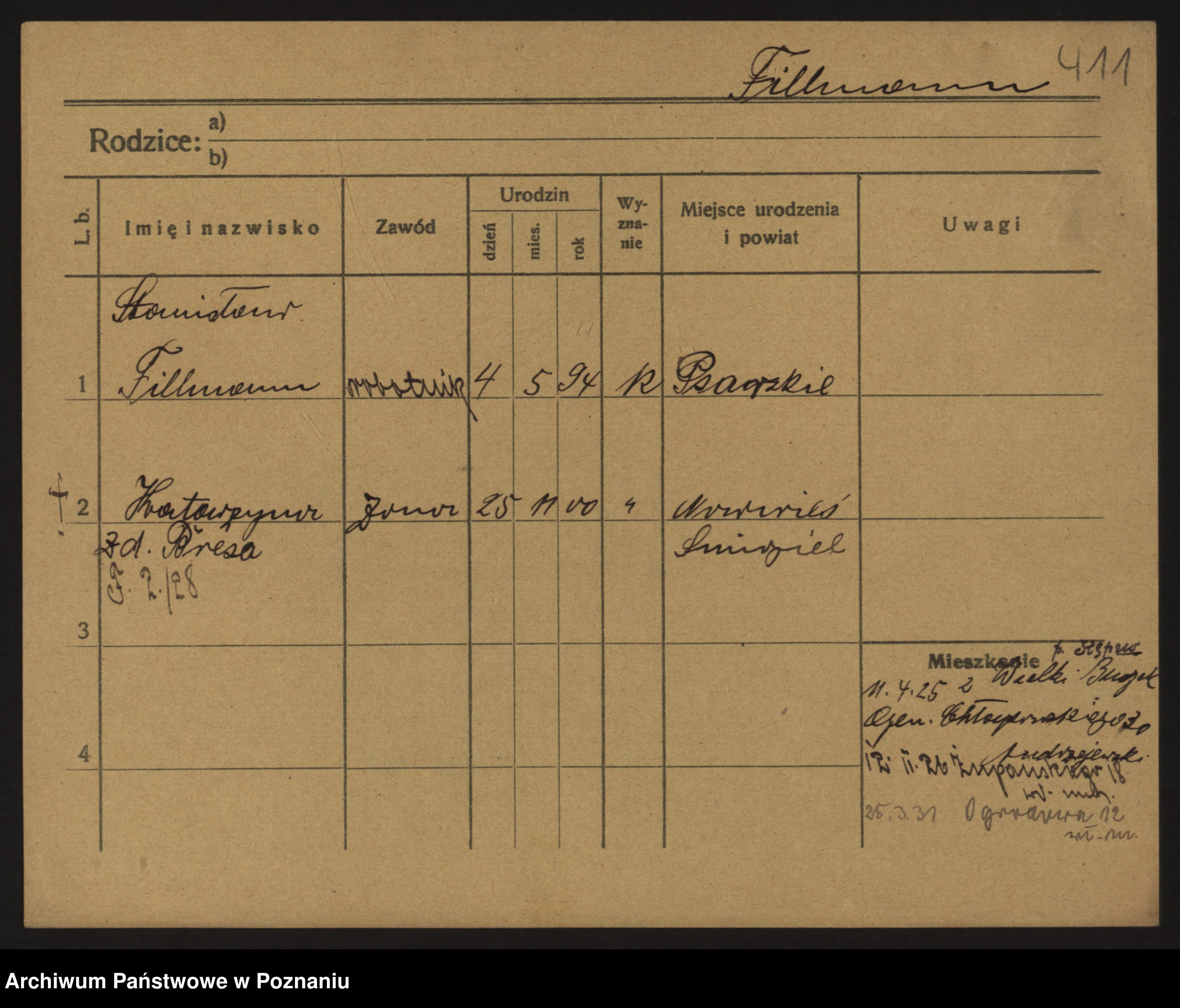 Podgląd karty osobowej dostępny jest po kliknięciu na nazwisko lub ikonkę karty. Można dokonywać powiększenia (ikony na górze) lub przechodzić między kolejnymi skanami (strzałki po bokach).