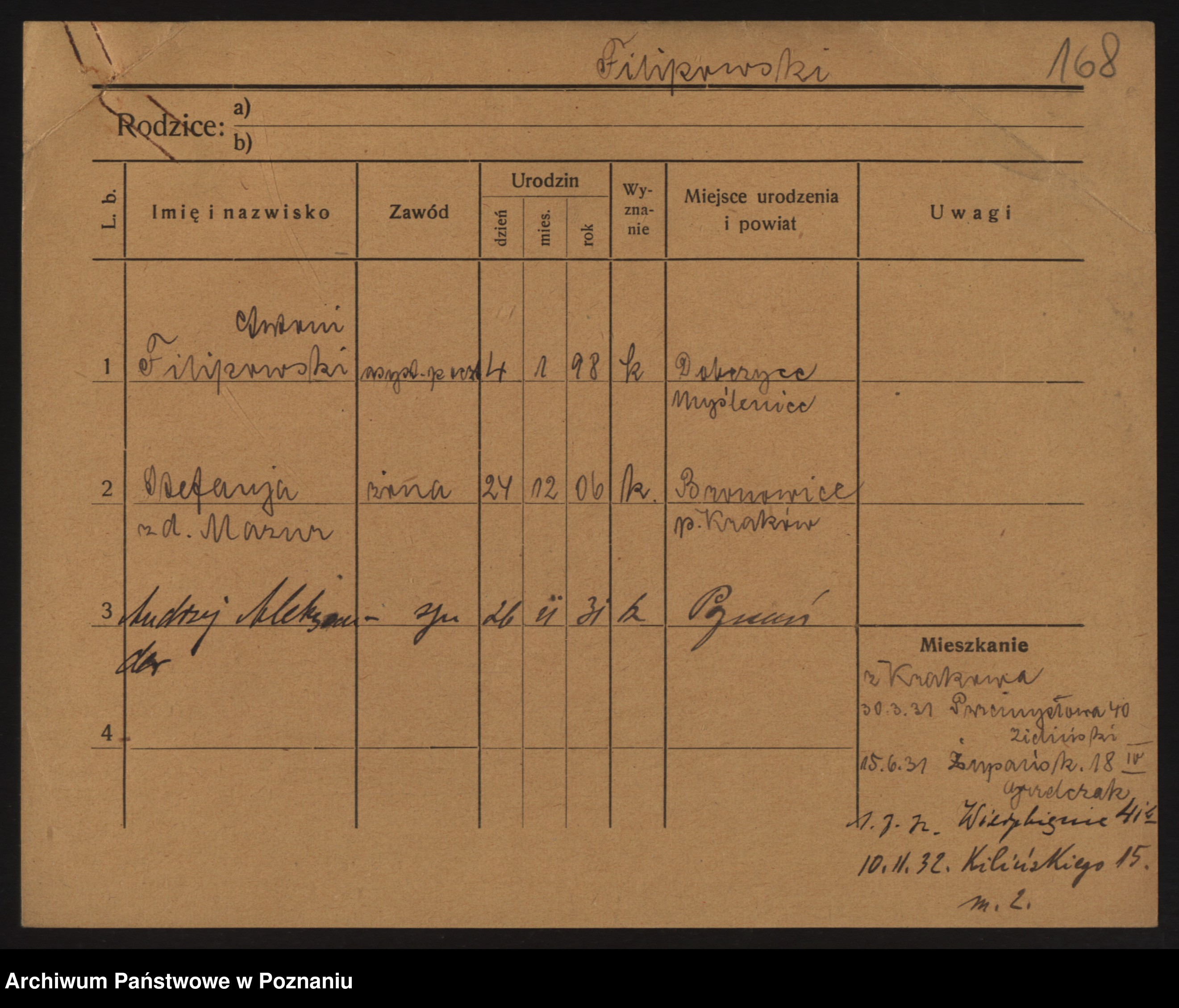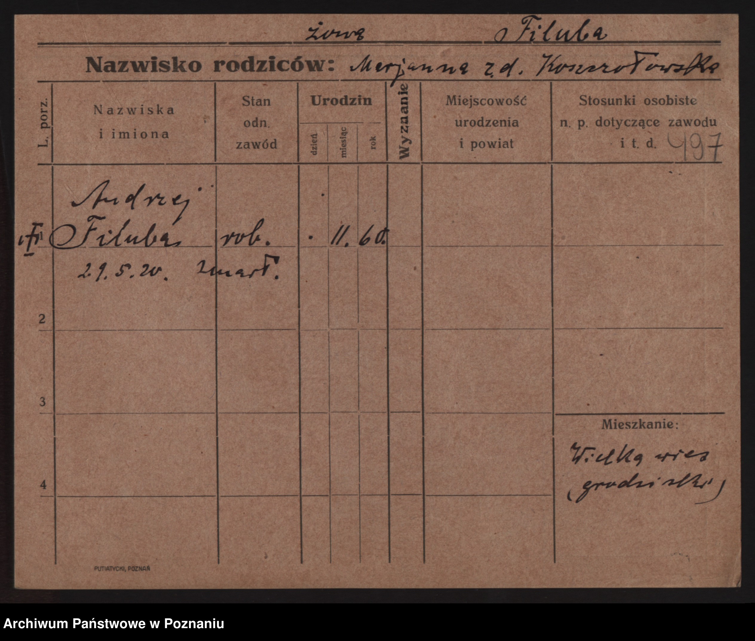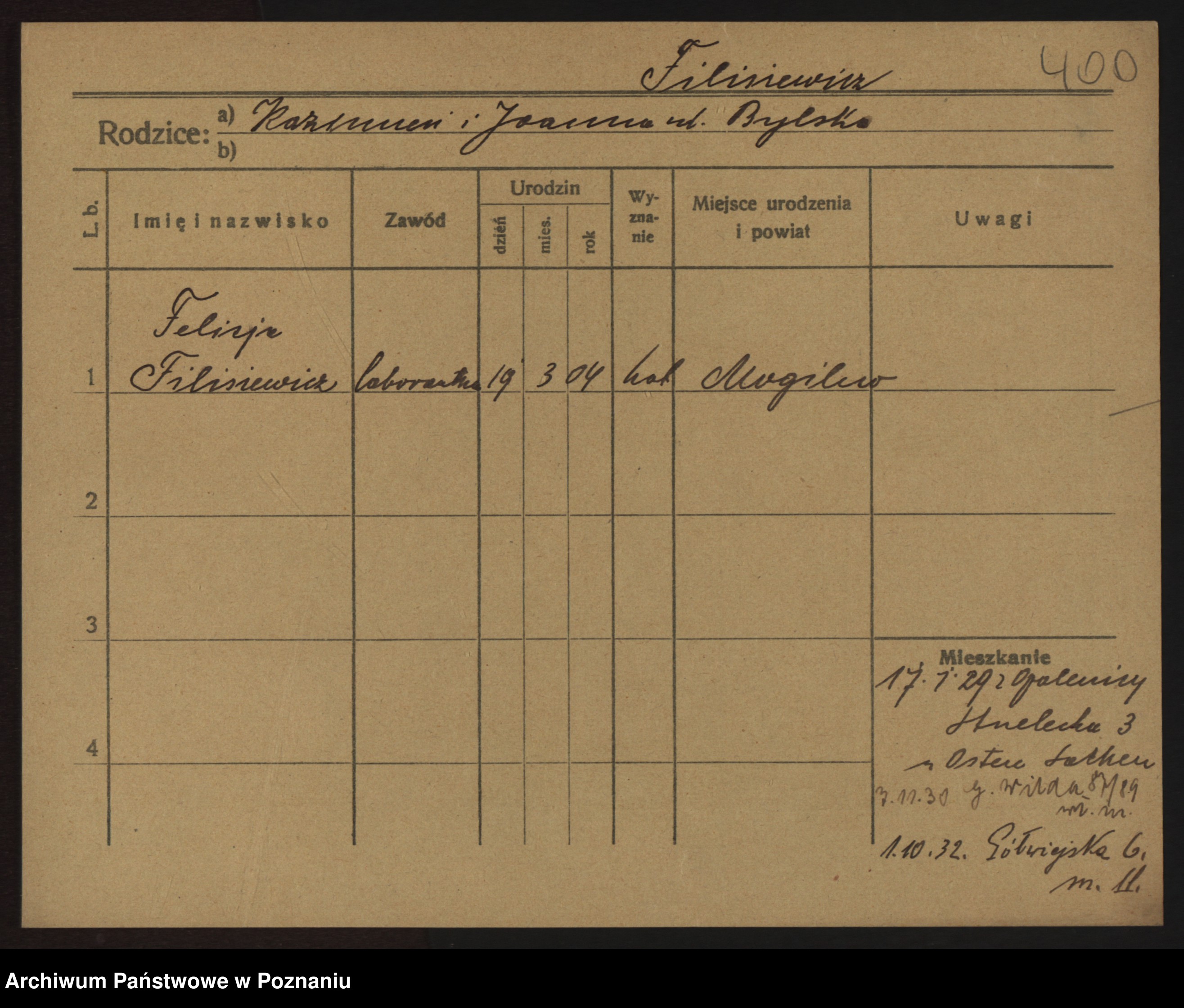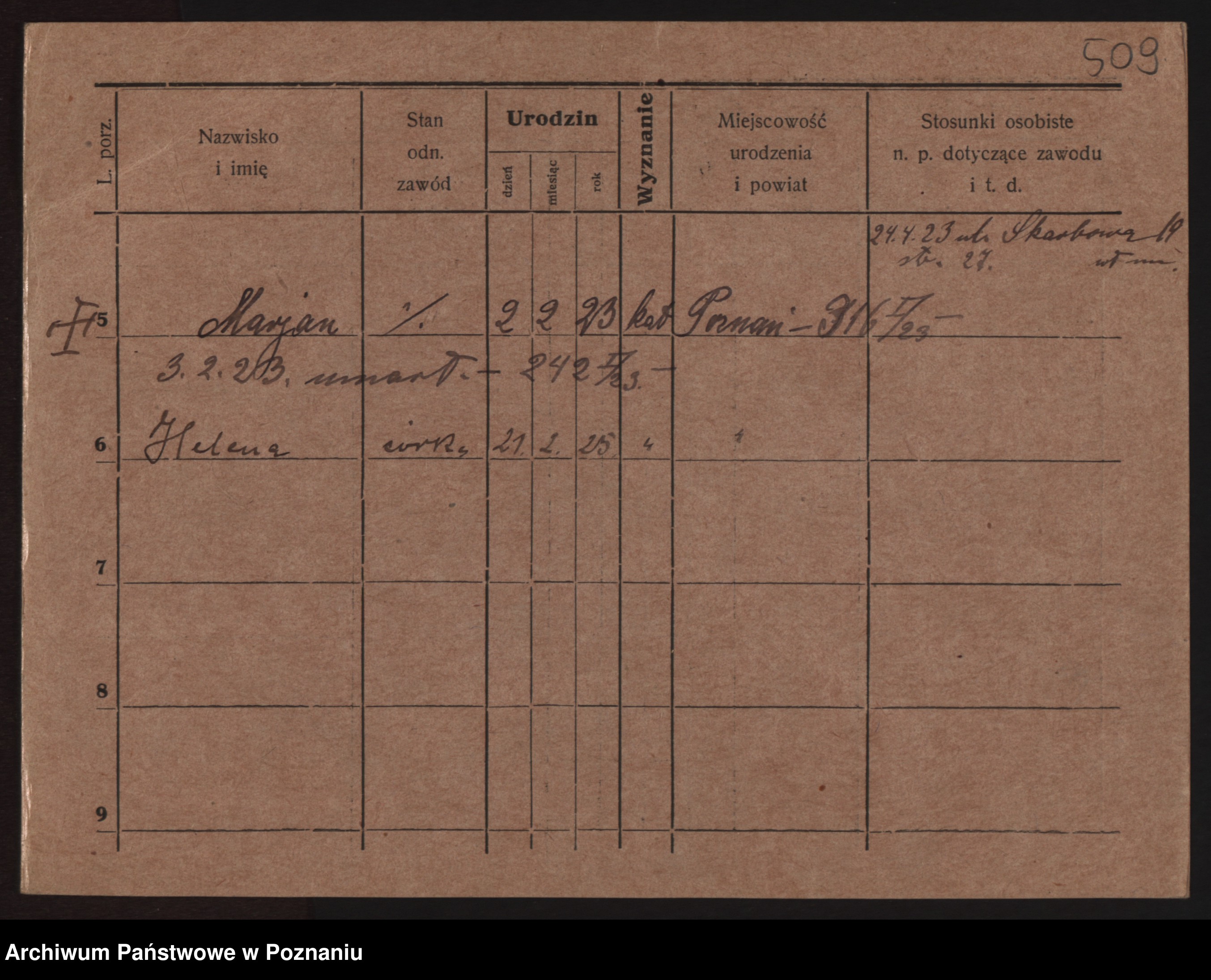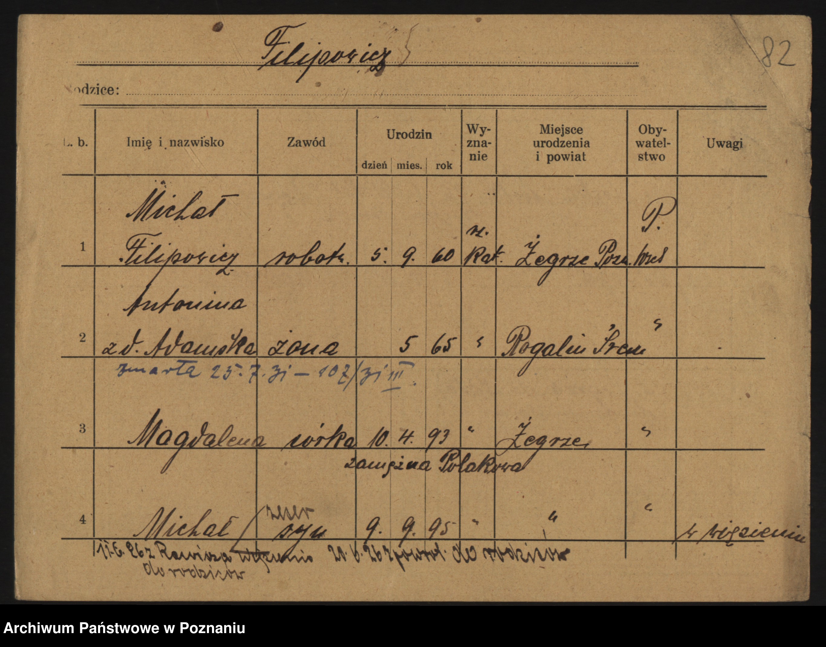 Podgląd karty osobowej dostępny jest po kliknięciu na nazwisko lub ikonkę karty. Można dokonywać powiększenia (ikony na górze) lub przechodzić między kolejnymi skanami (strzałki po bokach).