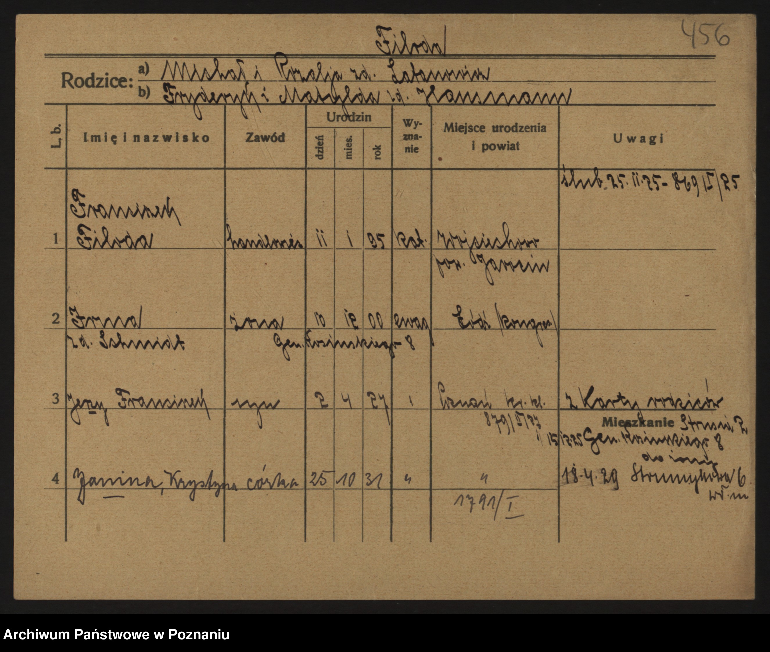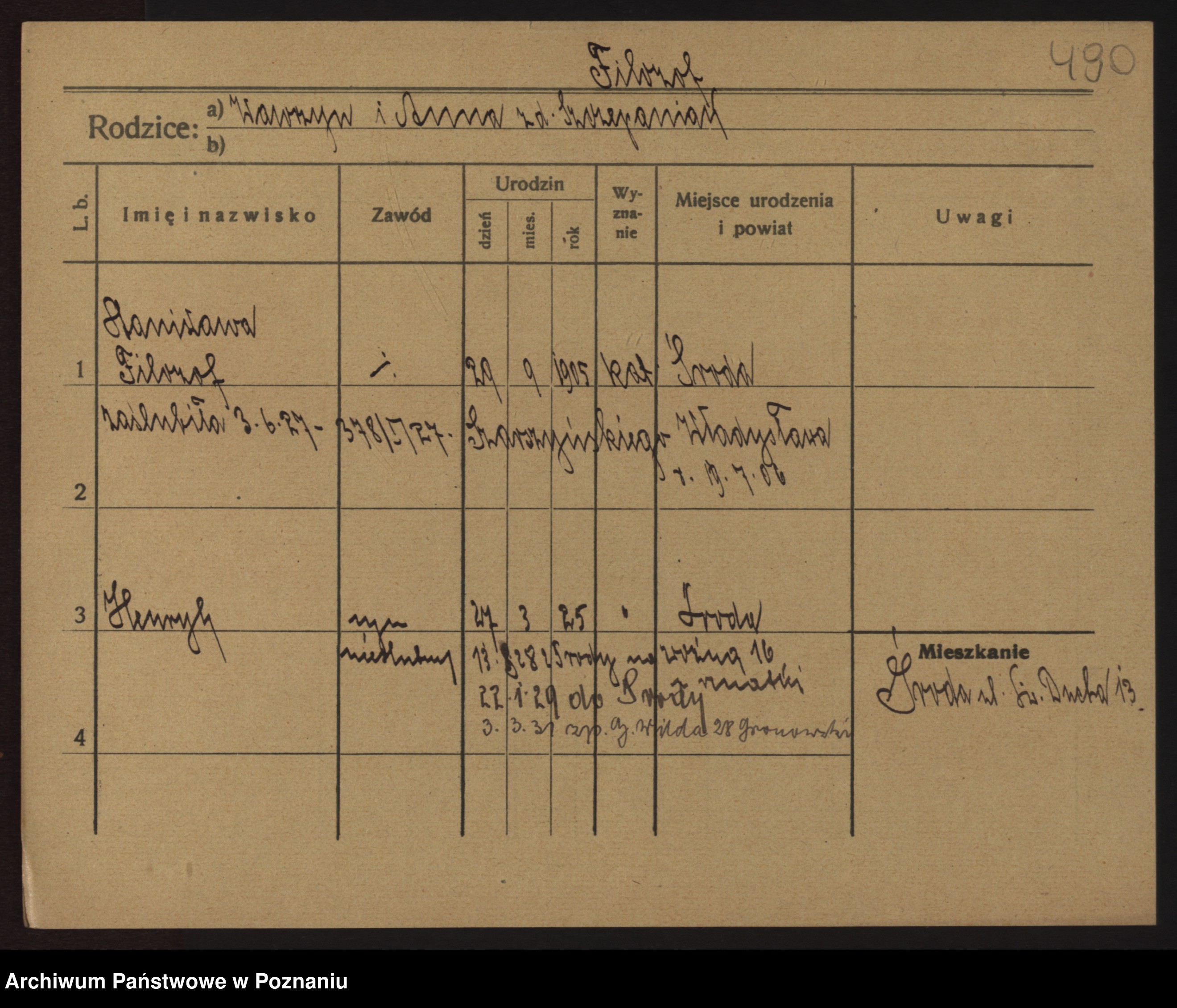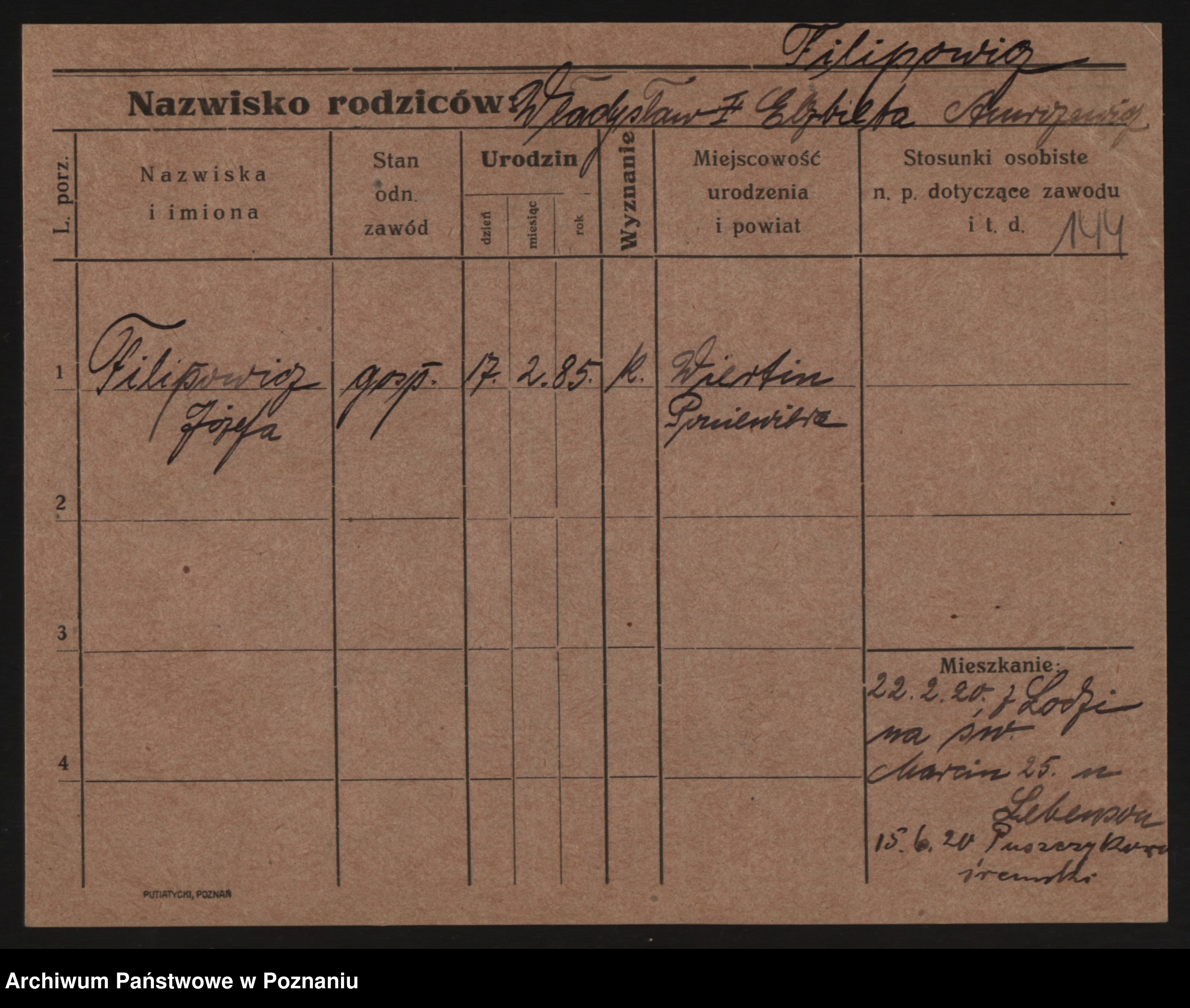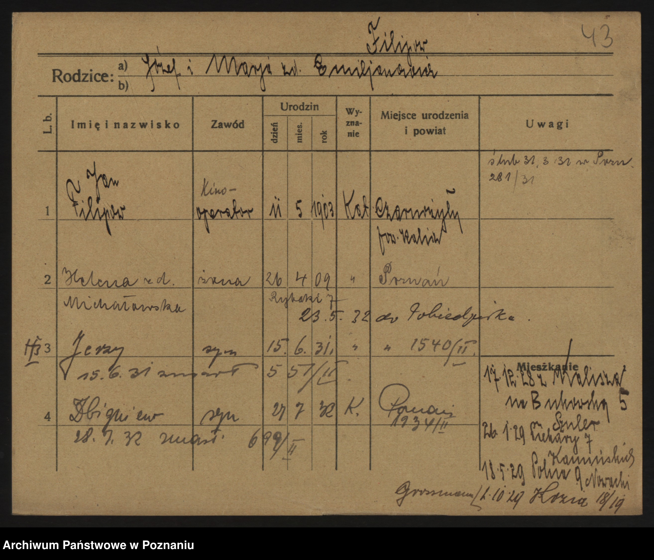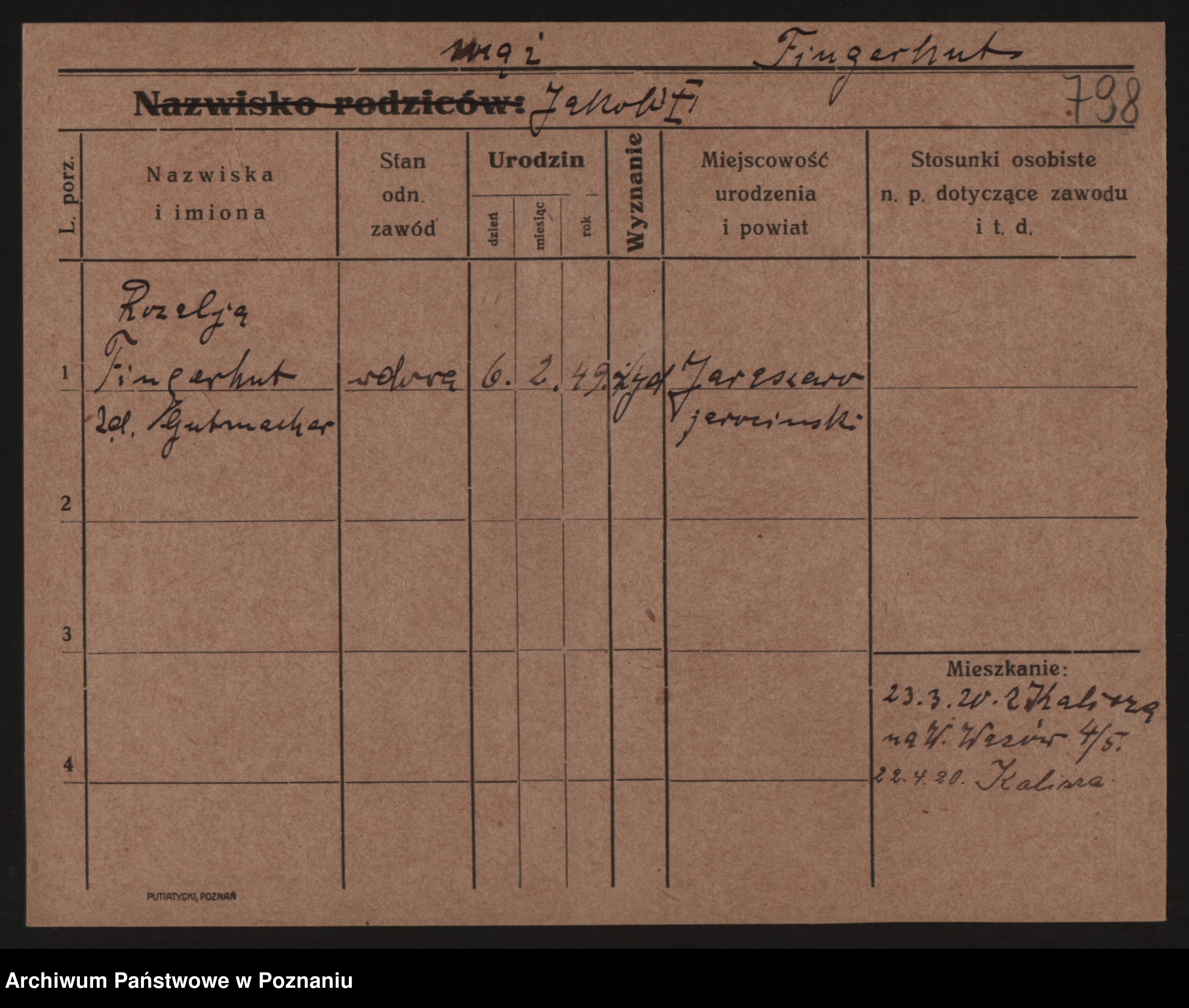 Podgląd karty osobowej dostępny jest po kliknięciu na nazwisko lub ikonkę karty. Można dokonywać powiększenia (ikony na górze) lub przechodzić między kolejnymi skanami (strzałki po bokach).