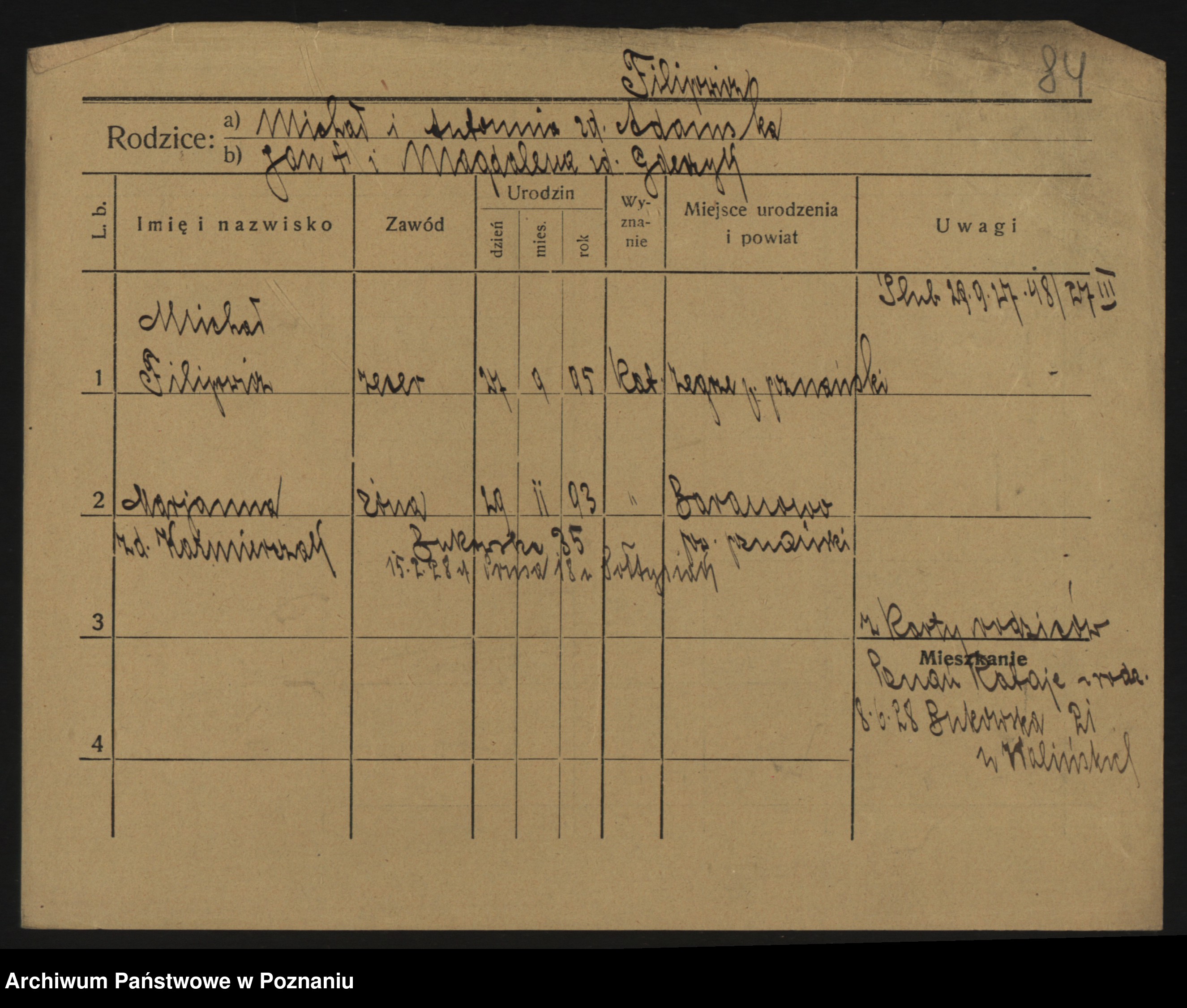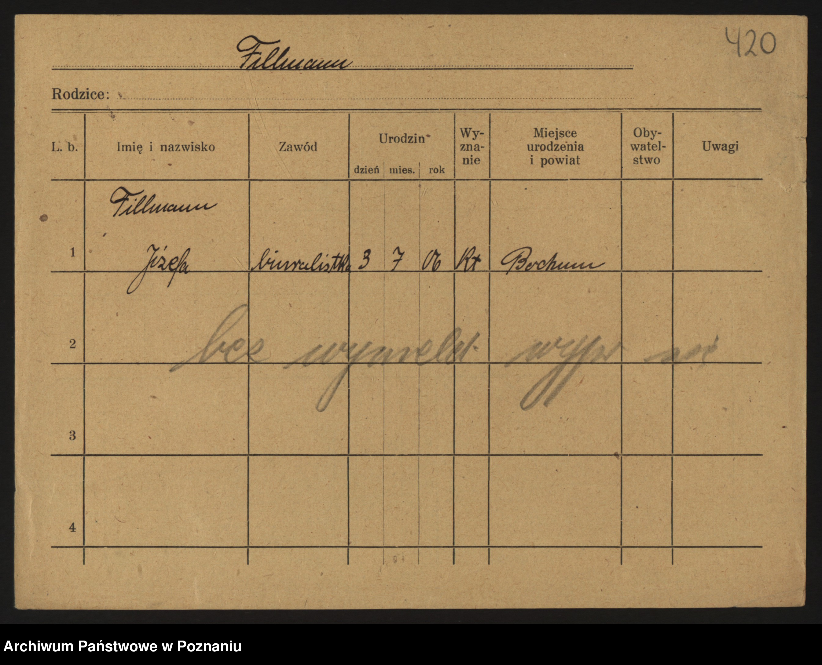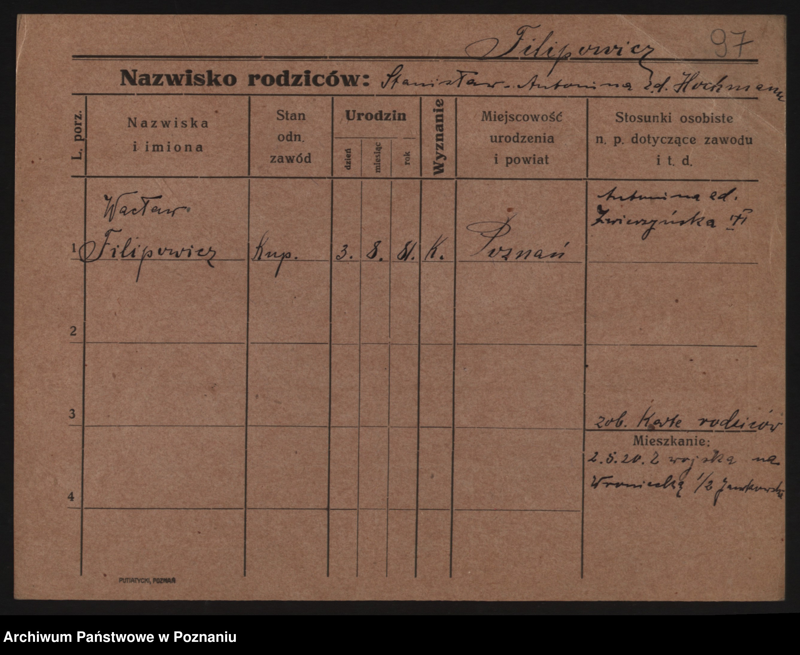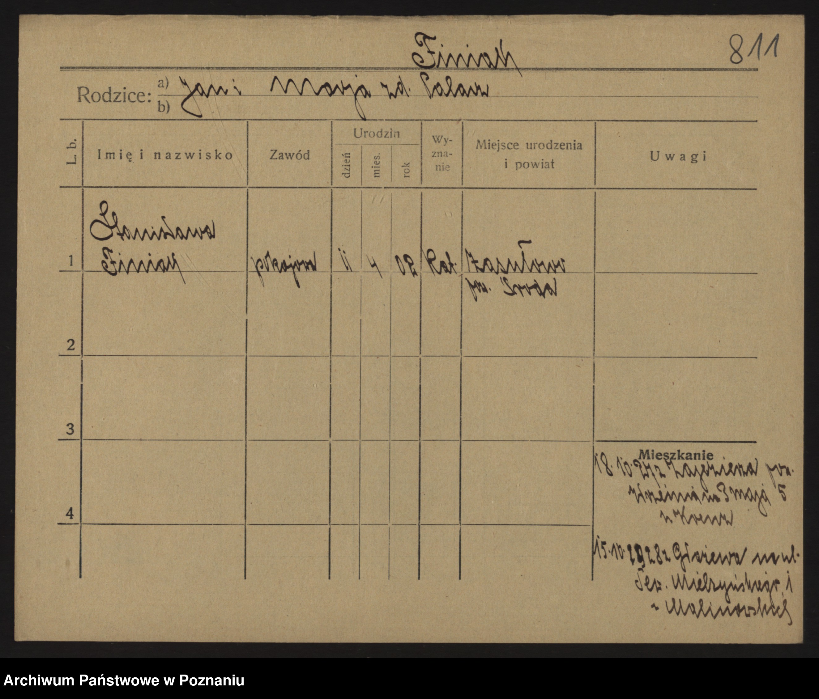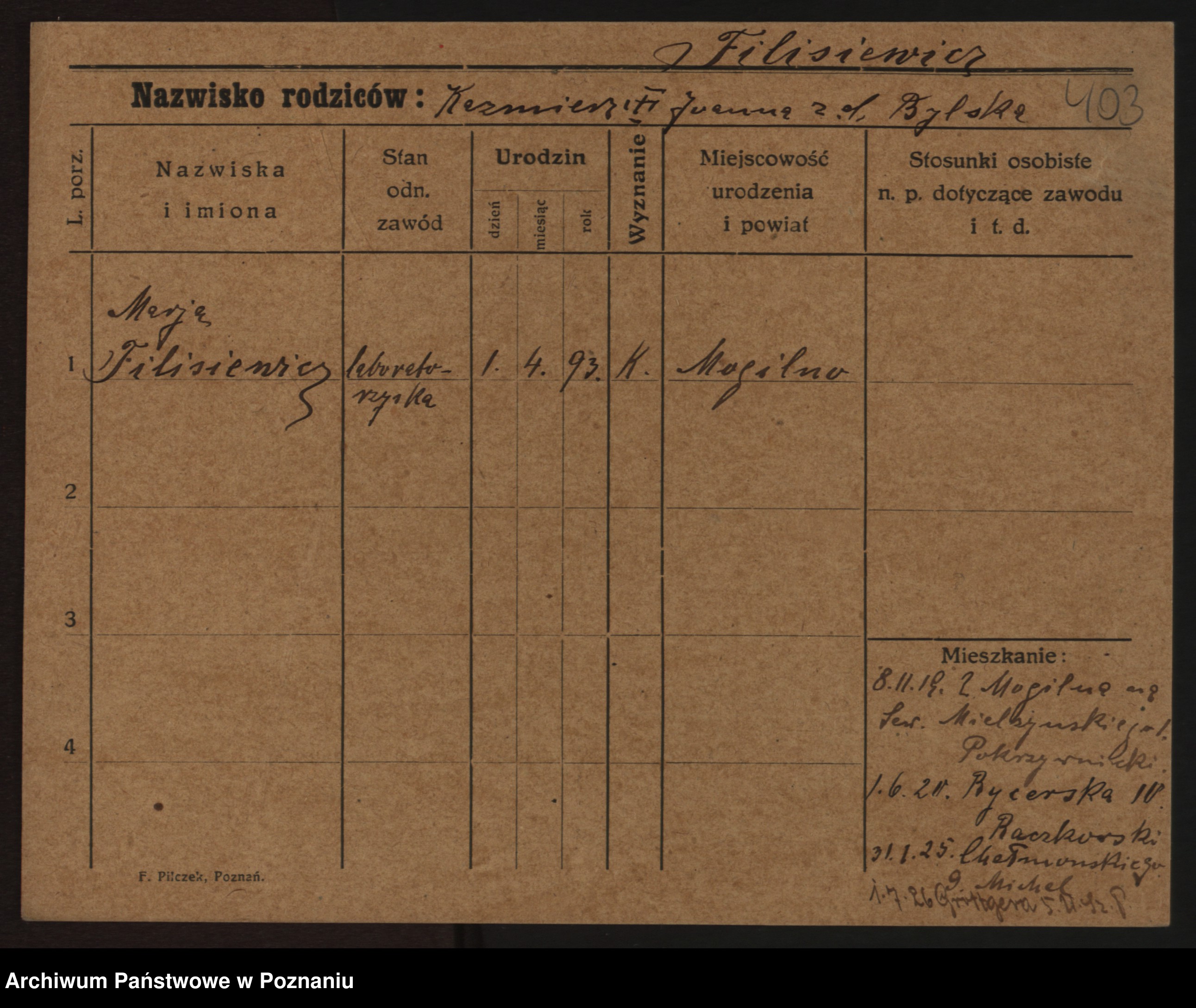 Podgląd karty osobowej dostępny jest po kliknięciu na nazwisko lub ikonkę karty. Można dokonywać powiększenia (ikony na górze) lub przechodzić między kolejnymi skanami (strzałki po bokach).