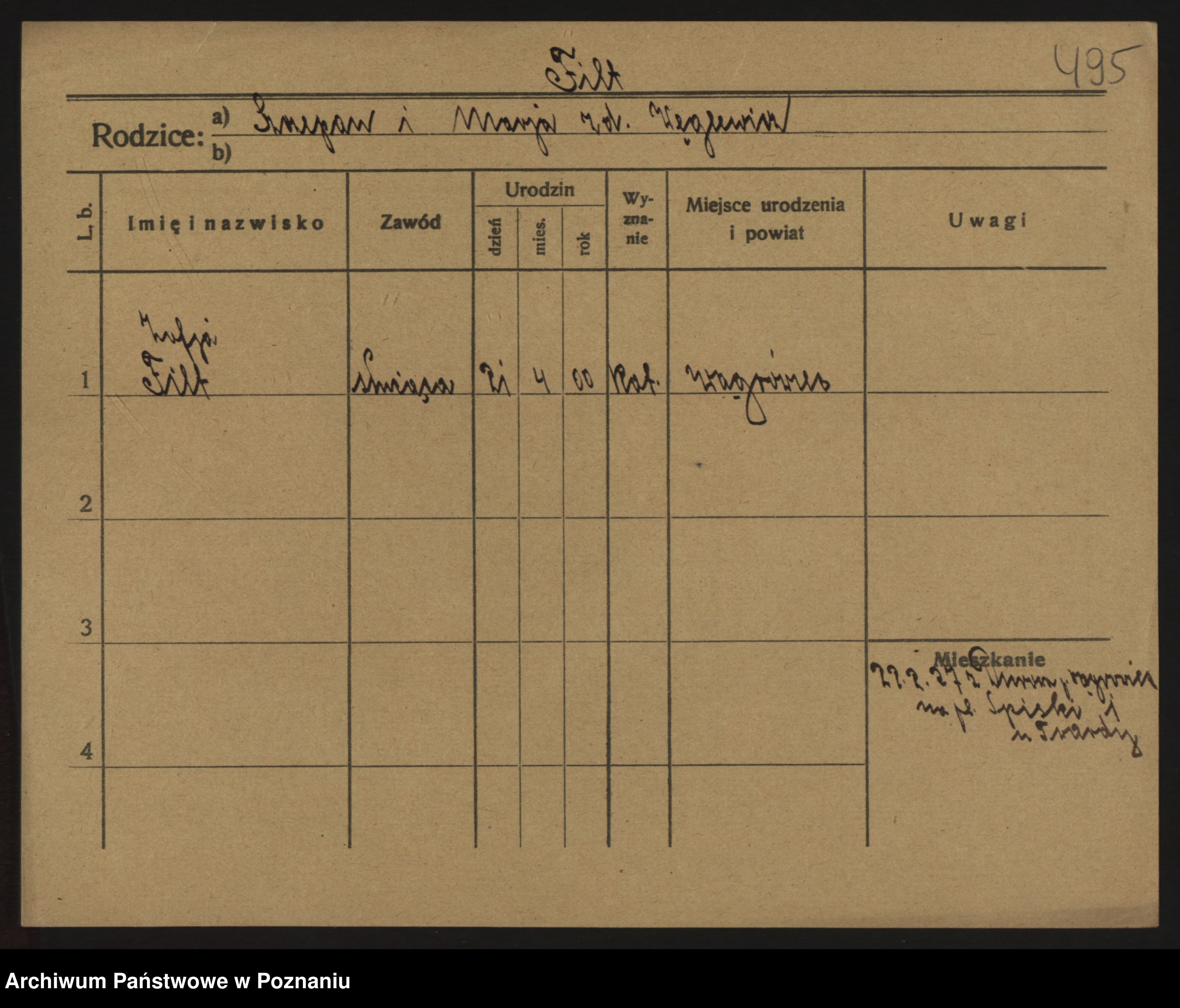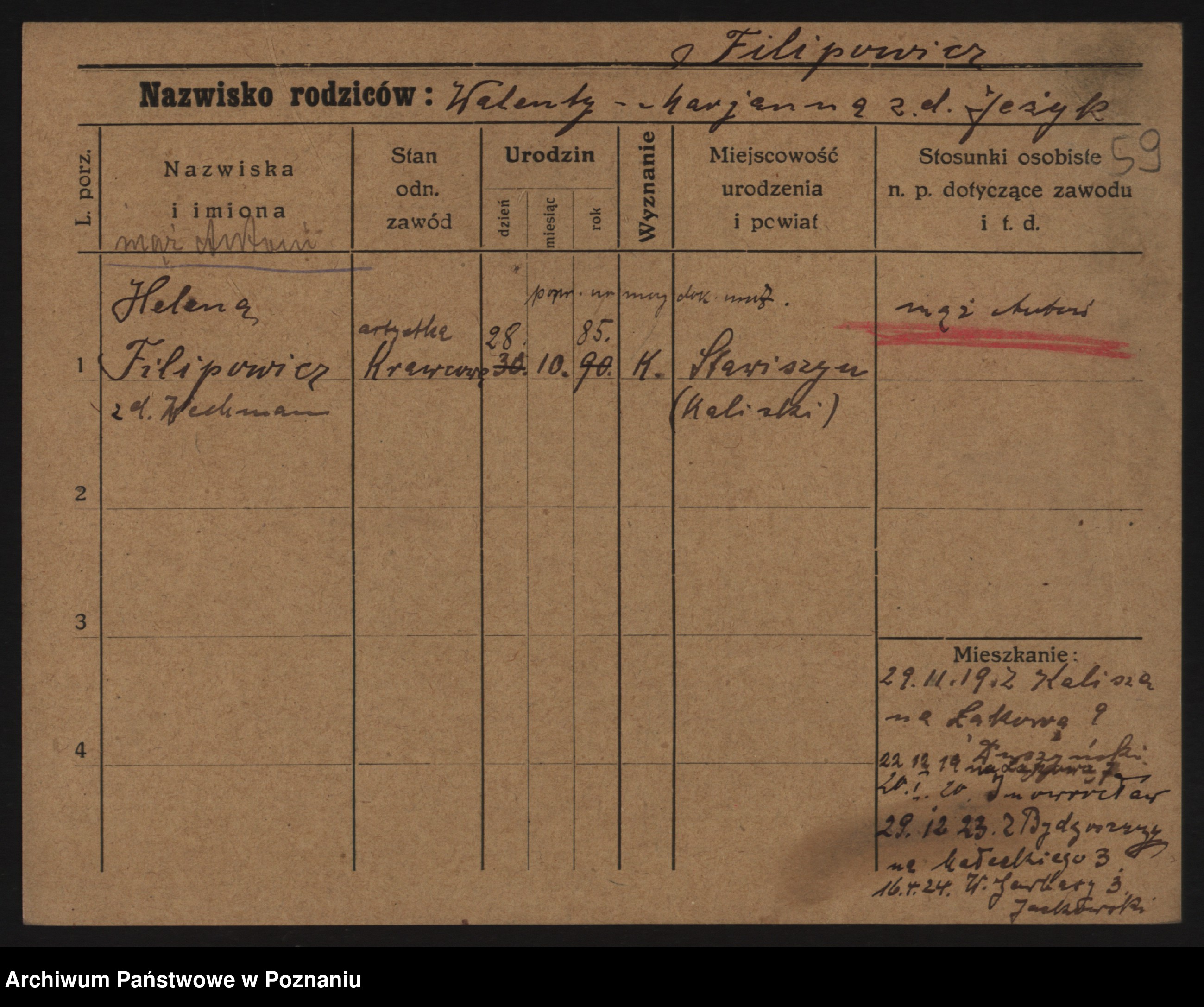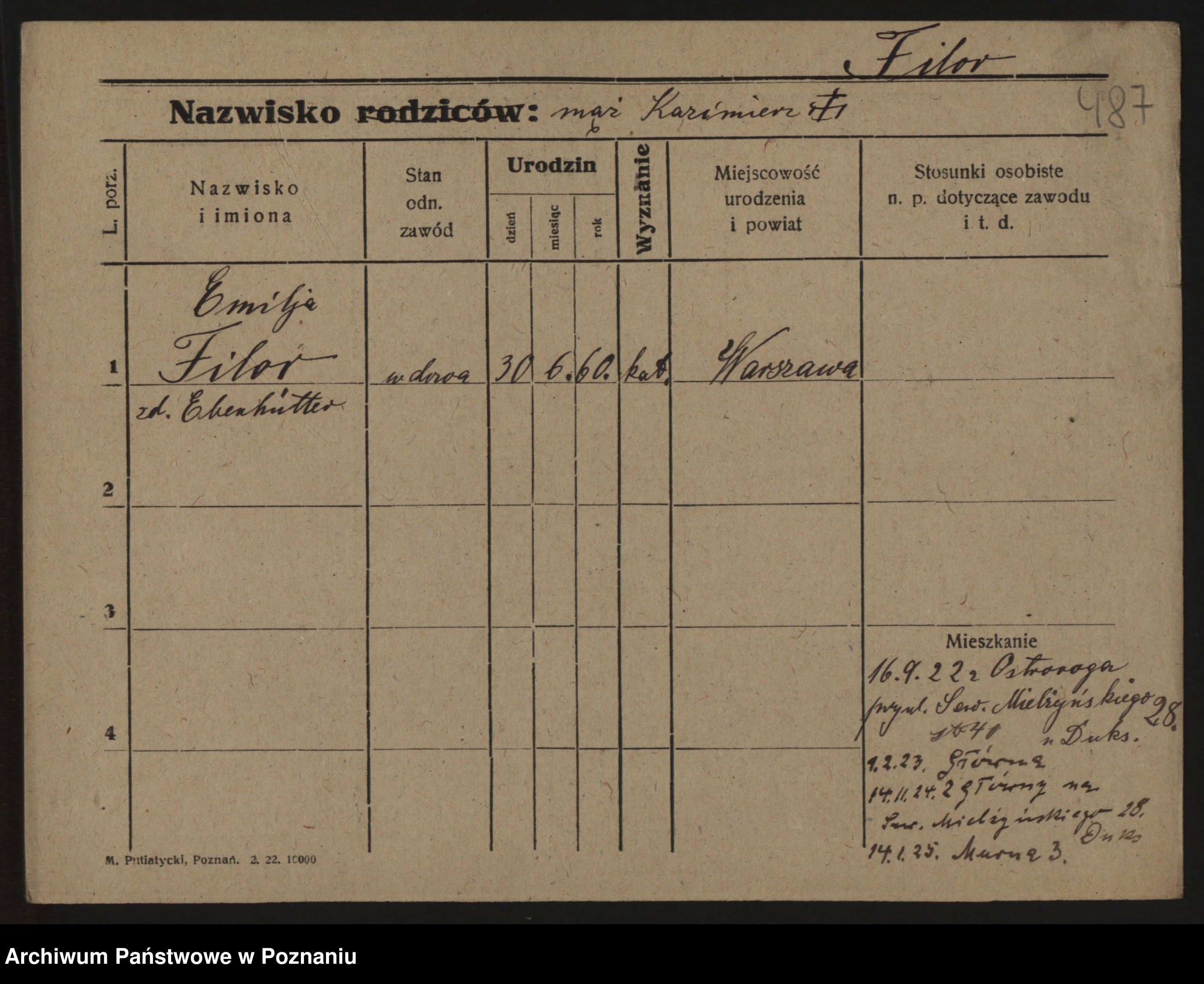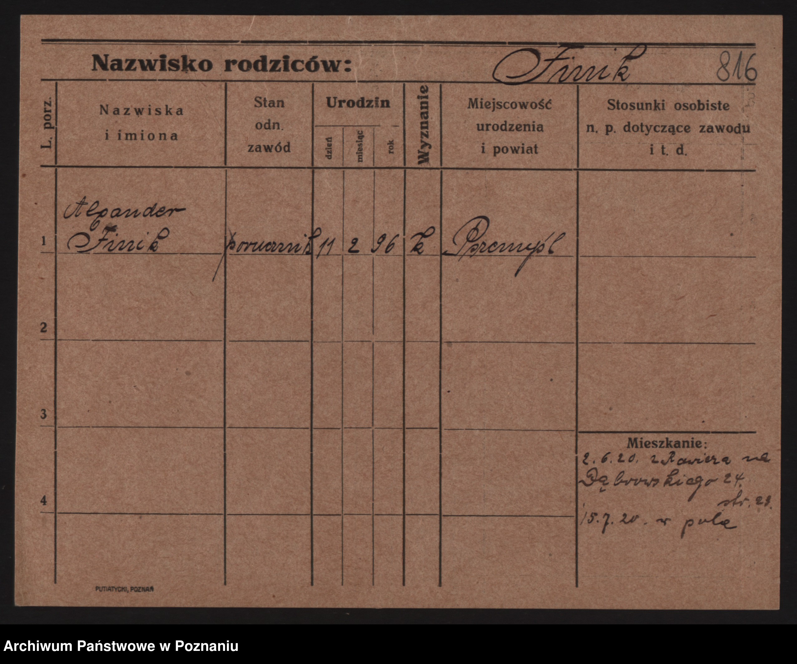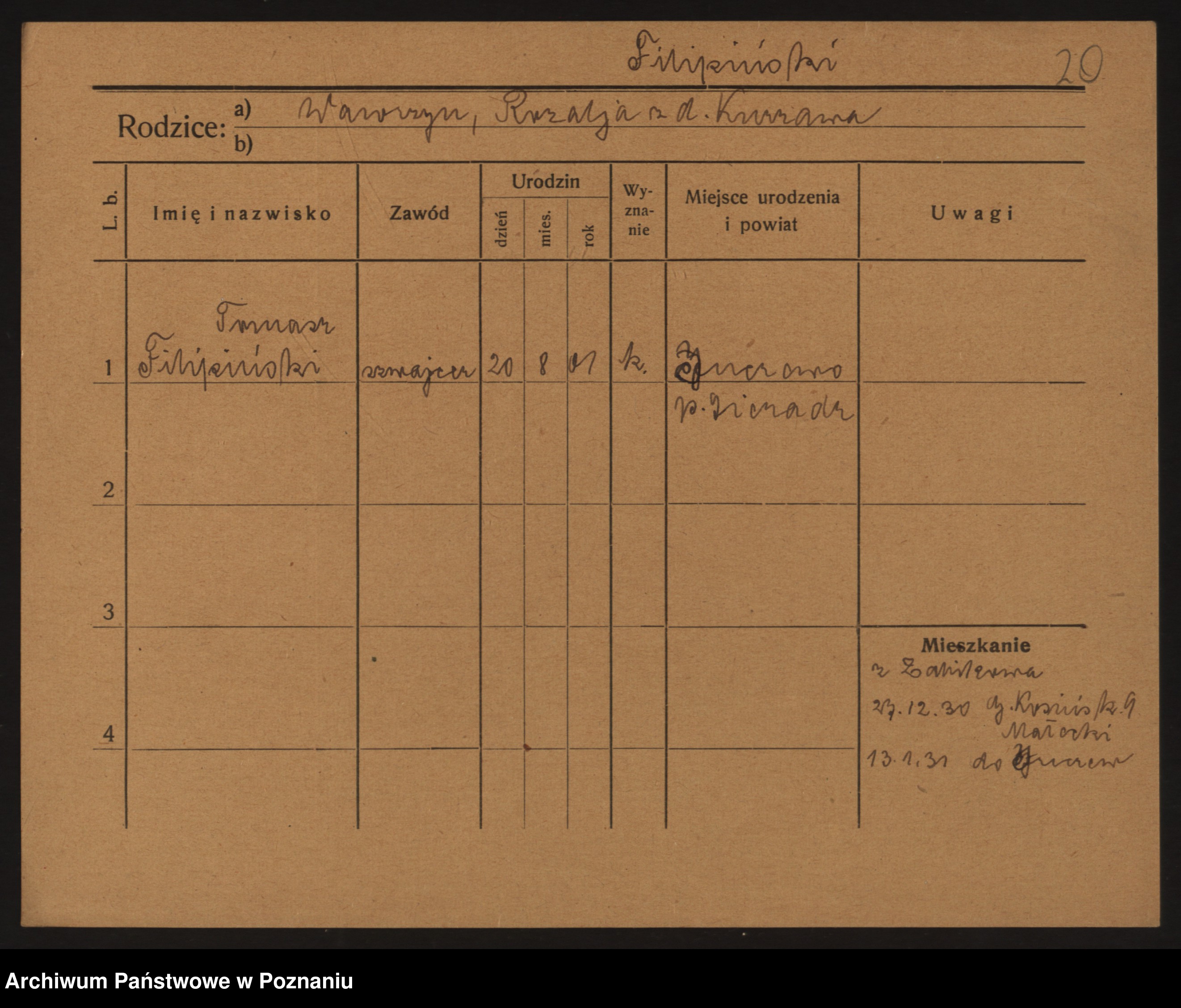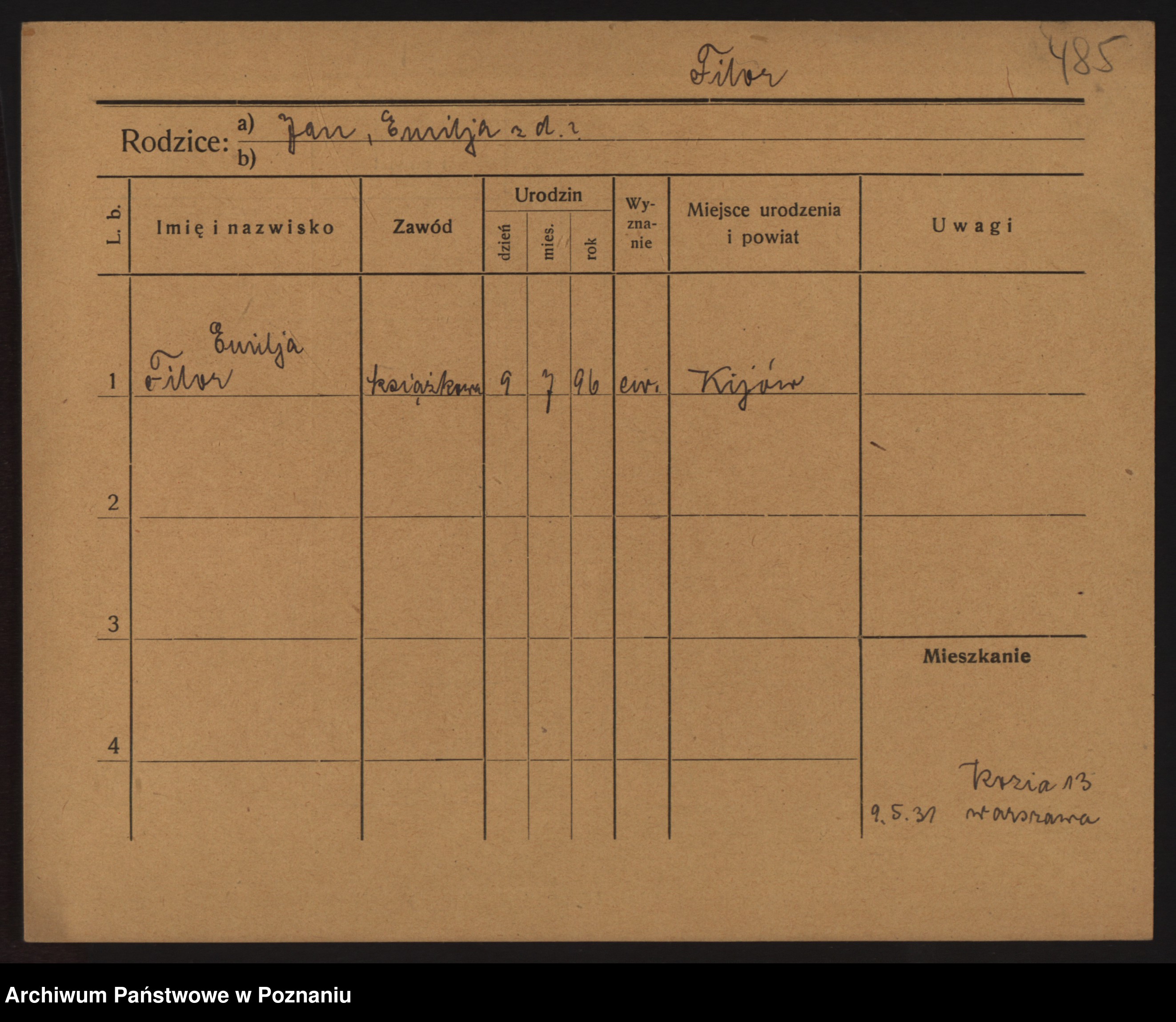 Podgląd karty osobowej dostępny jest po kliknięciu na nazwisko lub ikonkę karty. Można dokonywać powiększenia (ikony na górze) lub przechodzić między kolejnymi skanami (strzałki po bokach).