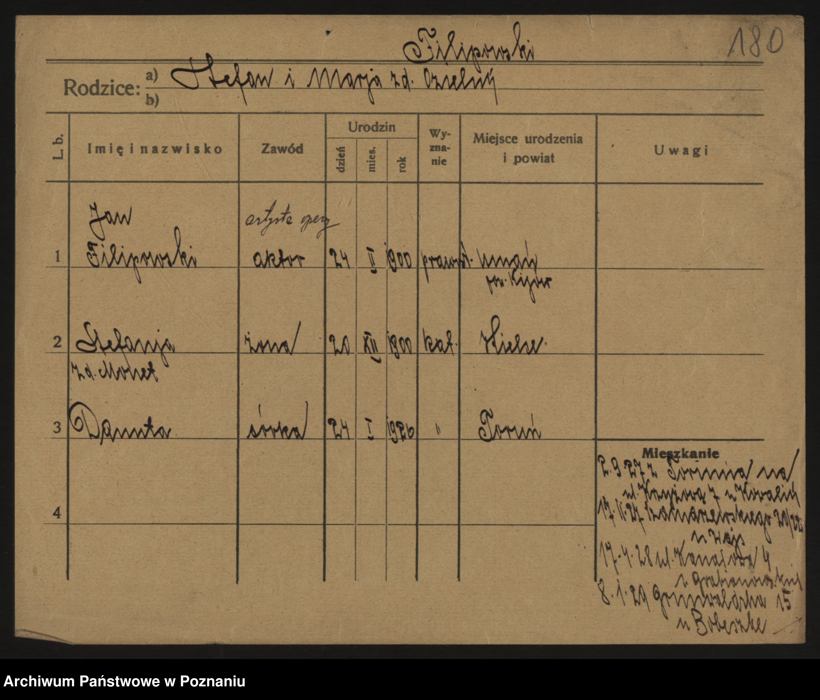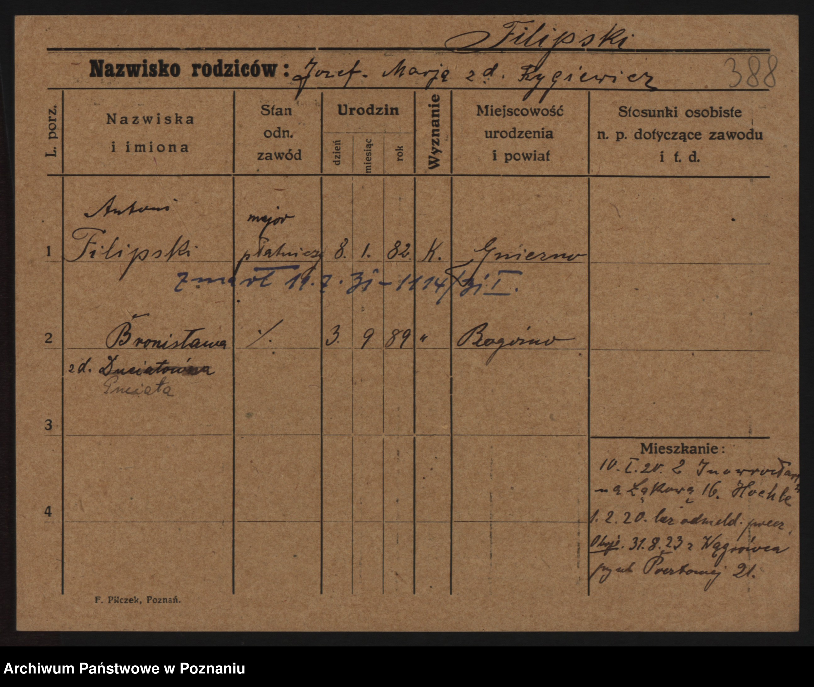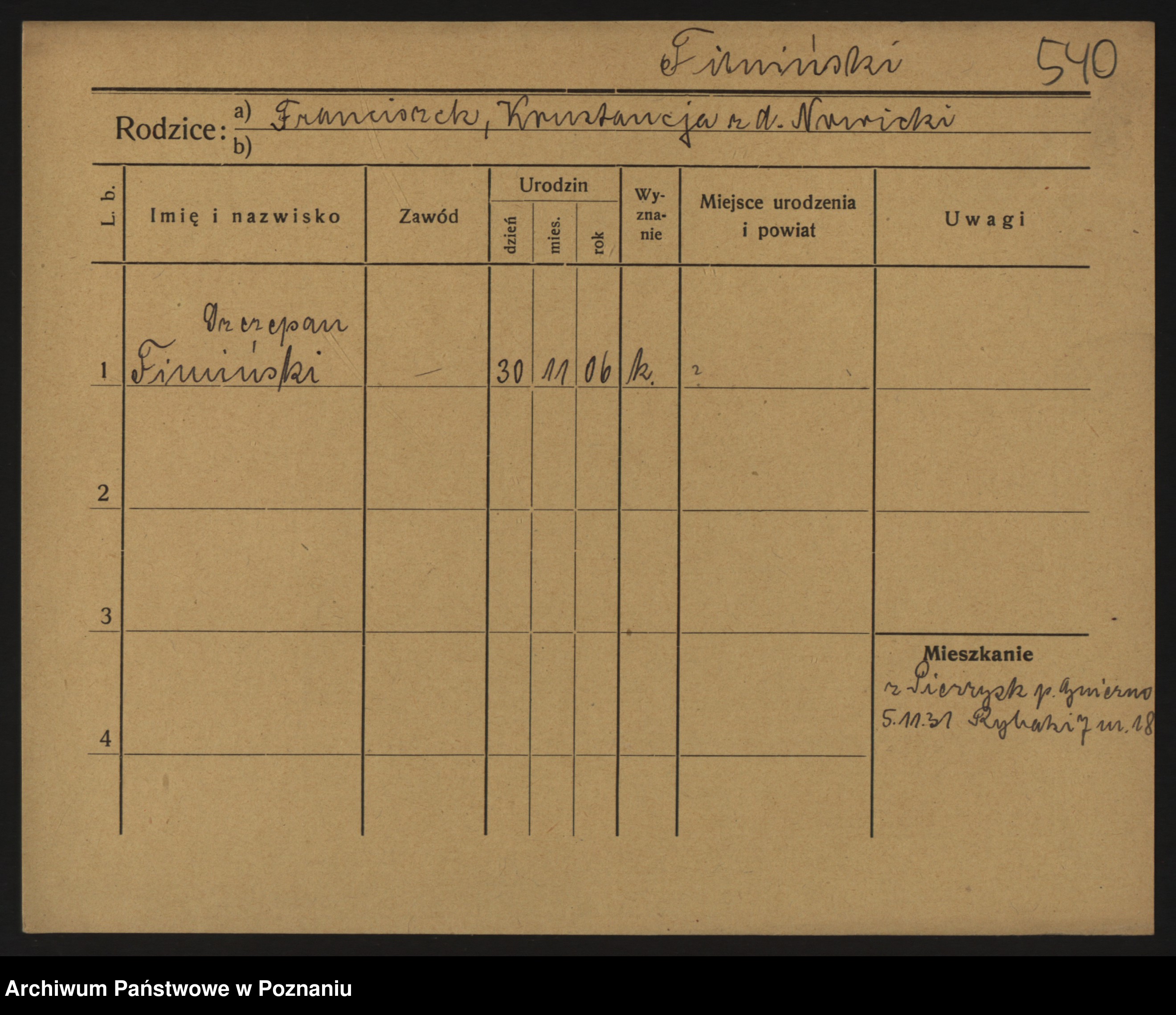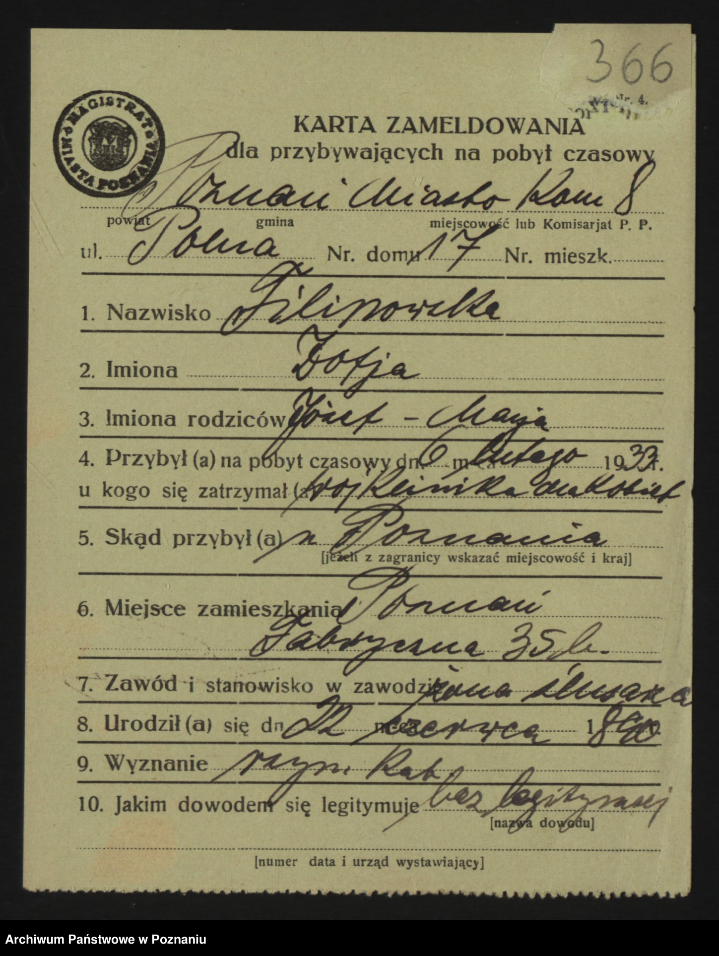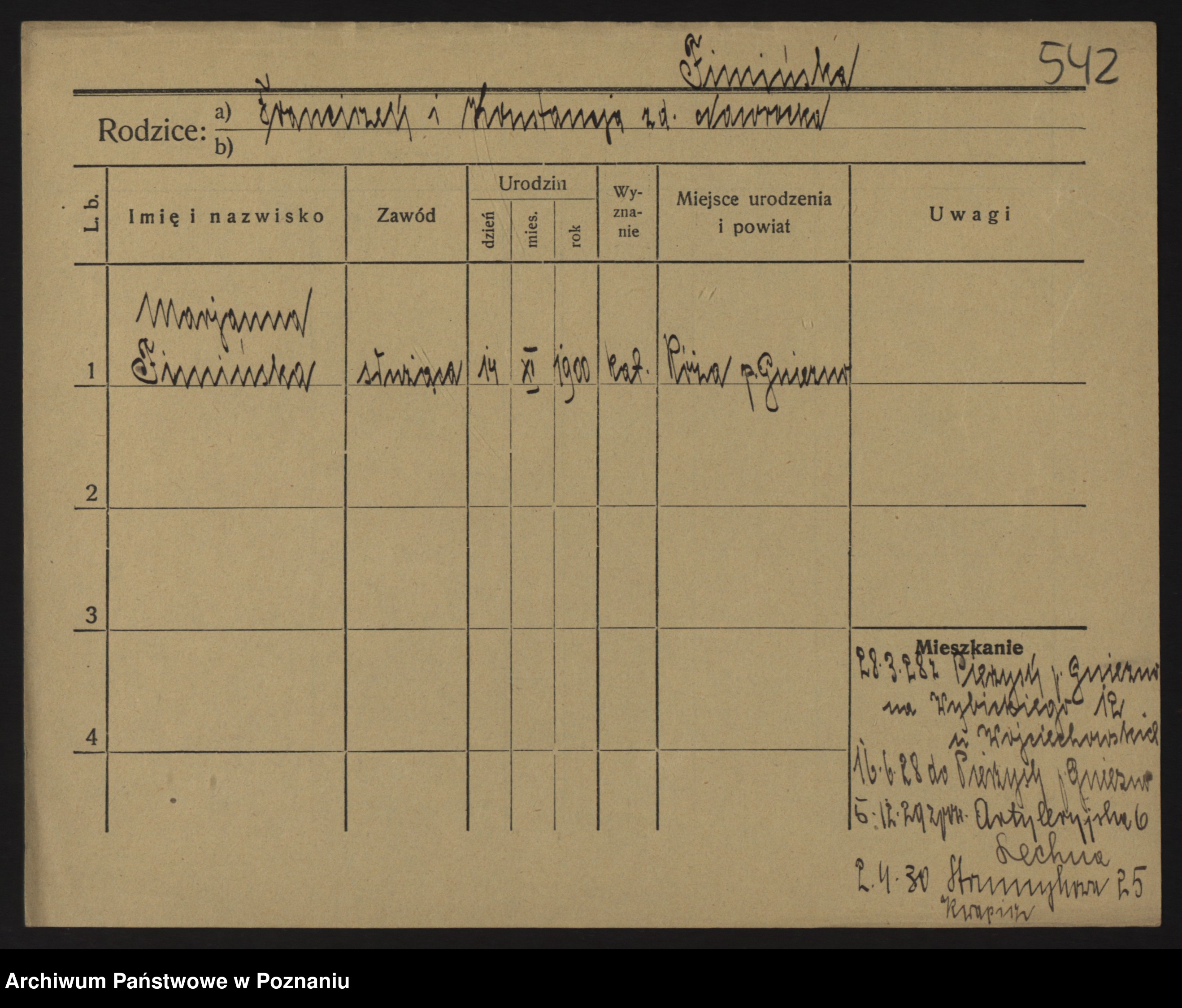 Podgląd karty osobowej dostępny jest po kliknięciu na nazwisko lub ikonkę karty. Można dokonywać powiększenia (ikony na górze) lub przechodzić między kolejnymi skanami (strzałki po bokach).