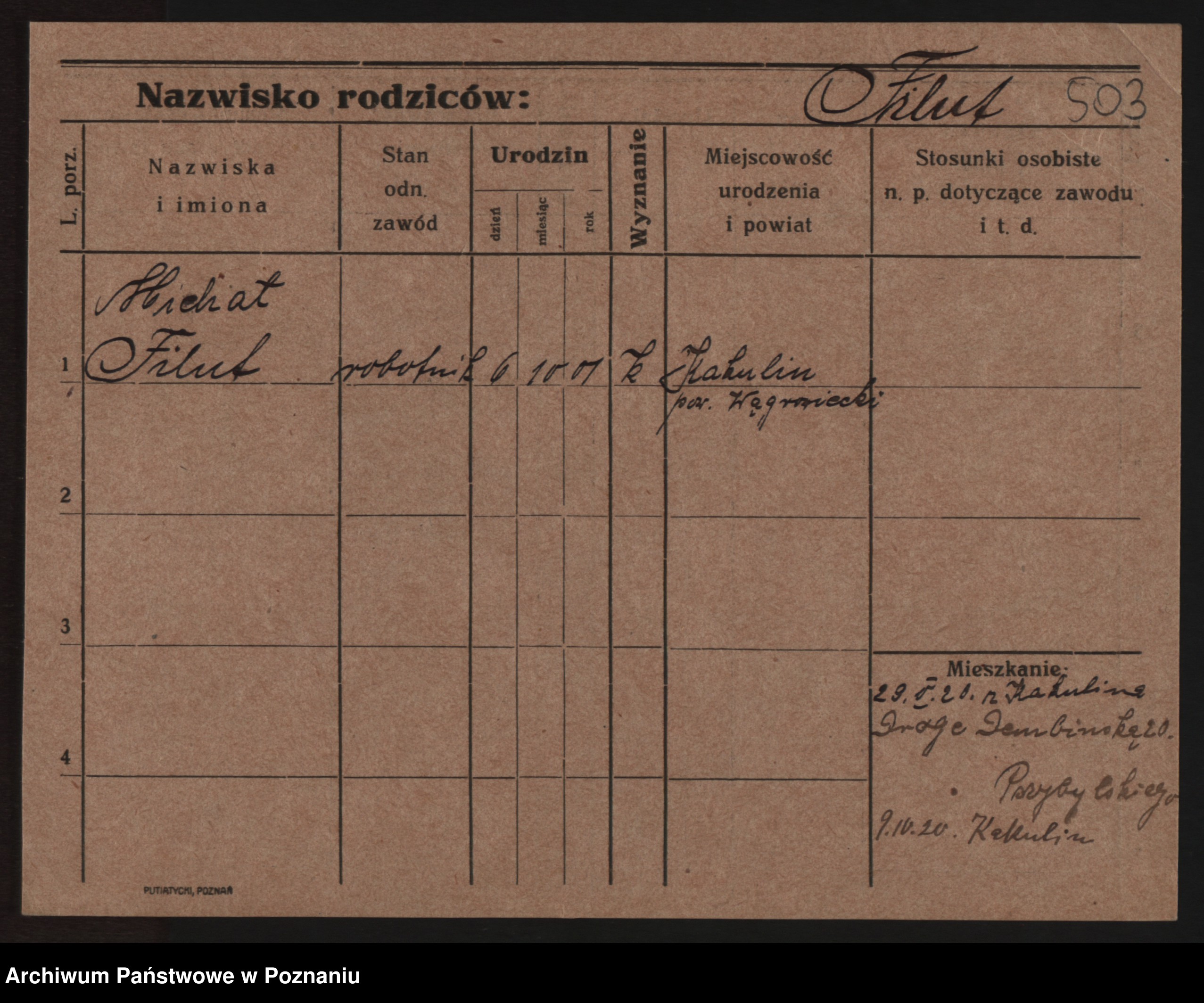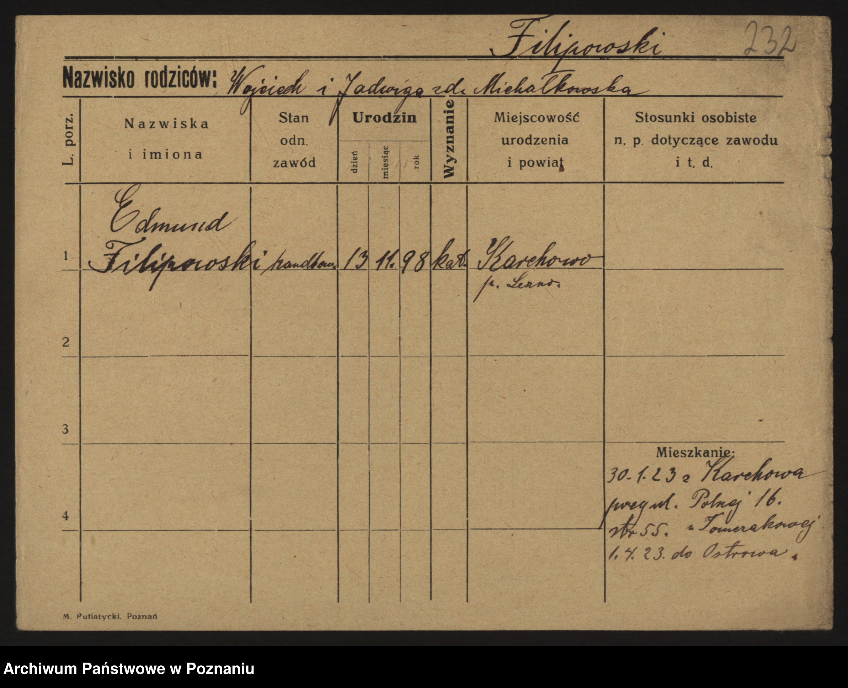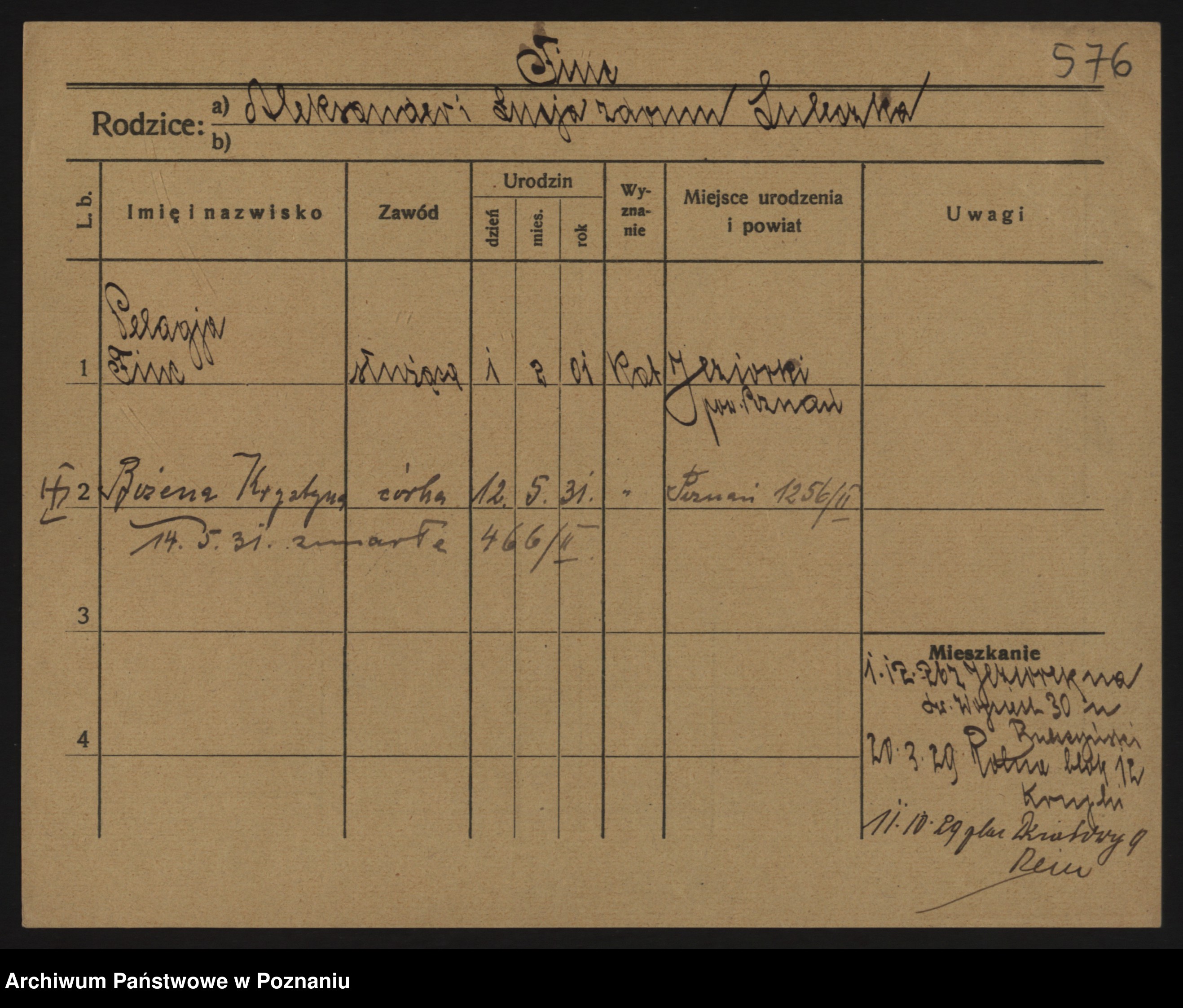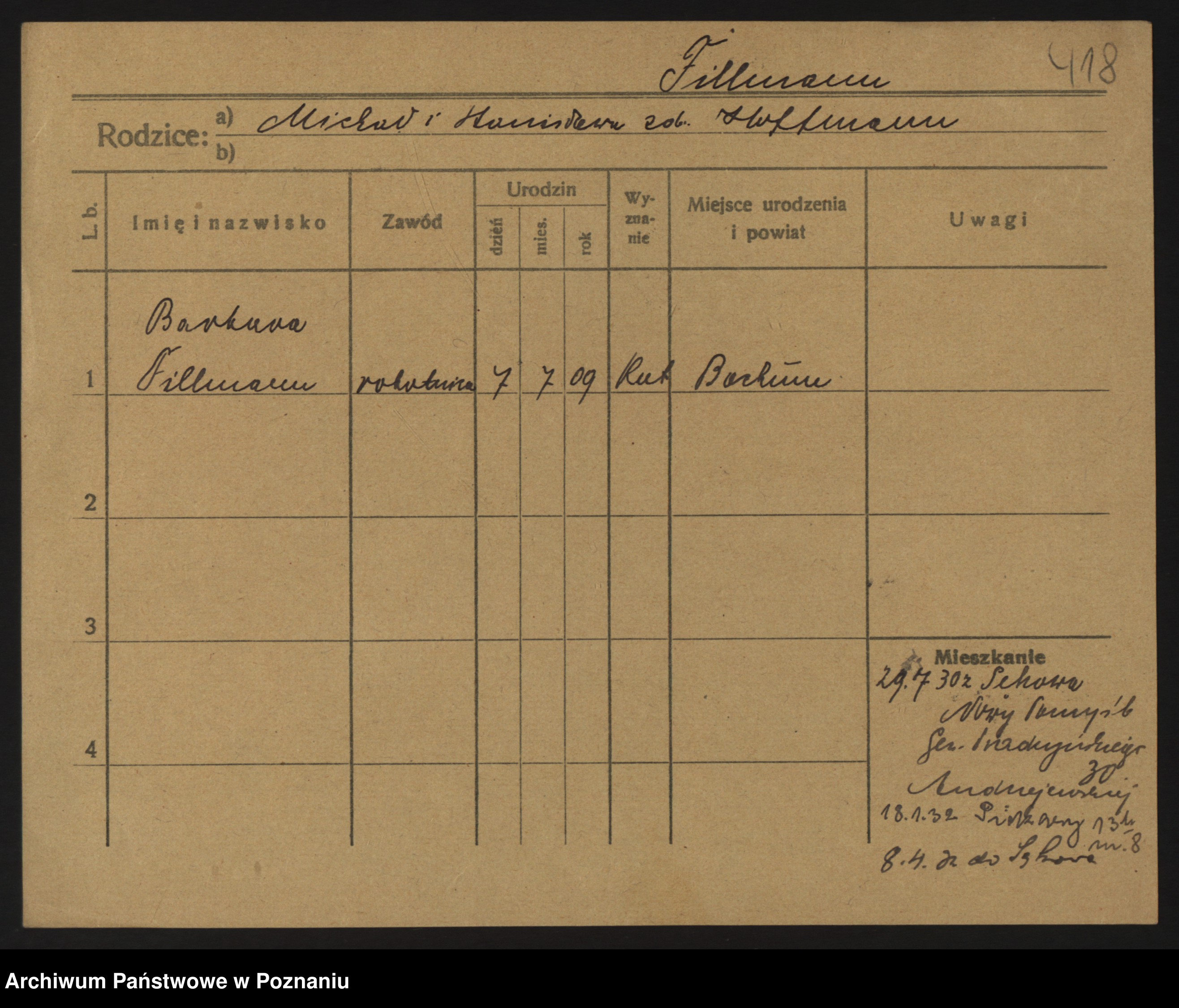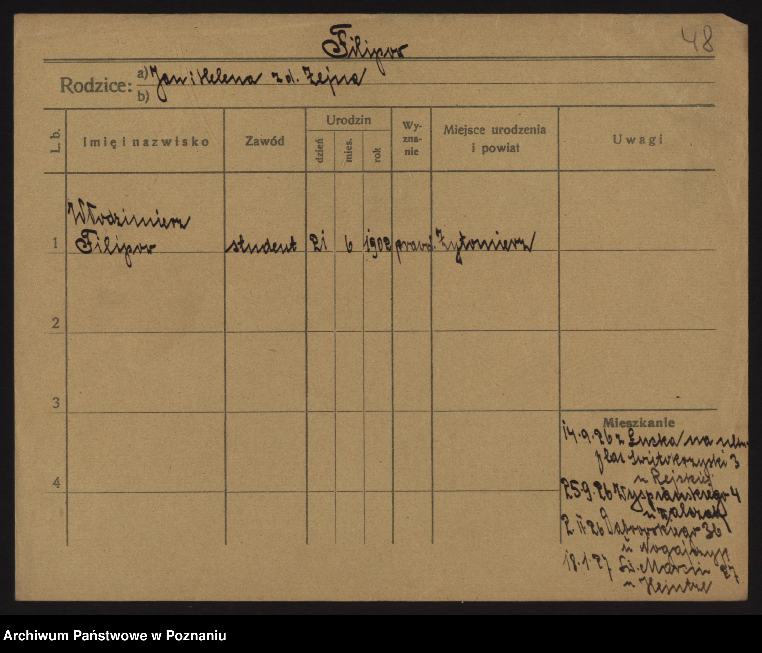 Podgląd karty osobowej dostępny jest po kliknięciu na nazwisko lub ikonkę karty. Można dokonywać powiększenia (ikony na górze) lub przechodzić między kolejnymi skanami (strzałki po bokach).