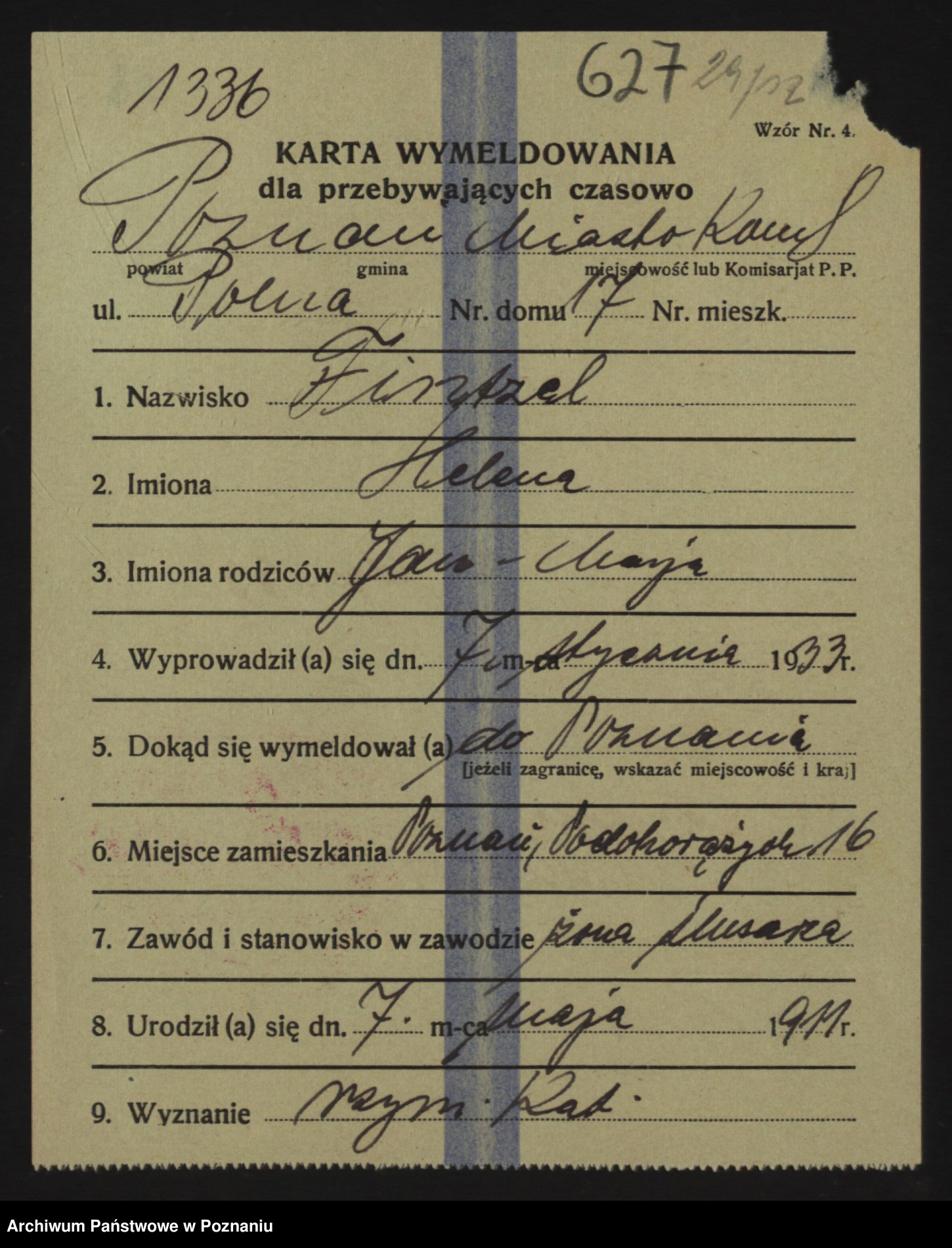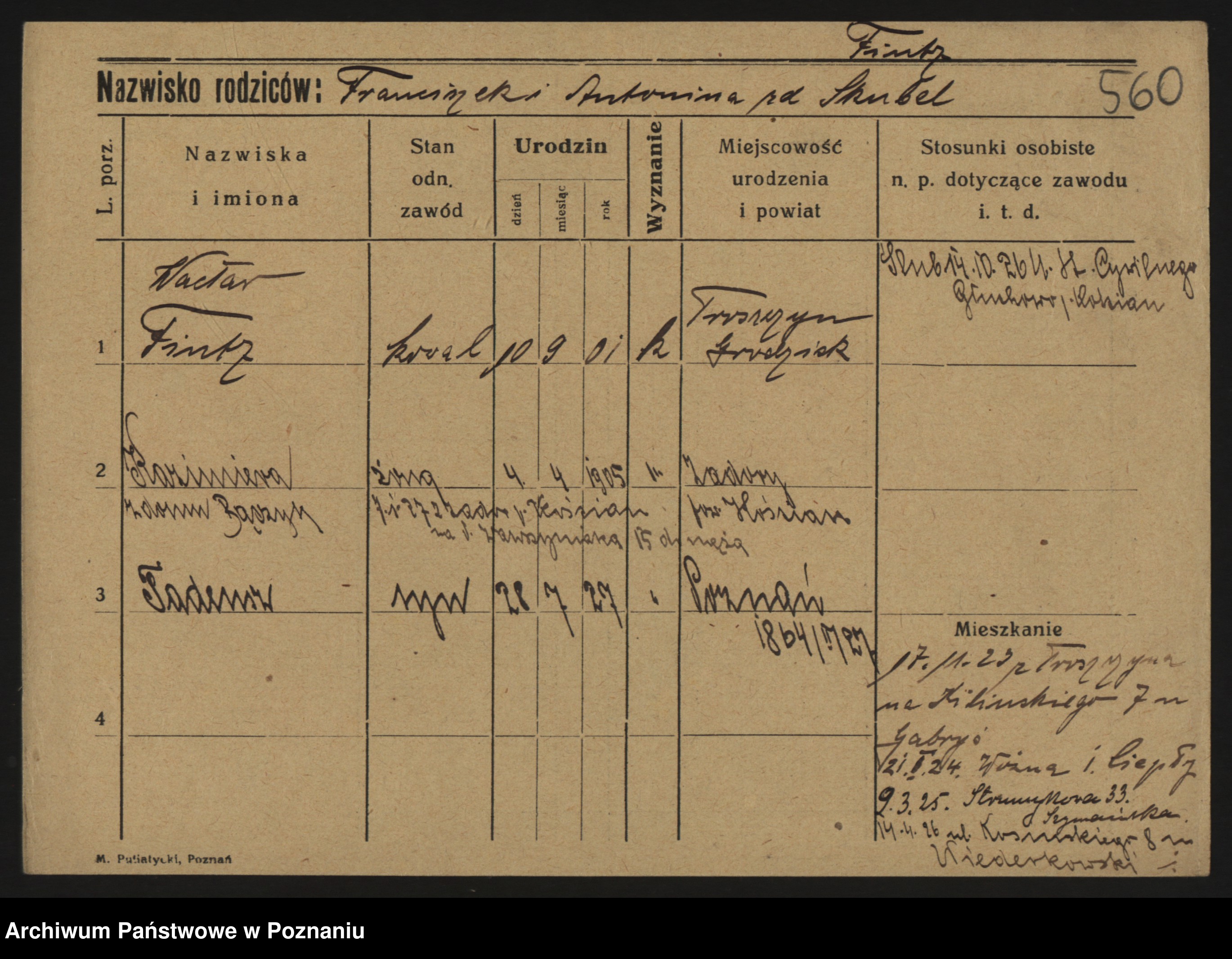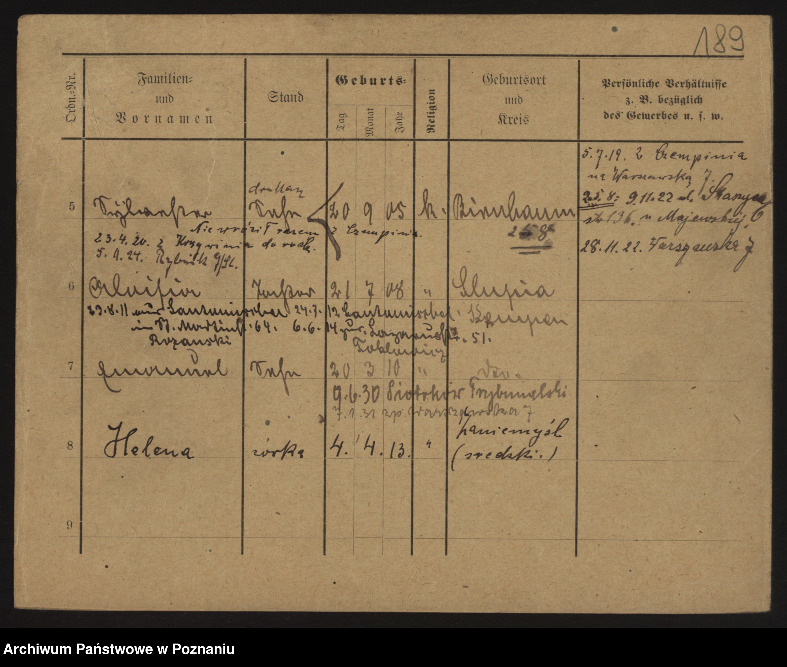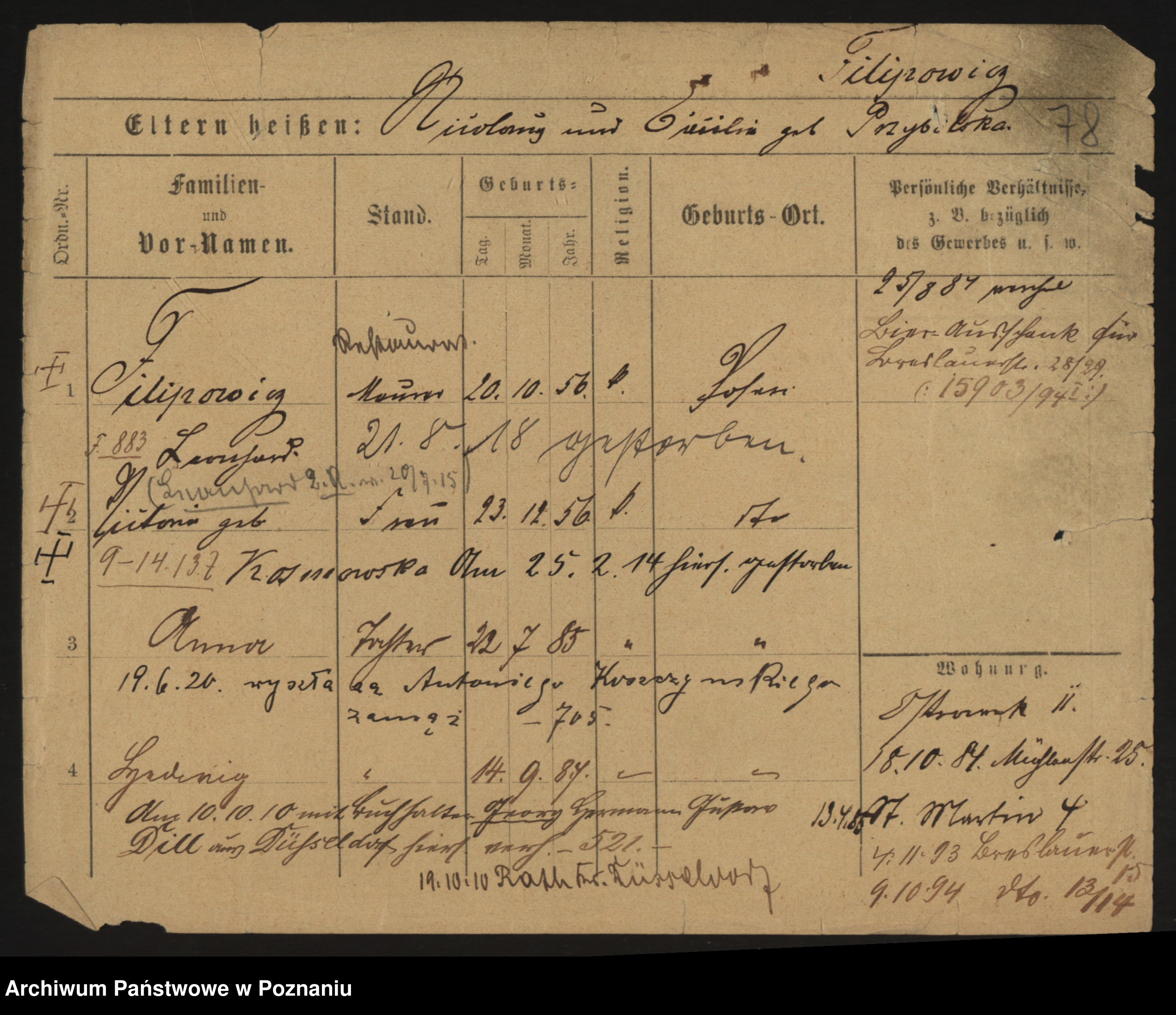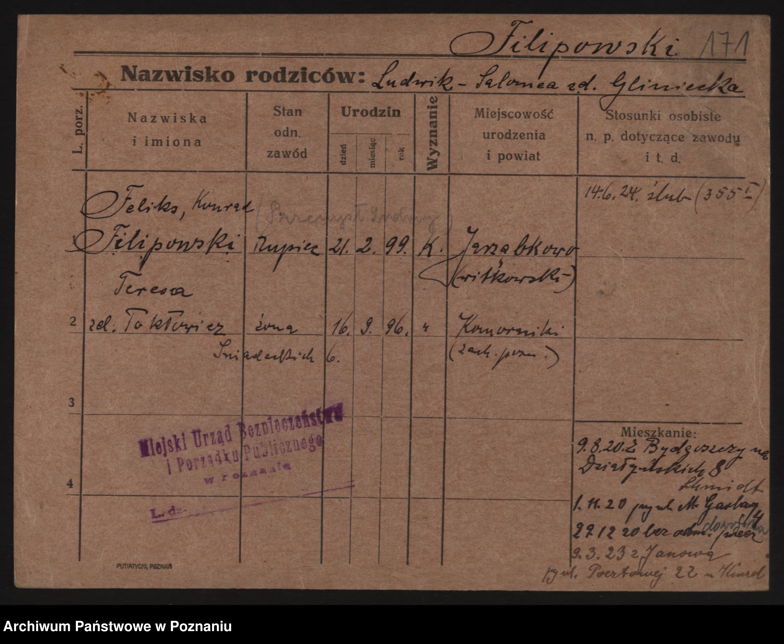 Podgląd karty osobowej dostępny jest po kliknięciu na nazwisko lub ikonkę karty. Można dokonywać powiększenia (ikony na górze) lub przechodzić między kolejnymi skanami (strzałki po bokach).