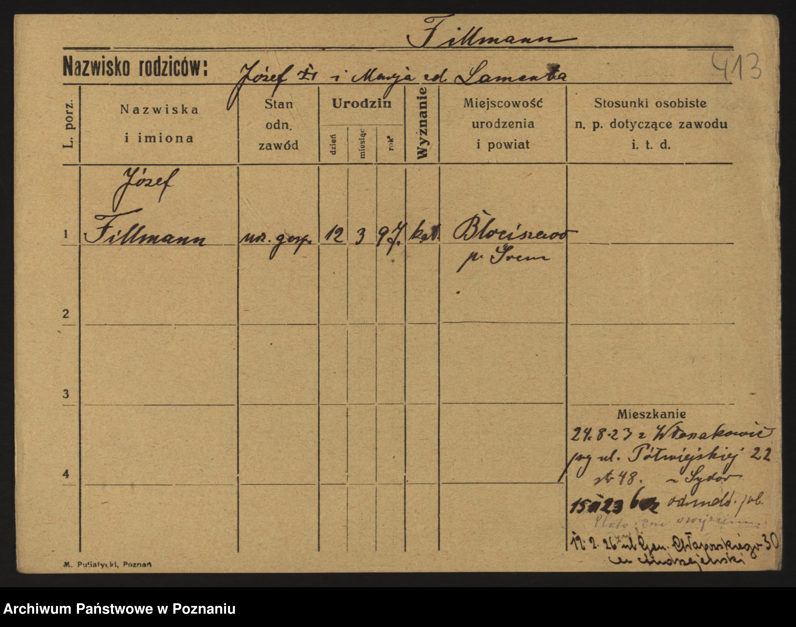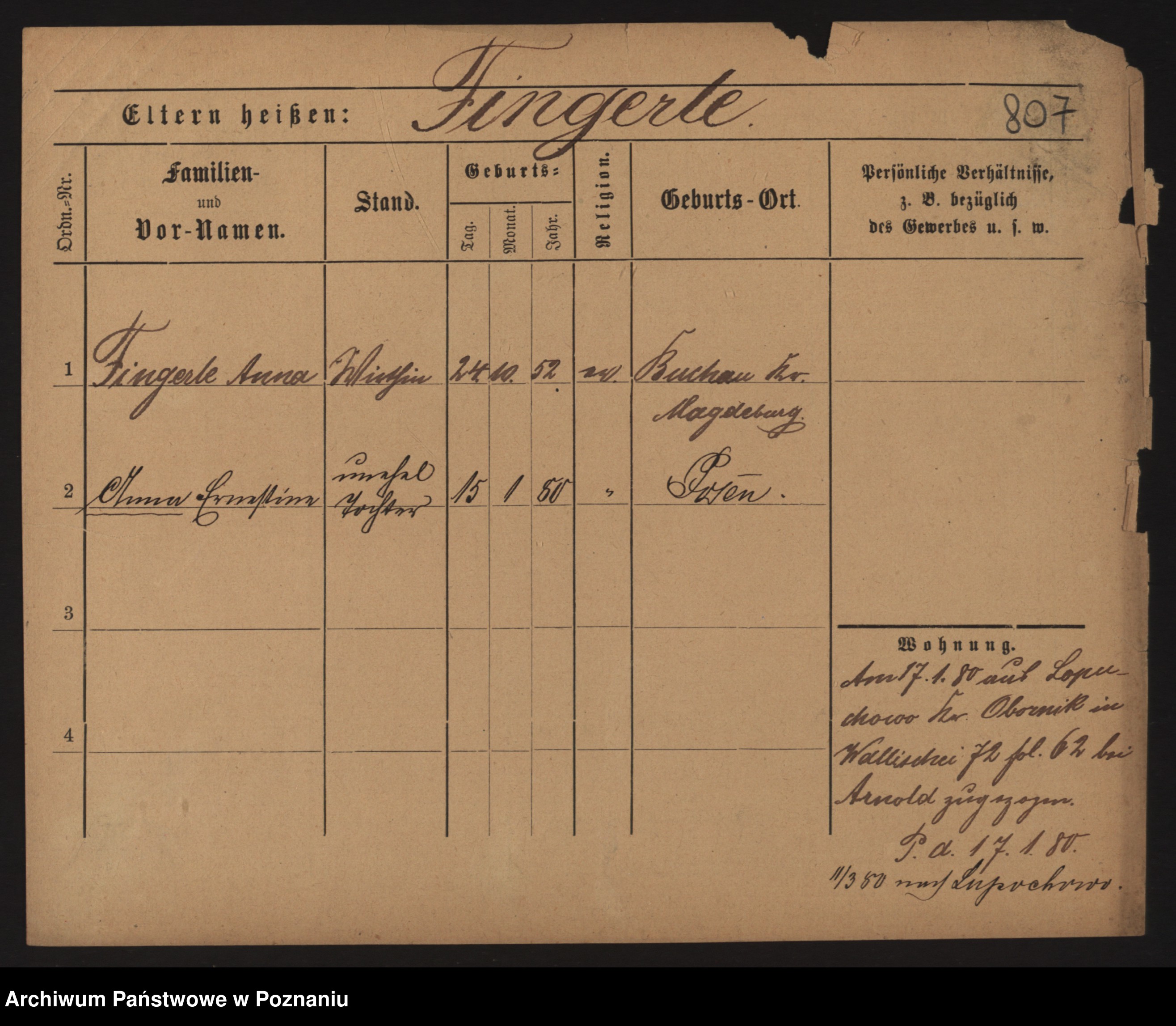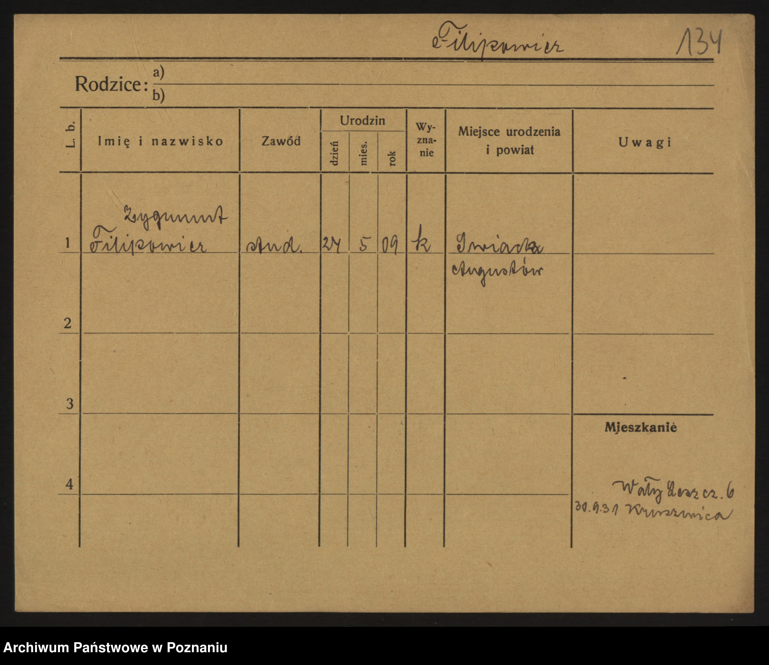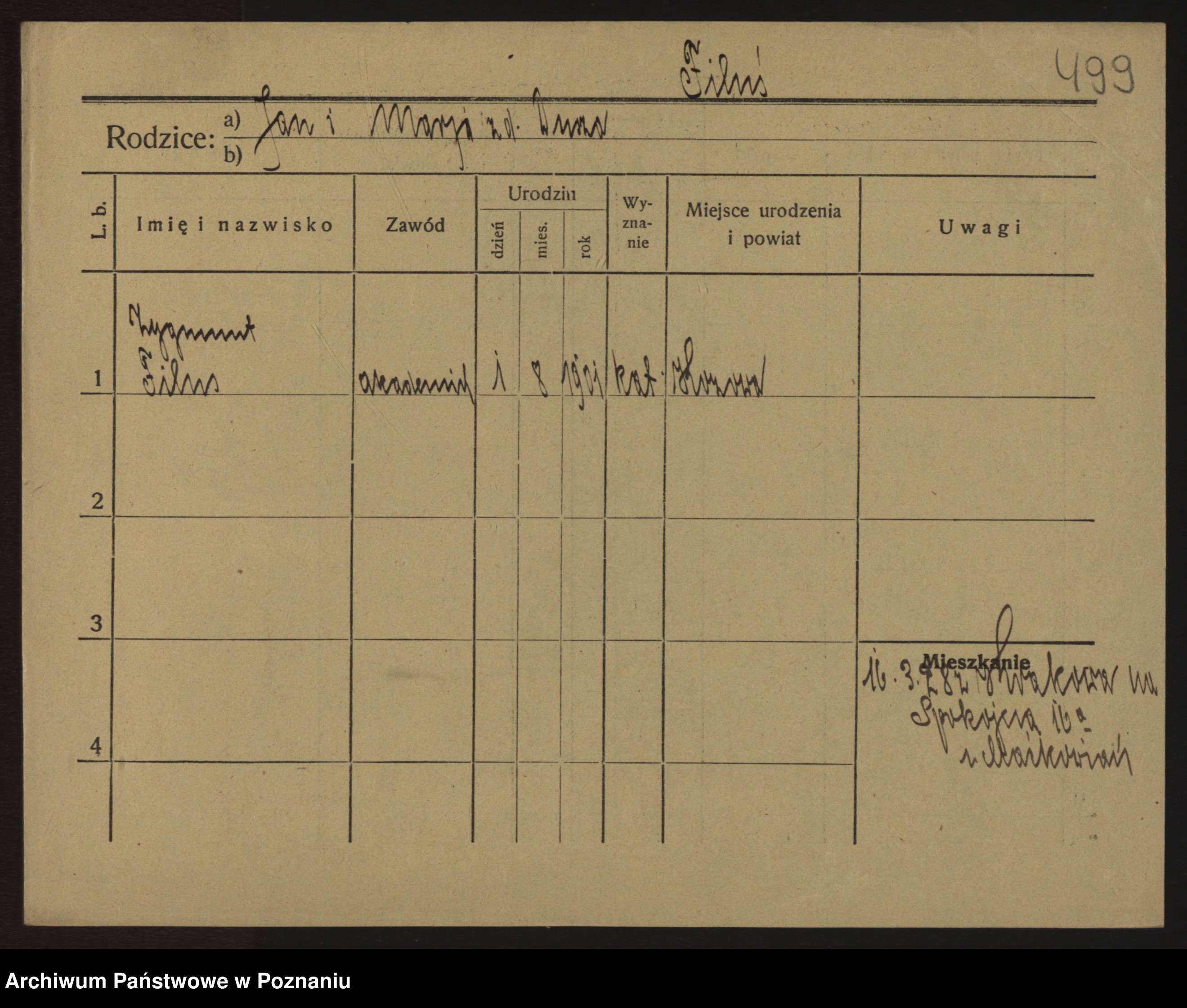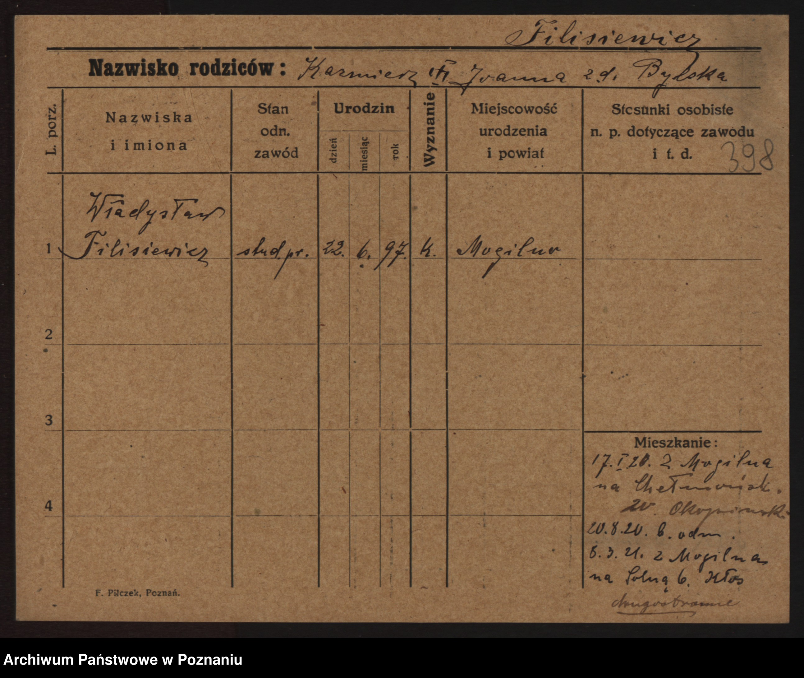 Podgląd karty osobowej dostępny jest po kliknięciu na nazwisko lub ikonkę karty. Można dokonywać powiększenia (ikony na górze) lub przechodzić między kolejnymi skanami (strzałki po bokach).