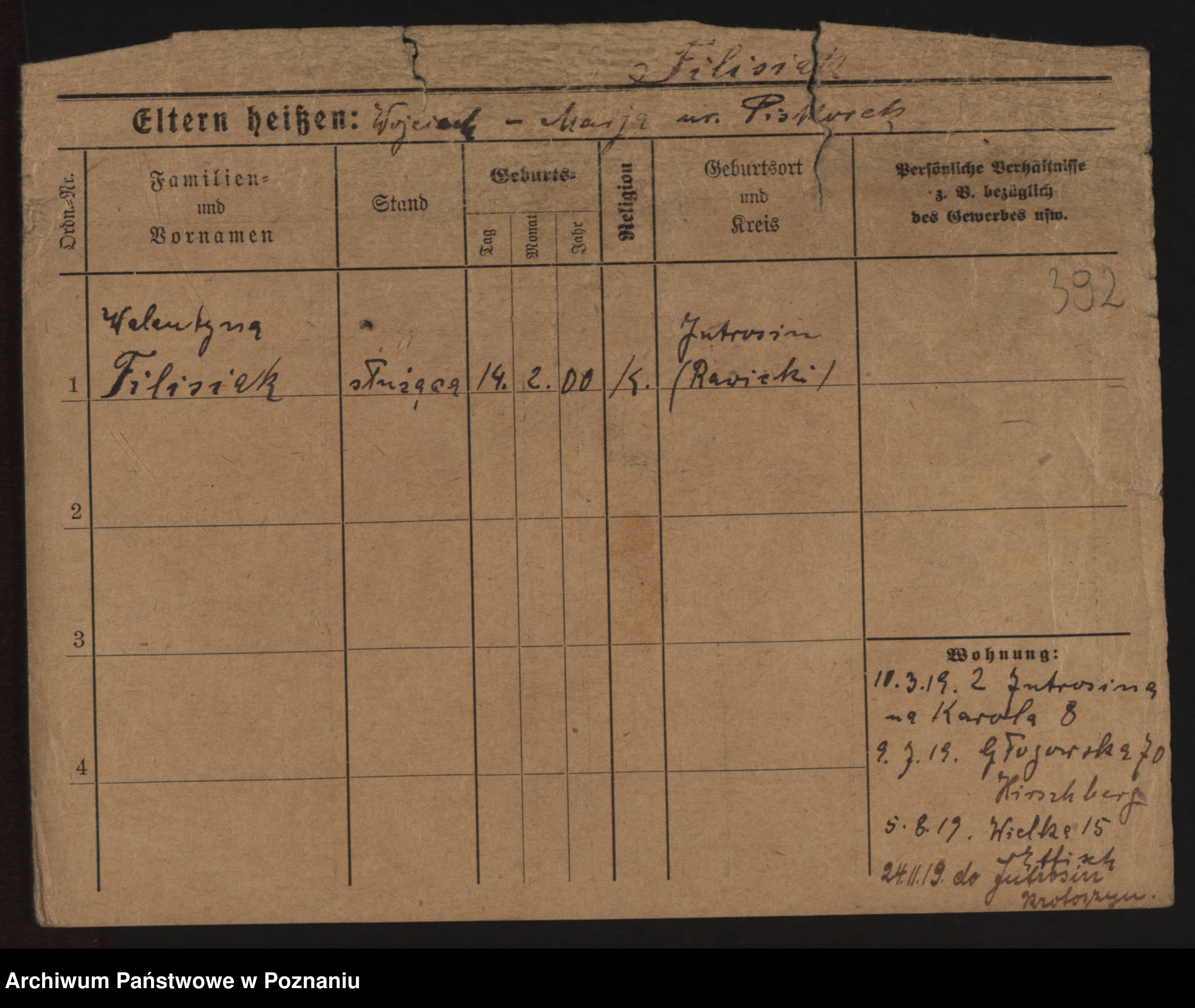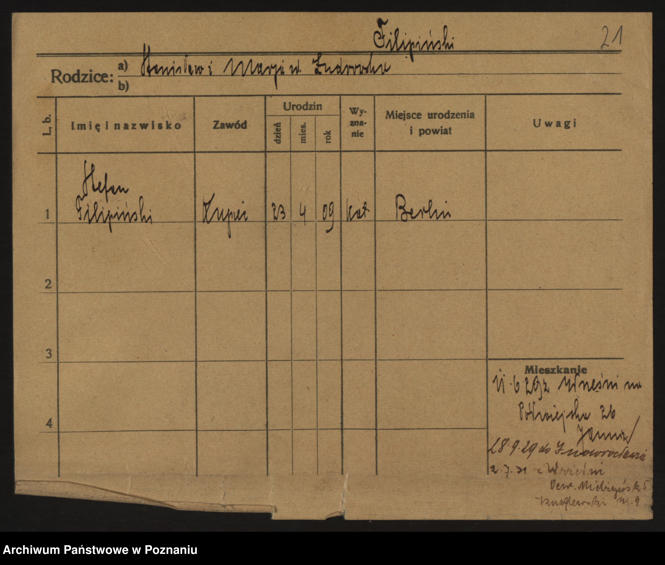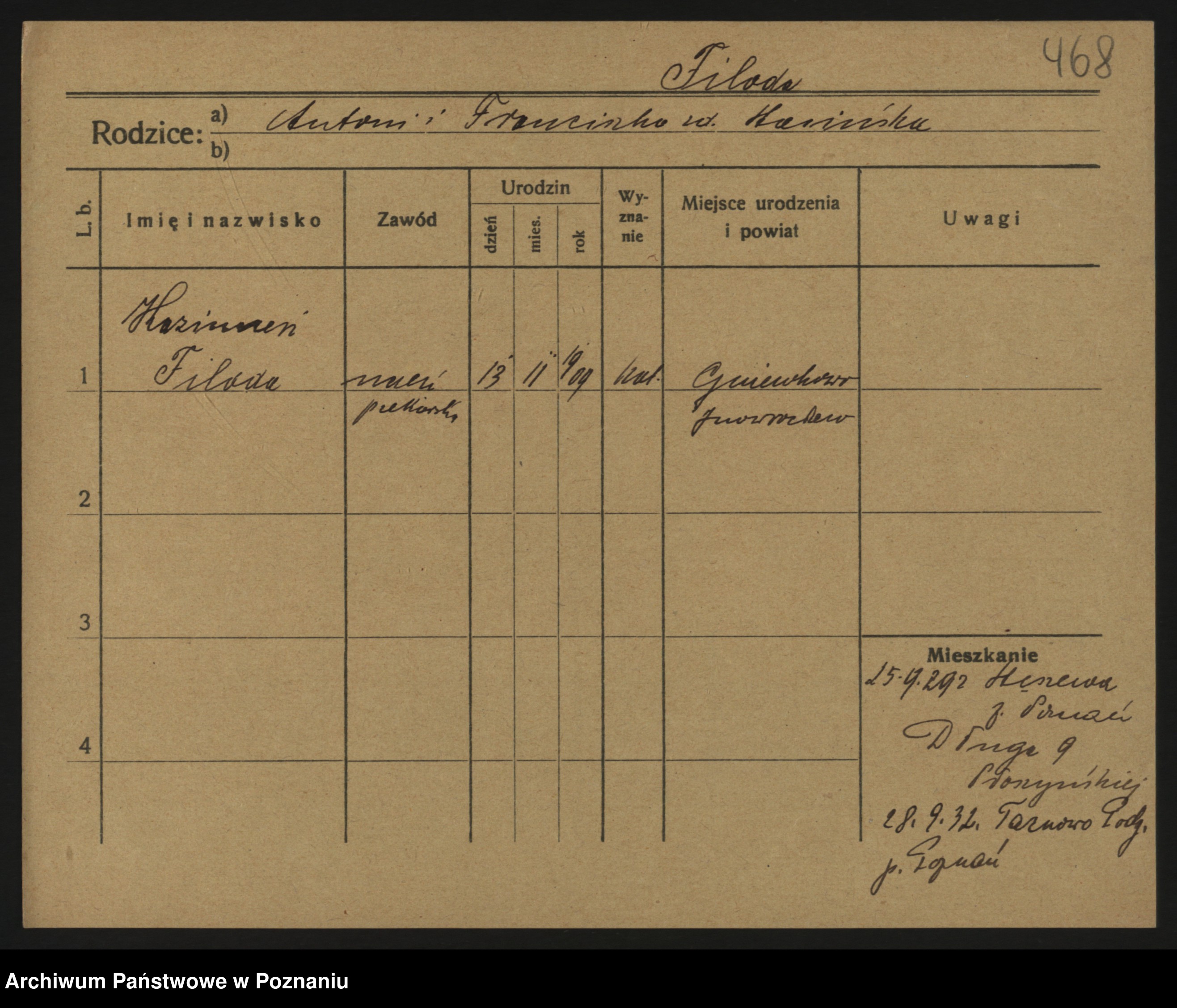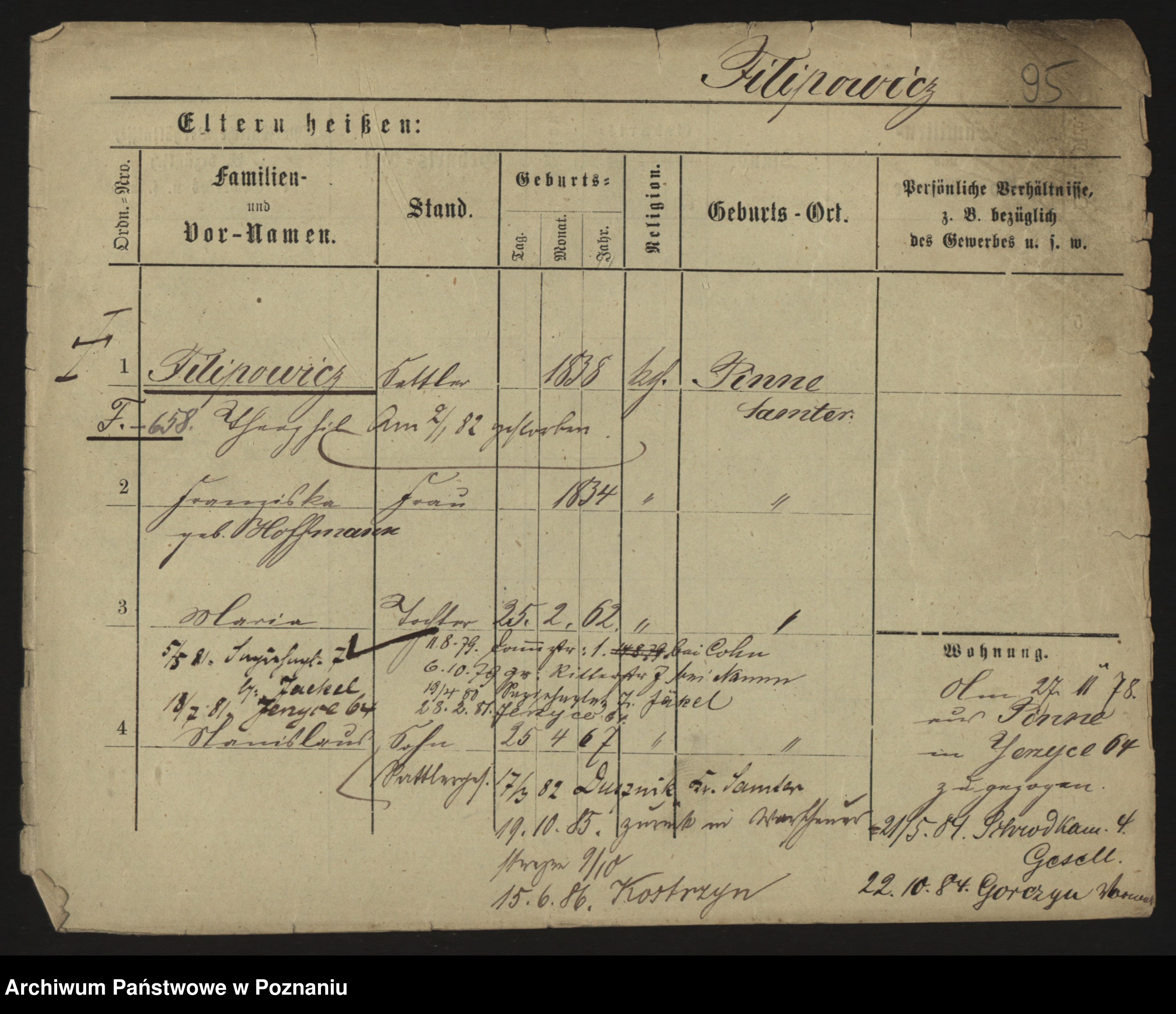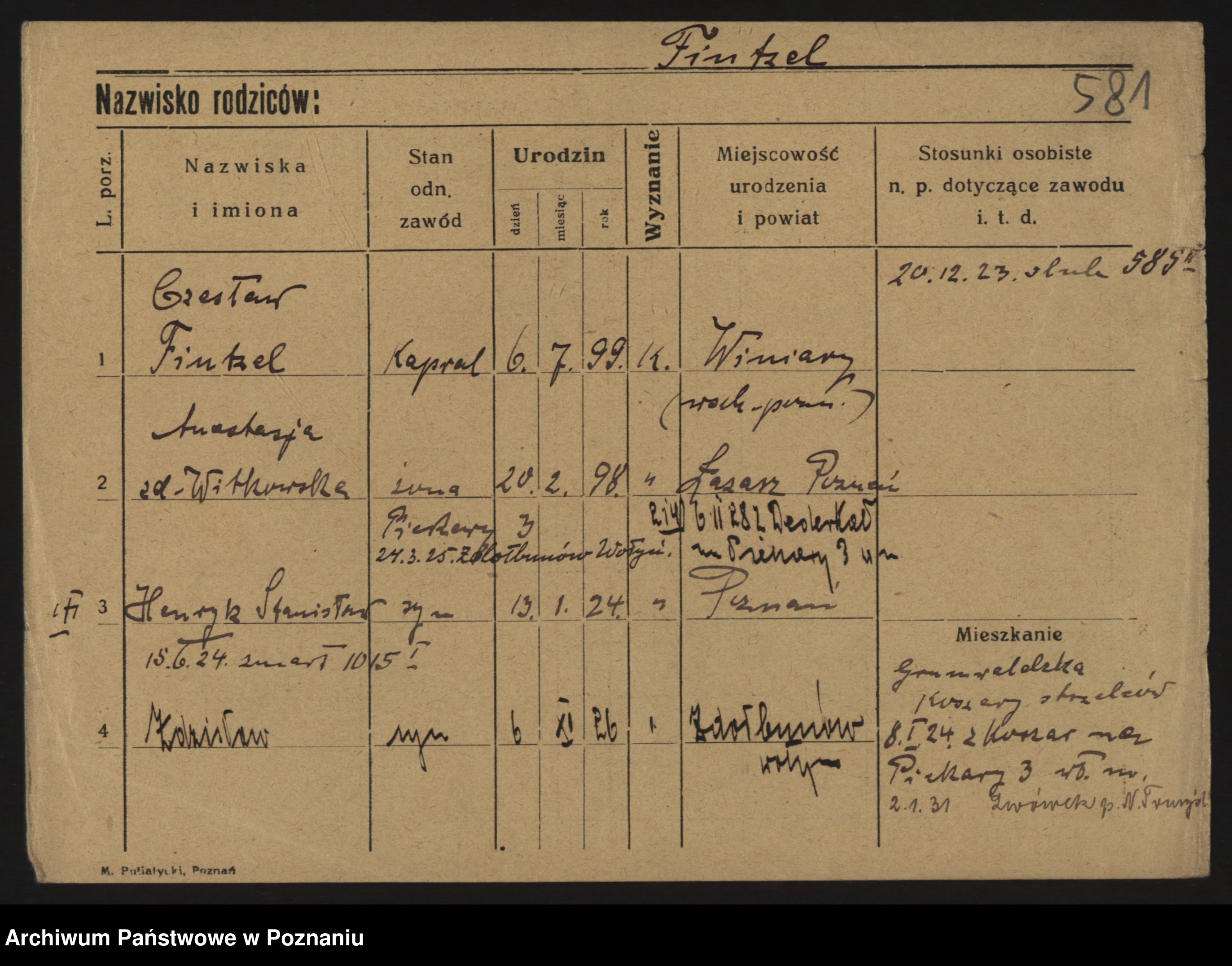Podgląd karty osobowej dostępny jest po kliknięciu na nazwisko lub ikonkę karty. Można dokonywać powiększenia (ikony na górze) lub przechodzić między kolejnymi skanami (strzałki po bokach).