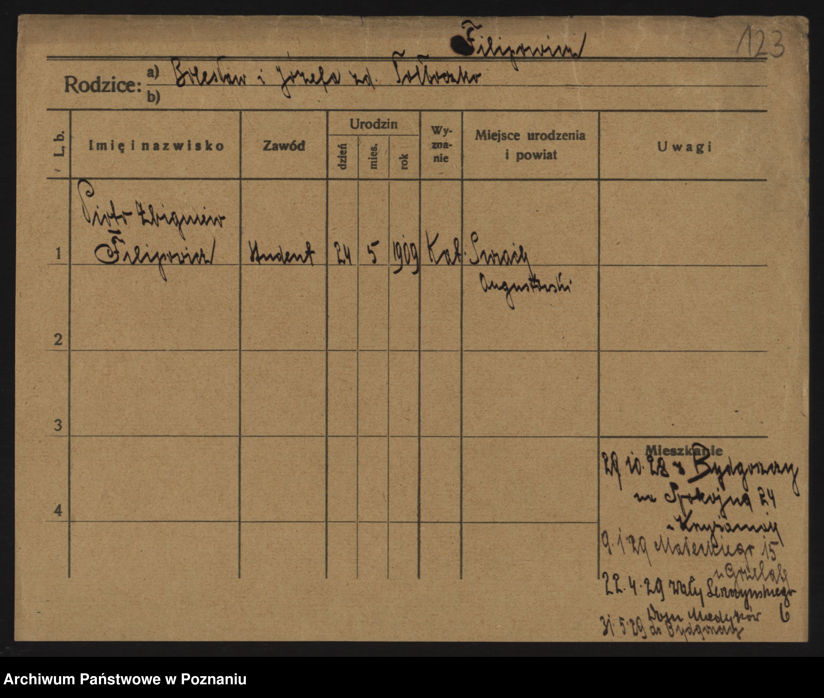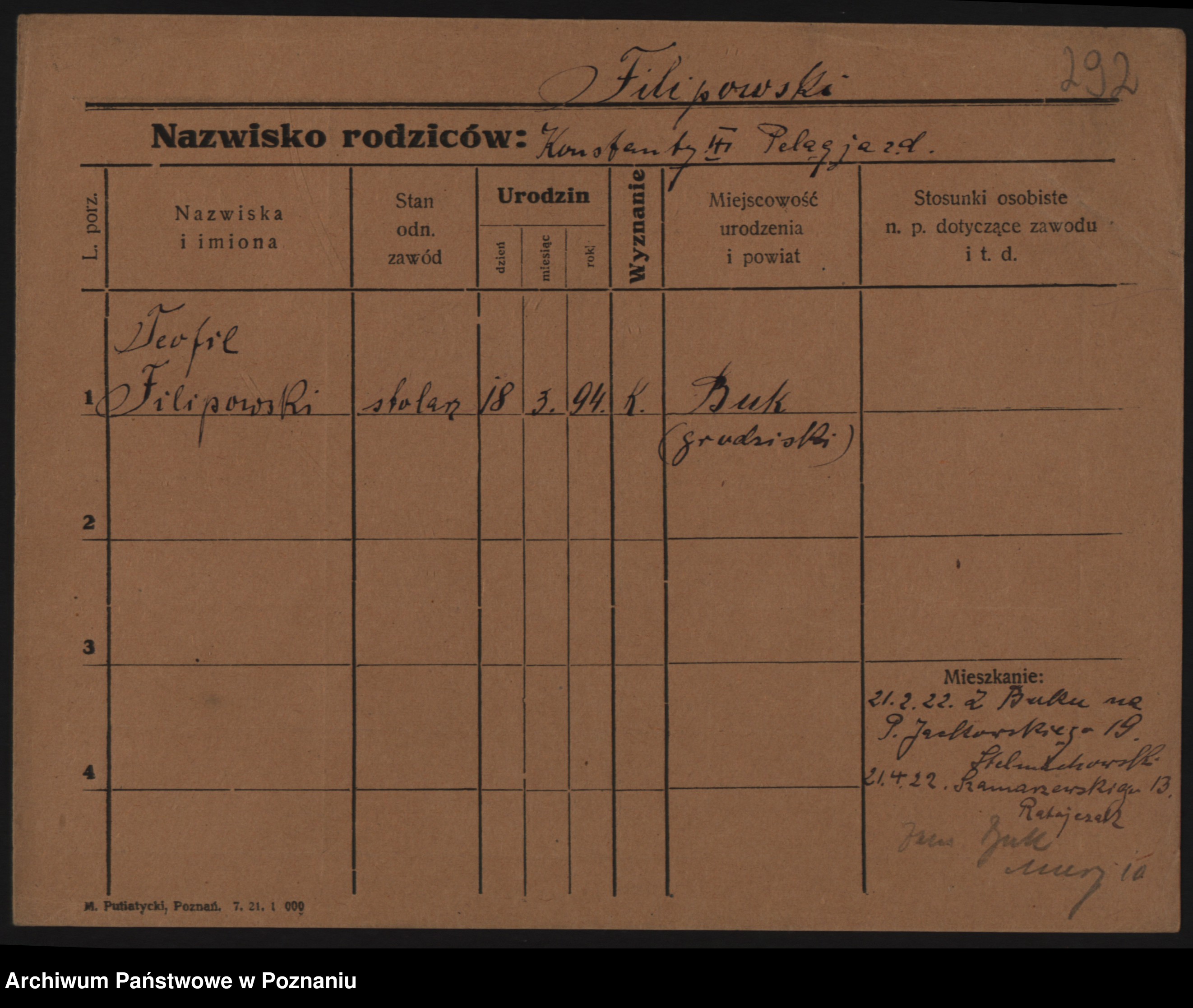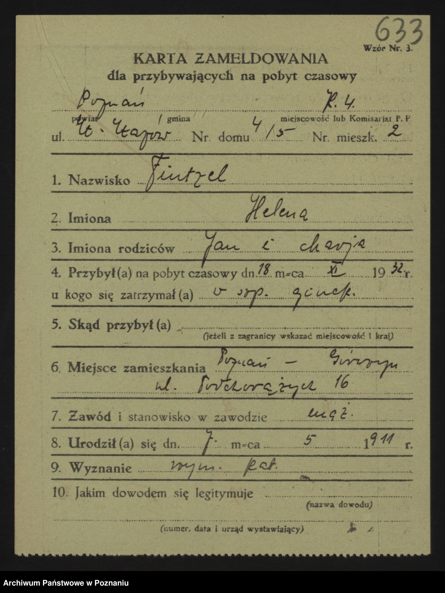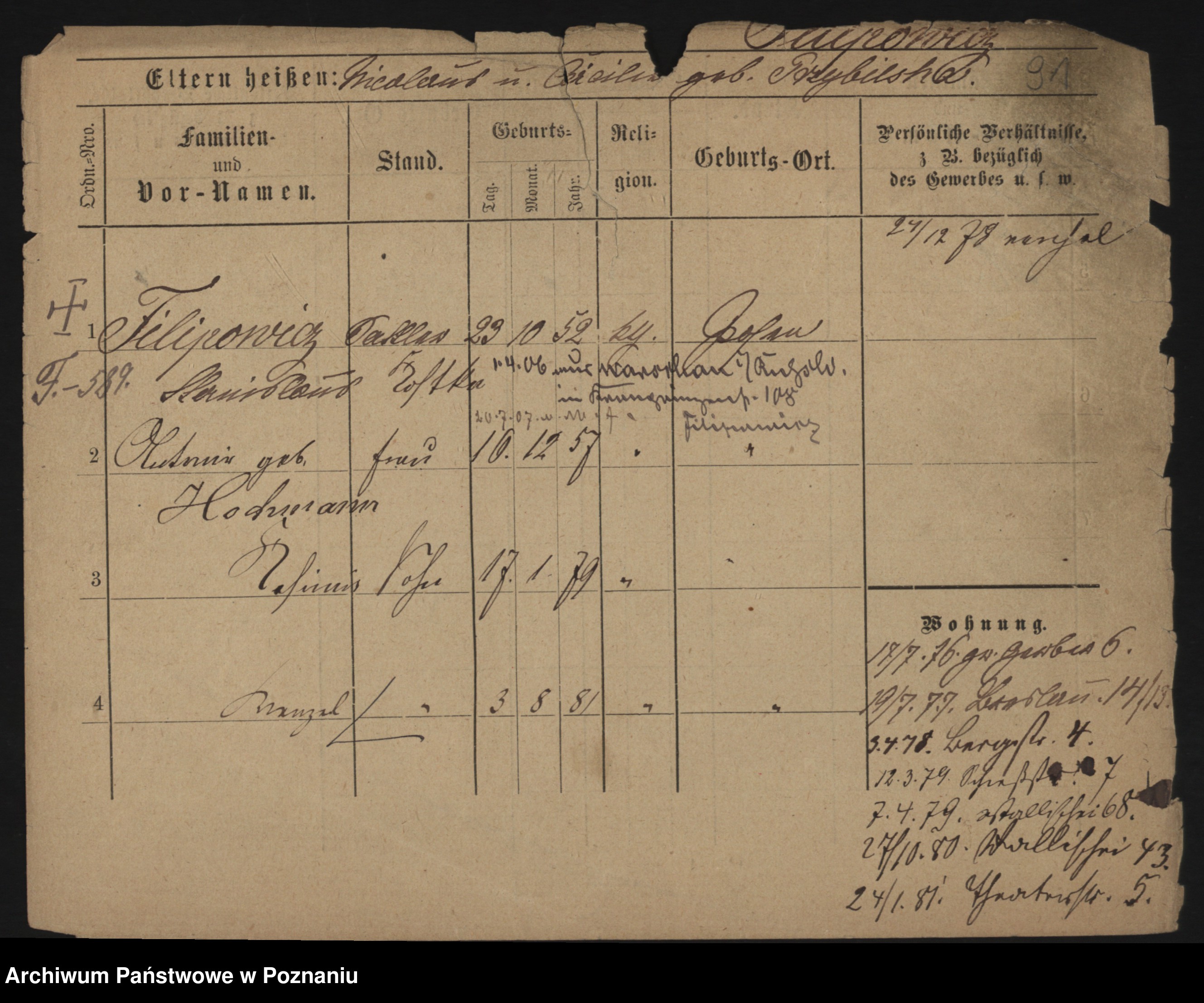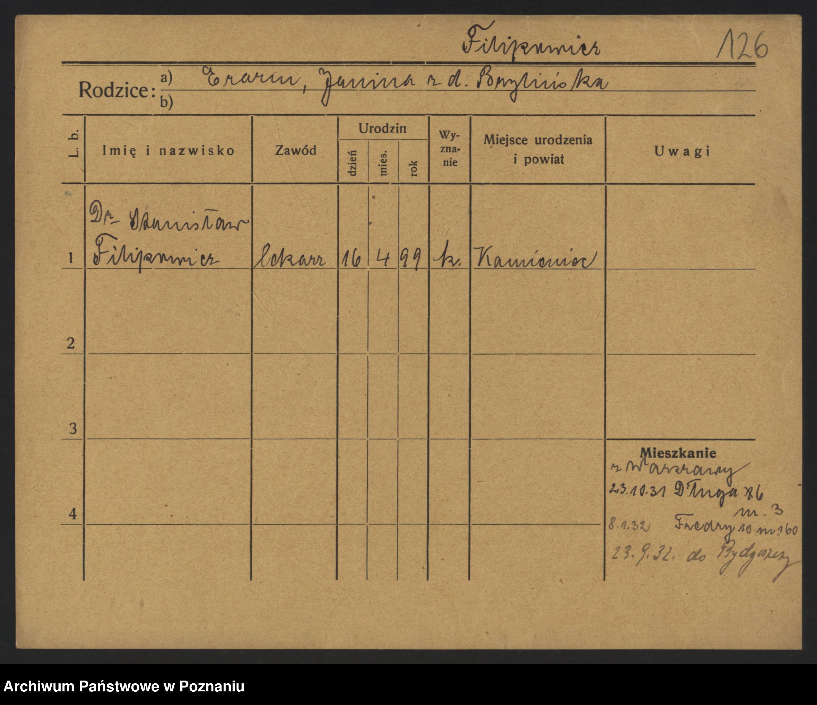 Podgląd karty osobowej dostępny jest po kliknięciu na nazwisko lub ikonkę karty. Można dokonywać powiększenia (ikony na górze) lub przechodzić między kolejnymi skanami (strzałki po bokach).