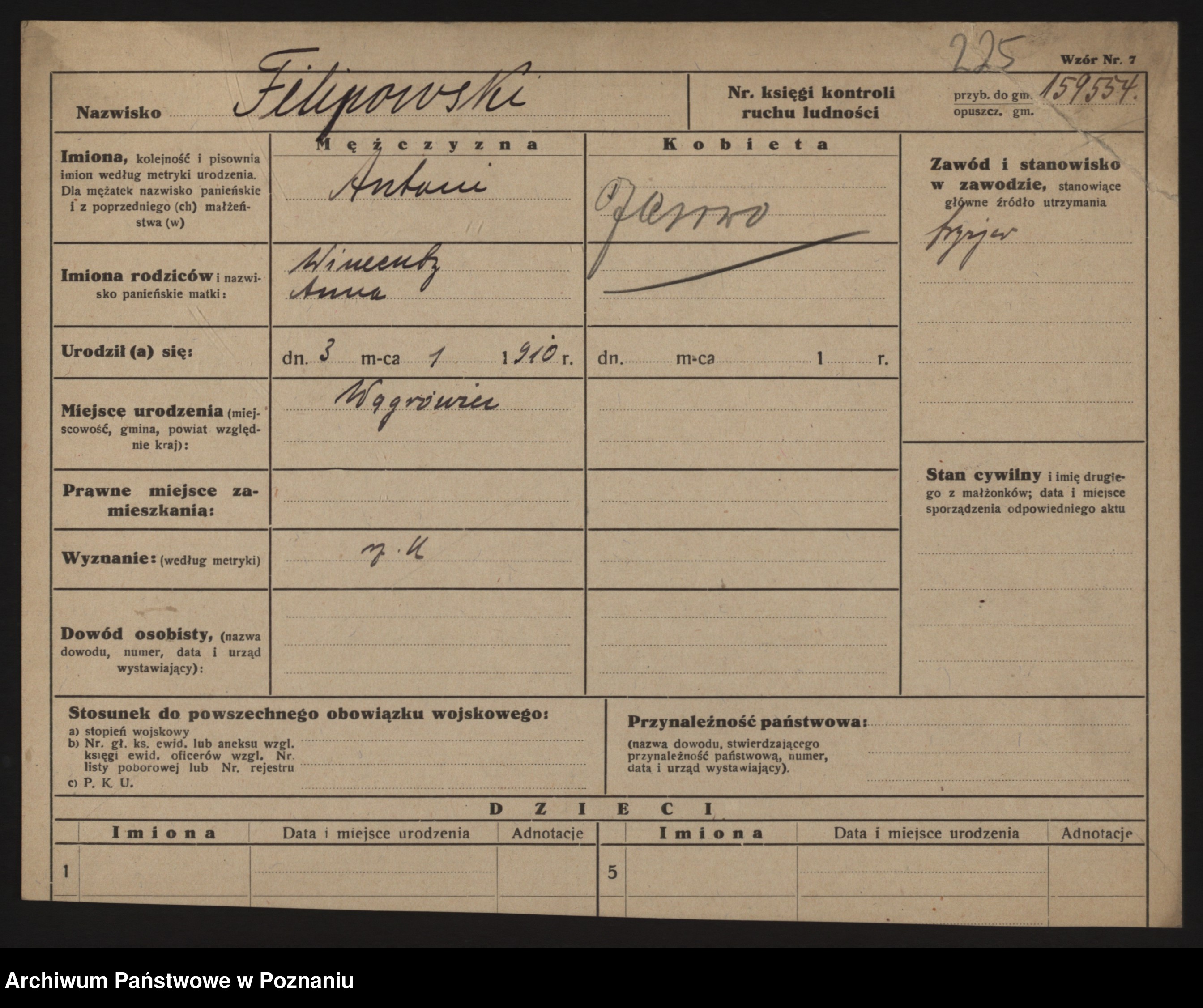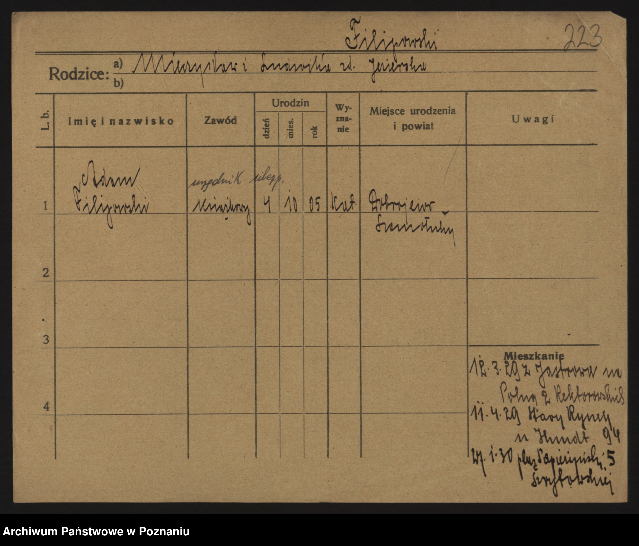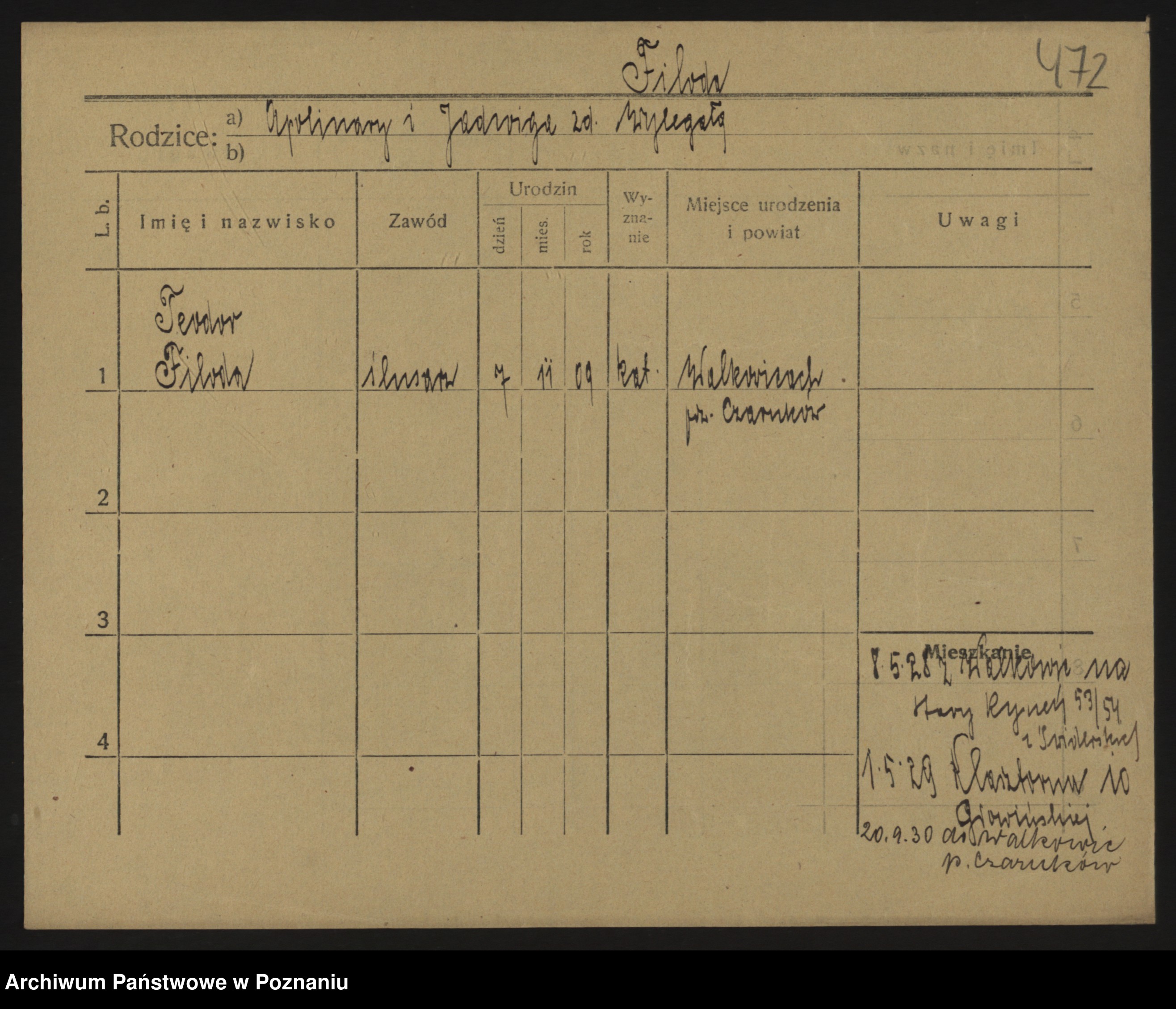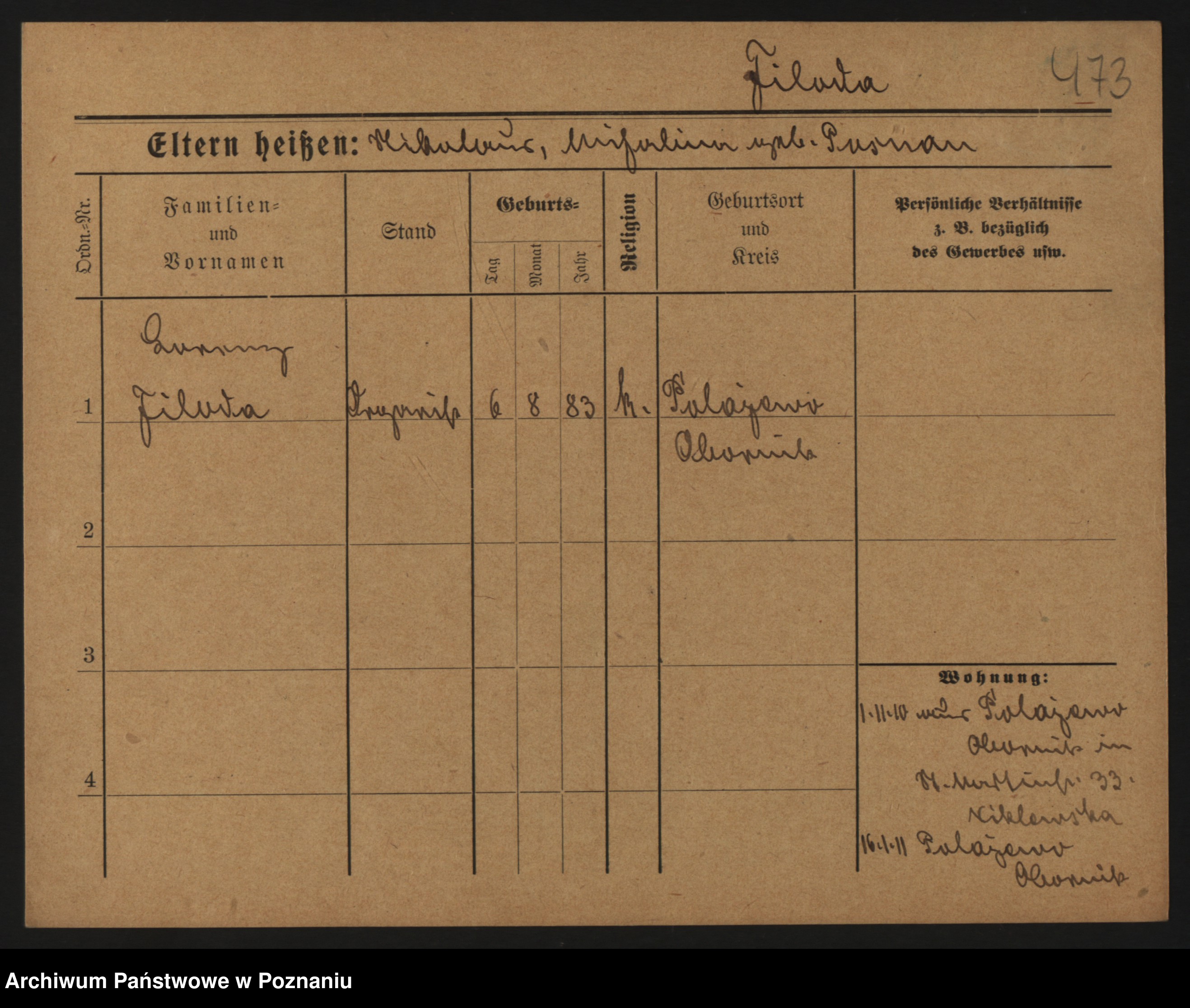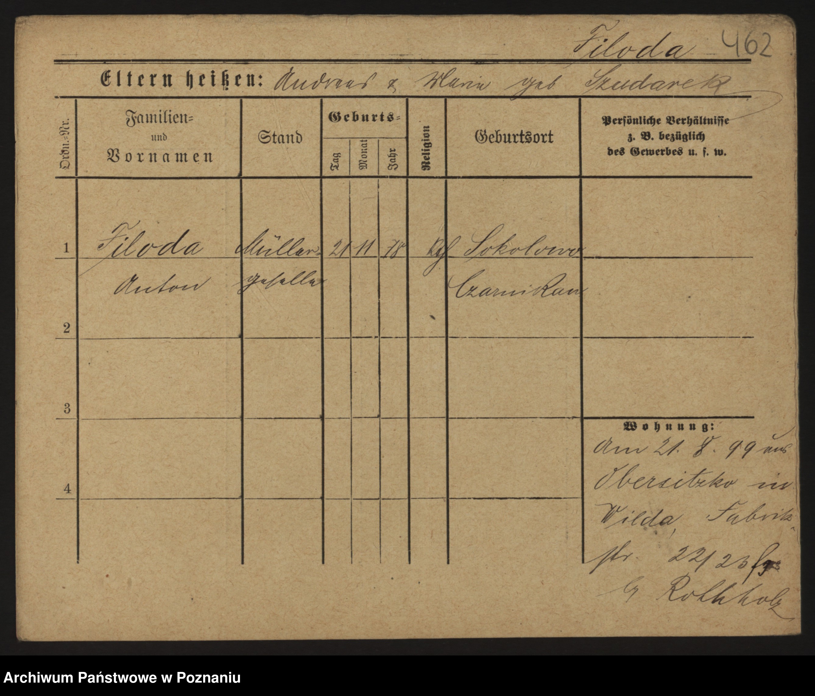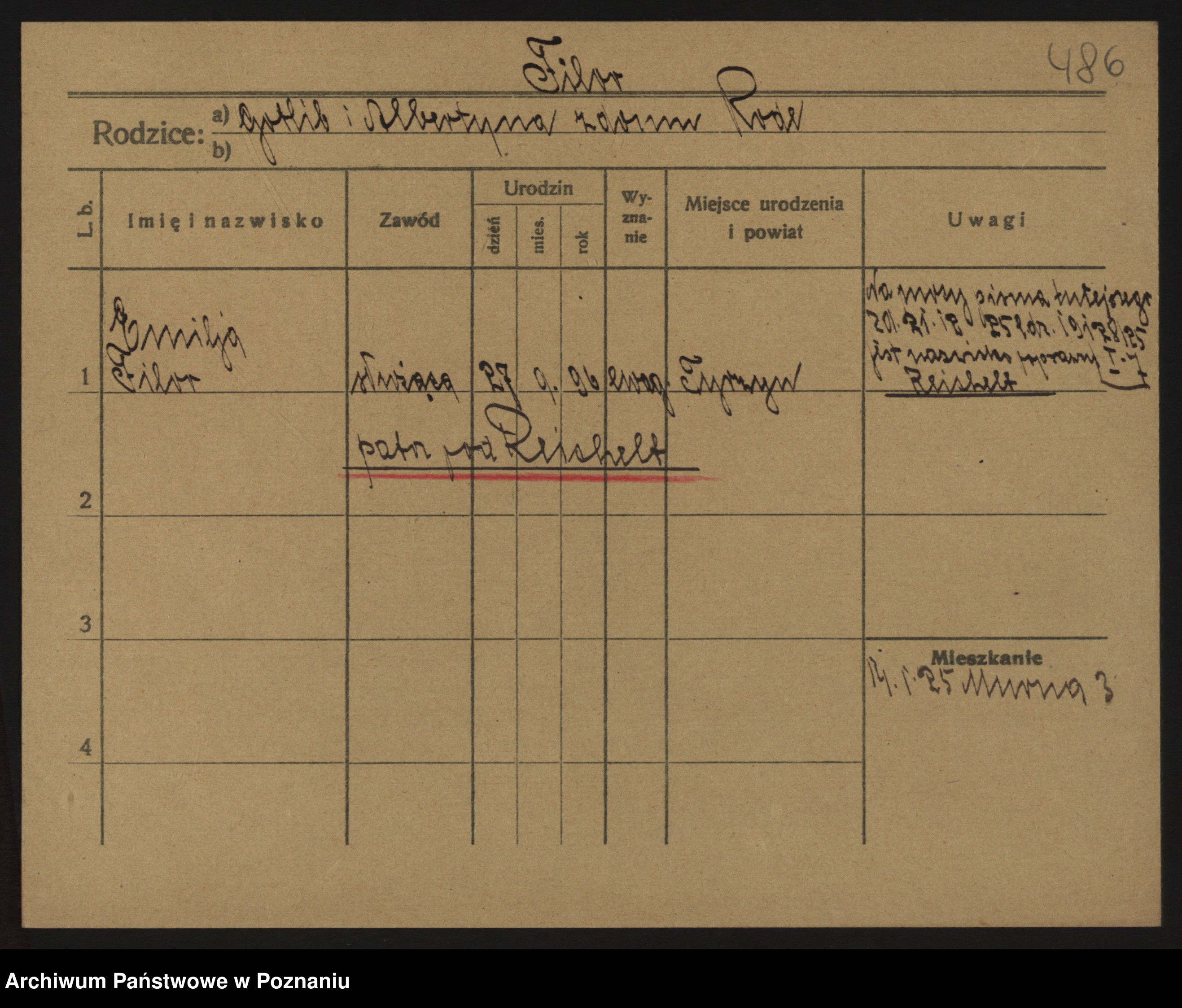 Podgląd karty osobowej dostępny jest po kliknięciu na nazwisko lub ikonkę karty. Można dokonywać powiększenia (ikony na górze) lub przechodzić między kolejnymi skanami (strzałki po bokach).