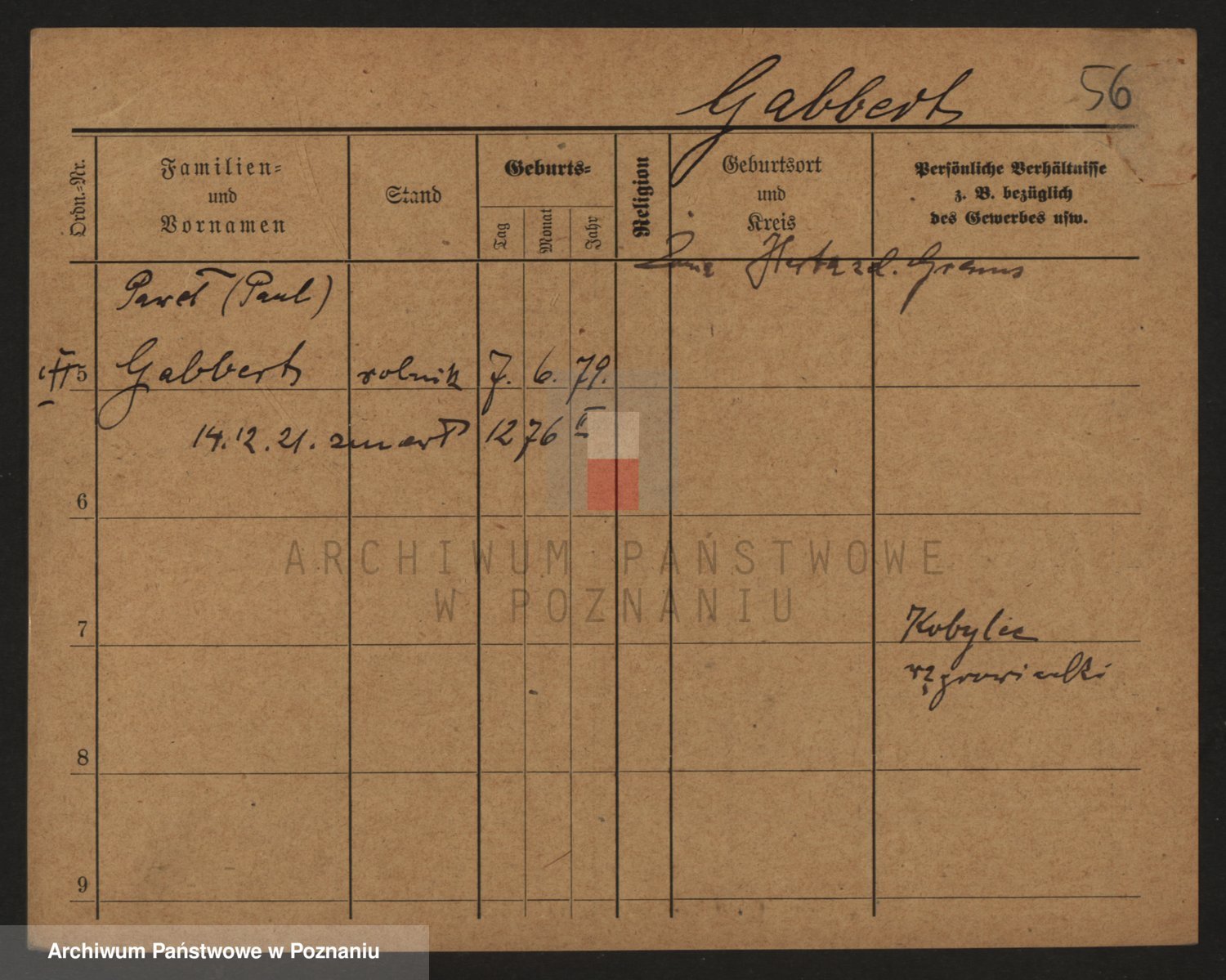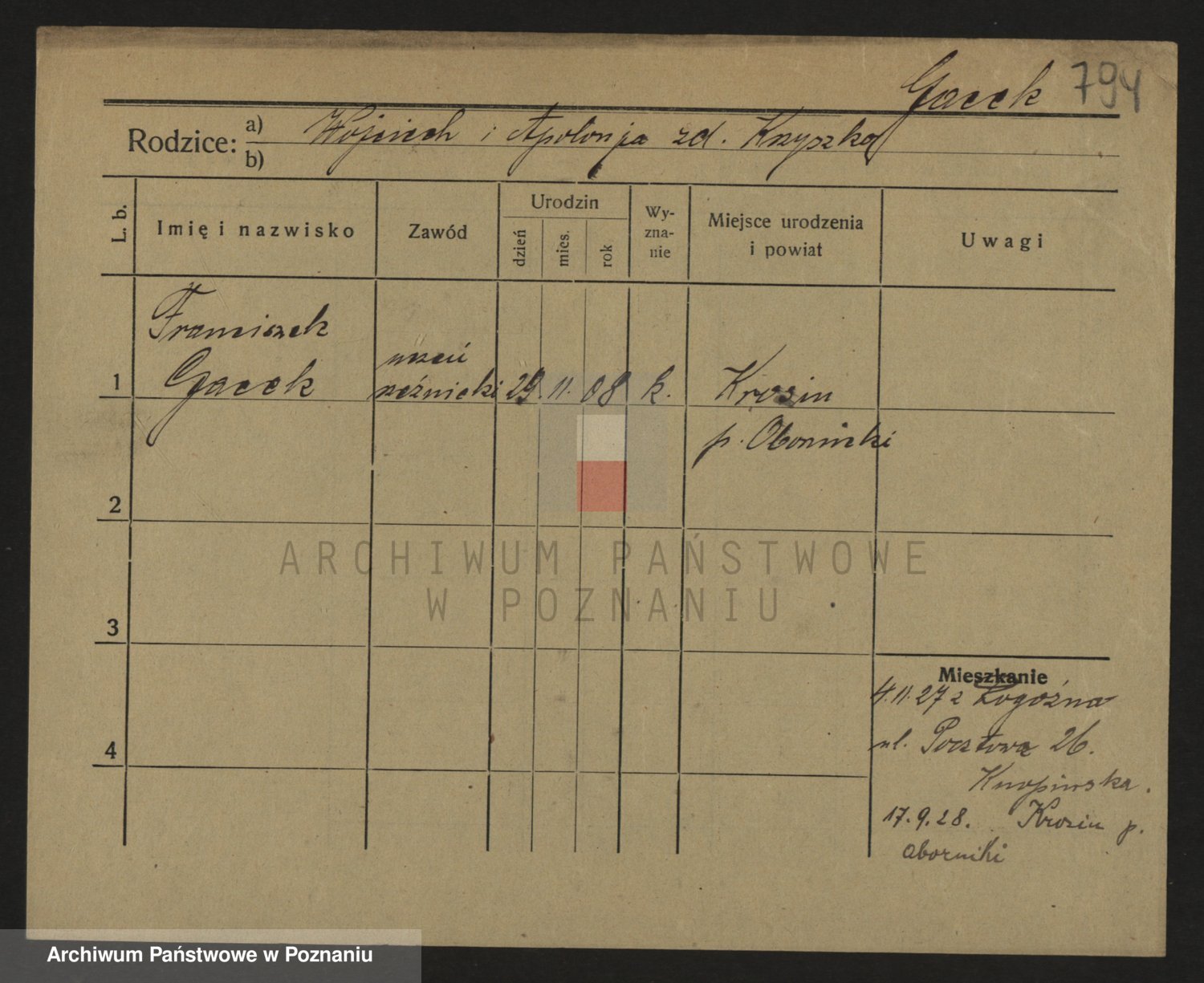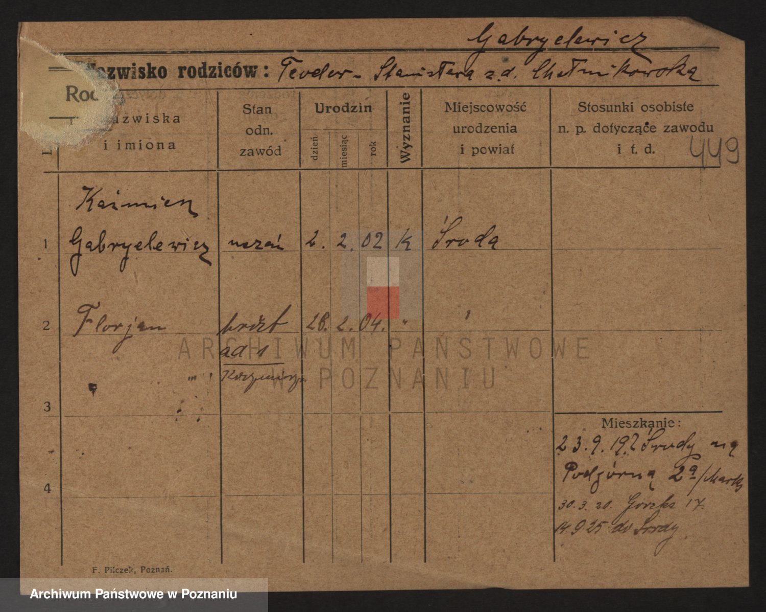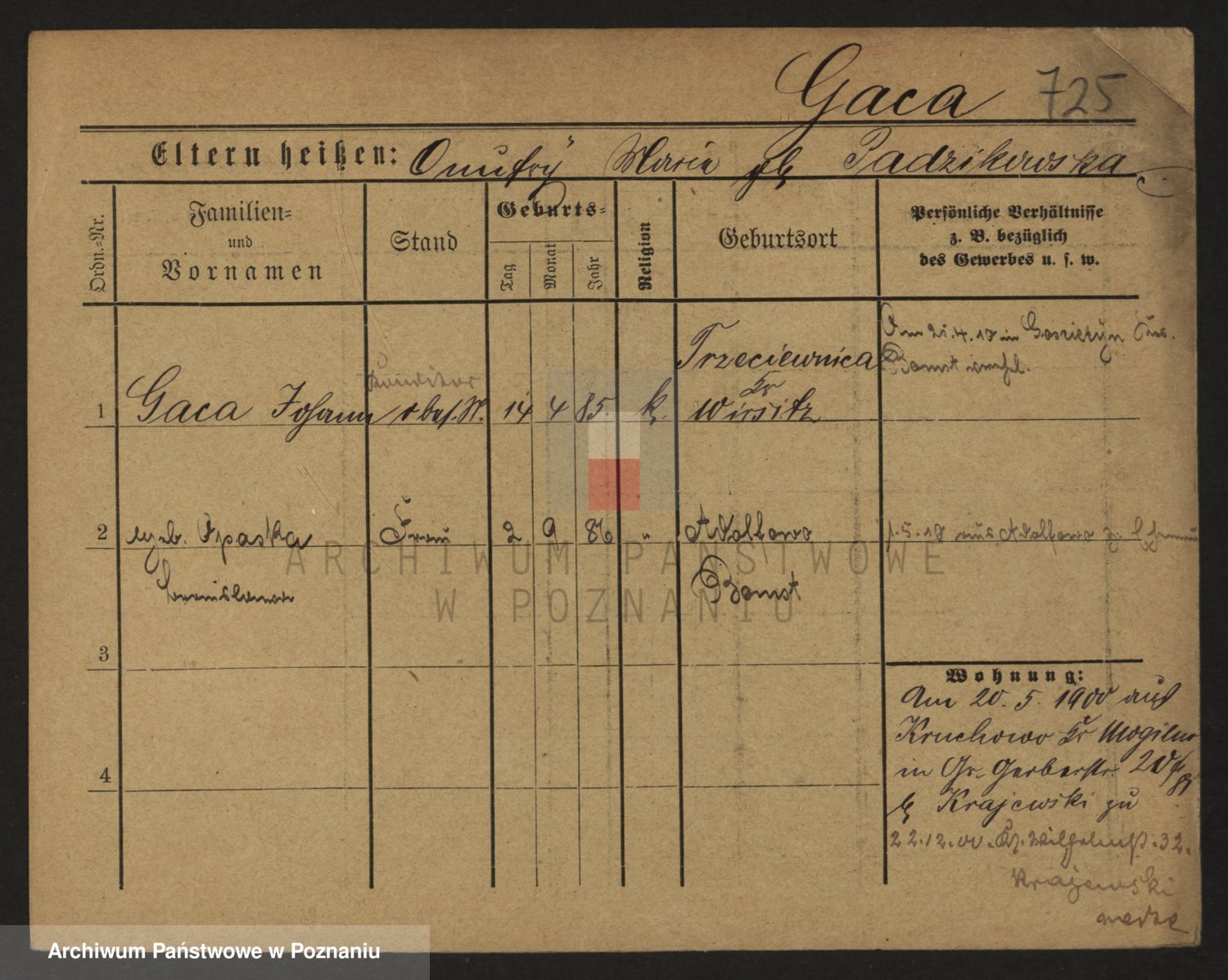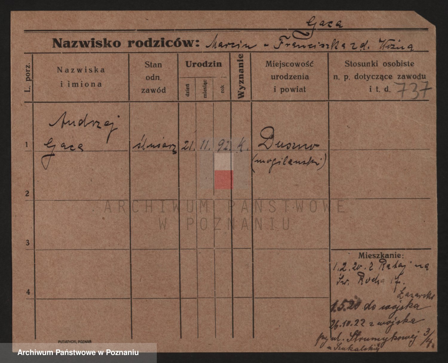 Podgląd karty osobowej dostępny jest po kliknięciu na nazwisko lub ikonkę karty. Można dokonywać powiększenia (ikony na górze) lub przechodzić między kolejnymi skanami (strzałki po bokach).