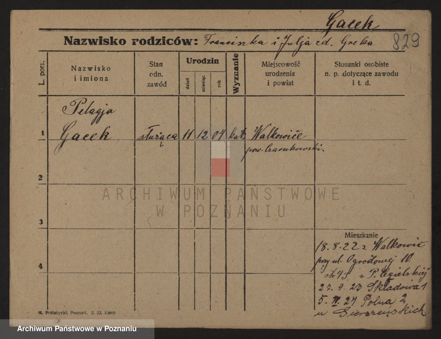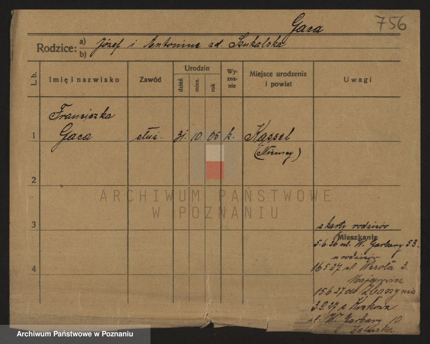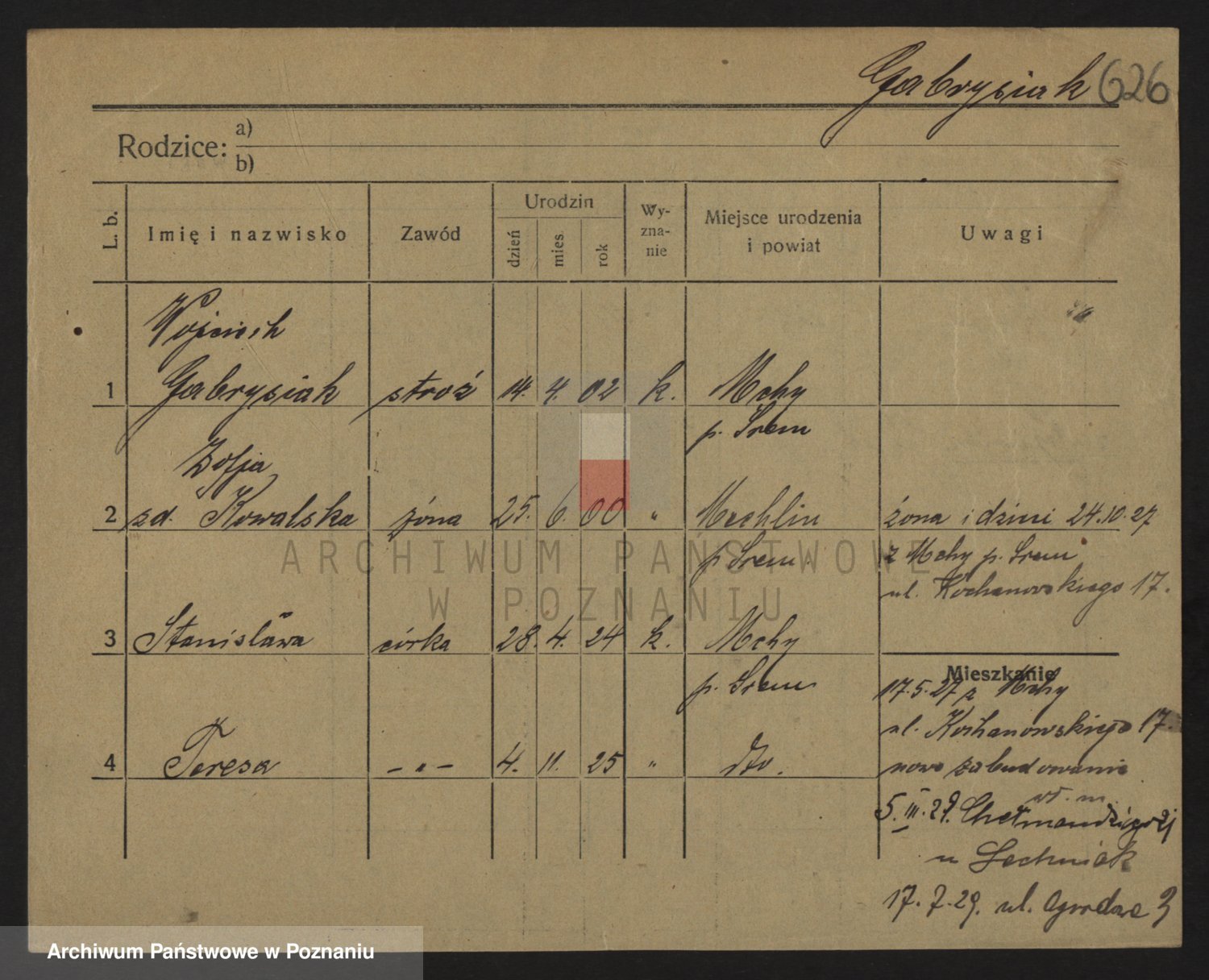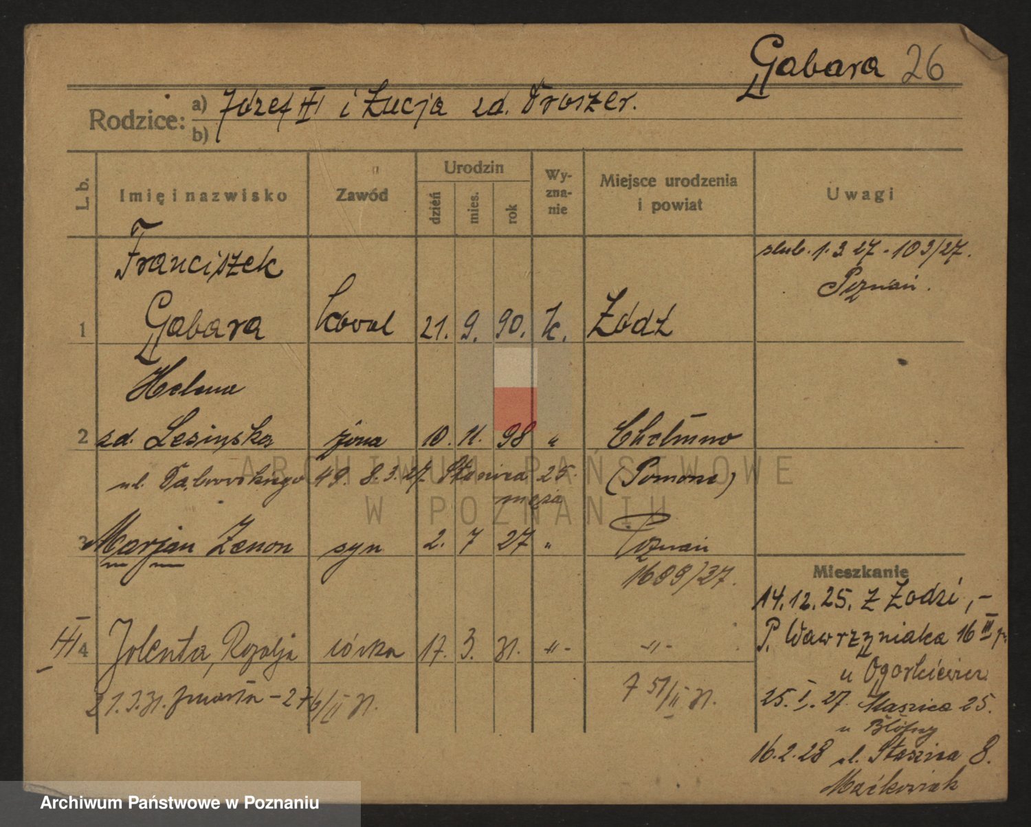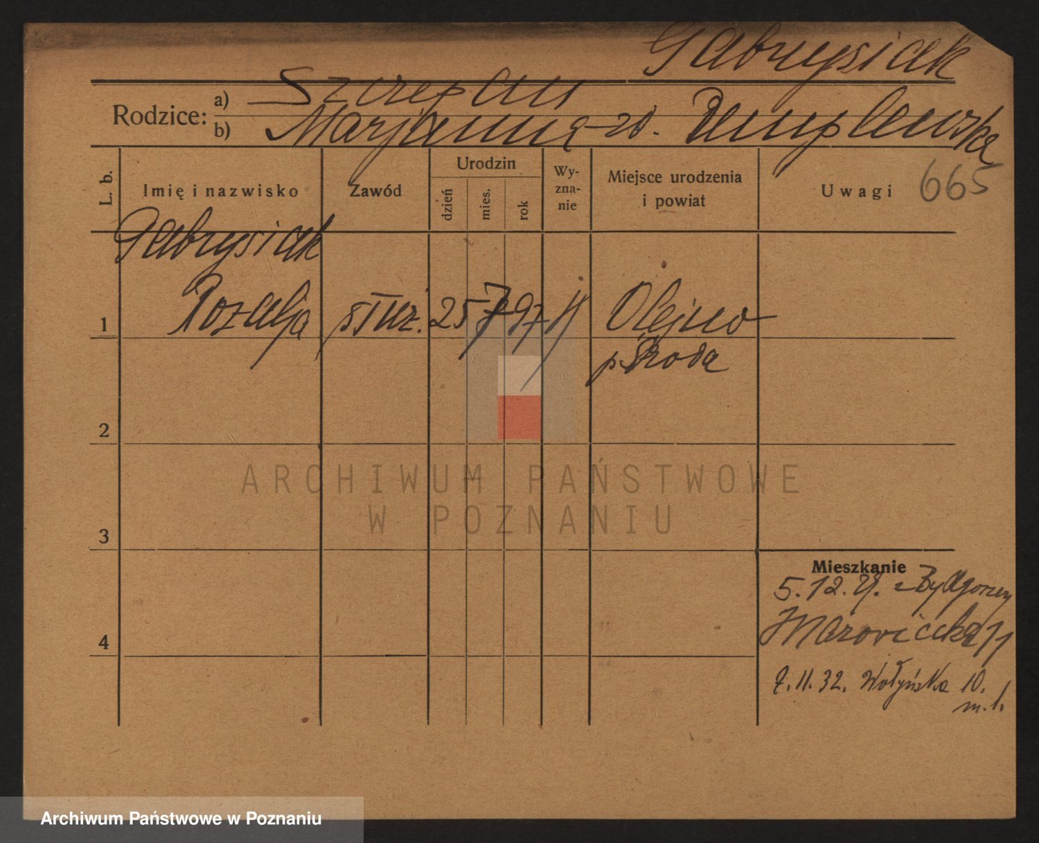Podgląd karty osobowej dostępny jest po kliknięciu na nazwisko lub ikonkę karty. Można dokonywać powiększenia (ikony na górze) lub przechodzić między kolejnymi skanami (strzałki po bokach).