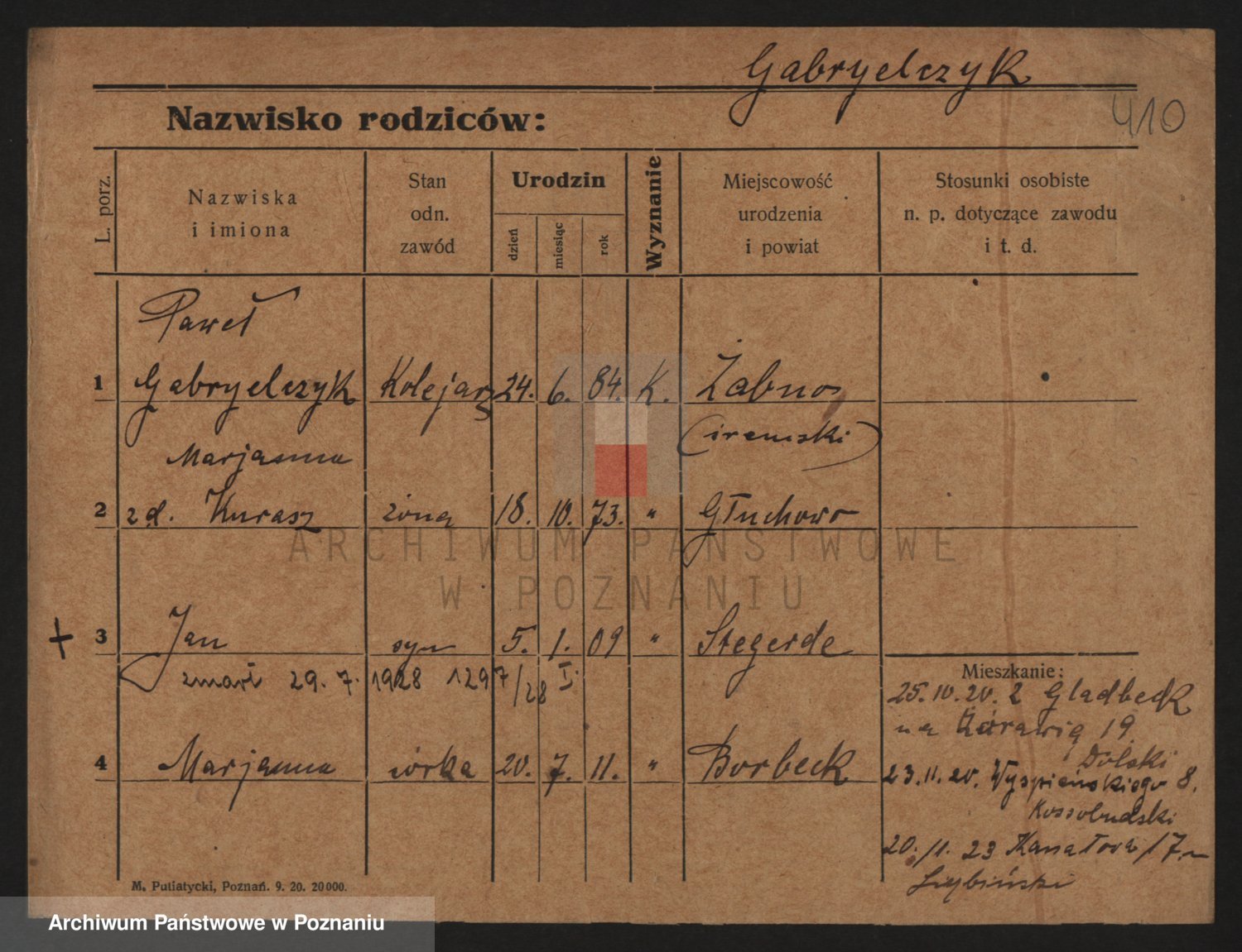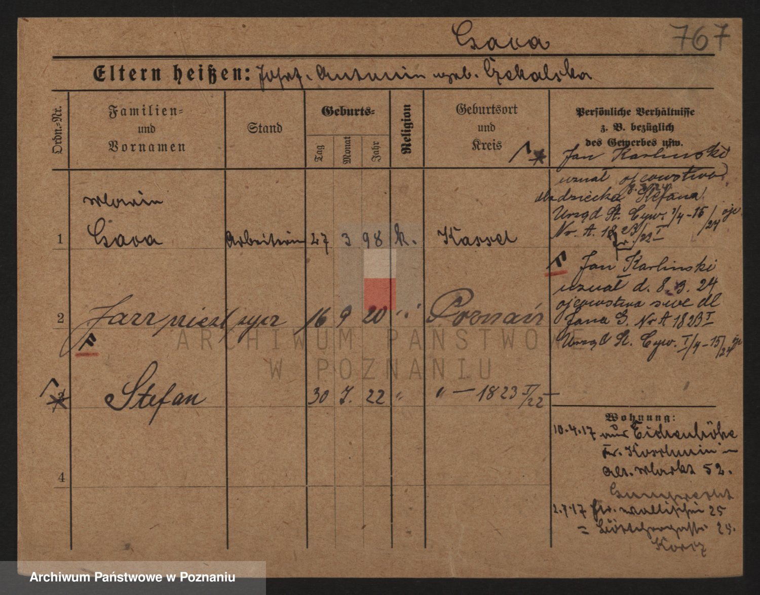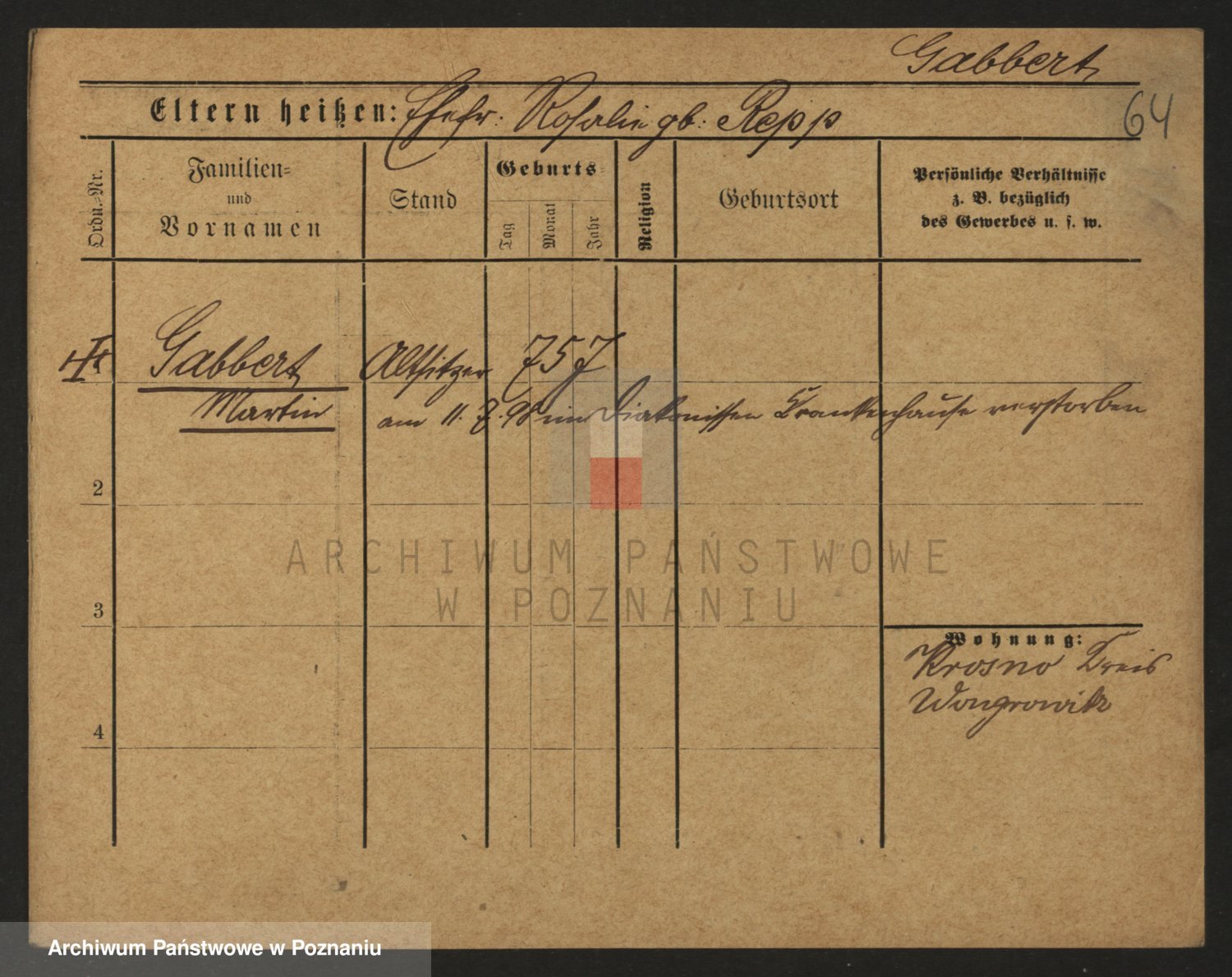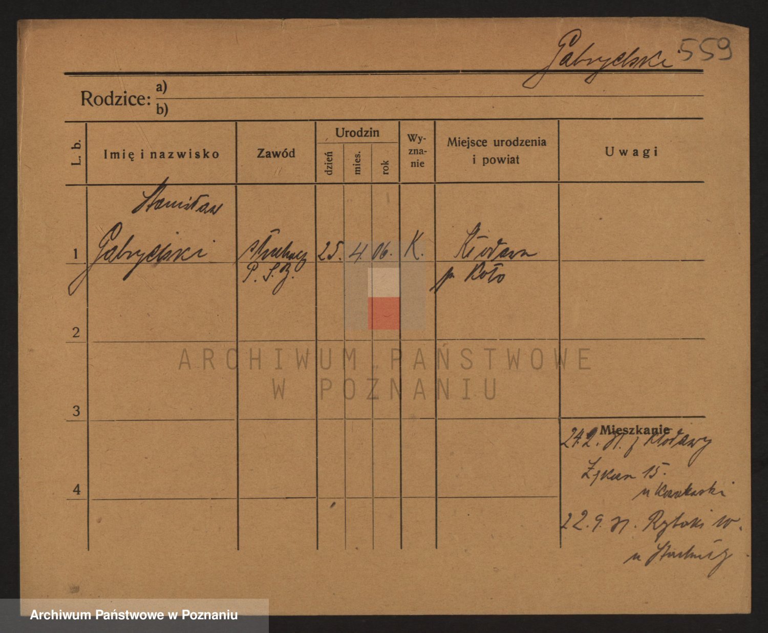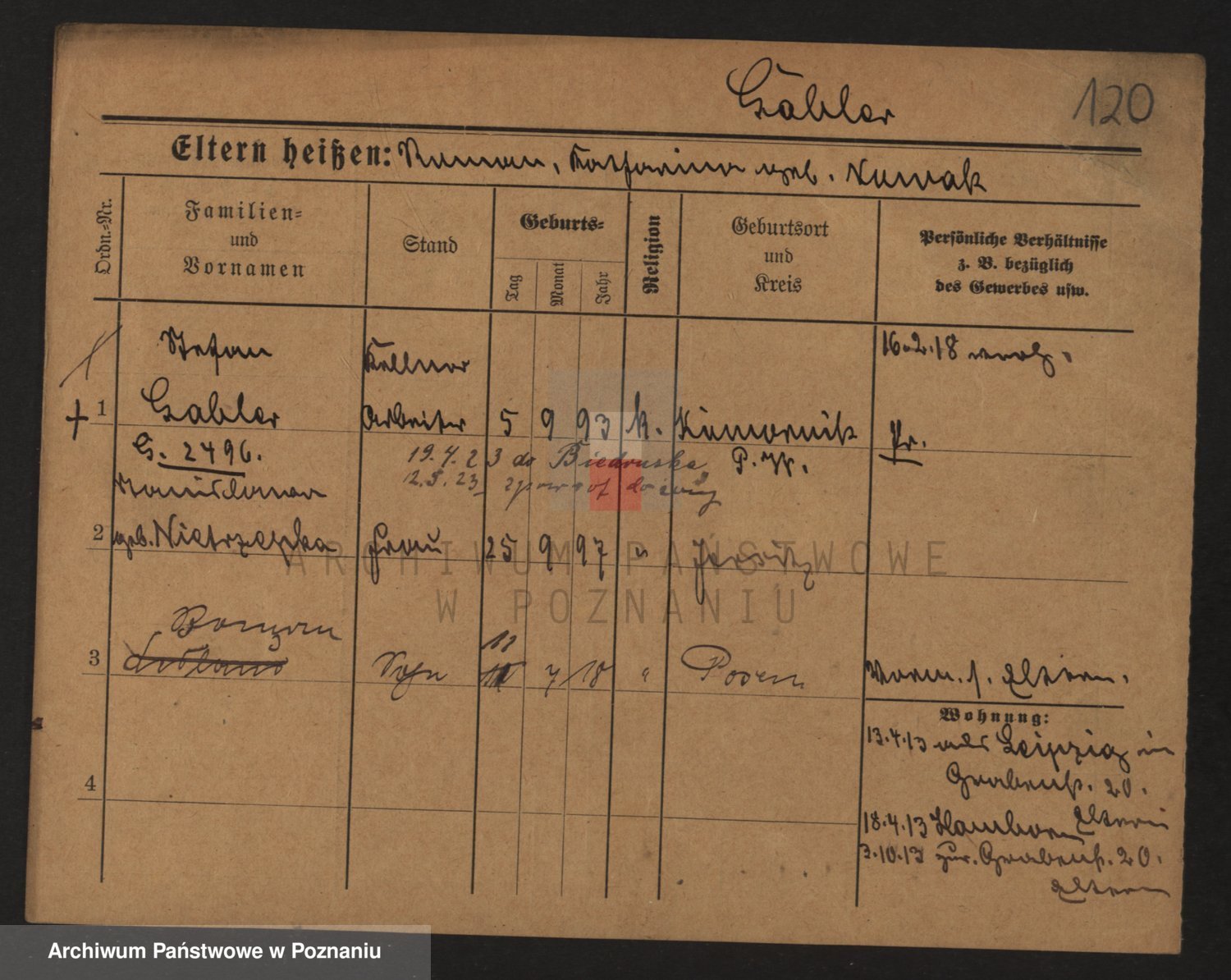Podgląd karty osobowej dostępny jest po kliknięciu na nazwisko lub ikonkę karty. Można dokonywać powiększenia (ikony na górze) lub przechodzić między kolejnymi skanami (strzałki po bokach).