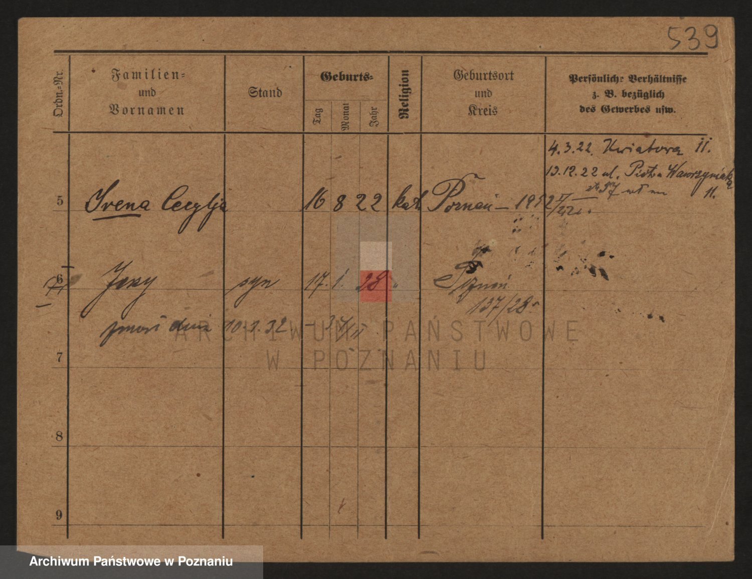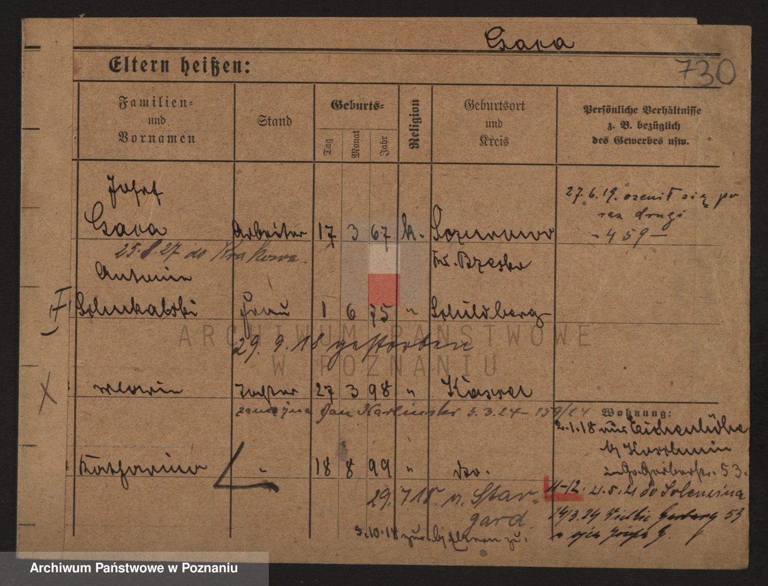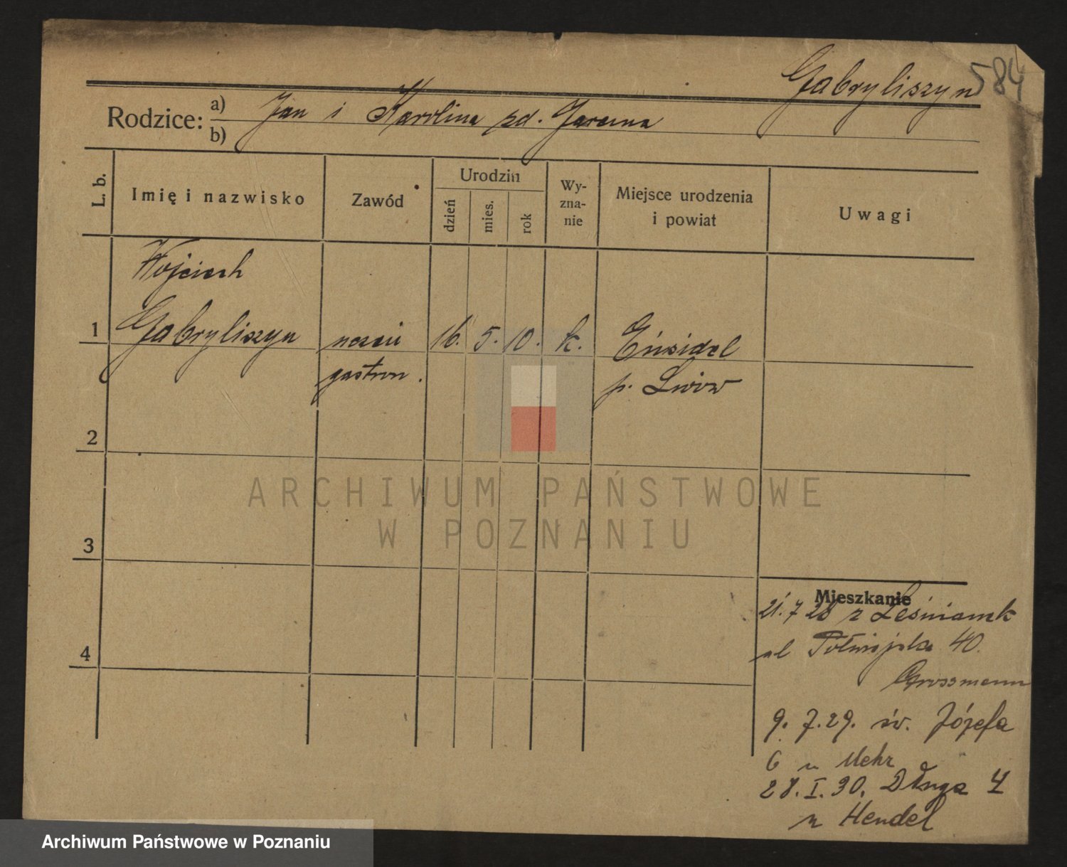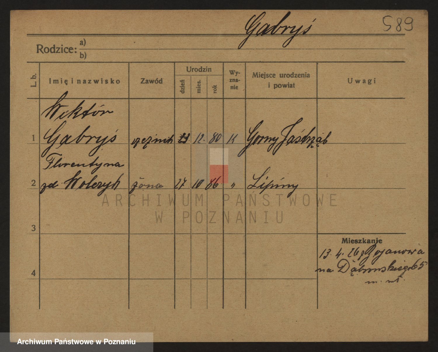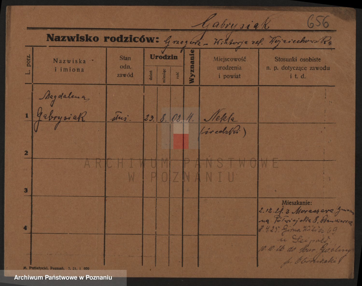 Podgląd karty osobowej dostępny jest po kliknięciu na nazwisko lub ikonkę karty. Można dokonywać powiększenia (ikony na górze) lub przechodzić między kolejnymi skanami (strzałki po bokach).