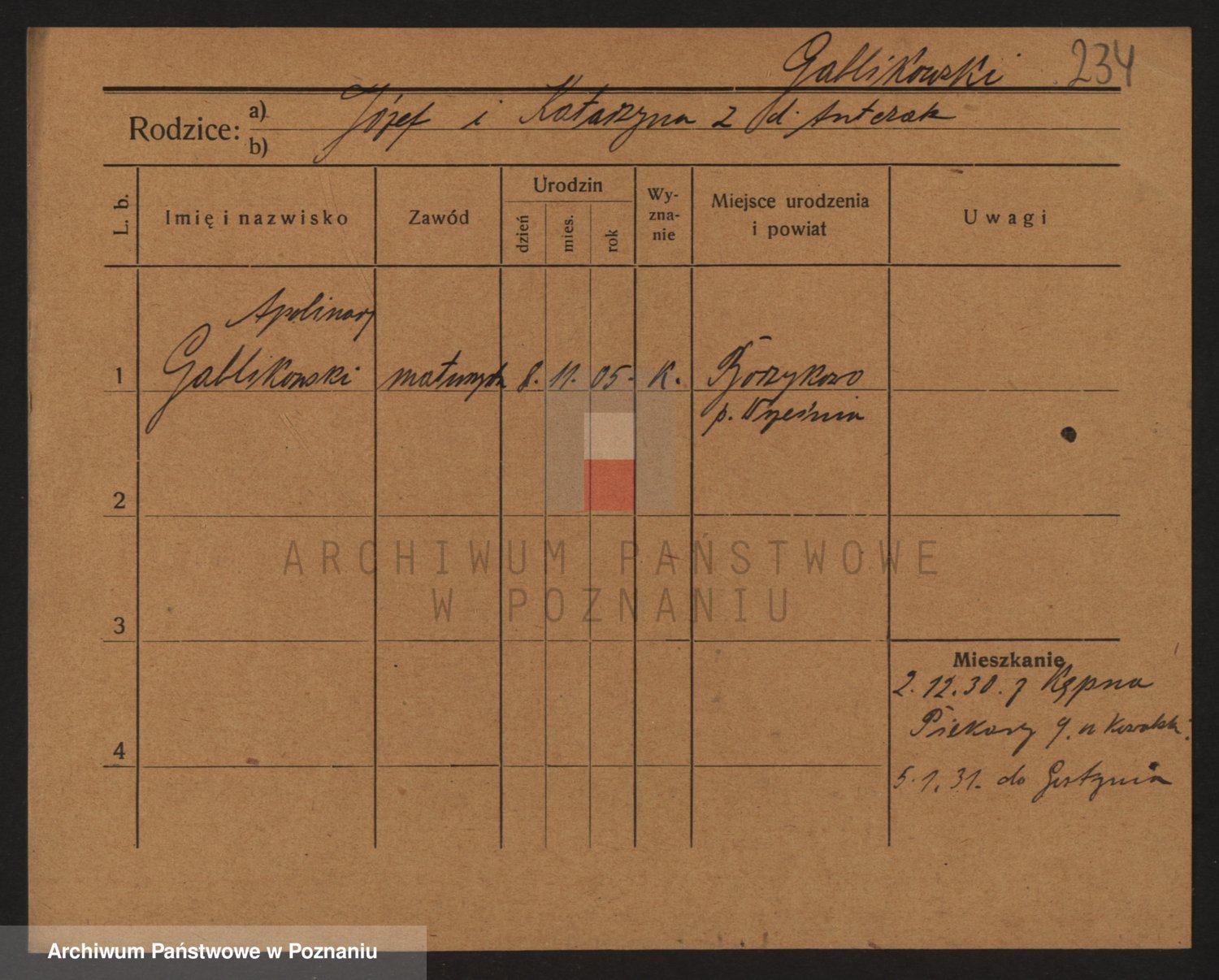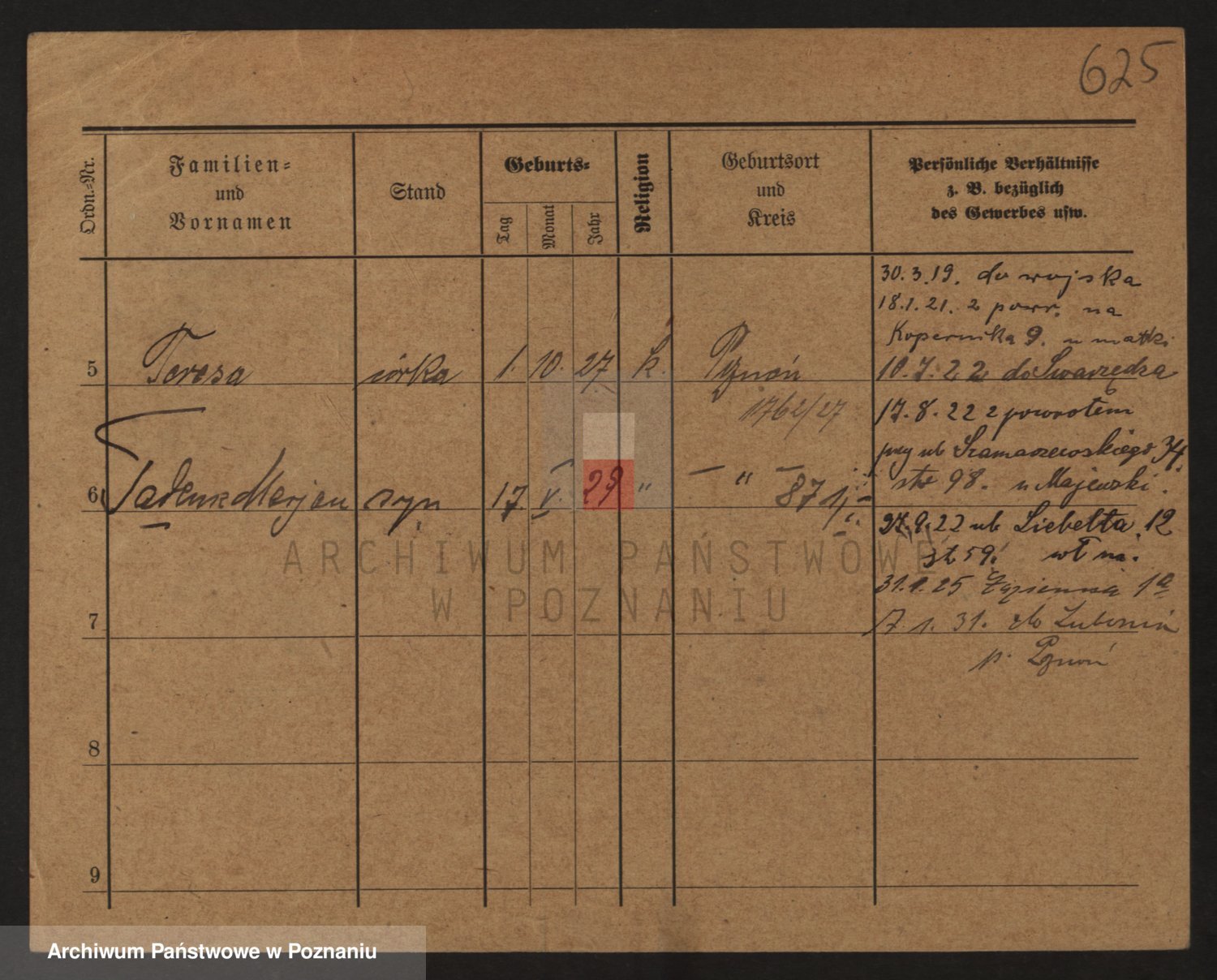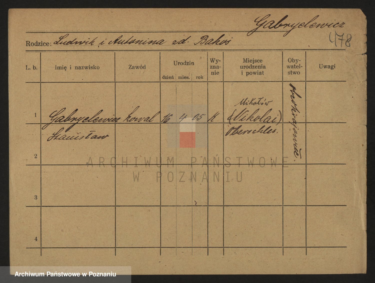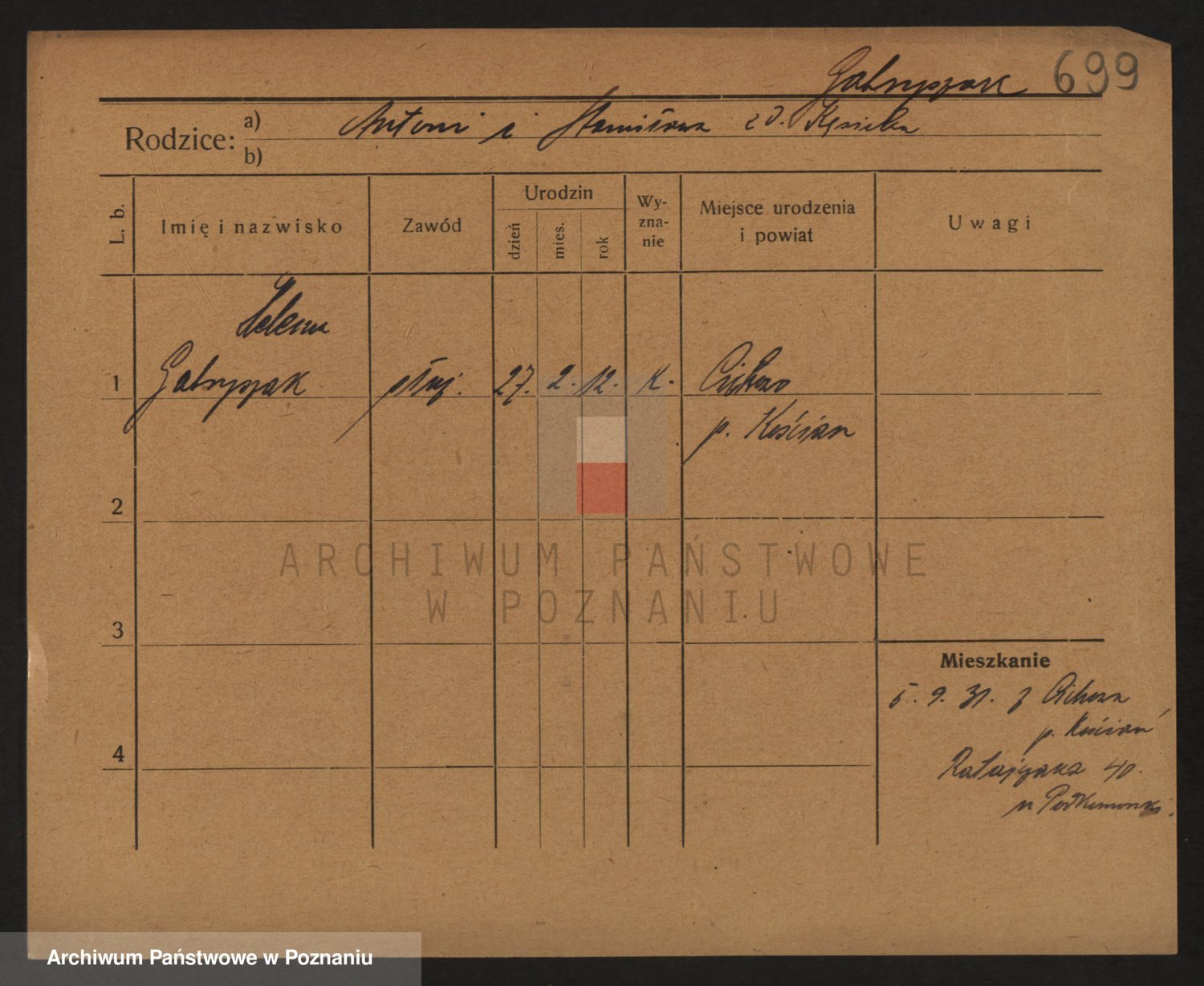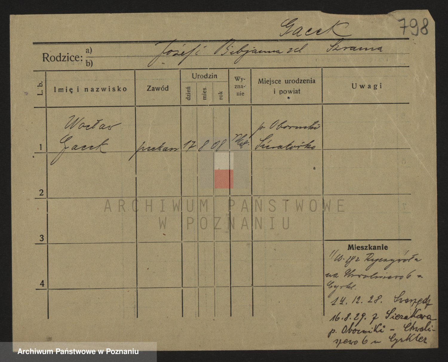 Podgląd karty osobowej dostępny jest po kliknięciu na nazwisko lub ikonkę karty. Można dokonywać powiększenia (ikony na górze) lub przechodzić między kolejnymi skanami (strzałki po bokach).