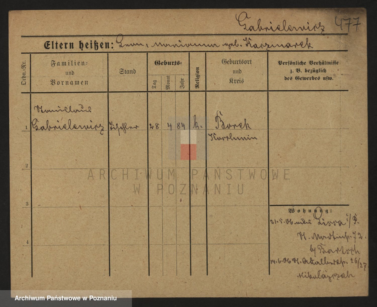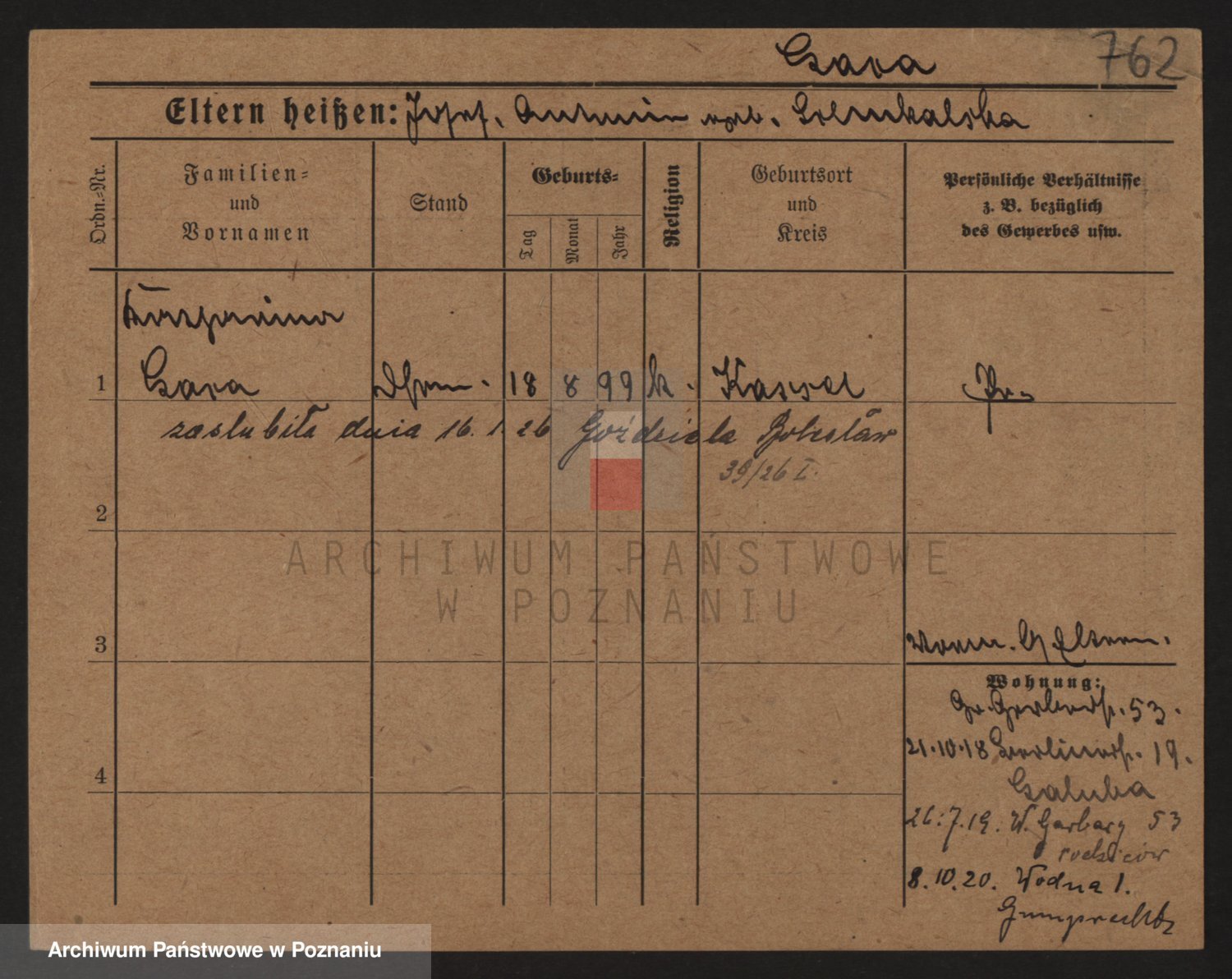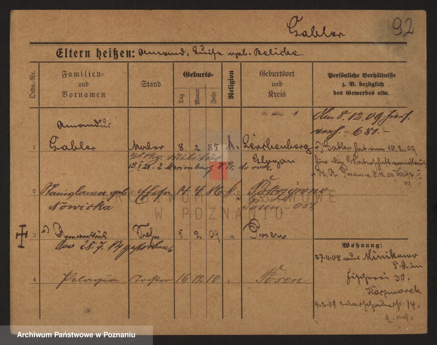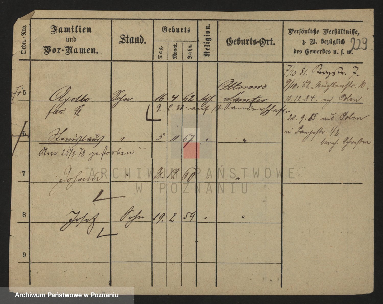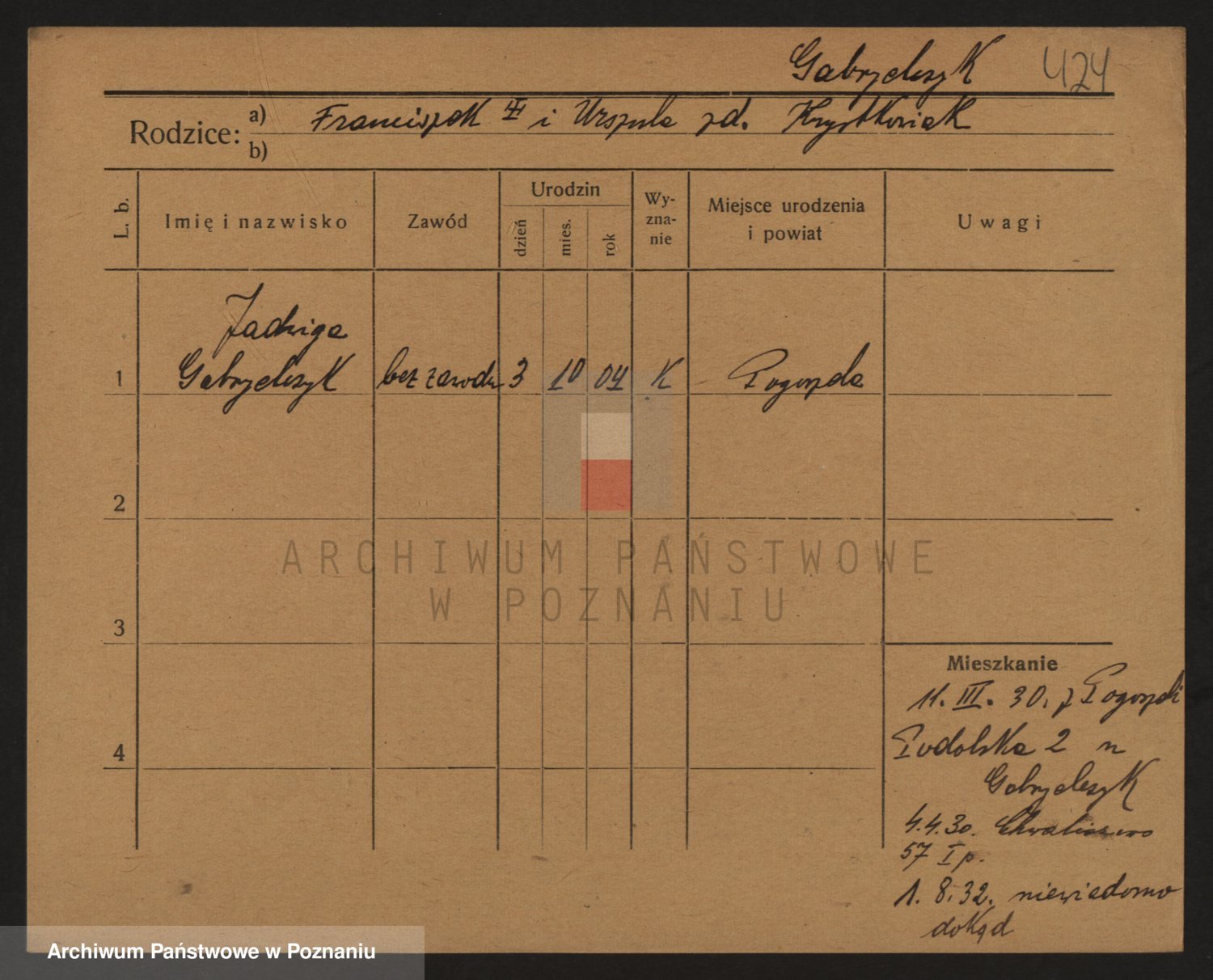 Podgląd karty osobowej dostępny jest po kliknięciu na nazwisko lub ikonkę karty. Można dokonywać powiększenia (ikony na górze) lub przechodzić między kolejnymi skanami (strzałki po bokach).