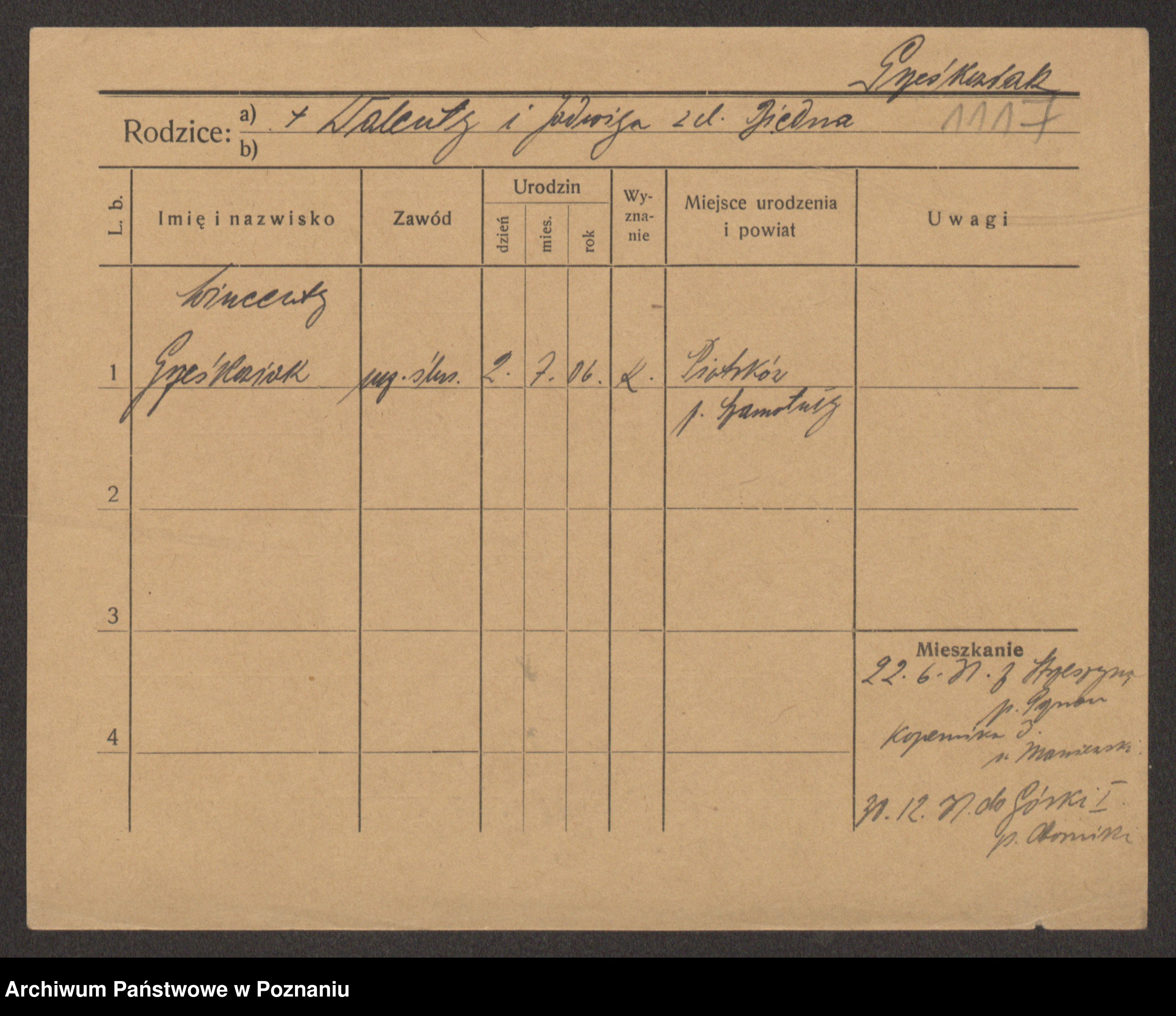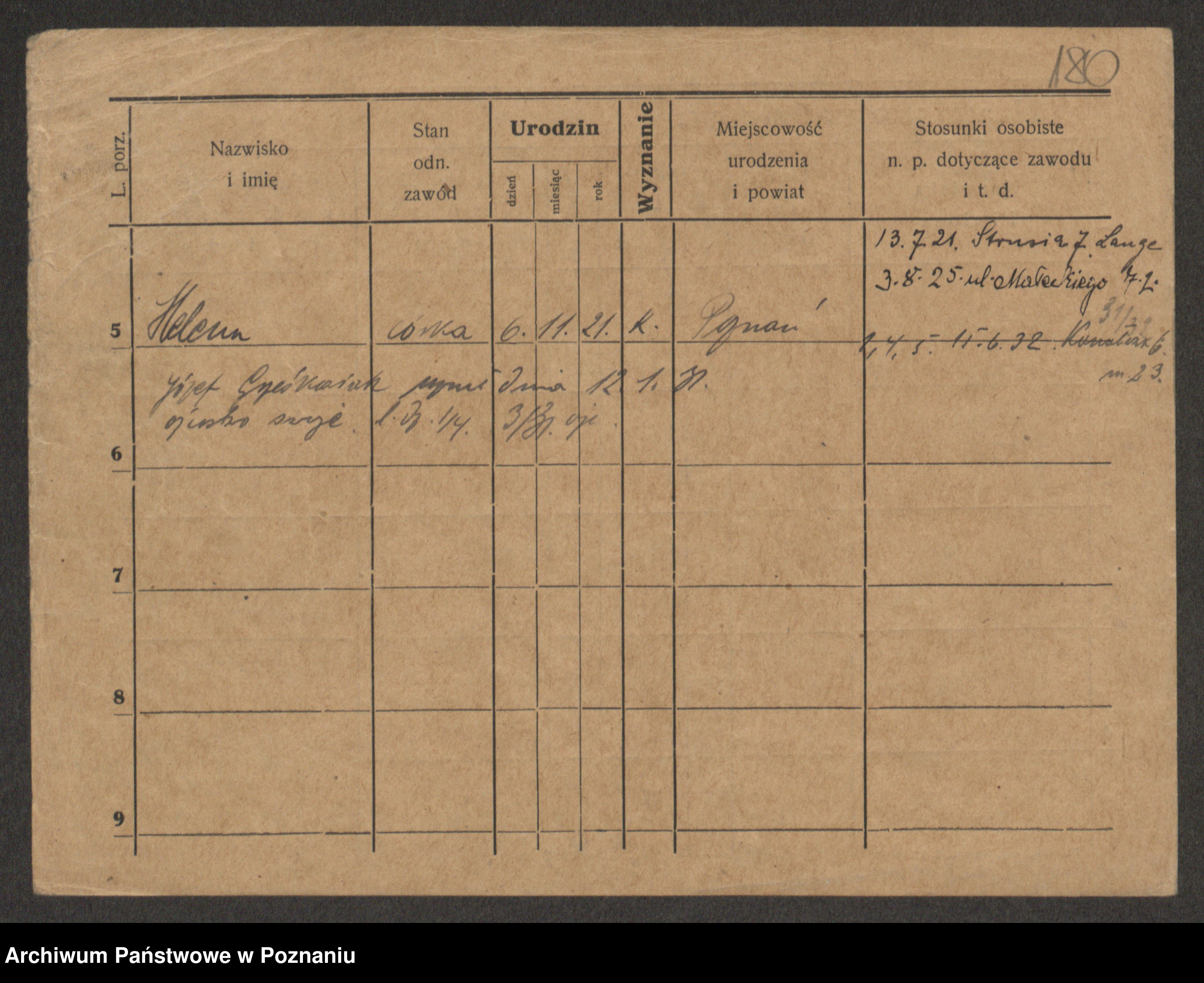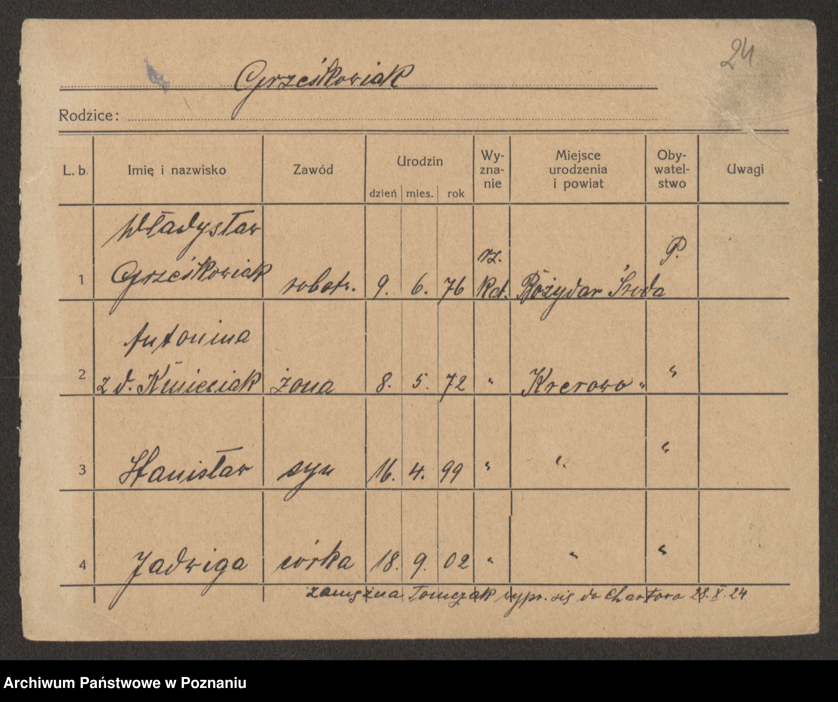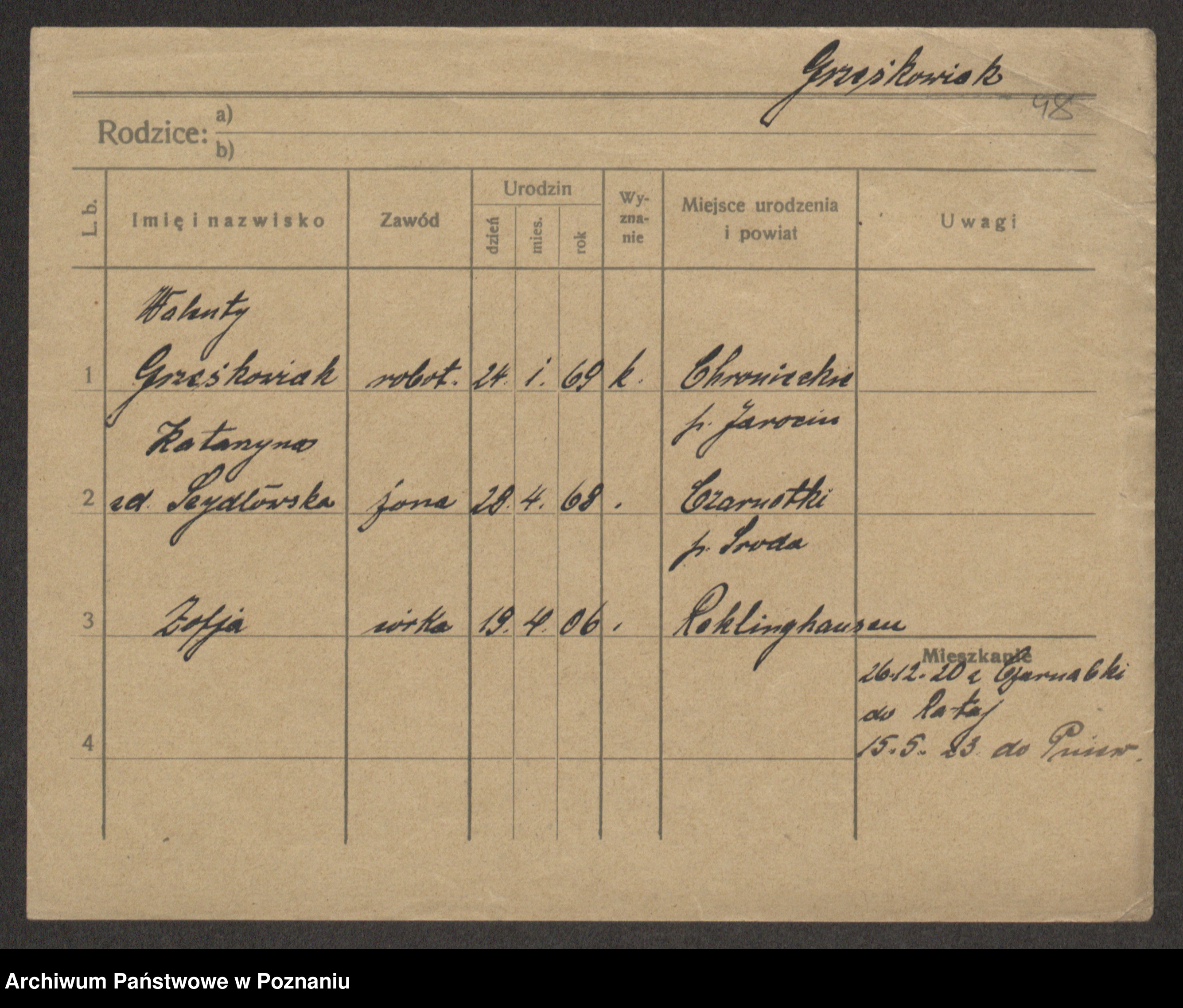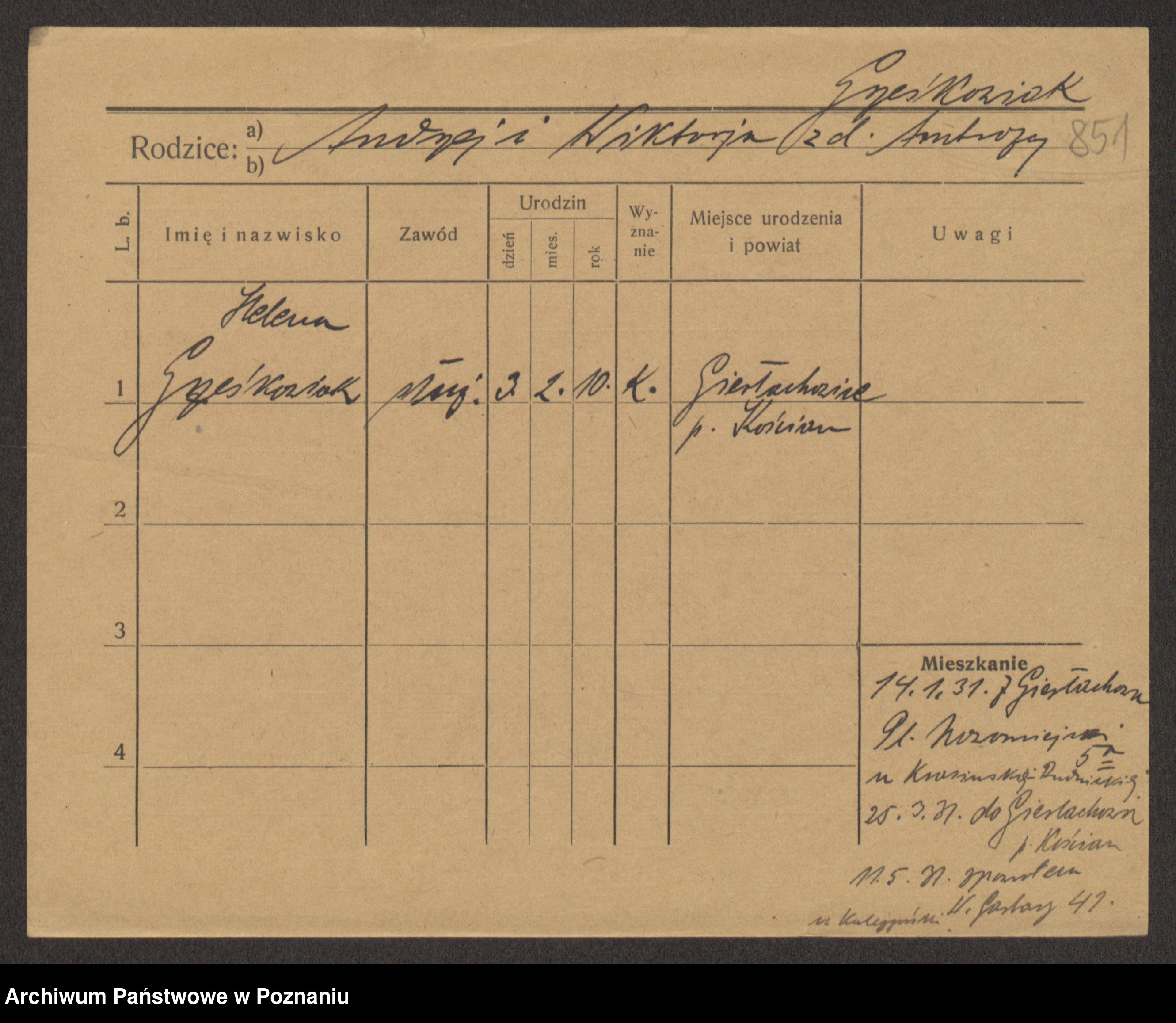 Podgląd karty osobowej dostępny jest po kliknięciu na nazwisko lub ikonkę karty. Można dokonywać powiększenia (ikony na górze) lub przechodzić między kolejnymi skanami (strzałki po bokach).