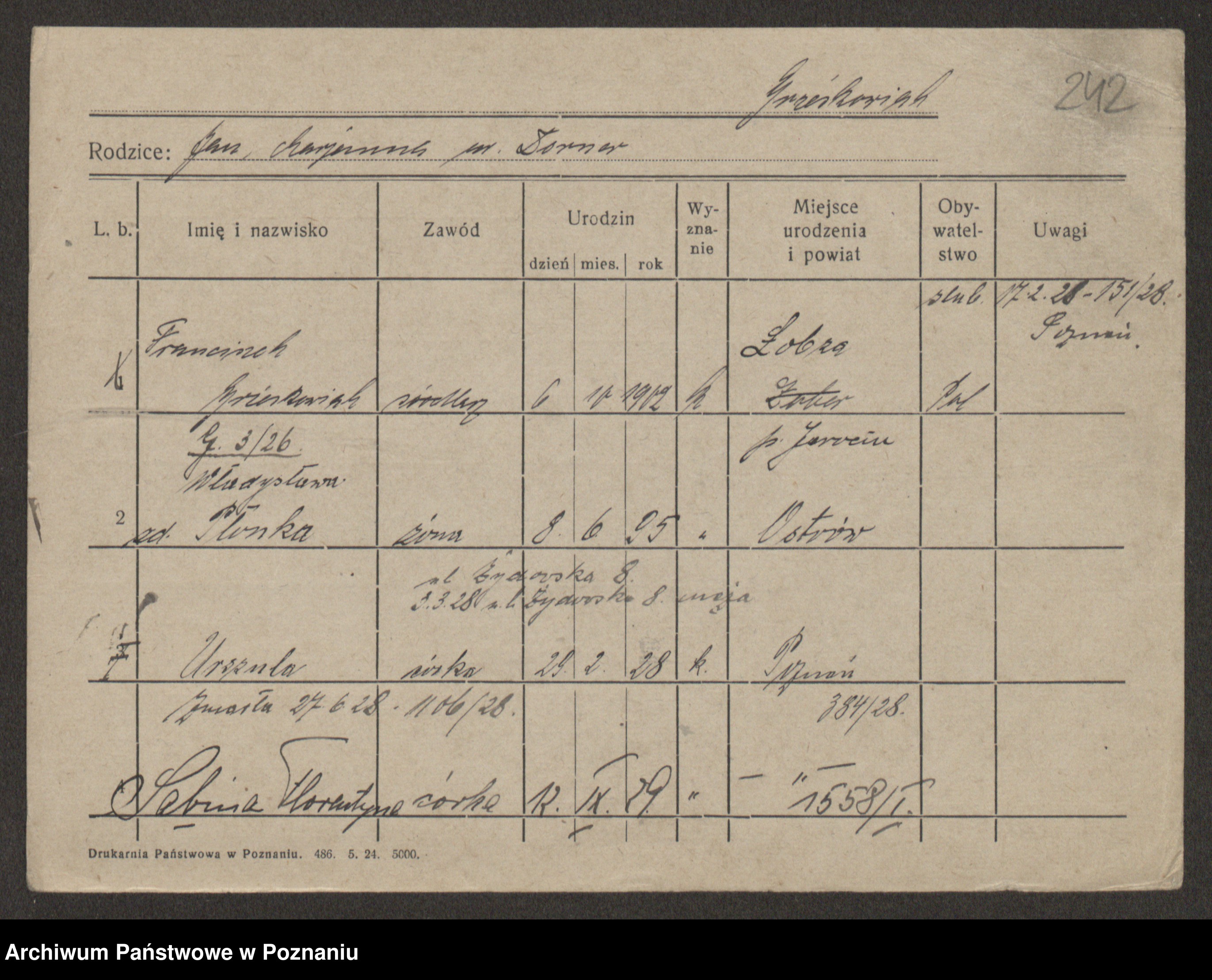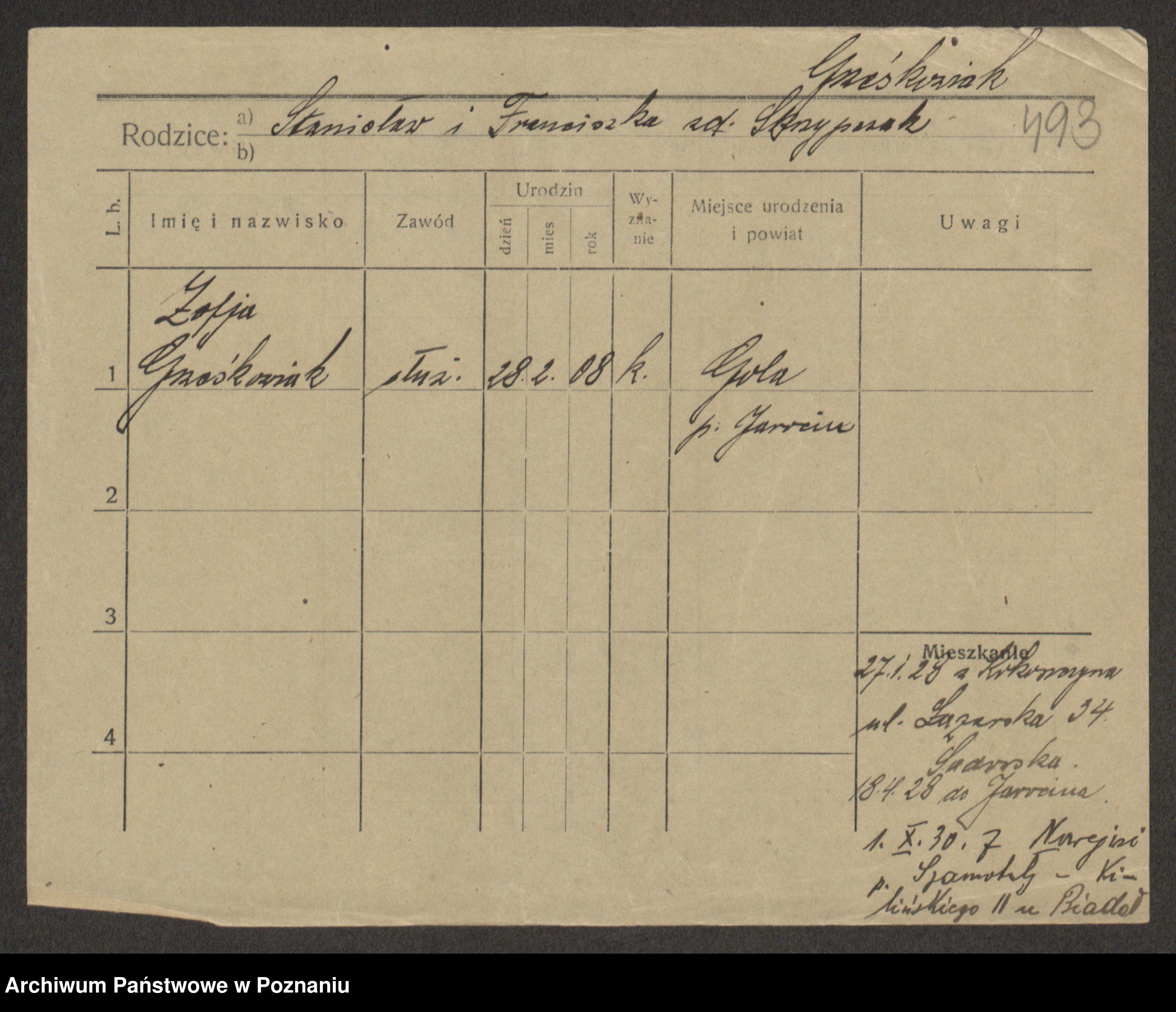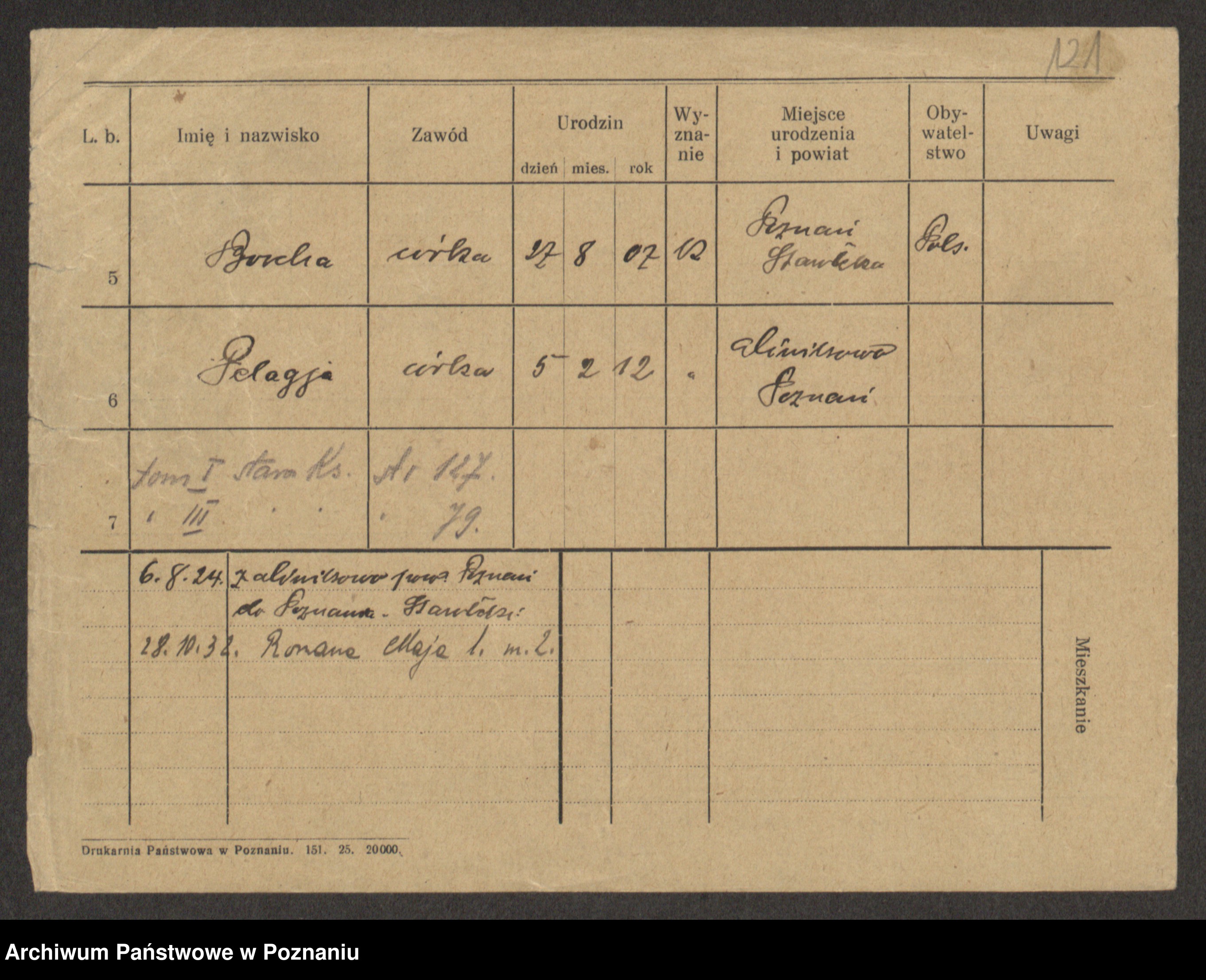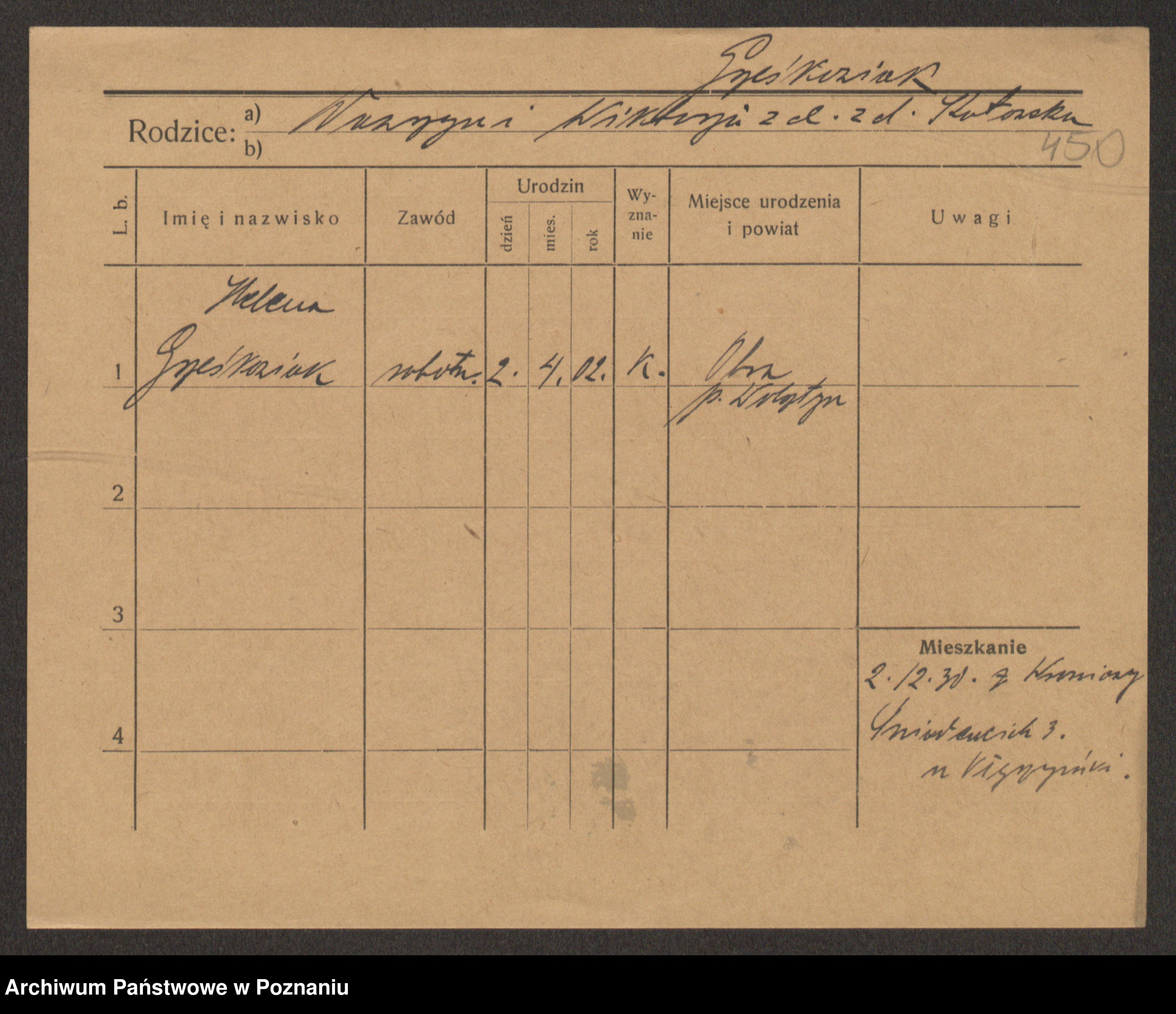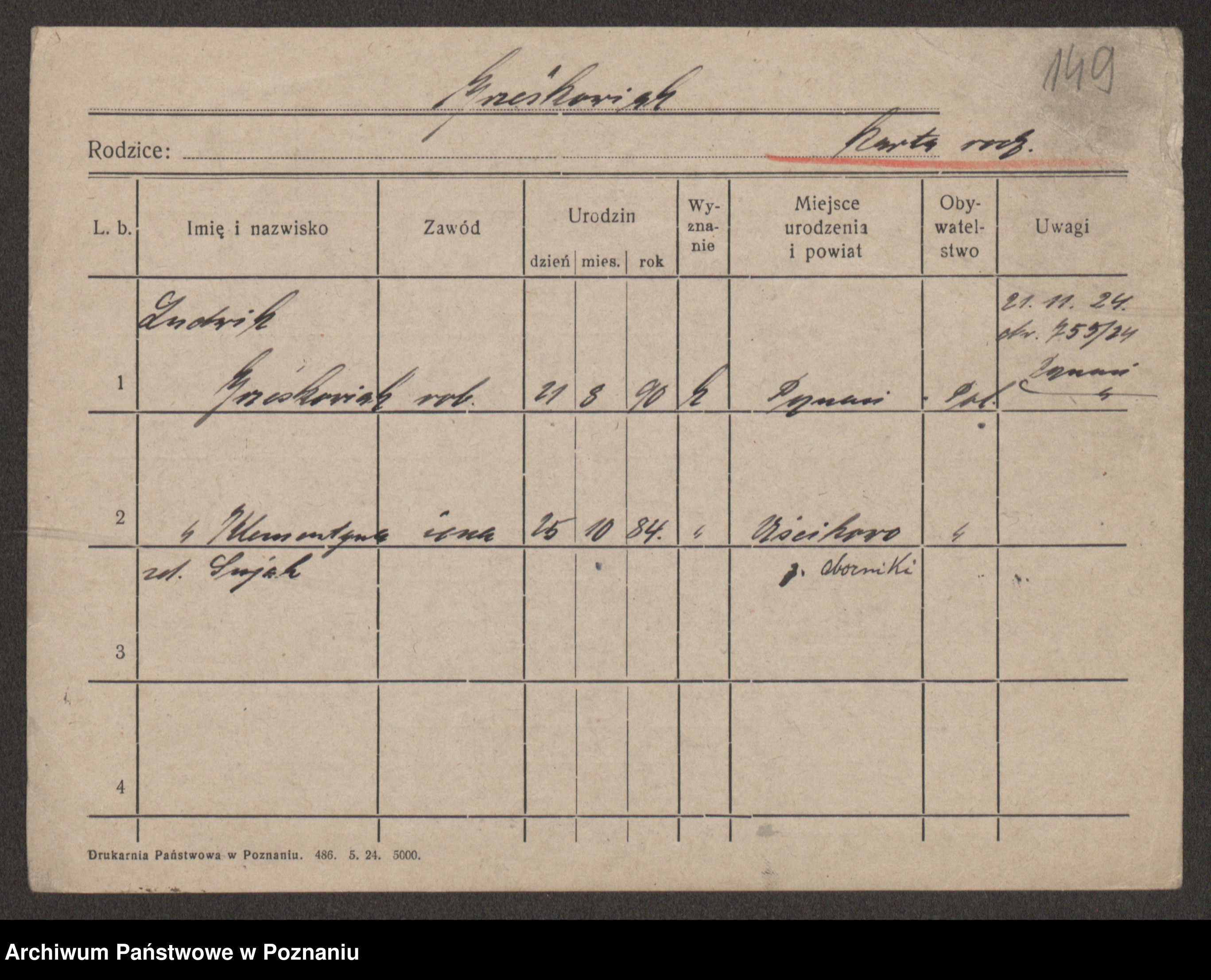 Podgląd karty osobowej dostępny jest po kliknięciu na nazwisko lub ikonkę karty. Można dokonywać powiększenia (ikony na górze) lub przechodzić między kolejnymi skanami (strzałki po bokach).