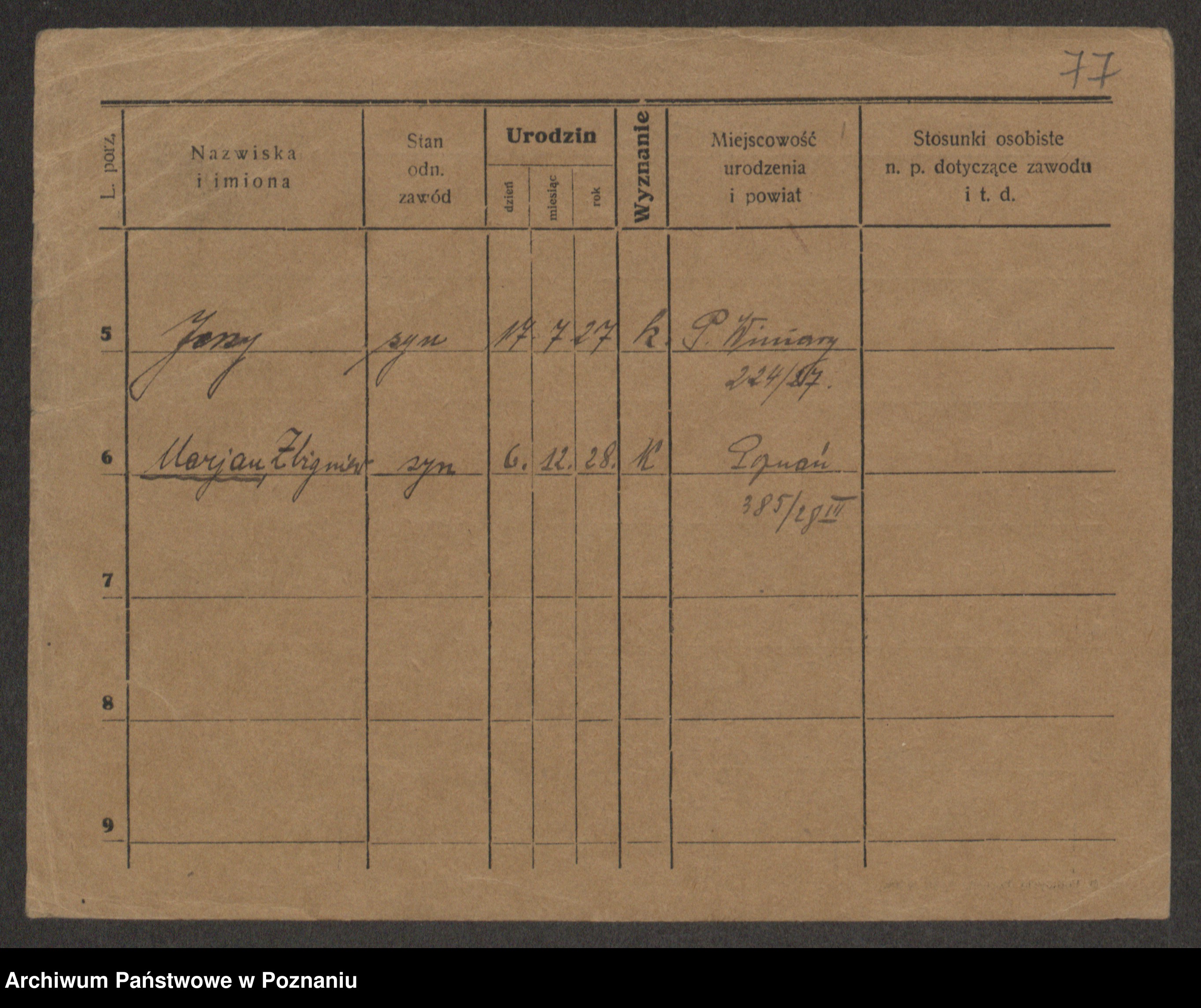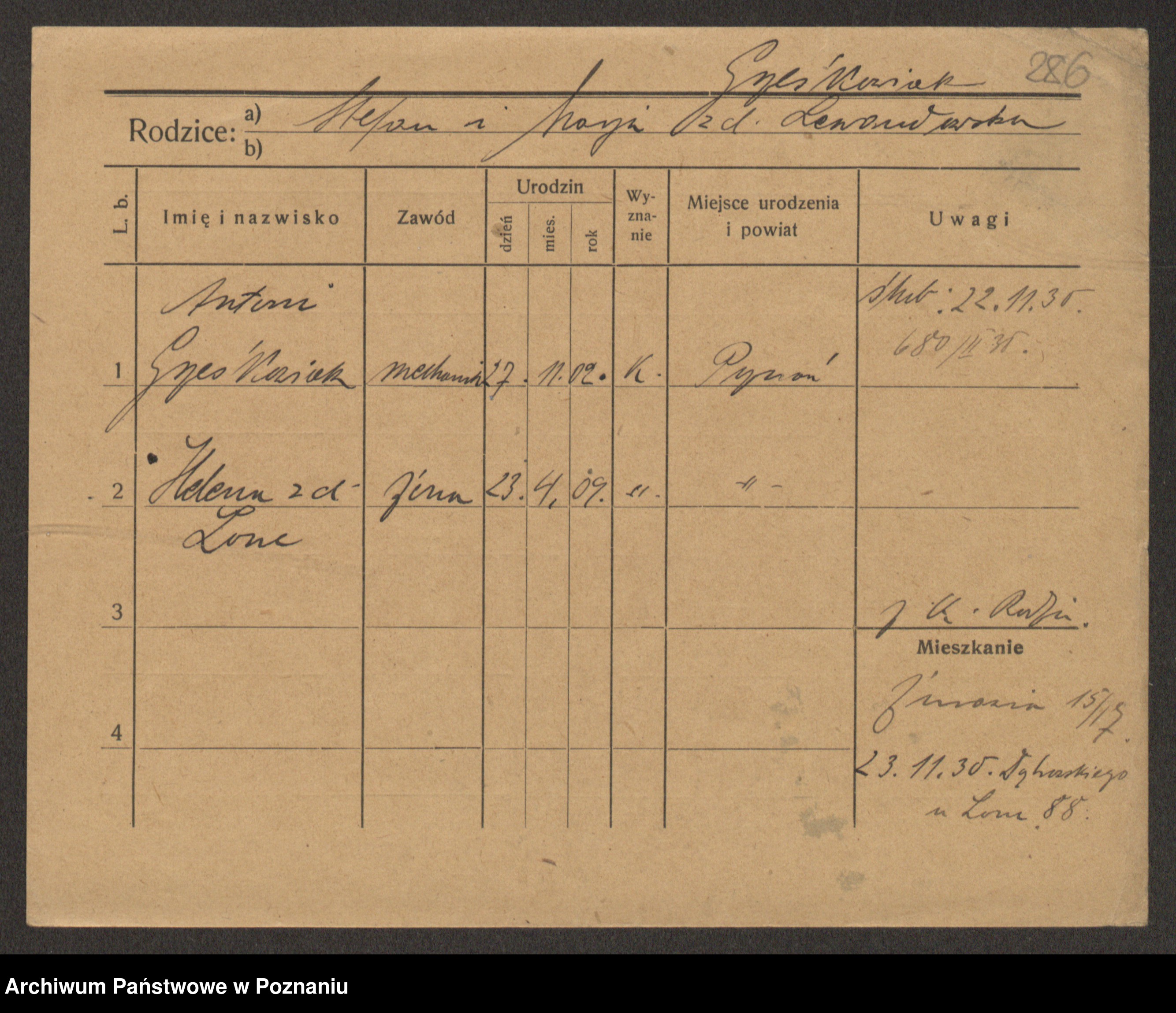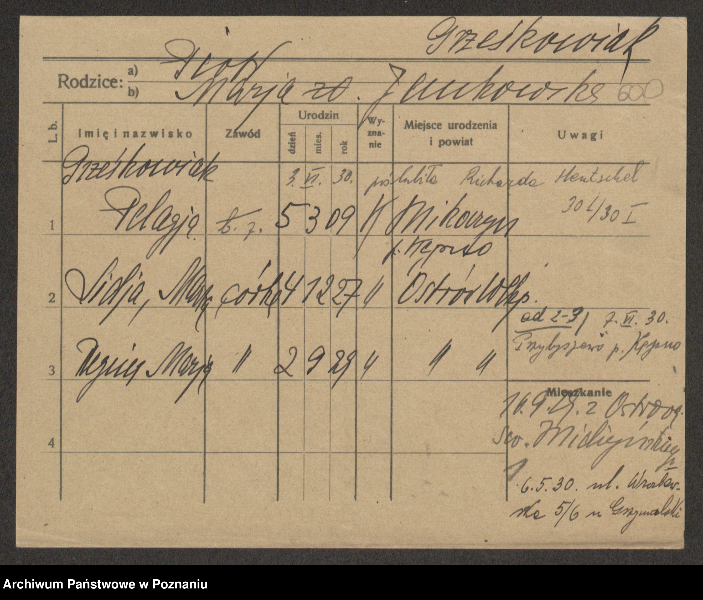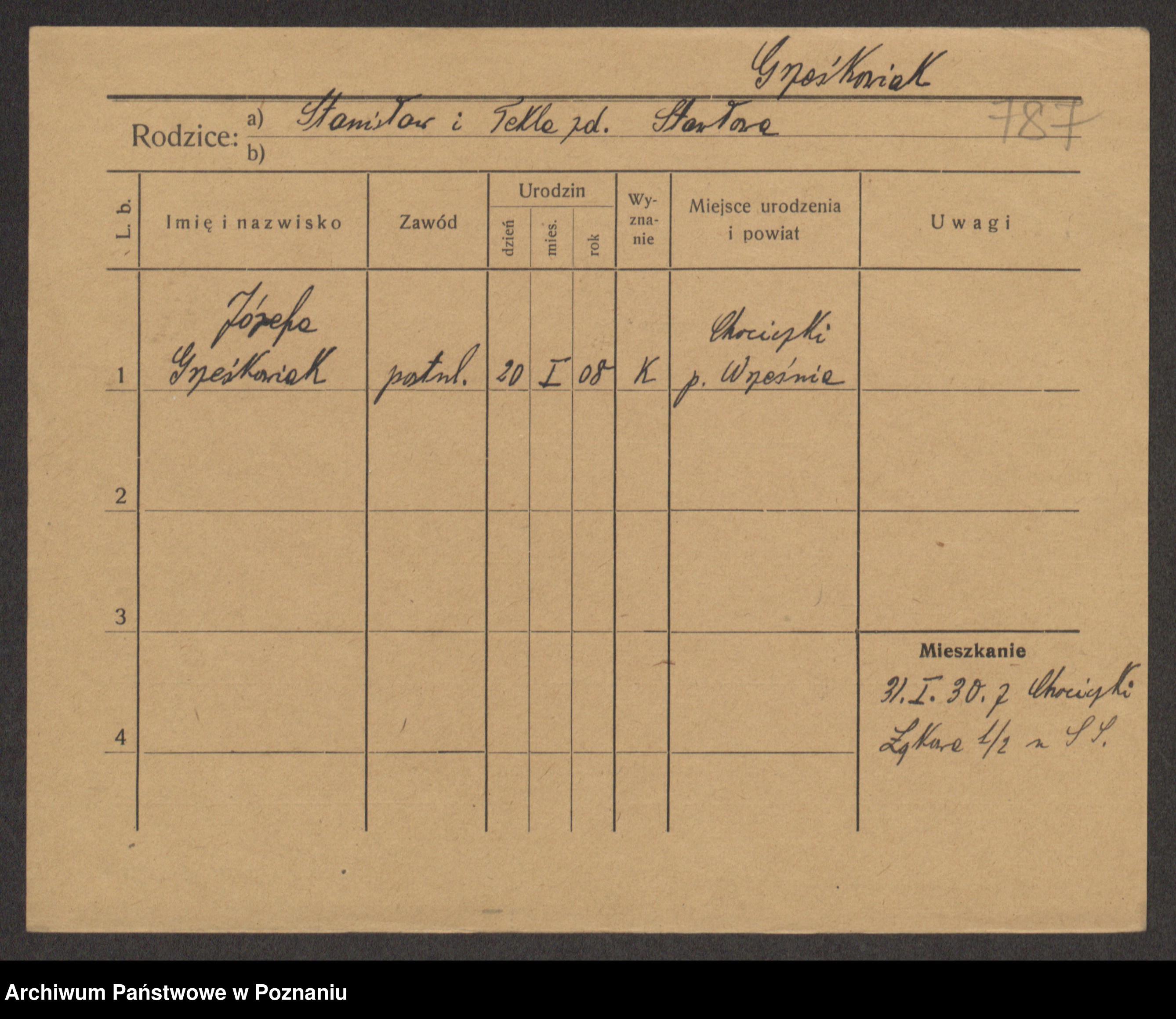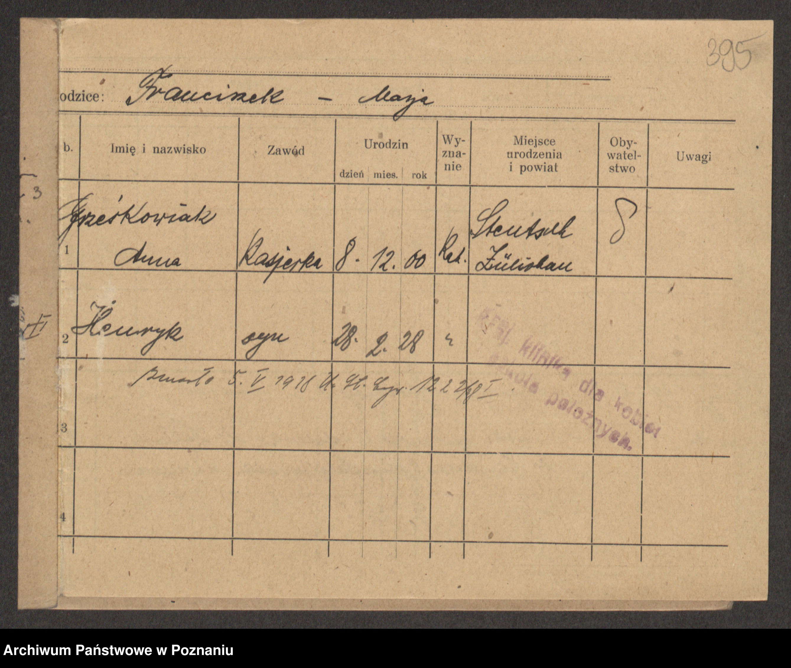 Podgląd karty osobowej dostępny jest po kliknięciu na nazwisko lub ikonkę karty. Można dokonywać powiększenia (ikony na górze) lub przechodzić między kolejnymi skanami (strzałki po bokach).