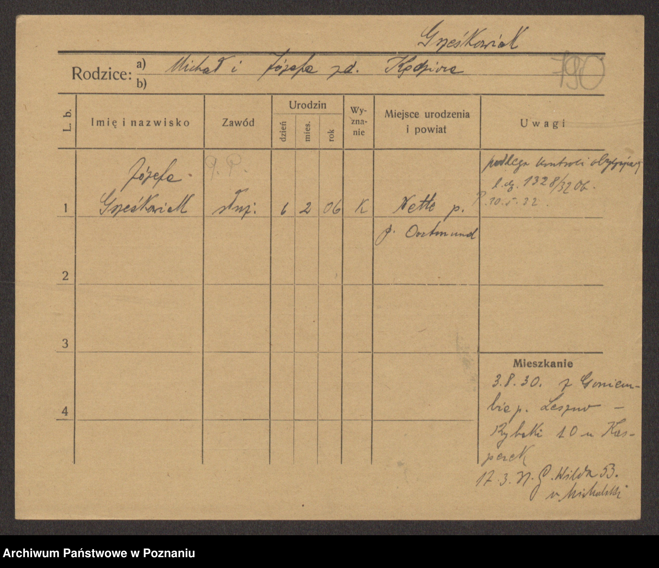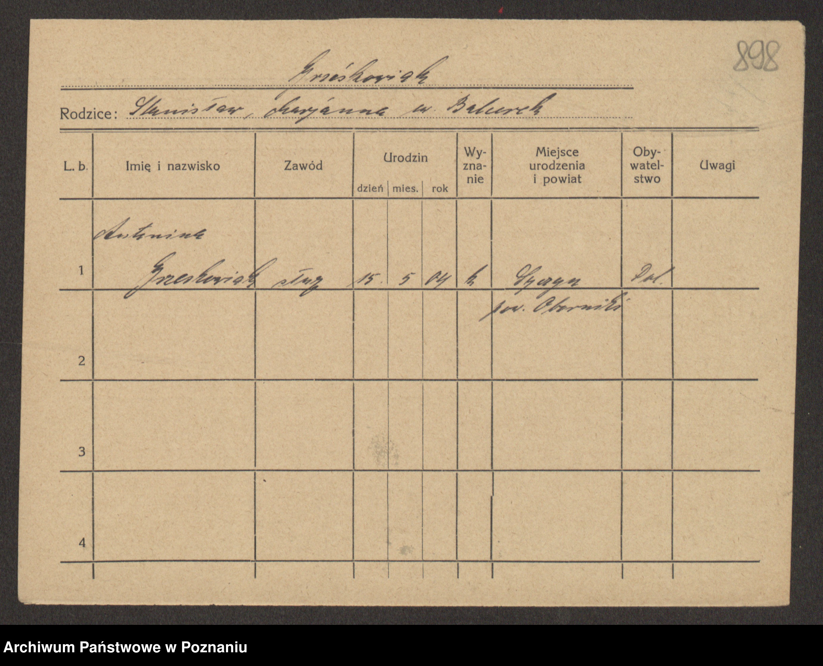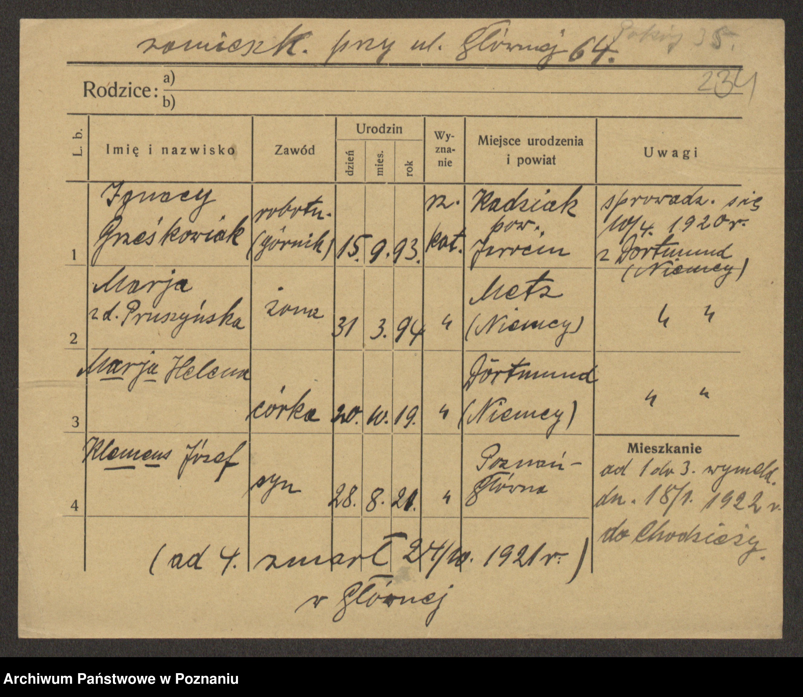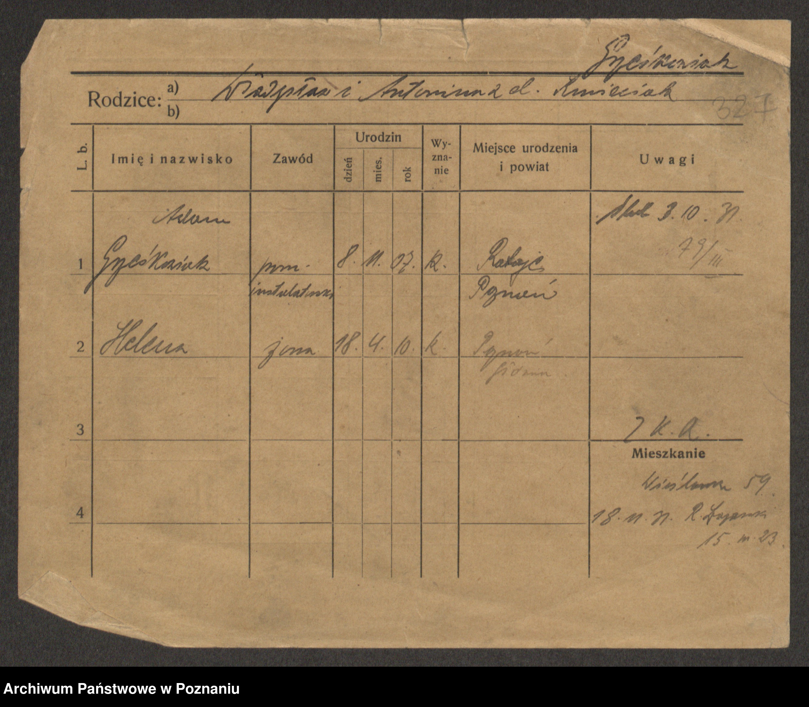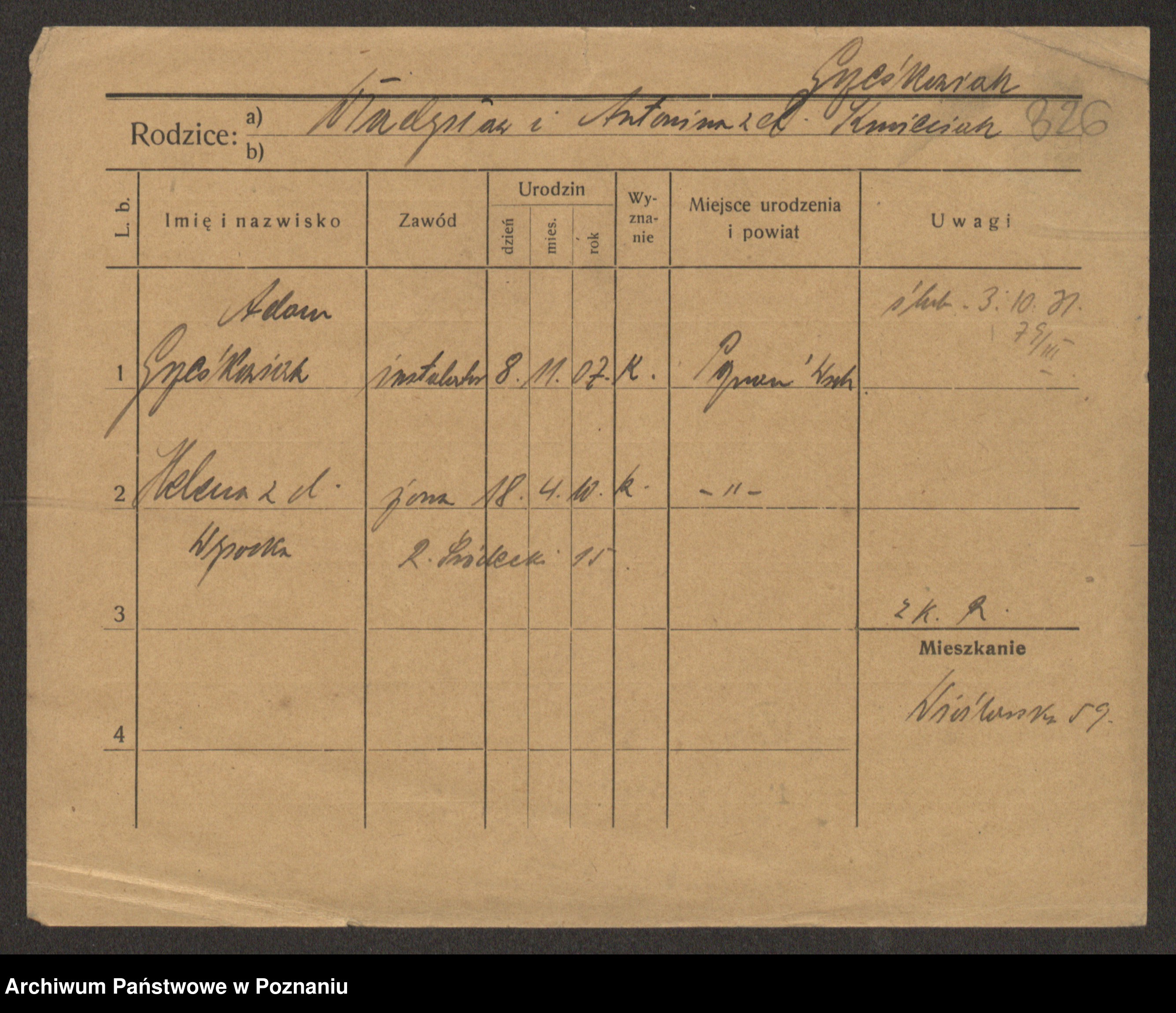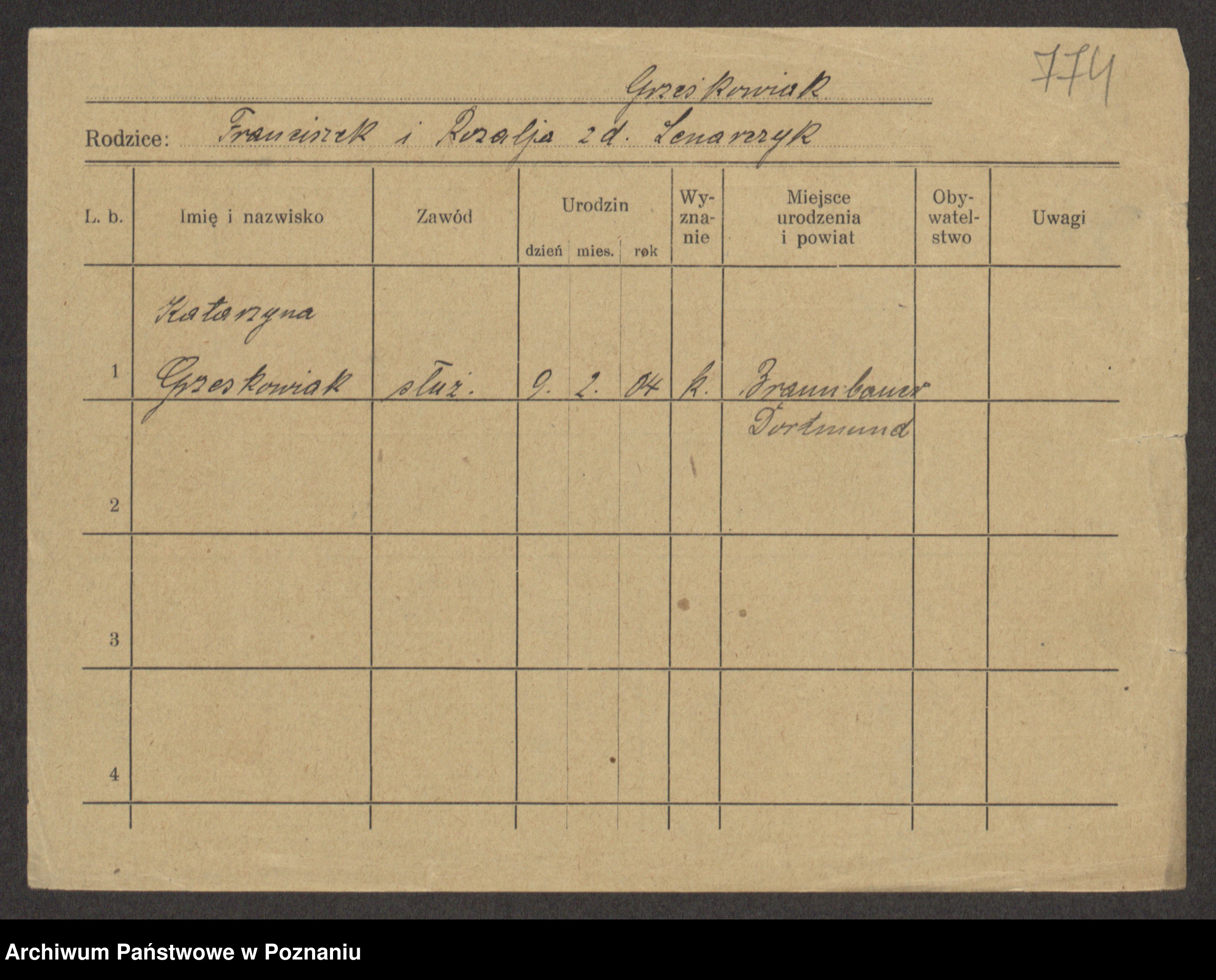 Podgląd karty osobowej dostępny jest po kliknięciu na nazwisko lub ikonkę karty. Można dokonywać powiększenia (ikony na górze) lub przechodzić między kolejnymi skanami (strzałki po bokach).