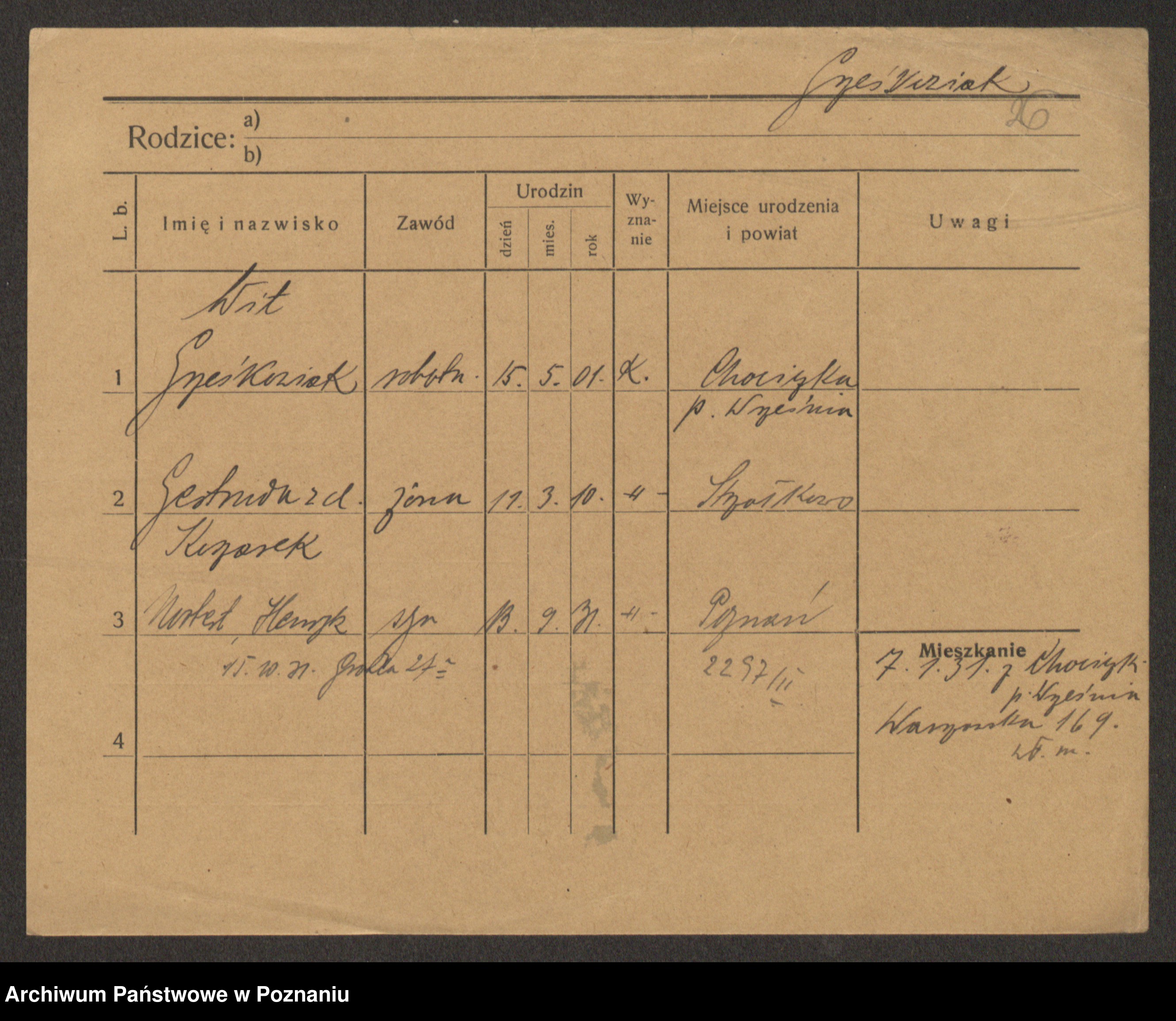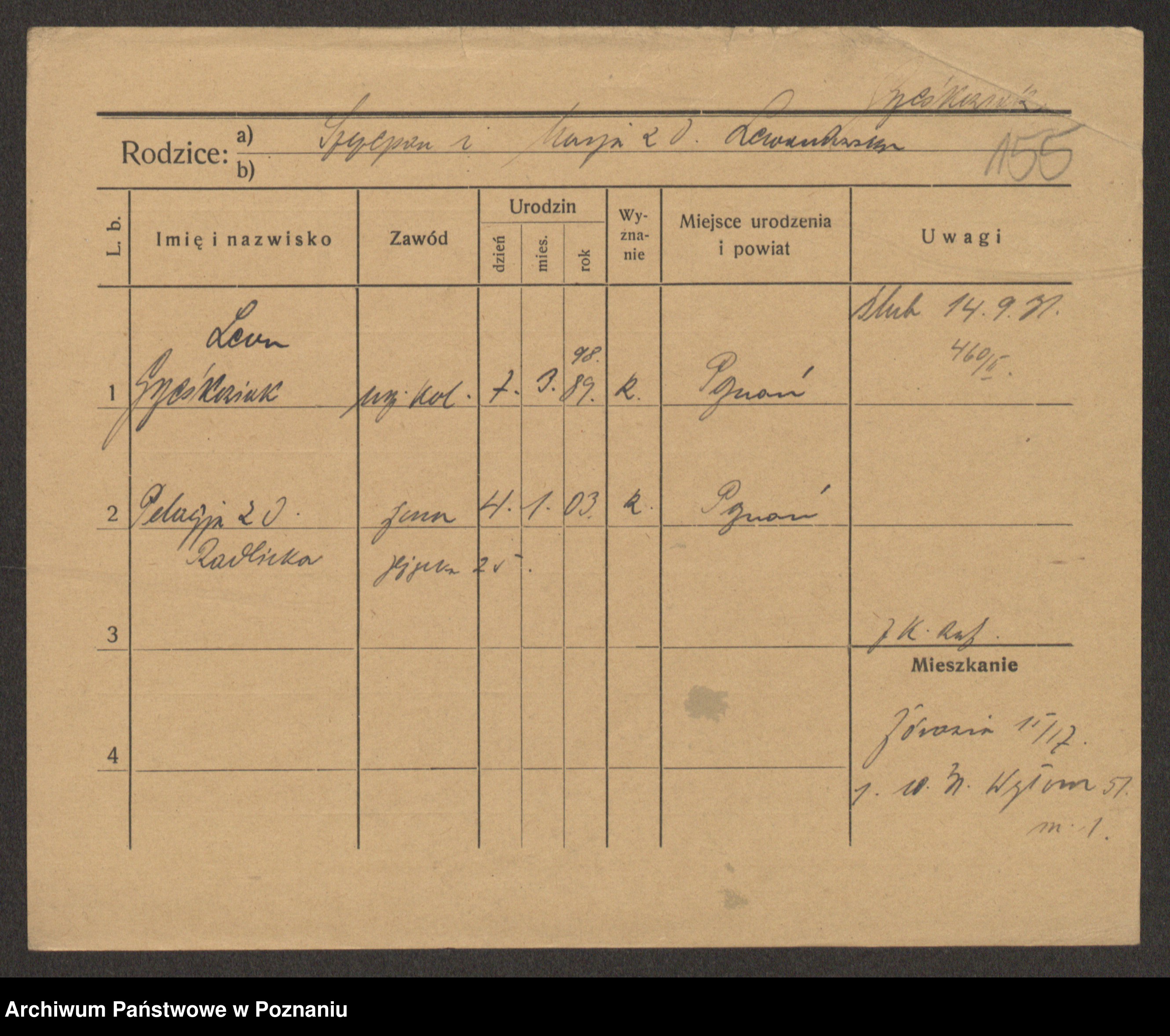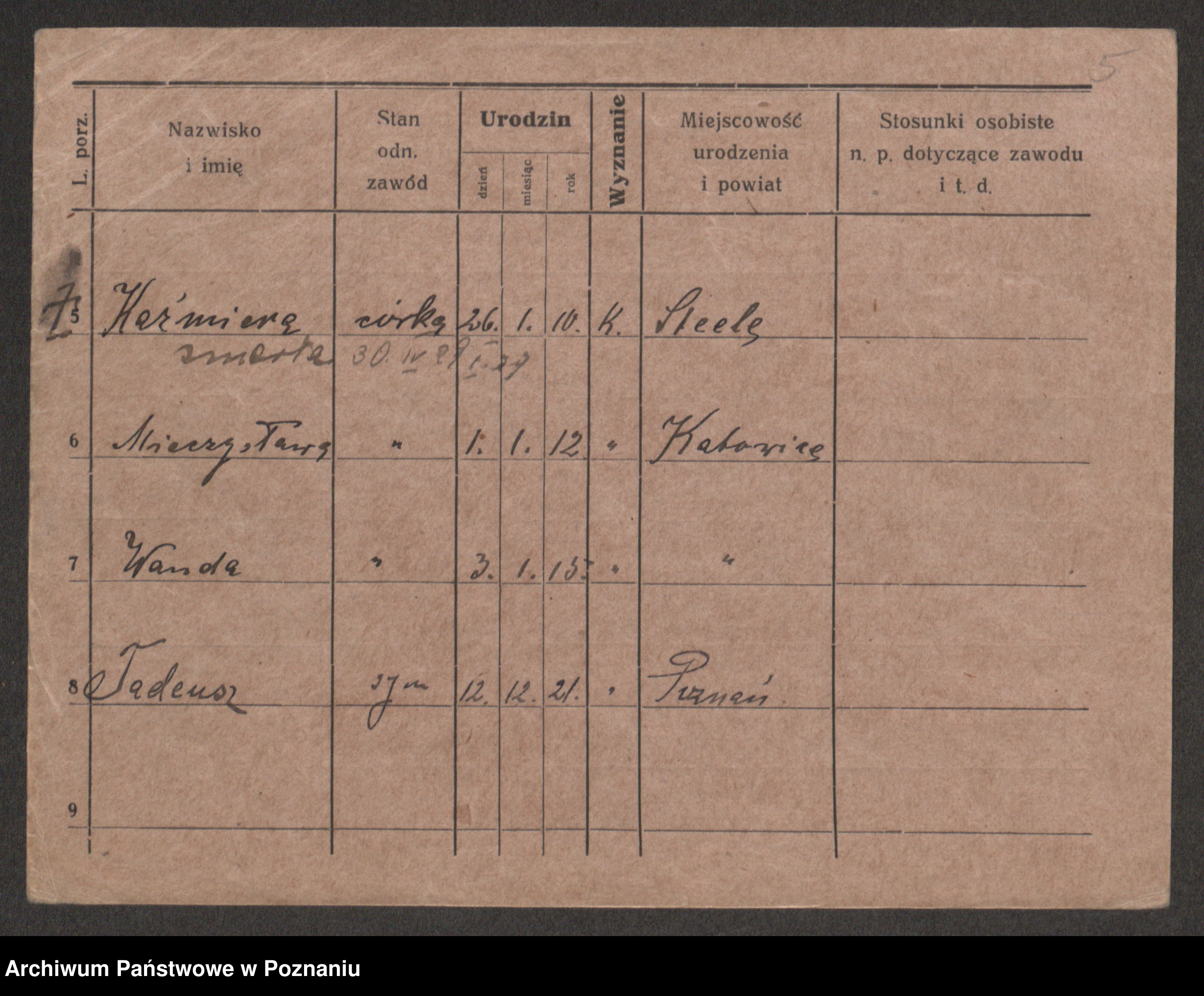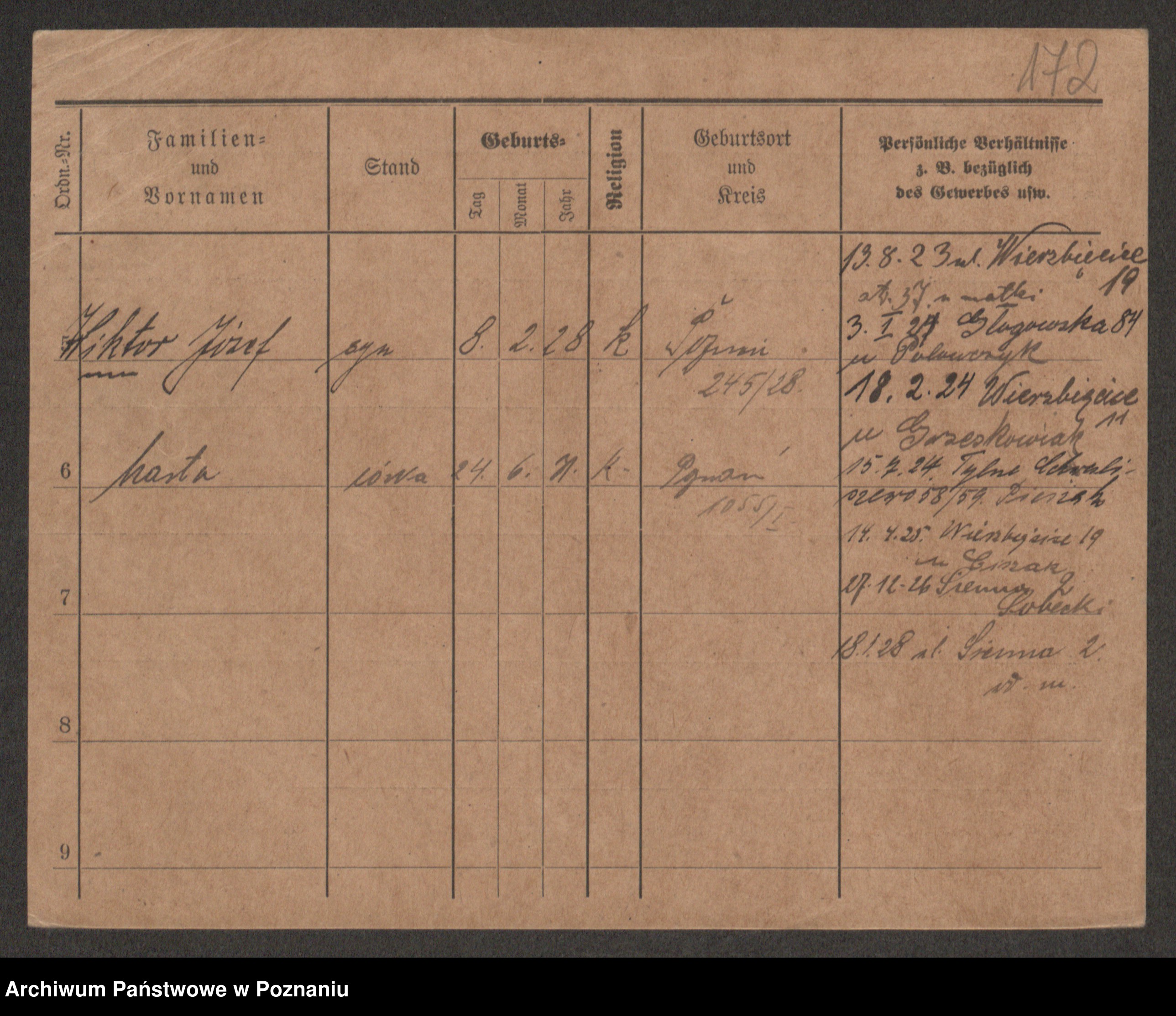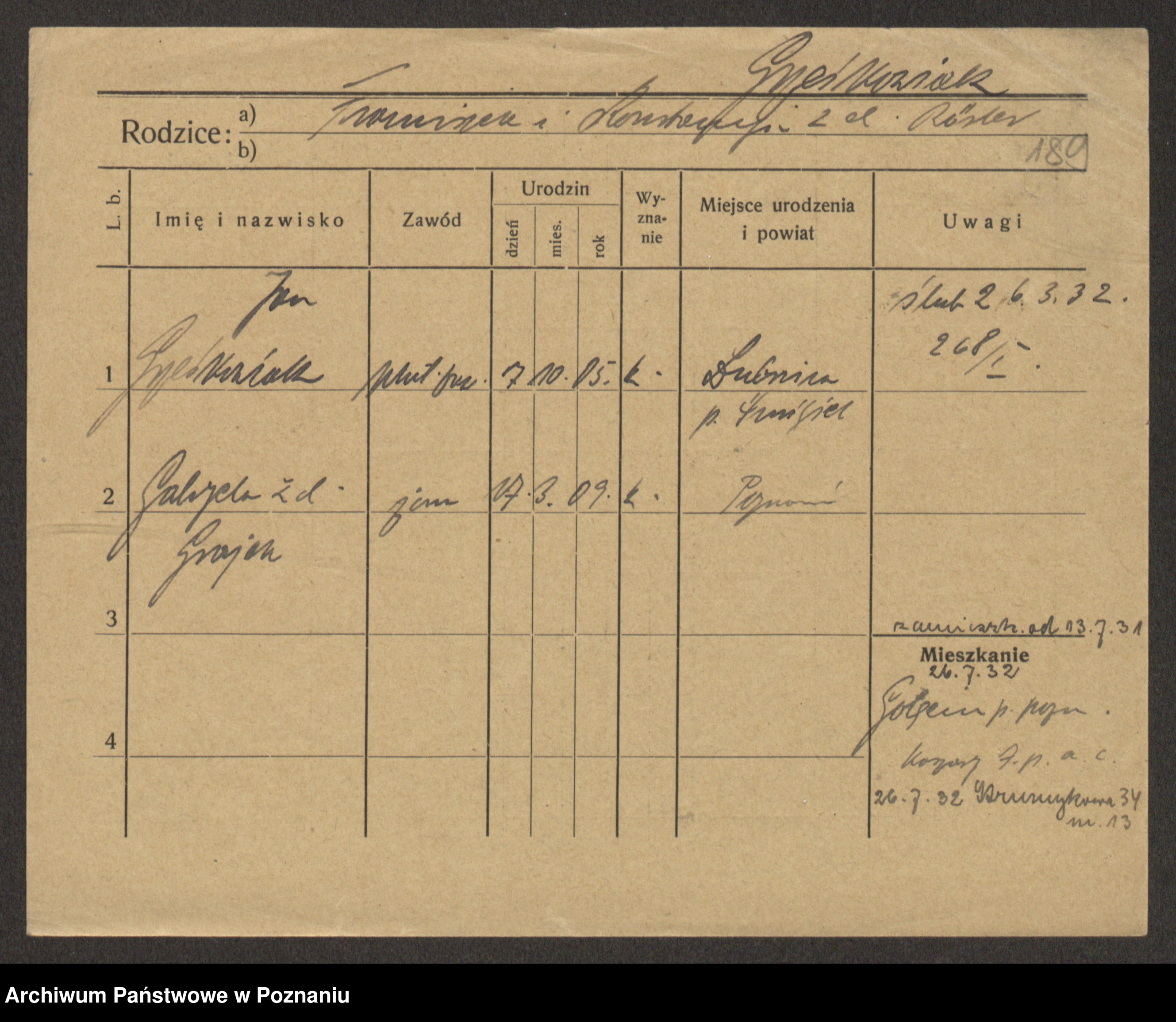 Podgląd karty osobowej dostępny jest po kliknięciu na nazwisko lub ikonkę karty. Można dokonywać powiększenia (ikony na górze) lub przechodzić między kolejnymi skanami (strzałki po bokach).