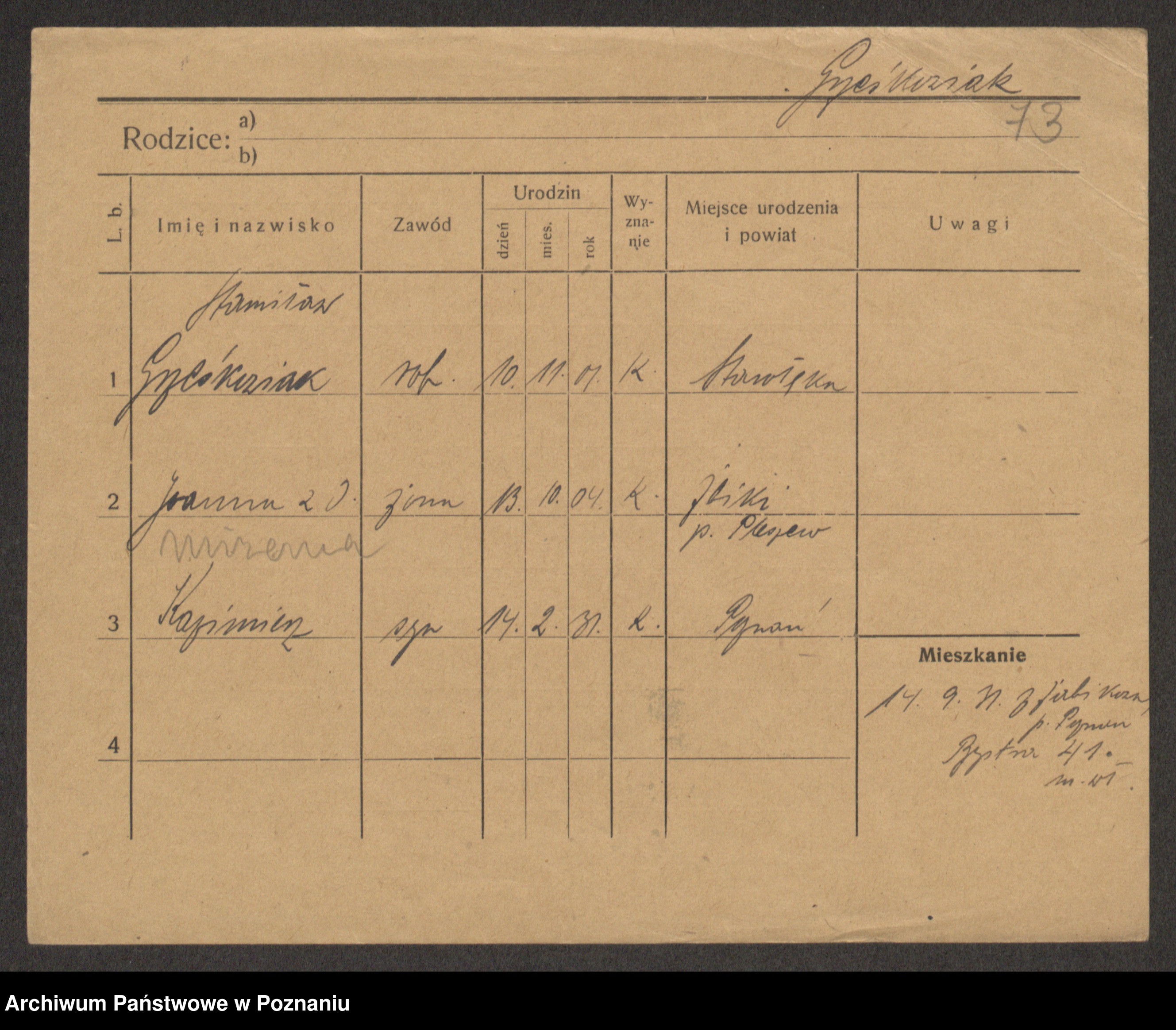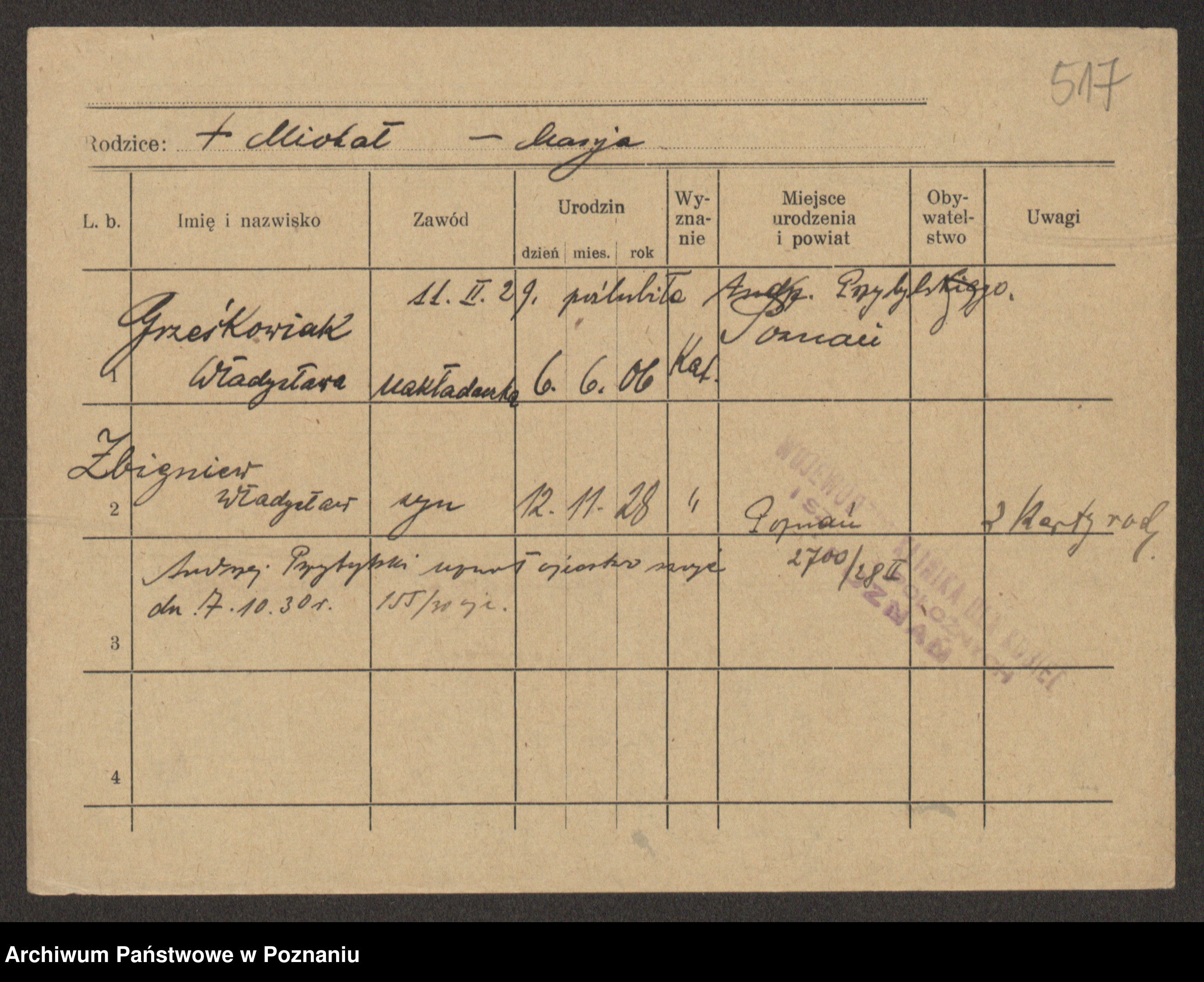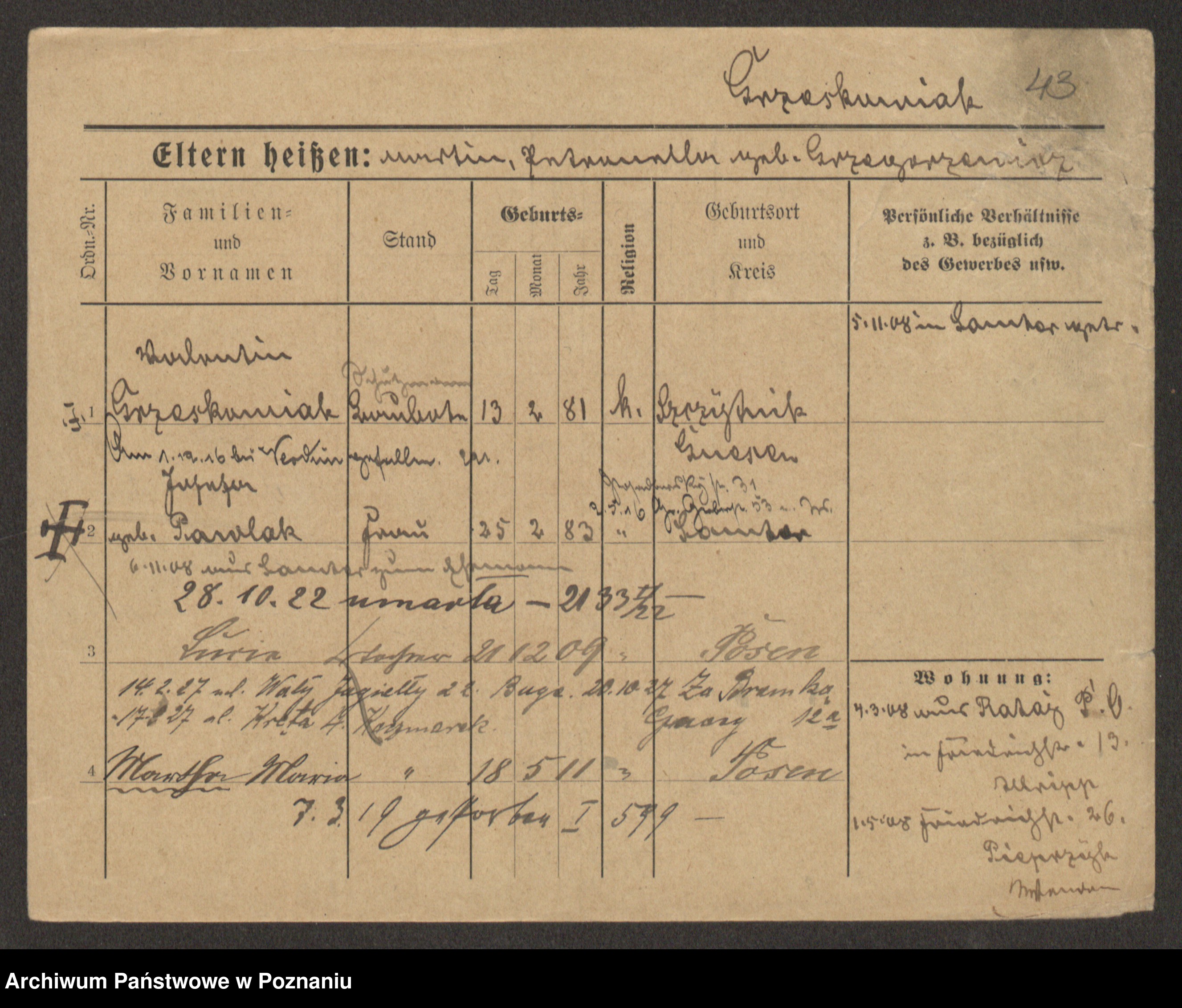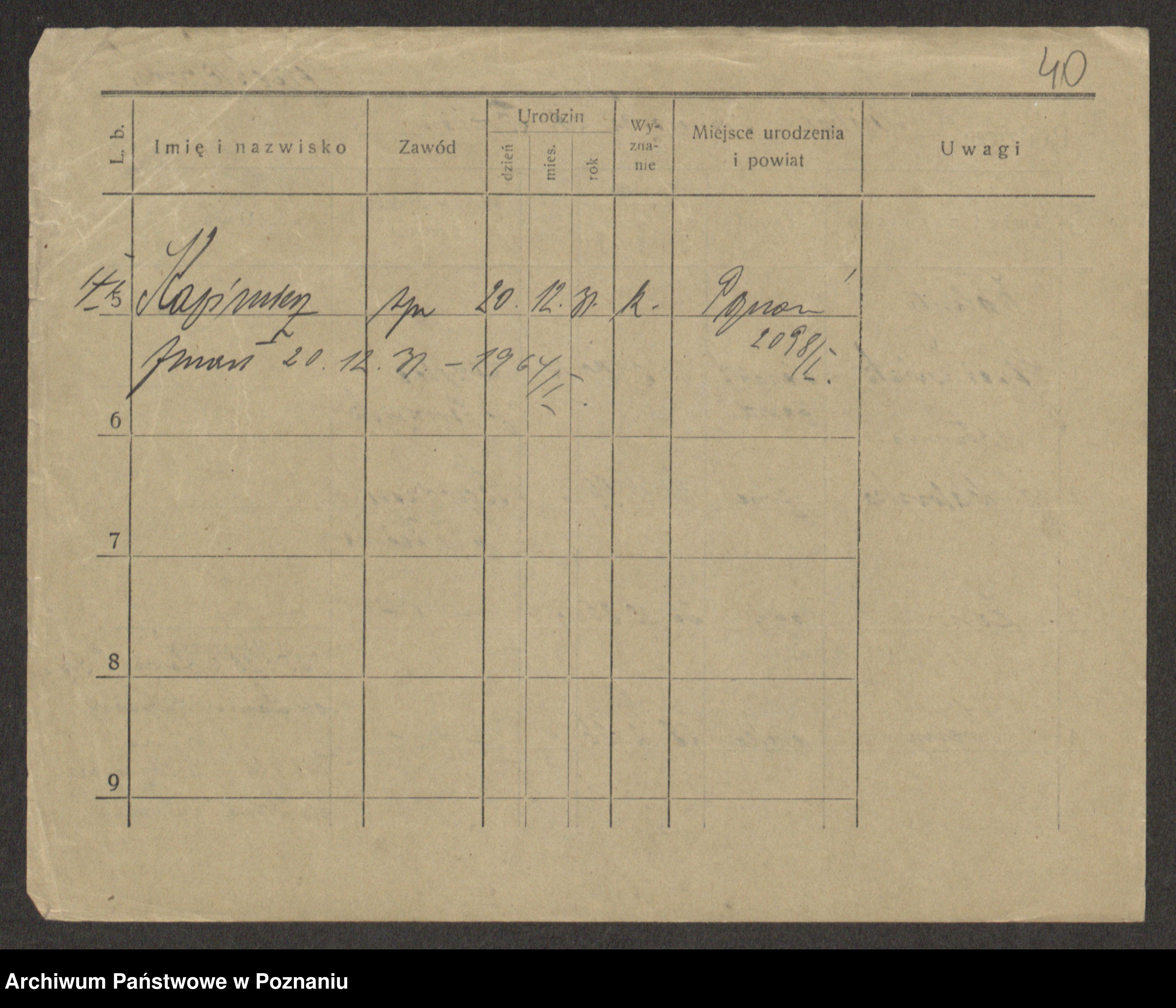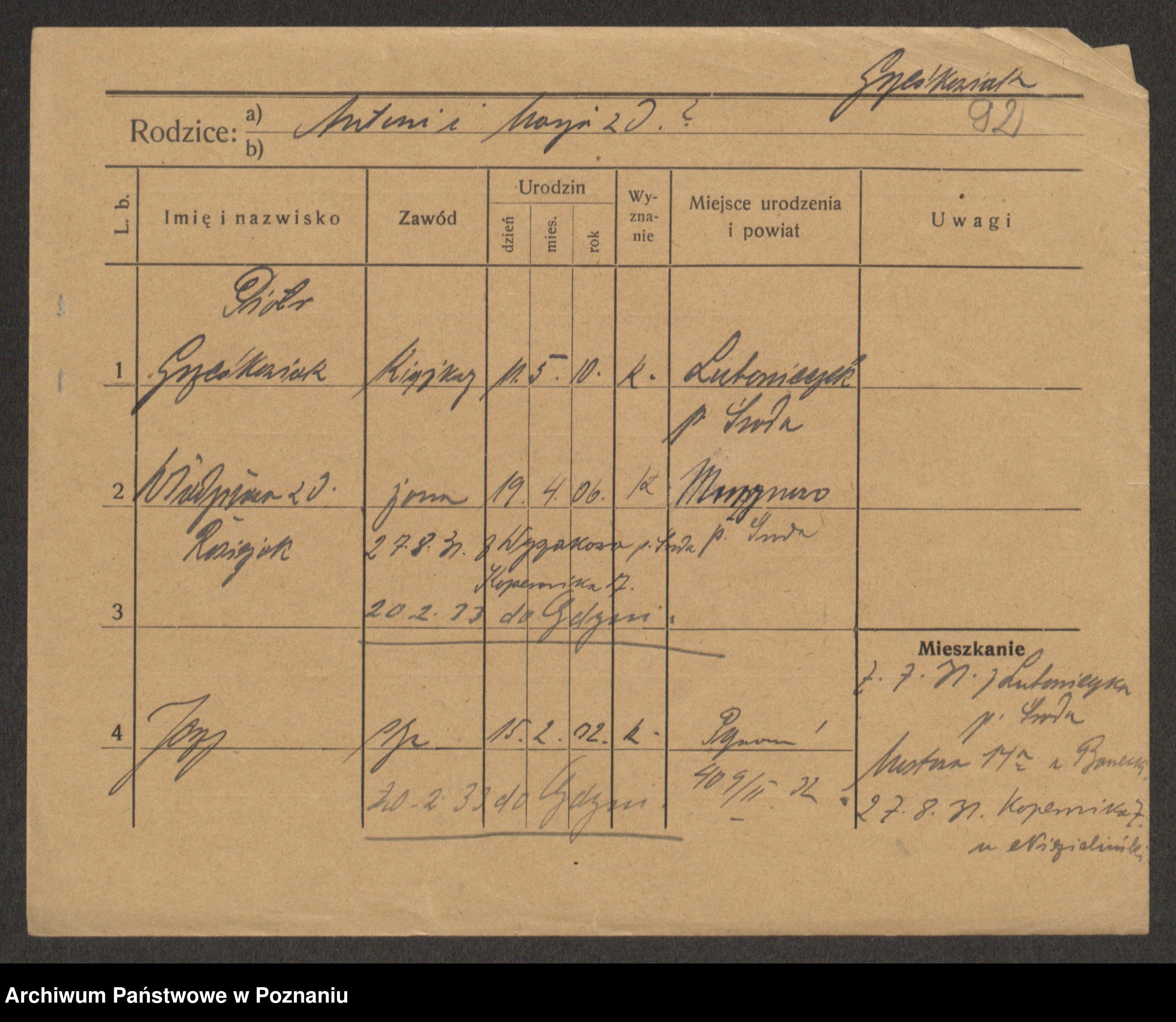 Podgląd karty osobowej dostępny jest po kliknięciu na nazwisko lub ikonkę karty. Można dokonywać powiększenia (ikony na górze) lub przechodzić między kolejnymi skanami (strzałki po bokach).